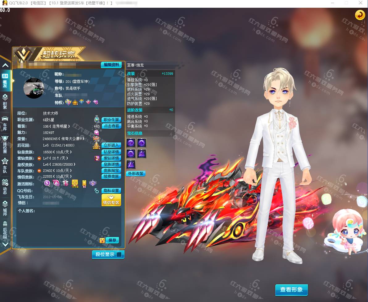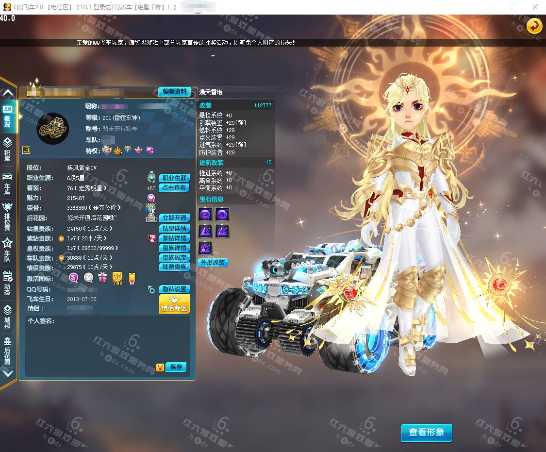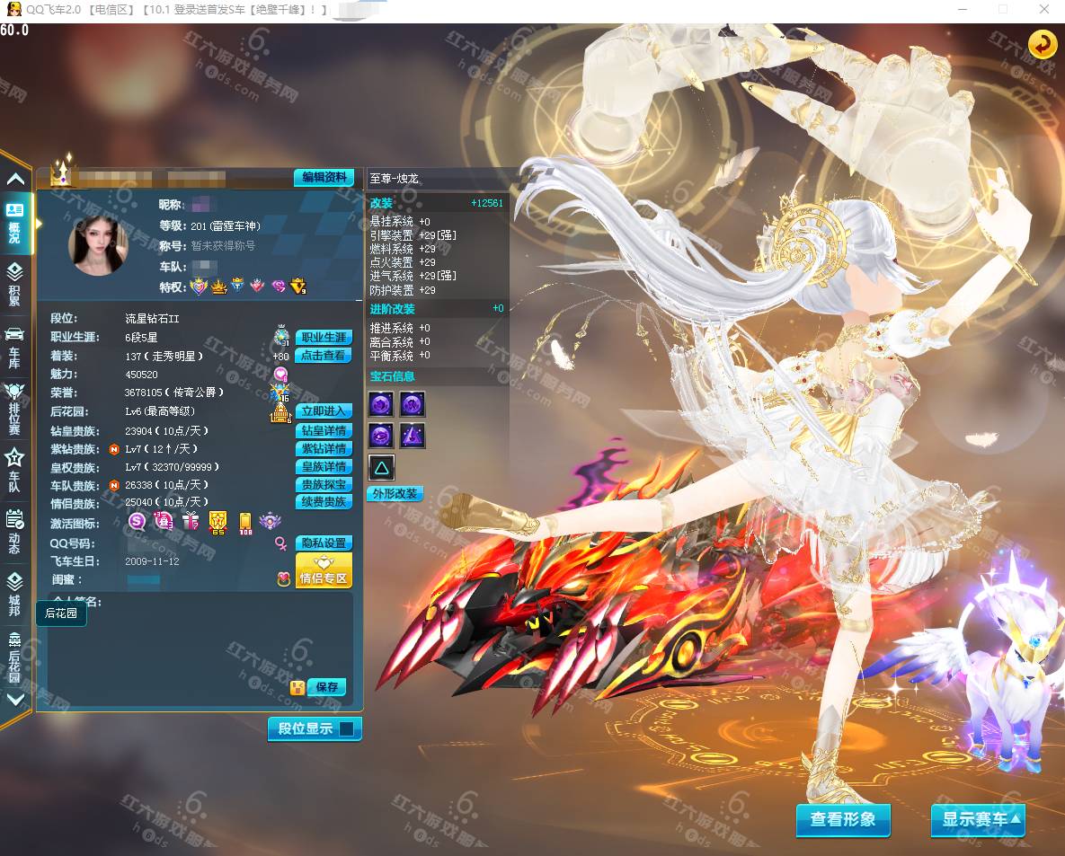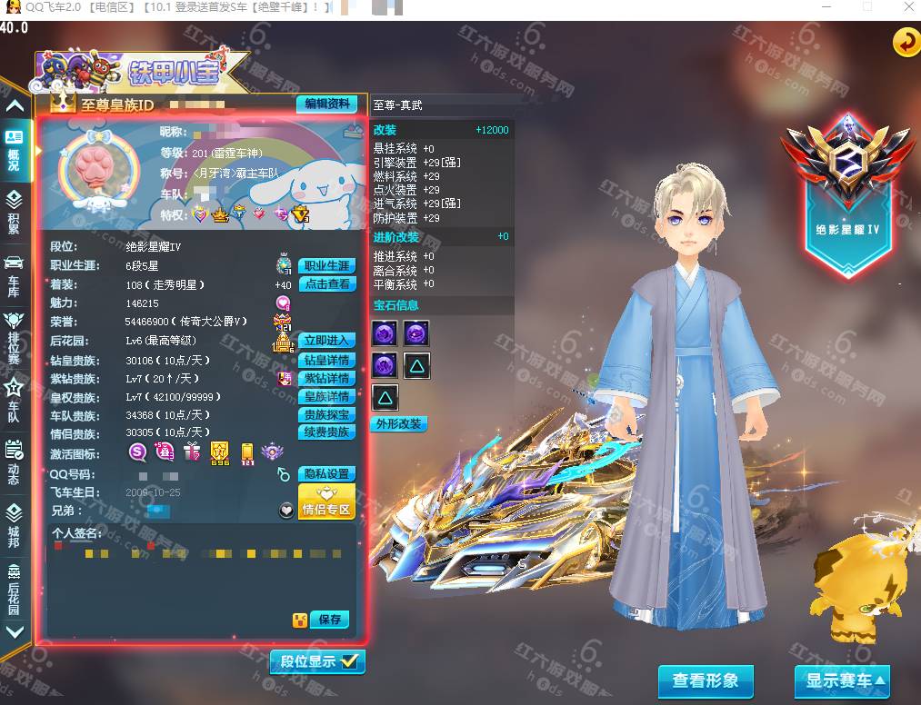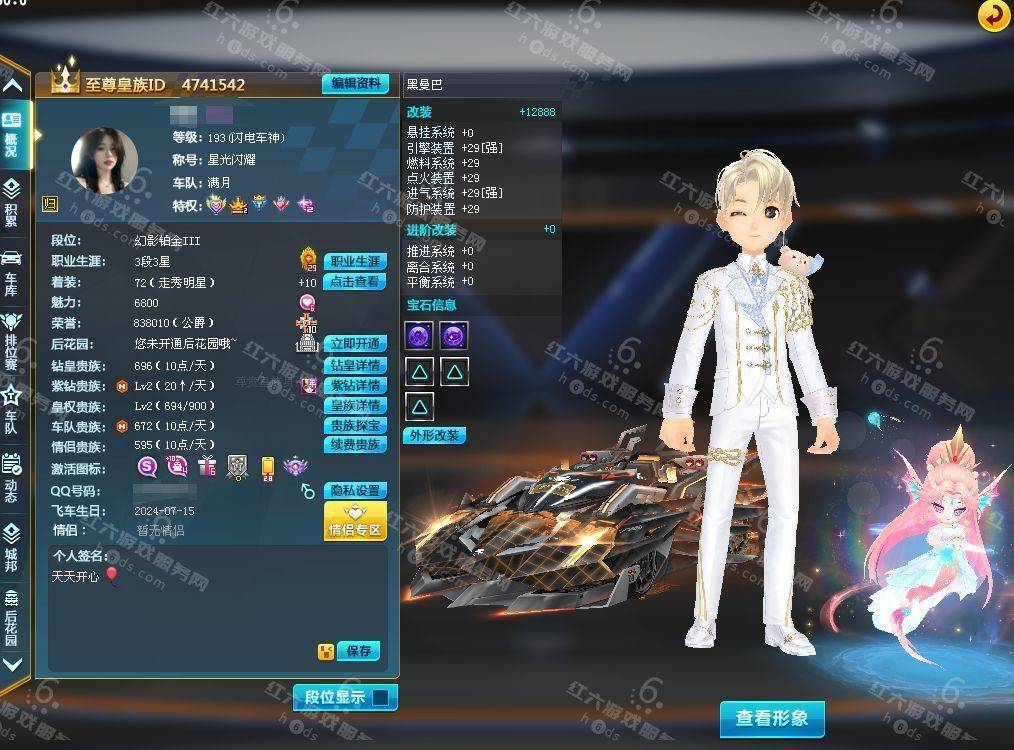 F15927,红六更号裙762771576【电信一区】红六自营,紫钻5级,皇族5级,魅力2.9W,荣誉362W,10S车:三四至尊玄冥/真武+29,双四至尊涅槃/X次元朱雀-海滩派对+29,爆天雷诺+29,众神之神/宙斯,终极爆天甲/刘备/逍遥,爆天甲/奥丁,终极众神之神/吕布,T2:孙悟空,高改天数雷诺/弑神3阶,白影神驹赵云,竞速骑宠:喵呜星云+10,甜心公主+6,发饰男15页:玉露水仙/凌霄齐天/,套装男19页:鹊桥仙恋/天降良缘/凌霄齐天/玫瑰婚约/石榴花神,发饰女38页:绮丽梦游,套装女45页:天降良缘/X次元朱雀套装/流光沧海/流焰火凰,附带王者荣耀v9 300个皮肤,附带q飞车手游,18700R,