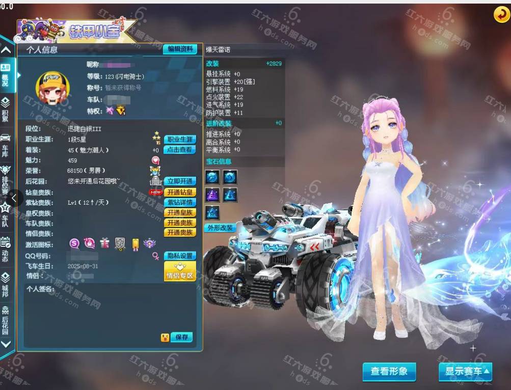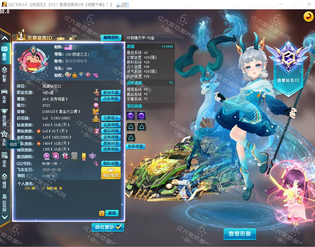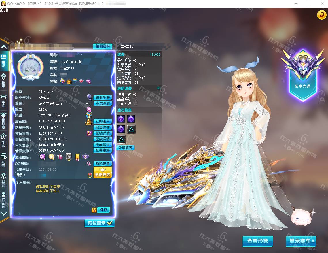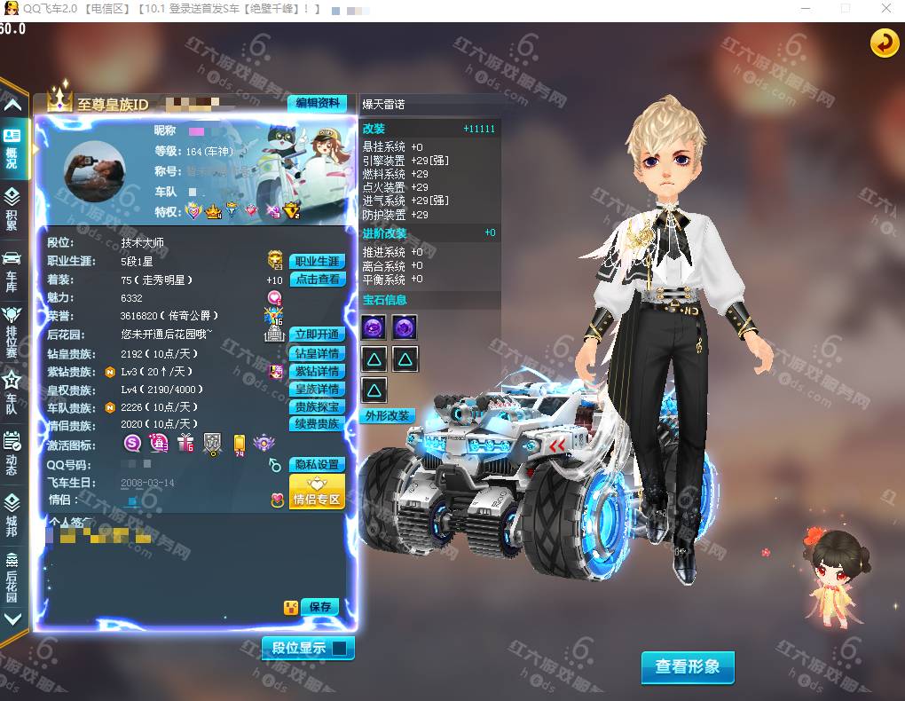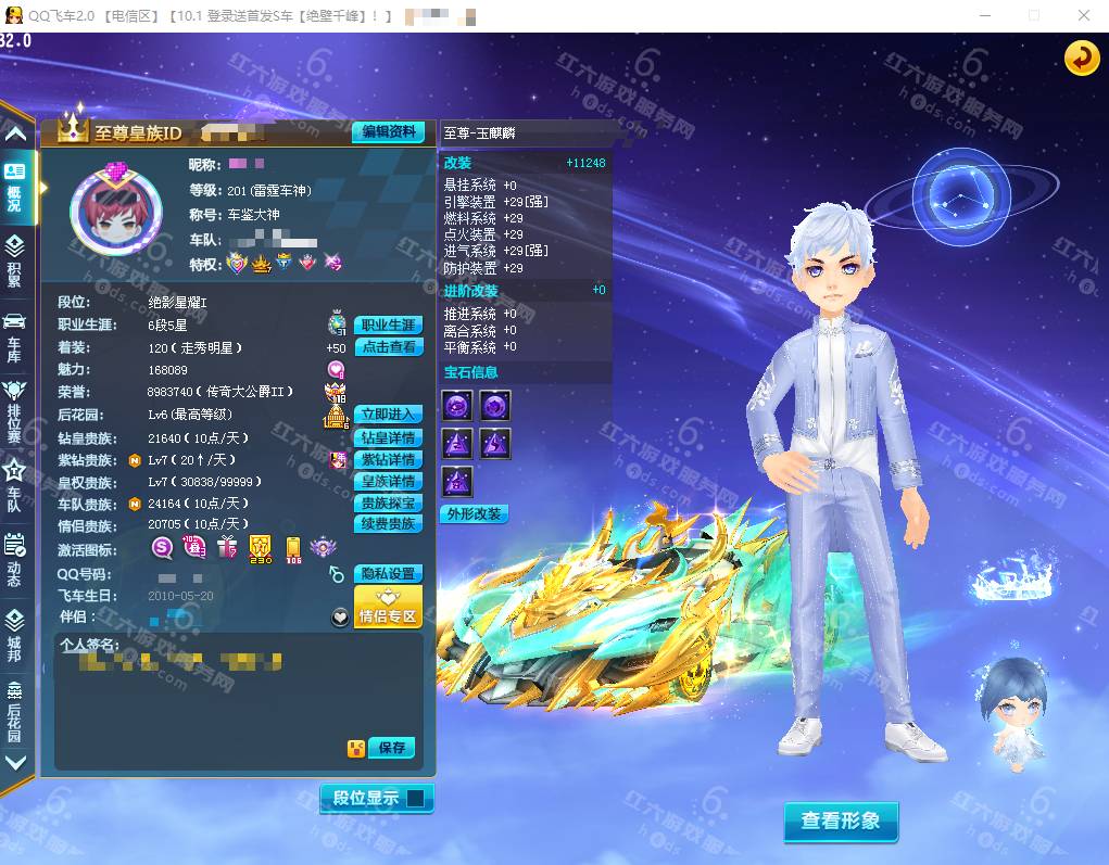 F15927,红六更号裙762771576【电信一区】红六自营,紫钻5级,皇族5级,魅力2.9W,荣誉362W,10S车:三四至尊玄冥/真武+29,双四至尊涅槃/X次元朱雀-海滩派对+29,爆天雷诺+29,众神之神/宙斯,终极爆天甲/刘备/逍遥,爆天甲/奥丁,终极众神之神/吕布,T2:孙悟空,高改天数雷诺/弑神3阶,白影神驹赵云,竞速骑宠:喵呜星云+10,甜心公主+6,发饰男15页:玉露水仙/凌霄齐天/,套装男19页:鹊桥仙恋/天降良缘/凌霄齐天/玫瑰婚约/石榴花神,发饰女38页:绮丽梦游,套装女45页:天降良缘/X次元朱雀套装/流光沧海/流焰火凰,附带王者荣耀v9 300个皮肤,附带q飞车手游,18700R,