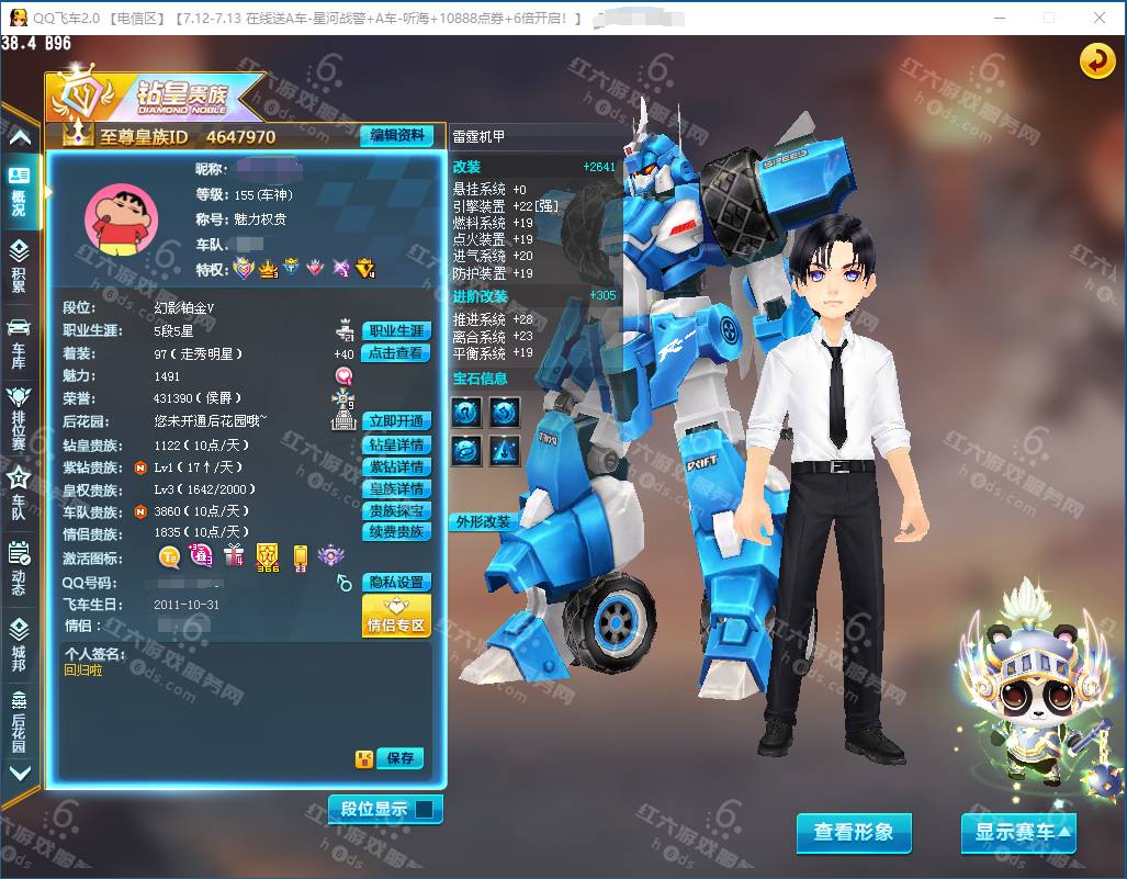 DS3839,红六更号裙777584596【电信一区】3辆5项全29的S车:【爆天雷诺、众神之神+哪吒皮肤、终极众神之神】;8辆A车【雷诺千机变皮肤、雷诺幻夜3级】;1辆T1车;竞速宠物3个【哪吒-强化5、艾丽莎-强化10、白金神兽-强化5】;宝石【2级重生300个、2级效率233个、3级重生21个、3级效率22个、辛运石88个、祝福石116、拆除刀7个】;改装配件【进气1w个;点火1w个、燃料1w个、引擎1w个、防护1w个】;男装【发饰20页、套装32页】;魅力40808;等级201;职业生涯6段5星最高;紫钻5级2027-01-24到期;排位赛-连续20个赛季大师;各类比赛背景、挂饰。3960R