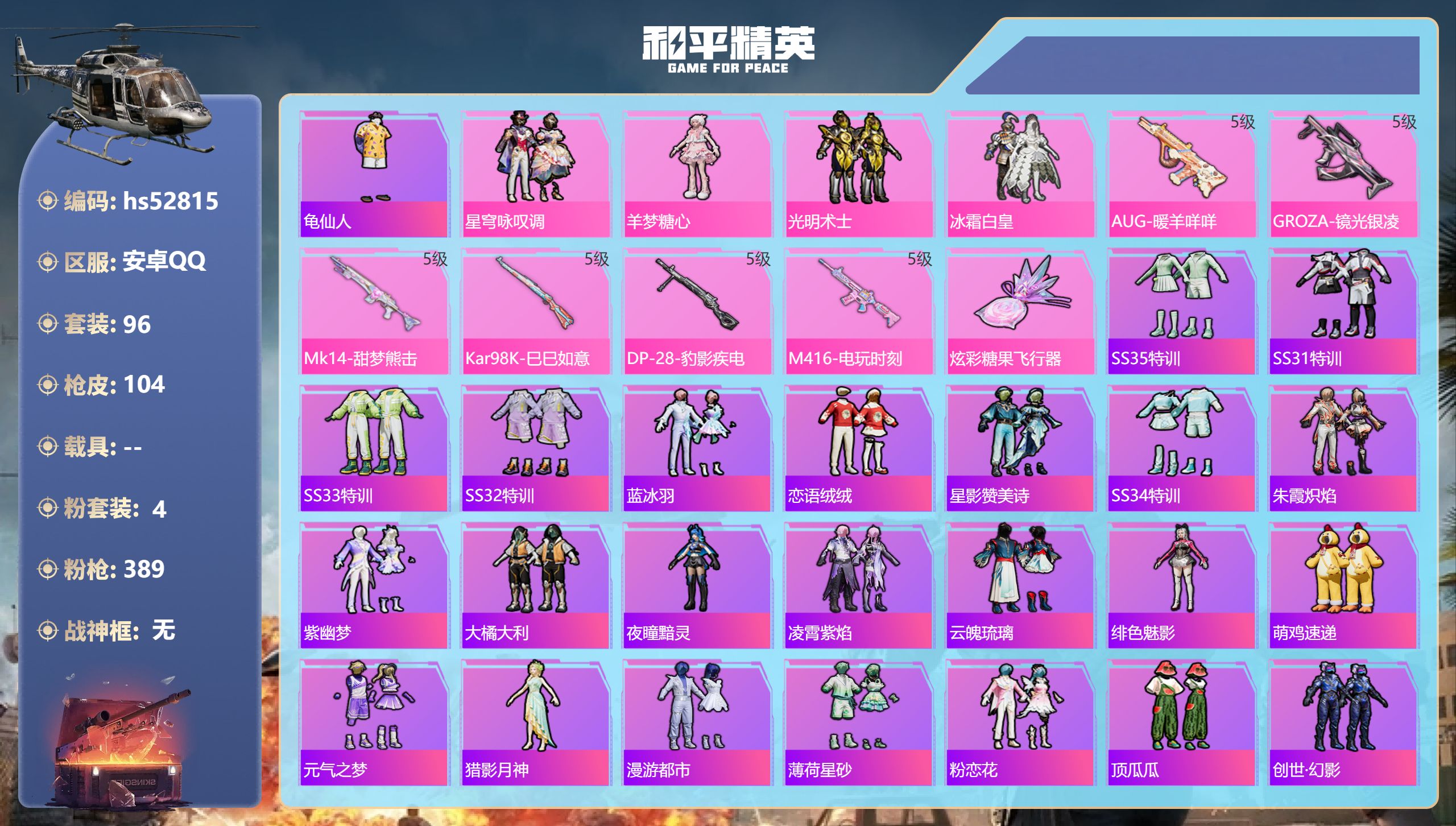 PX_2304546-,安卓手Q-2王牌印记-4粉装-6特效枪-30702热力值-96套装-104枪皮-1卓越印记 【4粉装】套装-光明术士,角色-羊梦糖心,套装-冰霜白皇,套装-星穹咏叹调 【6特效枪】M416-电玩时刻/5级,DP-28-豹影疾电/5级,Kar98K-巳巳如意/5级,Mk14-甜梦熊击/5级,GROZA-镜光银凌/5级,AUG-暖羊咩咩/5级 【1稀有紫装】龟仙人 【96稀有时装】星穹咏叹调,羊梦糖心,SS35特训,SS31特训,SS33特训,SS32特训,蓝冰羽,恋语绒绒,星影赞美诗,SS34特训,朱霞炽焰,紫幽梦,大橘大利,夜瞳黯灵,龟仙人,凌霄紫焰,云魄琉璃,绯色魅影,萌鸡速递,元气之梦,猎影月神,漫游都市,薄荷星砂,粉恋花,顶瓜瓜,创世·幻影,光明术士,冰霜白皇,卖崽青蛙,白糯汤圆,鱼渊荷华,燕燕于飞,海琴烟,战术大师,智谋强哥,蝶变,巳巳如意,曼妙人鱼,元素星魂,SS28特训,白光莹,SS29特训,焰鹰斗篷,童真绒兔,湖雨初晴,龙的传人,青玉碎影,特训学院,猎鹰,青年教官,橘黑制服,红色运动,黄色运动,蓝色运动,黄色伏地魔,白色伏地魔,酒红色名流,湖蓝色名流,黄色名流,顽皮玉兔,热情海星,黑色伏地魔,炫蓝之夏,纯真浪花,竞技名士,深蓝色名流,猛禽,长空猛禽,旭日情侣,街头潮人,冷焰舞者,魅力单车,甜蜜菠萝,青春校园,冰川特警,极速红龙,生化防暴队,鹰眼刺客,人气偶像,幽夜迷踪,幻影武者,梦魇先生,破蛋小黄鸡,疯狂小兔子,蓝彩潮人,海岛探路者,破晓战魂,森林游猎者,耀粉歌者,SS27特训,玉兔迎春,呆萌铁蟹,缤纷果语,幻羽潜行,海盐绵绵冰,柠萌假日 【104稀有枪械】QBZ-纯真浪花,AWM-纯真浪花,汤姆逊-纯真浪花,DBS-乌木金纹,AA12-G-纯真浪花,平底锅-纯真浪花,烟雾弹-鸢尾晶梦,SCAR-L-海盐豹豹,平底锅-精灵梦叶罗丽,GROZA-海盐豹豹,AUG-暖羊咩咩/5级,GROZA-镜光银凌/5级,Mk14-甜梦熊击/5级,Kar98K-巳巳如意/5级,DP-28-豹影疾电/5级,Mk14-冰河战士,Vector-突变脉冲,UZI-冰河战士,M16A4-冰河战士,MK20-H-乌木金纹,M416-电玩时刻/5级,Win94-乌木金纹,PKM-紫幽梦,R45-幻彩电音,Mk14-紫幽梦,蜜獾-乌木金纹,S1897-紫幽梦,P92-紫幽梦,UZI-炫彩糖果,G36C-星穹咏叹调,Kar98K-星穹咏叹调,JS9-凌霄紫焰,MG-36-凌霄紫焰,平底锅-紫幽梦,燃烧瓶-甜梦桃焰,破片手榴弹-海盐豹豹,UMP45-海盐豹豹,ARX-凌霄紫焰,AKS-74U-乌木金纹,AKM-涂鸦街区,P92-凌霄紫焰,Famas-乌木金纹,Famas-霓彩脉冲,破片手榴弹-拽到爆炸,ACE32-钛晶裂爪,S1897-糯团青竹,平底锅-凌霄紫焰,Mk14-薄荷星砂,S12K-智耀战神,Mk14-紫晶流影,PKM-啾咪啾咪,SVD-霓彩脉冲,SLR-霓彩脉冲,平底锅-属我最6,S12K-霓彩脉冲,AKM-霓彩脉冲,M416-红色方程式,AKM-破晓战魂,AKM-龙的传人,SCAR-L-红色方程式,SCAR-L-玉兔迎春,SCAR-L-夜灯,AUG-天降萌叽,QBZ-彩虹符号,M762-彩虹符号,Mk47-炫光之旅,AC-VAL-天降萌叽,蜜獾-天降萌叽,Kar98K-彩虹符号,AWM-天降萌叽,AWM-焰鹰斗篷,莫辛纳甘-炙焰牛王,SKS-炫彩节奏,VSS-彩虹符号,UZI-天降萌叽,Vector-焰鹰斗篷,汤姆逊-天降萌叽,汤姆逊-炫彩节奏,MP5K-乌木金纹,P90-乌木金纹,P90-玩趣呆呆,S1897-百万伏特,S12K-玩趣呆呆,DBS-焰鹰斗篷,M249-星之彼岸,DP-28-焰鹰斗篷,MG3-幻世战舞者,MG3-瑞龙福将,平底锅-光之冒险,平底锅-焰鹰斗篷,破片手榴弹-呆爆全场,ACE32-蓝晶绮麟,AUG-异域银装,野牛-燕燕于飞,M200-乌木金纹,SPAS-12-燕燕于飞,蝎式手枪-燕燕于飞,十字弩-异域银装,S686-巳巳如意,Vector-燕燕于飞,十字弩-燕燕于飞,SCAR-L-净心行者,P90-巳巳如意,破片手榴弹-巳巳如意 【3稀有飞行器】炫彩糖果飞行器,破刃行动尾迹,粉色滑翔尾迹 【16稀有背包】百万伏特背包(3级),海盐豹豹背包(3级),纯真浪花背包(3级),赞萌露比背包(3级),炫彩糖果背包(3级),凌霄紫焰背包(3级),智耀战神背包(3级),紫幽梦背包(3级),萌鸡速递背包(3级),薄荷星砂背包(3级),巳巳如意背包(3级),焰鹰斗篷背包(3级),蝶变背包(3级),闲梦青缨背包(3级),智谋强哥背包(3级),冰河战士背包(3级)