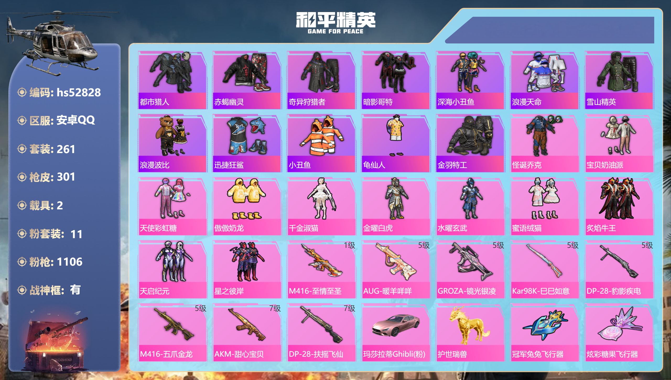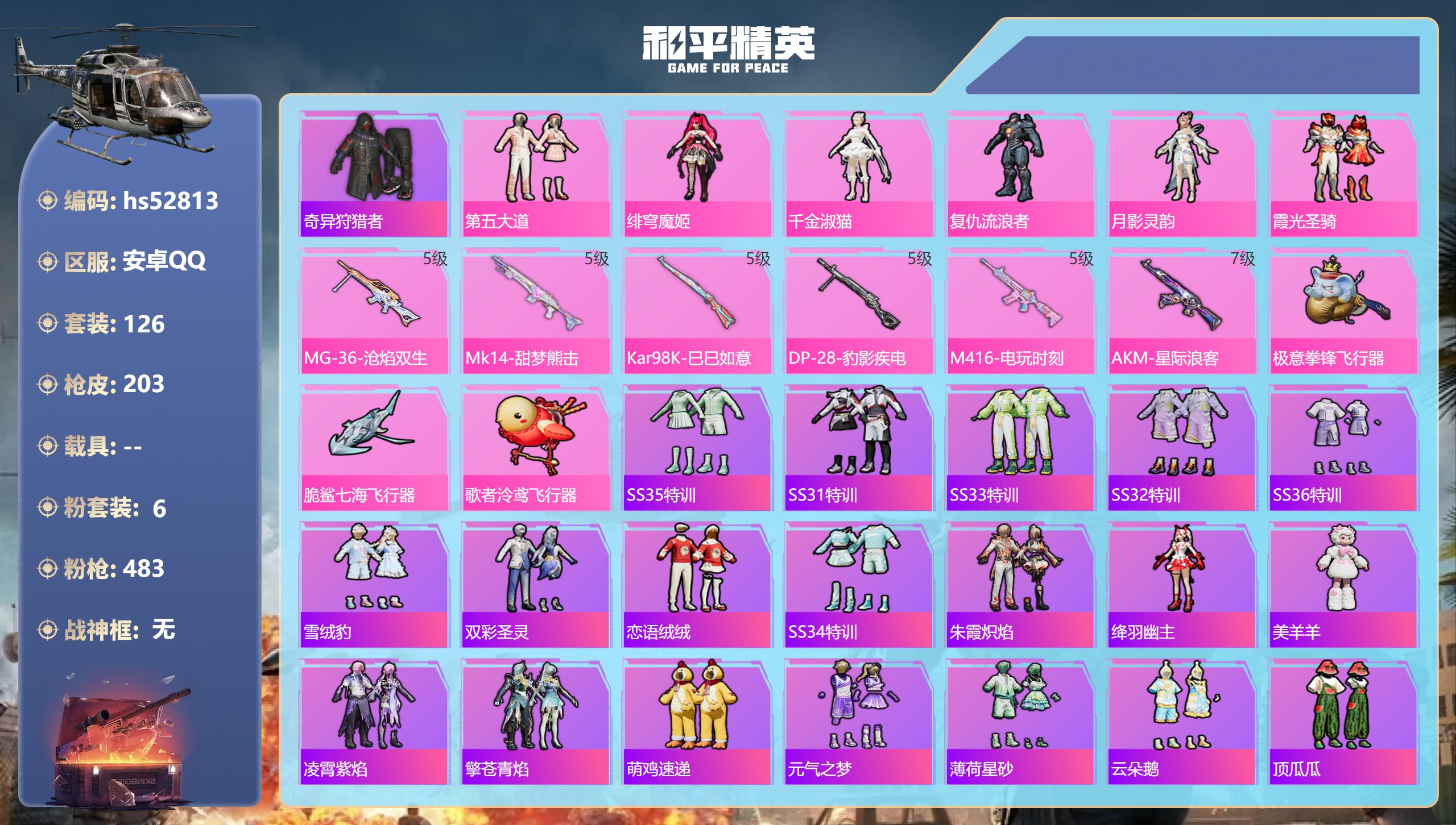 PX_2267992-,苹果微信-14王牌印记-有战神框-2红装-25粉装-20特效枪-11载具-热力值-211套装-299枪皮-7卓越印记-6传奇印记 【2红装】幽焰骑士-维塔/1级,沙丘之主-图卡盟/2级 【25粉装】角色-冰域雷影,套装-仲夏莫吉托,套装-天使彩虹糖,套装-第五大道,角色-千金淑猫,角色-小蓝,套装-垂柳戏鸭,套装-梦幻火箭,套装-未来领航者,套装-星穹咏叹调,套装-怪诞乔克,时空协奏·回响,套装-甜心巧克力,角色-圣堂之誓,角色-初号机,觉醒Ver.,套装-宝贝奶油派,套装-放客神游,角色-星梦奇缘,角色-呆萌星弥,角色-金域紫灵,角色-荧海星豚,套装-雪国幻梦,角色-异瞳寒姬,角色-奇迹舞步,美雪,套装-极限特训 【20特效枪】Kar98K-巳巳如意/5级,汤姆逊-热量炸弹/5级,M416-五爪金龙/7级,SVD-月影灵韵/5级,DP-28-千金淑猫/4级,AUG-许七安/5级,M762-甜蜜誓约/4级,撬棍-永恒法杖/3级,DP-28-豹影疾电/5级,MG-36-沧焰双生/5级,AMR-智耀战神/5级,M24-镜域双华/3级,GROZA-镜光银凌/5级,P90-魔童闹海,敖丙/3级,烟雾弹-猫咪绅士/4级,Vector-最终圣卫者/5级,破片手榴弹-瓶中星球/5级,SCAR-L-金蛇镇世/7级,AKM-幽焰骑士/6级,SCAR-L-时空协奏/1级 【2红装】沙丘之主-图卡盟/2级,幽焰骑士-维塔/1级 【15稀有紫装】冥河战士,都市猎人,派对舞王,寒蝎幽灵,Mark.06,8号机,萌熊伴侣背包(3级),暗影哥特,浪漫天命,明日香款战斗服,小丑鱼,龟仙人,许七安,怀庆长公主,临安公主 【11稀有载具】踏焰逐风摩托车,黑曜夜骑,保时捷Taycan,旅行版(冰莓粉),保时捷911,敞篷版(极速黄),冰绡玉鳞,幽澜尊爵(静谧蓝),幽焰风驰摩托车,星河领航(磐石银),路特斯ELETRE(花绽灰),帕加尼imola(艺术银),护世瑞兽 【1僚机】僚机-冰龙团团 【211稀有时装】雪国幻梦,梦幻火箭,初号机,觉醒Ver.,怪诞乔克,甜心巧克力,宝贝奶油派,天使彩虹糖,放客神游,极限特训,第五大道,图卡盟/2级,维塔/1级,奇迹舞步,美雪,星穹咏叹调,异瞳寒姬,荧海星豚,SS35特训,午间小调,SS31特训,SS33特训,SS32特训,彩虹兔,申公豹,蓝冰羽,灵公主,敖闰,雪绒豹,恋语绒绒,SS34特训,朱霞炽焰,紫幽梦,大橘大利,绛羽幽主,喜羊羊,都市猎人,浪漫天命,寒蝎幽灵,龟仙人,Mark.06,临安公主,游乐,暗影哥特,小丑鱼,8号机,明日香款战斗服,怀庆长公主,许七安,凌霄紫焰,粉黛兰香,擎苍青焰,炫彩糖果,绯色魅影,萌鸡速递,元气之梦,风迹短诗,蜜露汐语,薄荷星砂,秘语星愿,粉恋花,云朵鹅,冥河战士,派对舞王,顶瓜瓜,时空协奏·回响,千金淑猫,未来领航者,冰域雷影,圣堂之誓,金域紫灵,垂柳戏鸭,星梦奇缘,仲夏莫吉托,呆萌星弥,小蓝,狂沙舞者,粉雾星云,龙魂突击队,卖崽青蛙,小熊娃娃,异域银装,火种守卫者,都市丽猫,摩登魅猫,绒宝小鹅,街头风暴,星途旅人,冰河战士,鱼渊荷华,俏兔智灵,SS30特训,青团波波,燕燕于飞,战术大师,智谋强哥,雏菊兔兔,糖糖葫芦,香桃花海,蝶变,巳巳如意,湖畔霞光,棉花软糖,SS28特训,白光莹,银尘,冰公主,SS29特训,萝兰蝴蝶,无暇誓言,明鸳圣池,贝斯之夜,焰鹰斗篷,英勇保护者,菲菲,爆裂葡萄,湖雨初晴,纯白誓言,虎虎生威吉莉,夏日音浪,龙的传人,军刀雅典娜,智慧之神,蝶吟花词,恶魔宝贝,特训学院,猎鹰,青年教官,橘黑制服,红色运动,黄色运动,蓝色运动,黄色伏地魔,白色伏地魔,热血青春,活力之心,酒红色名流,湖蓝色名流,黄色名流,SS26特训,漫步者,空岛之星,热情海星,黑色伏地魔,黎明保卫者,炫蓝之夏,纯真浪花,竞技名士,深蓝色名流,猛禽,长空猛禽,特战装甲,旭日情侣,魅力单车,春光漫游,NV战队服,战地督导,特殊使命,暖心熊熊,萌趣咩咩,娇憨猪猪,春日漫步,冰川特警,夏雨游龙,滨海假日,红熊茄茄,麻辣教官,鹰眼刺客,沙暴袭击者,冰冻风暴,完美偶像,人气偶像,幽夜迷踪,幻影武者,破蛋小黄鸡,快闪甜心,绮丽涂鸦,竞技达人朋克,海岛探路者,破晓战魂,霓虹街区,沙漠兵团,SS27特训,牛气冲天,情公主,SS18特训,SS17特训,瑞龙福将,团圆交子,异彩先驱,霓虹极客,空投萌叽,SS19特训,光之冒险,SS20特训,SS21特训,玉兔迎春,深海梦境,SS22特训,SS23特训,呆萌铁蟹,夏日倾情,甜蜜熊情侣,缤纷果语,滨海厨神,莱茵河畔,天籁歌者,白兰地假日,幻羽潜行,海盐绵绵冰,老实芭蕉,王牌教练,SS25特训 【299稀有枪械】QBZ-纯真浪花,AWM-纯真浪花,汤姆逊-纯真浪花,DBS-乌木金纹,AA12-G-纯真浪花,平底锅-纯真浪花,AMR-墨龙九天,SLR-墨龙九天,烟雾弹-猫咪绅士/4级,撬棍-朗基努斯之枪,突击盾牌-初号机,觉醒Ver.,汤姆逊-星梦奇缘,蜜獾-精灵梦叶罗丽,S1897-精灵梦叶罗丽,SCAR-L-海盐豹豹,平底锅-精灵梦叶罗丽,P90-魔童闹海,敖丙/3级,MG-36-沧焰双生/5级,撬棍-永恒法杖/3级,DP-28-千金淑猫/4级,GROZA-镜光银凌/5级,AKM-幽焰骑士/6级,SCAR-L-金蛇镇世/7级,汤姆逊-热量炸弹/5级,SVD-月影灵韵/5级,AUG-许七安/5级,破片手榴弹-瓶中星球/5级,Kar98K-巳巳如意/5级,AMR-智耀战神/5级,SCAR-L-时空协奏/1级,DP-28-豹影疾电/5级,Vector-最终圣卫者/5级,野牛-雏菊兔兔,蝎式手枪-金丰海韵,Mk14-冰河战士,平底锅-雏菊兔兔,M762-雏菊兔兔,Mini14-雏菊兔兔,R1895-雏菊兔兔,平底锅-魔法神域,UZI-冰河战士,M16A4-冰河战士,MK20-H-乌木金纹,M24-镜域双华/3级,M416-五爪金龙/7级,M762-甜蜜誓约/4级,DBS-风迹短诗,莫辛纳甘-风迹短诗,Mini14-鸡智如我,Win94-乌木金纹,MK12-风迹短诗,野牛-魔童闹海,敖闰,F57-魔童闹海,敖闰,SVD-冷漠罗丽,烟雾弹-冰澜龙吟,Mk14-魔药课室,AKM-灵猫魔法师,PKM-紫幽梦,汤姆逊-灵猫魔法师,撬棍-灵猫魔法师,MG3-霓彩脉冲,DBS-幻彩电音,M