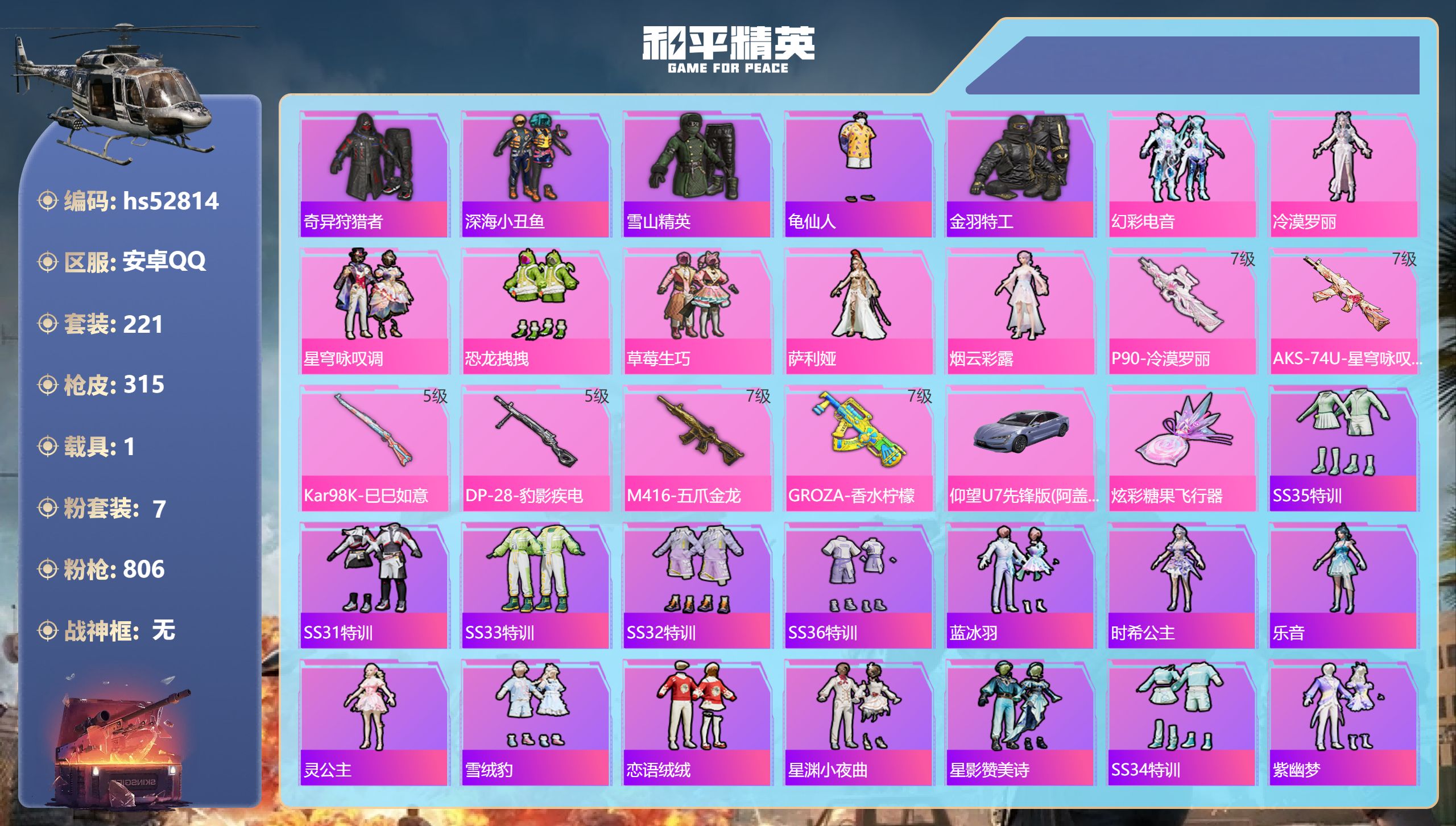 PX_2304542-,安卓手Q-21王牌印记-7粉装-6特效枪-1载具-热力值-221套装-315枪皮-6卓越印记-3传奇印记 【7粉装】套装-幻彩电音,角色-烟云彩露,角色-萨利娅,套装-草莓生巧,角色-冷漠罗丽,套装-恐龙拽拽,套装-星穹咏叹调 【6特效枪】Kar98K-巳巳如意/5级,M416-五爪金龙/7级,P90-冷漠罗丽/7级,DP-28-豹影疾电/5级,GROZA-香水柠檬/7级,AKS-74U-星穹咏叹调/7级 【5稀有紫装】奇异狩猎者,深海小丑鱼,雪山精英,龟仙人,金羽特工 【1稀有载具】仰望U7先锋版(阿盖尔紫) 【221稀有时装】幻彩电音,冷漠罗丽,星穹咏叹调,SS35特训,SS31特训,SS33特训,SS32特训,SS36特训,蓝冰羽,时希公主,乐音,灵公主,雪绒豹,恋语绒绒,星渊小夜曲,星影赞美诗,SS34特训,紫幽梦,大橘大利,奇异狩猎者,龟仙人,雪山精英,深海小丑鱼,金羽特工,炫彩糖果,绯色魅影,萌鸡速递,元气之梦,薄荷星砂,粉恋花,云朵鹅,顶瓜瓜,恐龙拽拽,草莓生巧,萨利娅,烟云彩露,奇趣企鹅,龙魂突击队,小熊娃娃,异域银装,街头风暴,星途旅人,冰河战士,鱼渊荷华,SS30特训,创世·追猎,燕燕于飞,海琴烟,风玲,战术大师,雏菊兔兔,蝶变,湖畔霞光,曼妙人鱼,SS28特训,迷域探索者,机械英豪,机械征服者,SS29特训,萝兰蝴蝶,SS5特训,SS16特训,明鸳圣池,焰鹰斗篷,金鼠迎春,冰爽风暴,福星高照,都市漫游者,虎虎生威吉莉,夏日音浪,龙的传人,军刀雅典娜,SS8特训,众神之王,智慧之神,白熊同盟,萌黄之夏,黄色格斗者,人鱼之吻,海洋之心,红色运动,白色伏地魔,热血青春,SS9特训,酷潮明星,绯格组合,抹茶蜜豆,SS26特训,野性山猫,空岛之星,热情海星,黎明保卫者,炫蓝之夏,纯真浪花,骑行爱好者,竞技名士,蓝色守护者,长空猛禽,竞技勇士朋克,特战装甲,战地菁英,旭日情侣,灰色格斗者,六六大吉,甜蜜告白,街头潮人,怒火燎原,惊鸿侠骨,魅力单车,雪山征服者,春光漫游,夜莺强袭者,丛林猎人,SS2特训,派对绅士,传奇侦探,极地朋克,幻世战舞者,甜蜜菠萝,特殊使命,半糖蓝莓,街舞达人,午夜朋克,特种空勤,牛气满满,萌趣咩咩,和平特警,娇憨猪猪,风暴特警,春日漫步,冰川特警,雷霆特警,燃烧卡路里,滨海假日,SS3特训,SS11特训,幽夜迷踪,SS4特训,梦魇先生,破蛋小黄鸡,疯狂小兔子,青龙圣者,圣诞大吉,熔岩使者,快闪甜心,凛冬战士,梦幻奶油,北国孤狼,蓝彩潮人,SS6特训,拳皇97草薙京,神秘领域,炽焰拳师,骁骑迪迦,格斗专家,耀眼新星,坚韧舞者,奇迹天团,玲珑飞花,原初圣火,超能勇士,逆风勇士,海岛探路者,跃动心情,SS7特训,核芯基因,精神漫游,霓虹街区,森林游猎者,田园牧歌,轻风白浪,SS10特训,沙漠兵团,神秘黑猫,镭射皇者,耀粉歌者,奇趣章鱼,SS12特训,SS27特训,牛气冲天,迅捷之星,SS18特训,治愈之星,银白舞王,科技之星,SS13特训,飞行日记,SS17特训,竞技角斗士,瑞龙福将,团圆交子,蓝调潮人,异彩先驱,霓虹极客,装甲骑士,SS19特训,光之冒险,SS20特训,SS21特训,玉兔迎春,SS22特训,SS23特训,冰爽海盐,浪漫樱花,甜蜜熊情侣,滨海厨神,SS14特训,幻羽潜行,老实芭蕉,吉莉礼服,旷野奇兵,王牌教练,柠萌假日,粉红小猪,SS24特训,SS25特训,初雨海棠,锦衣飞扬,黑夜传说,SS15特训,深蓝冒险家 【314稀有枪械】QBZ-纯真浪花,AWM-纯真浪花,汤姆逊-纯真浪花,DBS-乌木金纹,AA12-G-纯真浪花,平底锅-纯真浪花,蜜獾-精灵梦叶罗丽,GROZA-海盐豹豹,TMP-9-霓彩节奏,P90-冷漠罗丽/7级,AKS-74U-星穹咏叹调/7级,Kar98K-巳巳如意/5级,DP-28-豹影疾电/5级,野牛-雏菊兔兔,Mk14-冰河战士,平底锅-雏菊兔兔,M762-雏菊兔兔,Mini14-雏菊兔兔,M200-宇宙意志,R1895-雏菊兔兔,UZI-冰河战士,M16A4-冰河战士,MK20-H-乌木金纹,M416-五爪金龙/7级,GROZA-香水柠檬/7级,Win94-乌木金纹,MK12-乌木金纹,SVD-冷漠罗丽,撬棍-冷漠罗丽,破片手榴弹-爆破雪人,PKM-紫幽梦,MG3-霓彩脉冲,SCAR-L-冷漠罗丽,Mk14-紫幽梦,蜜獾-乌木金纹,M762-云朵鹅,S1897-紫幽梦,SVD-云朵鹅,P92-紫幽梦,SPAS-12-狂鲨锋刃,M417-玩趣呆呆,MK20-H-狂鲨锋刃,AUG-冰晶雪宝,铝热弹-炫彩糖果,UZI-炫彩糖果,G36C-星穹咏叹调,短管霰弹-星穹咏叹调,Kar98K-星穹咏叹调,平底锅-紫幽梦,破片手榴弹-海盐豹豹,UMP45-海盐豹豹,AKS-74U-乌木金纹,AKM-涂鸦街区,Famas-乌木金纹,Famas-霓彩脉冲,SPAS-12-云朵鹅,破片手榴弹-拽到爆炸,S1897-糯团青竹,AKS-74U-鸡智如我,沙漠之鹰-云朵鹅,大砍刀-云朵鹅,PKM-啾咪啾咪,M200-爆裂游戏,SVD-霓彩脉冲,SLR-霓彩脉冲,平底锅-属我最6,AC-VAL-六号稻草人,M200-六号稻草人,S12K-霓彩脉冲,AKM-霓彩脉冲,M416-红色方程式,M416-乌木金纹,M416-蓝色火焰,M416-夜灯,M416-糯团青竹,M416-月影鸳鸯,AKM-夜灯,AKM-百万伏特,AKM-生命誓言,AKM-乌木金纹,AKM-冰凉西瓜,AKM-破晓战魂,AKM-龙的传人,AKM-灼热熔岩,AKM-虎虎生威,AKM-萌趣颜团子,AKM-霓虹街区,SCAR-L-雷霆特警,SCAR-L-红色方程式,SCAR-L-玉兔迎春,SCAR-L-乌木金纹,SCAR-L-黄金龙骨,SCAR-L-夜灯,SCAR-L-炫彩节奏,M16A4-机械英豪,M16A4-红色方程式,M16A4-蓝色火焰,M16A4-幻世战舞者,M16A4-乌木金纹,M16A4-生命誓言,GROZA-乌木金纹,GROZA-黑色刀锋,GROZA-雷霆特警,GROZA-异彩先驱,GROZA-影袭,GROZA-田园牧歌,GROZA-彩虹符号,GROZA-治愈之星,AUG-乌木金纹,AUG-魅夜紫皇,AUG-耀粉歌者,AUG-天降萌叽,QBZ-诡娃娃,QBZ-潮汐统领,QBZ-原初圣火,QBZ-乌木金纹,QBZ-彩虹符号,M762-瑞龙福将,M762-镭射皇者,M762-拳皇97,M762-诡娃娃,M762-乌木金纹,M762-牛气冲天,M762-奇异狩猎者,M762-天降萌叽,Mk47-乌木金纹,G36C-乌木金纹,G36C-金风玉露,G36C-暗夜玫瑰,AC-VAL-快闪甜心,蜜獾-天降萌叽,蜜獾-娇憨猪猪,Kar98K-乌木金纹,