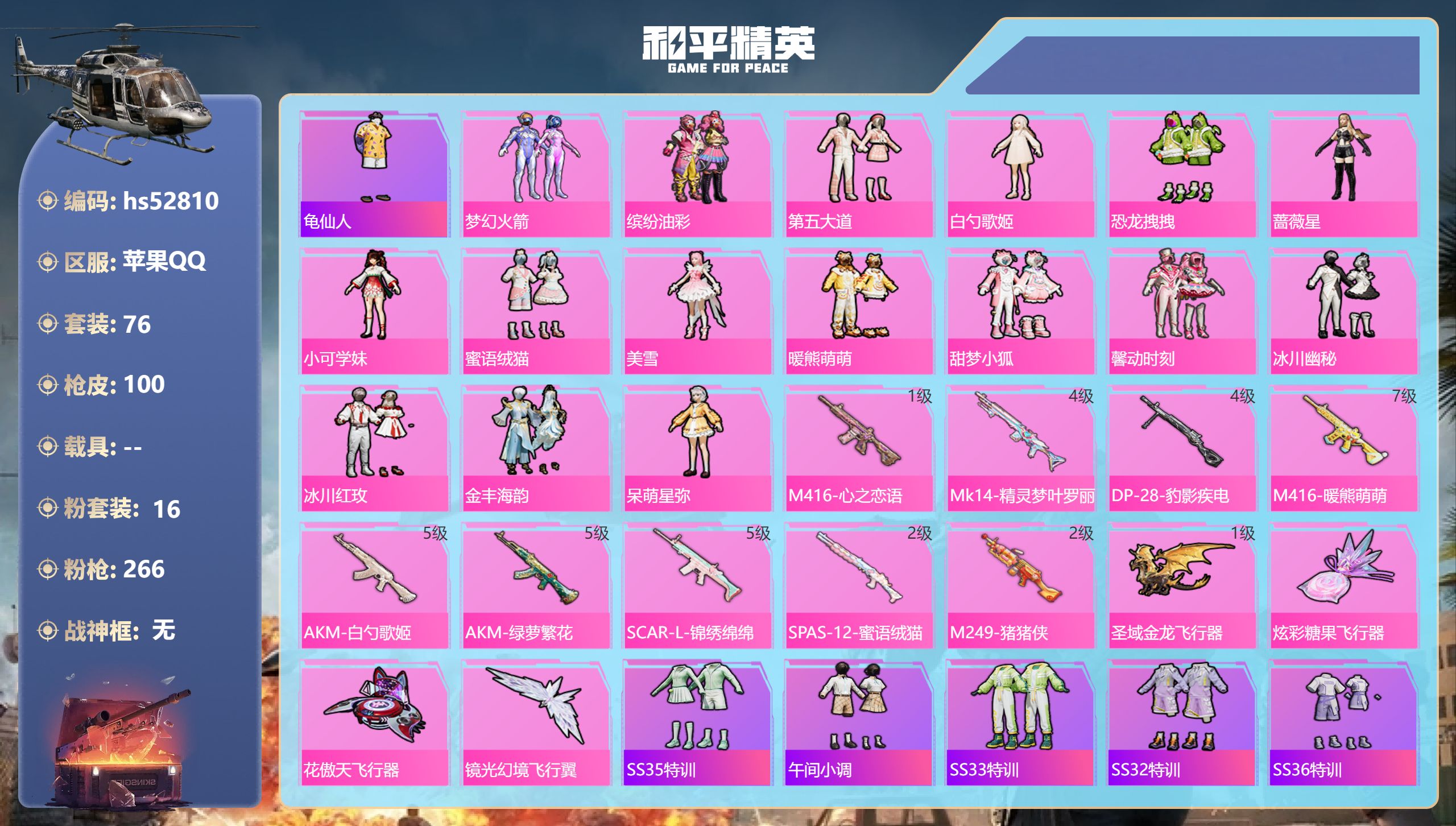 PX_2273064-,苹果手Q-15王牌印记-有战神框-14粉装-8特效枪-2载具-72724热力值-153套装-218枪皮-2卓越印记-1传奇印记 【14粉装】套装-冰霜白皇,角色-圣堂之誓,套装-蜜桃特工,套装-吟月归客,角色-初号机款机体服,套装-炙焰牛王,套装-宝贝奶油派,套装-蝶舞蔷薇,套装-天使彩虹糖,套装-梦幻火箭,套装-琉璃脉冲,套装-炙焰红王,角色-异瞳寒姬,套装-星夜魔法师 【8特效枪】M416-心之恋语/4级,M416-五爪金龙/1级,SCAR-L-纯梦嫁纱/4级,蜜獾-异瞳寒姬/2级,M416-风花雪月/7级,M762-甜蜜誓约/4级,DP-28-豹影疾电/5级,AKM-梦之光华/5级 【6稀有紫装】奇异狩猎者,浪漫天命,迅捷狂鲨,明日香款战斗服,龟仙人,真理款战斗服 【2稀有载具】玛莎拉蒂Ghibli(粉),玛莎拉蒂MC20(星石白) 【153稀有时装】梦幻火箭,初号机款机体服,宝贝奶油派,天使彩虹糖,异瞳寒姬,SS35特训,午间小调,SS34特训,朱霞炽焰,浪漫天命,奇异狩猎者,龟仙人,迅捷狂鲨,明日香款战斗服,真理款战斗服,紫俏灵猫,凌霄紫焰,炫彩糖果,绯色魅影,萌鸡速递,元气之梦,风迹短诗,圣堂之誓,琉璃脉冲,炙焰牛王,冰霜白皇,炙焰红王,吟月归客,星夜魔法师,蜜桃特工,蝶舞蔷薇,潮萌小黄鸭,龙魂突击队,火种守卫者,星途旅人,冰河战士,SS30特训,香桃花海,蝶变,SS28特训,白光莹,SS29特训,SS16特训,暴风机械师,时空追击者,金鼠迎春,福星高照,暗夜契约,纯白誓言,夏日音浪,龙的传人,白熊同盟,极速竞梦,飞驰魅影,白色伏地魔,音速流光,热血青春,冰川格斗者,酷潮明星,涂山之恋,SS26特训,漫步者,空岛之星,荧惑魅影,黎明保卫者,竞技名士,蓝色守护者,浑天鲲鹏,长空猛禽,特战装甲,六六大吉,魅力单车,猎梦纪元,甜心亚梦,虚音幻奏,极地朋克,幻世战舞者,特殊使命,午夜朋克,牛气满满,萌趣咩咩,娇憨猪猪,冰川特警,滨海假日,麻辣教官,鹰眼刺客,冰冻风暴,SS11特训,破蛋小黄鸡,疯狂小兔子,玄武圣者,暗金炫舞,骁骑迪迦,原初圣火,逆风勇士,海岛探路者,霓虹街区,田园牧歌,都市魅力,萌趣颜团子,轻风白浪,特种颜团子,沙漠兵团,镭射皇者,耀粉歌者,探宝勇士,SS12特训,SS27特训,牛气冲天,迅捷之星,SS18特训,治愈之星,银白舞王,清新柠檬,科技之星,SS13特训,飞行日记,SS17特训,瑞龙福将,团圆交子,缤纷焰火,异彩先驱,霓虹极客,空投萌叽,SS19特训,光之冒险,SS20特训,SS21特训,玉兔迎春,深海梦境,SS22特训,SS23特训,夏日倾情,甜蜜熊情侣,缤纷果语,莱茵河畔,SS14特训,电音精灵,龙舌兰冰茶,神气柴柴,灵蜜圈圈,妙红点点,幻彩翩翩,海盐绵绵冰,冷血极客,王牌教练,柠萌假日,SS24特训,鹤鸣,懵萌河马,SS25特训,万圣娃娃,SS15特训 【218稀有枪械】M416-心之恋语/4级,DBS-乌木金纹,DBS-创世·救赎,SCAR-L-海盐豹豹,GROZA-海盐豹豹,蜜獾-异瞳寒姬/2级,DP-28-豹影疾电/5级,Mk14-冰河战士,UZI-冰河战士,M16A4-冰河战士,MK20-H-乌木金纹,M416-五爪金龙/1级,M416-风花雪月/7级,AKM-梦之光华/5级,SCAR-L-纯梦嫁纱/4级,M762-甜蜜誓约/4级,DBS-风迹短诗,莫辛纳甘-风迹短诗,Win94-乌木金纹,MK12-风迹短诗,铝热弹-炫彩糖果,UZI-炫彩糖果,Mk47-风迹短诗,JS9-凌霄紫焰,MG-36-凌霄紫焰,ARX-凌霄紫焰,AKS-74U-乌木金纹,AKM-涂鸦街区,蜜獾-风迹短诗,P92-凌霄紫焰,Famas-霓彩脉冲,破片手榴弹-拽到爆炸,十字弩-异瞳寒姬,信号枪-异瞳寒姬,平底锅-凌霄紫焰,Mk14-薄荷星砂,SVD-霓彩脉冲,SLR-霓彩脉冲,SCAR-L-彩虹符号,S12K-霓彩脉冲,AKM-霓彩脉冲,M416-红色方程式,M416-仓鼠灰灰,M416-蓝色火焰,M416-糯团青竹,AKM-影袭,AKM-夜灯,AKM-彩虹符号,AKM-春暖花开,AKM-冰凉西瓜,AKM-破晓战魂,AKM-龙的传人,AKM-萌趣颜团子,AKM-霓虹街区,SCAR-L-红色方程式,SCAR-L-玉兔迎春,SCAR-L-暗夜玫瑰,SCAR-L-黄金龙骨,SCAR-L-夜灯,SCAR-L-炫彩节奏,M16A4-蓝色火焰,M16A4-甜心亚梦,GROZA-异彩先驱,GROZA-影袭,GROZA-田园牧歌,GROZA-懵萌河马,GROZA-治愈之星,AUG-天降萌叽,QBZ-飞驰魅影,QBZ-原初圣火,QBZ-未来歌姬,M762-瑞龙福将,M762-镭射皇者,M762-拳皇97,M762-诡娃娃,M762-牛气冲天,M762-甜心宝贝,M762-烈焰拳霸,M762-彩虹甜喵,M762-天降萌叽,M762-枪炮玫瑰,Mk47-乌木金纹,Mk47-妙红点点,G36C-乌木金纹,G36C-暗夜玫瑰,G36C-懵萌河马,G36C-炙焰牛王,G36C-时空追击者,AC-VAL-天降萌叽,AC-VAL-甜心亚梦,AC-VAL-乌木金纹,蜜獾-天降萌叽,蜜獾-娇憨猪猪,Kar98K-乌木金纹,Kar98K-王子的夏天,Kar98K-红色方程式,Kar98K-飞驰魅影,Kar98K-彩虹符号,Kar98K-欢乐麻酱,Kar98K-炫彩节奏,M24-乌木金纹,M24-影袭,M24-治愈之星,M24-炫彩节奏,AWM-天降萌叽,AWM-乌木金纹,AWM-飒粉甜心,Win94-瑞龙福将,莫辛纳甘-乌木金纹,莫辛纳甘-懵萌河马,AMR-乌木金纹,AMR-妙红点点,SKS-时空追击者,SKS-糯团青竹,VSS-乌木金纹,VSS-枪炮玫瑰,VSS-田园牧歌,VSS-镭射皇者,Mini14-梦幻火箭,Mini14-原初圣火,Mini14-炫彩节奏,Mini14-星夜魔法师,Mini14-涂山之恋,Mini14-异彩先驱,Mk14-治愈之星,Mk14-乌木金纹,SLR-彩虹符号,SLR-娇憨猪猪,QBU-烈焰拳霸,UZI-炫彩节奏,UZI-红色方程式,UZI-影袭,UZI-娇憨猪猪,UZI-天降萌叽,UMP45-涂山之恋,UMP45-蓝色火焰,UMP45-春暖花开,UMP45-时空追击者,UMP45-诡娃娃,UMP45-炫光之旅,Vector-暗夜玫瑰,Vector-生命誓言,Vector-枪炮玫瑰,Vector-彩虹符号,Vector-治愈之星,Vector-田园牧歌,汤姆逊-天降萌叽,汤姆逊-乌木金纹,汤姆逊-异彩先驱,汤姆逊-环太平洋,野牛-乌木金纹,MP5K-异彩先驱,MP5K-繁花小夜曲,MP5K-乌木金纹,MP5K-飒粉甜心,P90-乌木金纹,P90-飞驰魅影,P90-玩趣呆呆,S686-红色方程式,S686-生命誓言,S1897-镭射皇者,S1897-星夜魔法师,S1897-乌木金纹,S1897-炫