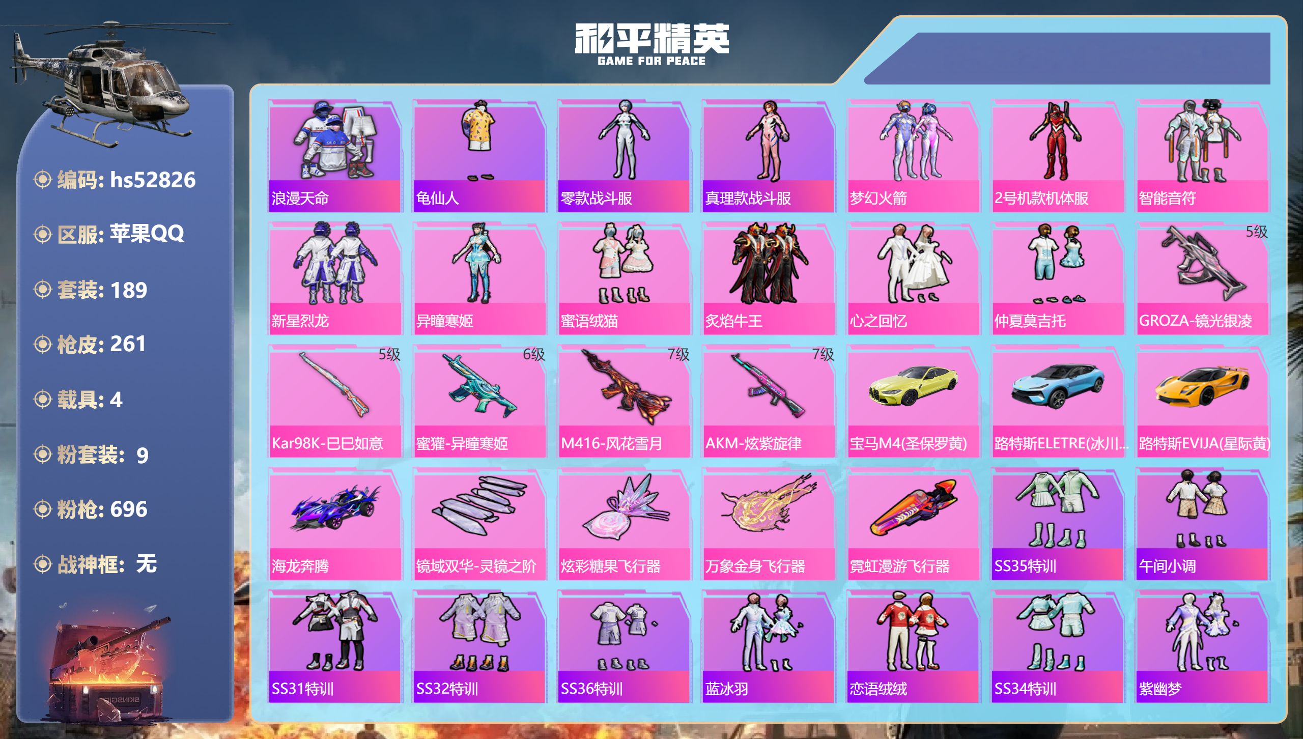 PX_2304539-,苹果手Q-14王牌印记-9粉装-5特效枪-4载具-88042热力值-189套装-261枪皮-2卓越印记-1传奇印记 【9粉装】角色-异瞳寒姬,套装-智能音符,角色-2号机款机体服,套装-新星烈龙,套装-炙焰牛王,套装-心之回忆,套装-梦幻火箭,套装-蜜语绒猫,套装-仲夏莫吉托 【5特效枪】蜜獾-异瞳寒姬/6级,M416-风花雪月/7级,GROZA-镜光银凌/5级,AKM-炫紫旋律/7级,Kar98K-巳巳如意/5级 【4稀有紫装】浪漫天命,龟仙人,零款战斗服,真理款战斗服 【4稀有载具】宝马M4(圣保罗黄),路特斯ELETRE(冰川蓝),路特斯EVIJA(星际黄),海龙奔腾 【189稀有时装】梦幻火箭,2号机款机体服,智能音符,新星烈龙,异瞳寒姬,SS35特训,午间小调,SS31特训,SS32特训,SS36特训,蓝冰羽,恋语绒绒,SS34特训,紫幽梦,浪漫天命,龟仙人,零款战斗服,真理款战斗服,紫俏灵猫,炫彩糖果,绯色魅影,风迹短诗,秘语星愿,樱梦幻音,蜜语绒猫,炙焰牛王,心之回忆,仲夏莫吉托,激萌罗小黑,暴走罗小黑,石蕴玉辉,小熊娃娃,狂花道·雅典娜,暗夜风云,纯白跃动,白糯汤圆,星途旅人,冰河战士,鱼渊荷华,SS30特训,燕燕于飞,战术大师,雏菊兔兔,米开朗基罗,蝶变,SS28特训,迷域探索者,SS29特训,萝兰蝴蝶,SS16特训,暴风机械师,时空追击者,焰鹰斗篷,军械专家,金鼠迎春,翡翠奔狼,炫光向阳,福星高照,虎虎生威吉莉,夏日音浪,龙的传人,军刀雅典娜,SS8特训,青玉碎影,萌黄之夏,蝶吟花词,摇滚狂鲨,特训学院,猎鹰,青年教官,红色运动,黄色运动,蓝色运动,极速竞梦,黄色伏地魔,飞驰魅影,白色伏地魔,音速流光,帅气教官,神秘舞者,湖蓝色名流,黄色名流,丝绸行者,绯格组合,涂山之恋,漫步者,荧惑魅影,黑色伏地魔,炫蓝之夏,竞技名士,猛禽,长空猛禽,竞技勇士朋克,灰色格斗者,怒火燎原,惊鸿侠骨,魅力单车,雪山征服者,猎梦纪元,甜心亚梦,虚音幻奏,幻世战舞者,战地督导,粉甜马卡龙,牛气满满,萌趣咩咩,娇憨猪猪,冰川特警,龙腾端午,滨海假日,麻辣教官,鹰眼刺客,冰冻风暴,幻影武者,破蛋小黄鸡,日照花林,疯狂小兔子,青龙圣者,特战英豪,凛冬战士,北国孤狼,SS6特训,绮丽涂鸦,耀眼新星,竞技达人朋克,野性战心,原初圣火,逆风勇士,跃动心情,SS7特训,核芯基因,和煦暖阳,霓虹街区,田园牧歌,萌趣颜团子,轻风白浪,特种颜团子,沙漠兵团,镭射皇者,耀粉歌者,探宝勇士,照水倚天,SS12特训,白啸长虹,SS27特训,牛气冲天,情公主,SS18特训,治愈之星,银白舞王,科技之星,SS13特训,飞行日记,岑岑玉浪,SS17特训,瑞龙福将,团圆交子,金耀舞者,SS19特训,光之冒险,SS20特训,SS21特训,绝对偶像,玉兔迎春,SS22特训,SS23特训,浪漫樱花,甜蜜熊情侣,SS14特训,龙舌兰冰茶,神气柴柴,灵蜜圈圈,妙红点点,幻彩翩翩,格斗先锋,幻羽潜行,海盐绵绵冰,海上生明月,王牌教练,荣耀,柠萌假日,粉红小猪,SS24特训,鹤鸣,懵萌河马,SS25特训,锦衣飞扬,SS15特训,深蓝冒险家 【261稀有枪械】AMR-墨龙九天,蜜獾-精灵梦叶罗丽,平底锅-精灵梦叶罗丽,GROZA-镜光银凌/5级,Kar98K-巳巳如意/5级,蜜獾-异瞳寒姬/6级,野牛-雏菊兔兔,Mk14-冰河战士,平底锅-雏菊兔兔,M762-雏菊兔兔,Mini14-雏菊兔兔,Famas-突变脉冲,R1895-雏菊兔兔,撬棍-突变脉冲,UZI-冰河战士,M16A4-冰河战士,MK20-H-乌木金纹,M416-风花雪月/7级,AKM-炫紫旋律/7级,DBS-风迹短诗,莫辛纳甘-风迹短诗,Win94-乌木金纹,MK12-风迹短诗,MK12-乌木金纹,破片手榴弹-爆破雪人,PKM-紫幽梦,MG3-霓彩脉冲,Mk14-紫幽梦,蜜獾-乌木金纹,S1897-紫幽梦,P92-紫幽梦,SPAS-12-狂鲨锋刃,突击盾牌-绝对恒星,铝热弹-炫彩糖果,UZI-炫彩糖果,Mk47-风迹短诗,平底锅-紫幽梦,蜜獾-风迹短诗,十字弩-异瞳寒姬,S1897-糯团青竹,信号枪-异瞳寒姬,汤姆逊-智耀战神,PKM-啾咪啾咪,M416-红色方程式,M416-蓝色火焰,M416-夜灯,M416-糯团青竹,M416-诡夜天鹅,AKM-胡桃卫兵,AKM-影袭,AKM-夜灯,AKM-四圣焕新,AKM-奇异狩猎者,AKM-生命誓言,AKM-乌木金纹,AKM-彩虹符号,AKM-破晓战魂,AKM-龙的传人,AKM-灼热熔岩,AKM-虎虎生威,AKM-萌趣颜团子,AKM-霓虹街区,SCAR-L-玉兔迎春,SCAR-L-乌木金纹,SCAR-L-青丘仙客,SCAR-L-扶摇飞仙,SCAR-L-未来战士,SCAR-L-炫彩节奏,M16A4-幻世战舞者,M16A4-甜心亚梦,M16A4-乌木金纹,GROZA-乌木金纹,GROZA-恐龙拽拽,GROZA-影袭,GROZA-田园牧歌,GROZA-懵萌河马,GROZA-彩虹符号,GROZA-治愈之星,AUG-耀粉歌者,AUG-怪笑疯兔,AUG-甜蜜菠萝,AUG-海螺星光,AUG-天降萌叽,QBZ-飞驰魅影,QBZ-原初圣火,QBZ-银碳小老虎,M762-瑞龙福将,M762-镭射皇者,M762-乌木金纹,M762-绯红前夜,M762-牛气冲天,M762-天降萌叽,Mk47-乌木金纹,Mk47-妙红点点,G36C-乌木金纹,G36C-懵萌河马,G36C-时空追击者,AC-VAL-天降萌叽,AC-VAL-甜心亚梦,AC-VAL-乌木金纹,蜜獾-天降萌叽,蜜獾-垂柳戏鸭,蜜獾-娇憨猪猪,Kar98K-乌木金纹,Kar98K-梦幻火箭,Kar98K-飞驰魅影,Kar98K-彩虹符号,Kar98K-马卡龙,Kar98K-勇闯险境,Kar98K-炫彩节奏,M24-乌木金纹,M24-影袭,M24-奇异狩猎者,M24-治愈之星,M24-炫彩节奏,AWM-乌木金纹,AWM-焰鹰斗篷,AWM-飒粉甜心,Win94-瑞龙福将,莫辛纳甘-蜜语绒猫,莫辛纳甘-乌木金纹,莫辛纳甘-懵萌河马,AMR-妙红点点,M200-仲夏莫吉托,M200-惊鸿侠骨,SKS-勇闯险境,SKS-时空追击者,SKS-夜灯,SKS-炫彩节奏,VSS-乌木金纹,VSS-田园牧歌,VSS-镭射皇者,VSS-彩虹符号,Mini14-原初圣火,Mini14-耀粉歌者,Mini14-马卡龙,Mini14-乌木金纹,Mini14-炫彩节奏,Mini14-阿狸红,Mini14-涂山之恋,Mk14-治愈之星,Mk14-海螺星光,Mk14-乌木金纹,SLR-彩虹符号,SLR-娇憨猪猪,SLR-四圣焕新,M417-惊鸿侠骨,UZI-炫彩节奏,UZI-乌木金纹,UZI-影袭,UZI-娇憨