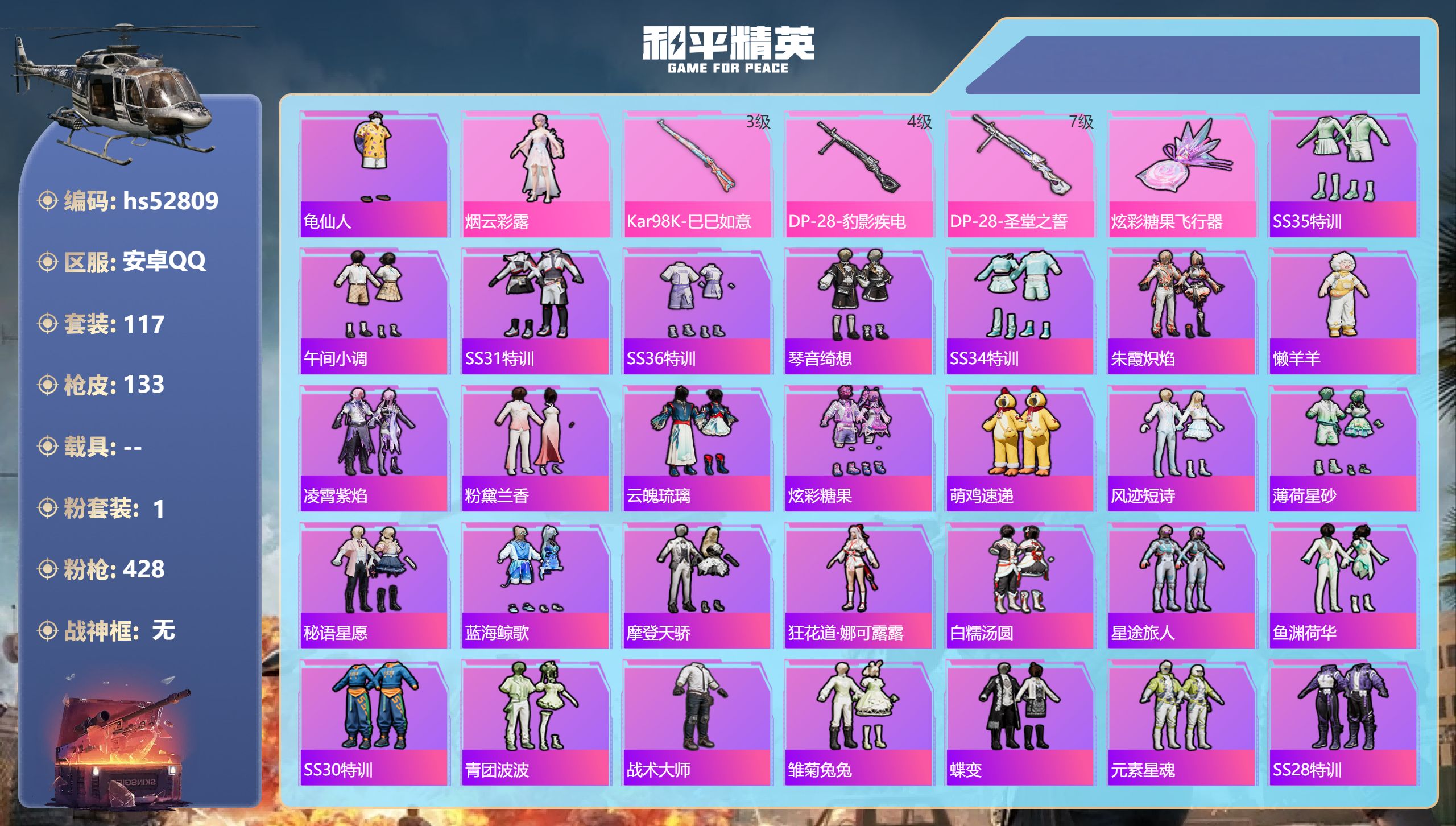 PX_2304547-,安卓手Q-3王牌印记-1粉装-3特效枪-39511热力值-117套装-133枪皮-1卓越印记 【1粉装】角色-烟云彩露 【3特效枪】Kar98K-巳巳如意/3级,DP-28-豹影疾电/4级,DP-28-圣堂之誓/7级 【1稀有紫装】龟仙人 【117稀有时装】SS35特训,午间小调,SS31特训,SS36特训,琴音绮想,SS34特训,朱霞炽焰,龟仙人,懒羊羊,凌霄紫焰,粉黛兰香,云魄琉璃,炫彩糖果,萌鸡速递,风迹短诗,薄荷星砂,秘语星愿,蓝海鲸歌,烟云彩露,摩登天骄,狂花道·娜可露露,白糯汤圆,星途旅人,鱼渊荷华,SS30特训,青团波波,战术大师,雏菊兔兔,蝶变,元素星魂,SS28特训,SS29特训,萝兰蝴蝶,贝斯之夜,牛仔情诗,焰鹰斗篷,龙的传人,青玉碎影,萌黄之夏,蝶吟花词,特训学院,猎鹰,青年教官,橘黑制服,红色运动,黄色运动,蓝色运动,黄色伏地魔,白色伏地魔,音速流光,酒红色名流,湖蓝色名流,黄色名流,绯格组合,涂山之恋,SS26特训,空岛之星,热情海星,黑色伏地魔,纯真浪花,竞技名士,深蓝色名流,猛禽,长空猛禽,特战装甲,街头潮人,冷焰舞者,惊鸿侠骨,魅力单车,灼焰舞者,春光漫游,幻世战舞者,战地督导,青涩时光,青春校园,牛气满满,萌趣咩咩,娇憨猪猪,极速红龙,麻辣教官,完美偶像,人气偶像,幻影武者,破蛋小黄鸡,疯狂小兔子,快闪甜心,蓝彩潮人,绮丽涂鸦,竞技达人朋克,破晓战魂,霓虹街区,田园牧歌,都市魅力,轻风白浪,耀粉歌者,SS27特训,飞行日记,光之冒险,SS21特训,玉兔迎春,SS22特训,SS23特训,缤纷果语,香榭午后,神气柴柴,妙红点点,幻彩翩翩,幻羽潜行,海盐绵绵冰,吉莉礼服,王牌教练,荣耀,柠萌假日,SS24特训,懵萌河马,SS25特训,锦衣飞扬 【133稀有枪械】QBZ-纯真浪花,AWM-纯真浪花,汤姆逊-纯真浪花,DBS-乌木金纹,AA12-G-纯真浪花,平底锅-纯真浪花,S1897-精灵梦叶罗丽,SCAR-L-海盐豹豹,Kar98K-巳巳如意/3级,DP-28-豹影疾电/4级,野牛-雏菊兔兔,平底锅-雏菊兔兔,M762-雏菊兔兔,Mini14-雏菊兔兔,R1895-雏菊兔兔,MK20-H-乌木金纹,DP-28-圣堂之誓/7级,DBS-风迹短诗,莫辛纳甘-风迹短诗,Win94-乌木金纹,MK12-风迹短诗,MK12-乌木金纹,破片手榴弹-爆破雪人,ACE32-画境星梦,M1加兰德-画境星梦,MP5K-画境星梦,SPAS-12-狂鲨锋刃,AUG-冰晶雪宝,铝热弹-炫彩糖果,UZI-炫彩糖果,AA12-G-画境星梦,Mk47-风迹短诗,JS9-凌霄紫焰,MG-36-凌霄紫焰,ARX-凌霄紫焰,AKS-74U-乌木金纹,电击枪-喜羊羊与灰太狼,蜜獾-风迹短诗,爆炸猎弓-喜羊羊与灰太狼,P92-凌霄紫焰,Famas-霓彩脉冲,破片手榴弹-拽到爆炸,平底锅-凌霄紫焰,SLR-霓彩脉冲,SCAR-L-彩虹符号,S12K-霓彩脉冲,AKM-霓彩脉冲,M416-糯团青竹,AKM-龙的传人,SCAR-L-玉兔迎春,SCAR-L-炫彩节奏,M16A4-莲影清波,GROZA-田园牧歌,GROZA-懵萌河马,QBZ-彩虹符号,M762-天降萌叽,M762-萌物绒绒,Mk47-乌木金纹,Mk47-妙红点点,Mk47-洛神天依,G36C-懵萌河马,AC-VAL-天降萌叽,AC-VAL-快闪甜心,AC-VAL-彩虹甜喵,AC-VAL-乌木金纹,蜜獾-天降萌叽,蜜獾-娇憨猪猪,AWM-圣堂之誓,AWM-焰鹰斗篷,莫辛纳甘-乌木金纹,莫辛纳甘-懵萌河马,AMR-乌木金纹,AMR-妙红点点,M200-惊鸿侠骨,SKS-糯团青竹,VSS-田园牧歌,VSS-彩虹符号,Mini14-炫彩节奏,SLR-娇憨猪猪,M417-惊鸿侠骨,MK20-H-快闪甜心,UZI-娇憨猪猪,UZI-天降萌叽,UZI-啾咪啾咪,UMP45-涂山之恋,Vector-田园牧歌,Vector-焰鹰斗篷,汤姆逊-天降萌叽,汤姆逊-暗夜鎏金,MP5K-乌木金纹,P90-乌木金纹,P90-快闪甜心,P90-玩趣呆呆,S1897-炫彩节奏,S12K-玩趣呆呆,S12K-娇憨猪猪,S12K-垂柳戏鸭,DBS-焰鹰斗篷,DBS-彩虹符号,SPAS-12-田园牧歌,M249-彩虹符号,M249-妙红点点,DP-28-焰鹰斗篷,DP-28-彩虹符号,MG3-惊鸿侠骨,MG3-幻世战舞者,MG3-妙红点点,MG3-乌木金纹,PKM-懵萌河马,沙漠之鹰-快闪甜心,TMP-9-江南烟雨,平底锅-惊鸿侠骨,平底锅-空岛之星,平底锅-懵萌河马,平底锅-田园牧歌,平底锅-娇憨猪猪,平底锅-妙红点点,平底锅-快闪甜心,平底锅-焰鹰斗篷,撬棍-巴啦啦小魔仙,爆炸猎弓-惊鸿侠骨,破片手榴弹-呆爆全场,Win94-拳皇·狂花道,MK20-H-糖糖葫芦,野牛-燕燕于飞,M200-乌木金纹,SPAS-12-燕燕于飞,蝎式手枪-燕燕于飞,蜜獾-糖糖葫芦,UMP45-糖糖葫芦,SPAS-12-乌木金纹,平底锅-糖糖葫芦,Vector-燕燕于飞 【4稀有飞行器】炫彩糖果飞行器,登顶巅峰飞行器,空岛之星尾迹,公主华盖飞行器 【23稀有背包】海盐豹豹背包(3级),白蛇盈舞背包(3级),精灵梦叶罗丽背包(3级),极意拳锋背包(3级),狂鲨锋刃背包(3级),奇迹舞步背包(3级),炫彩糖果背包(3级),喜羊羊与灰太狼背包(3级),凌霄紫焰背包(3级),粉黛兰香背包(3级),萌鸡速递背包(3级),薄荷星砂背包(3级),风迹短诗背包(3级),龟仙人龟壳背包(3级),破晓战魂背包(3级),快闪甜心背包(3级),蝶变背包(3级),甜蜜旋律背包(3级),娇憨猪猪背包(3级),龙的传人背包(3级),洛神天依背包(3级),莲影清波背包(3级),玉兔迎春背包(3级)