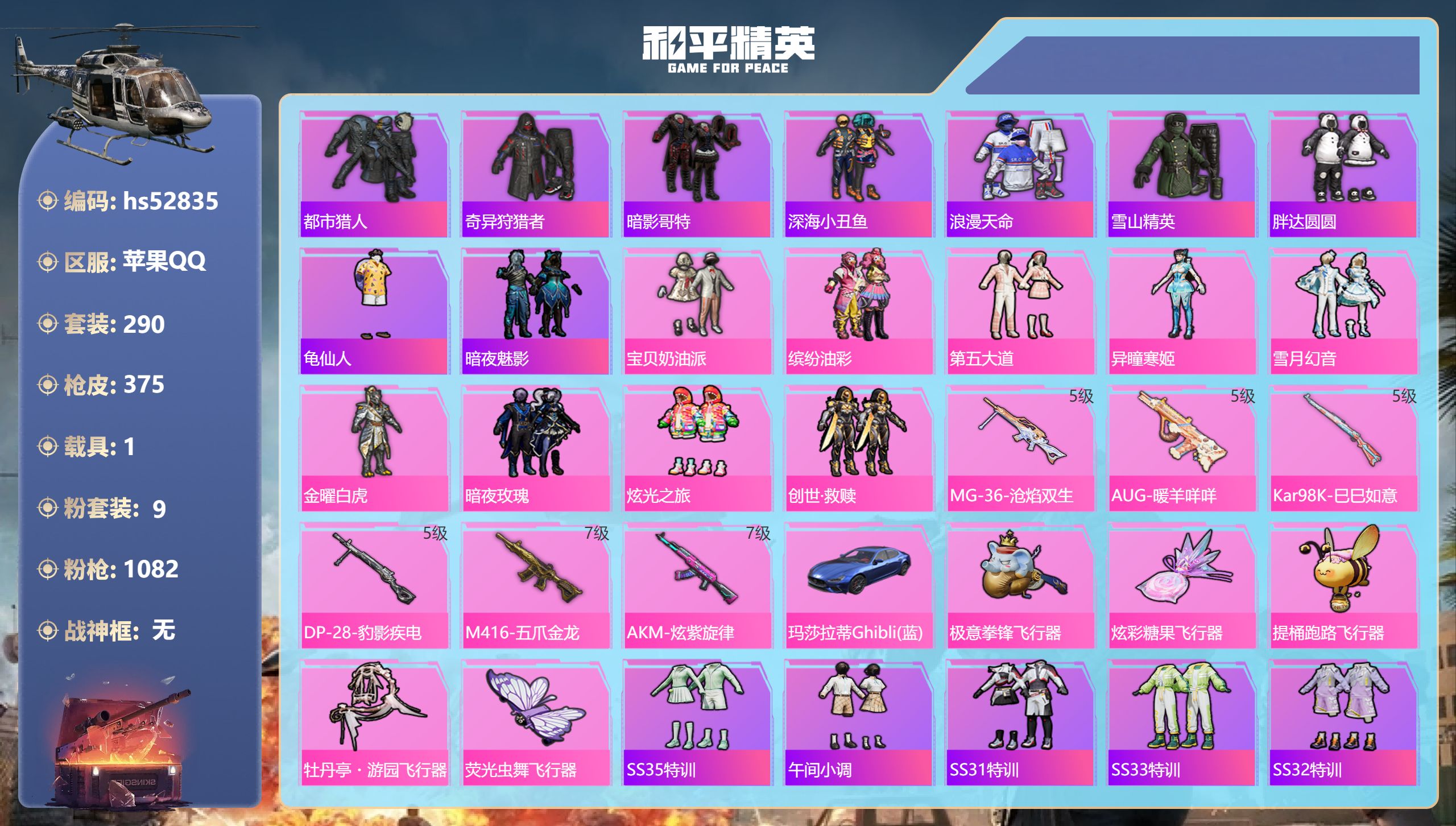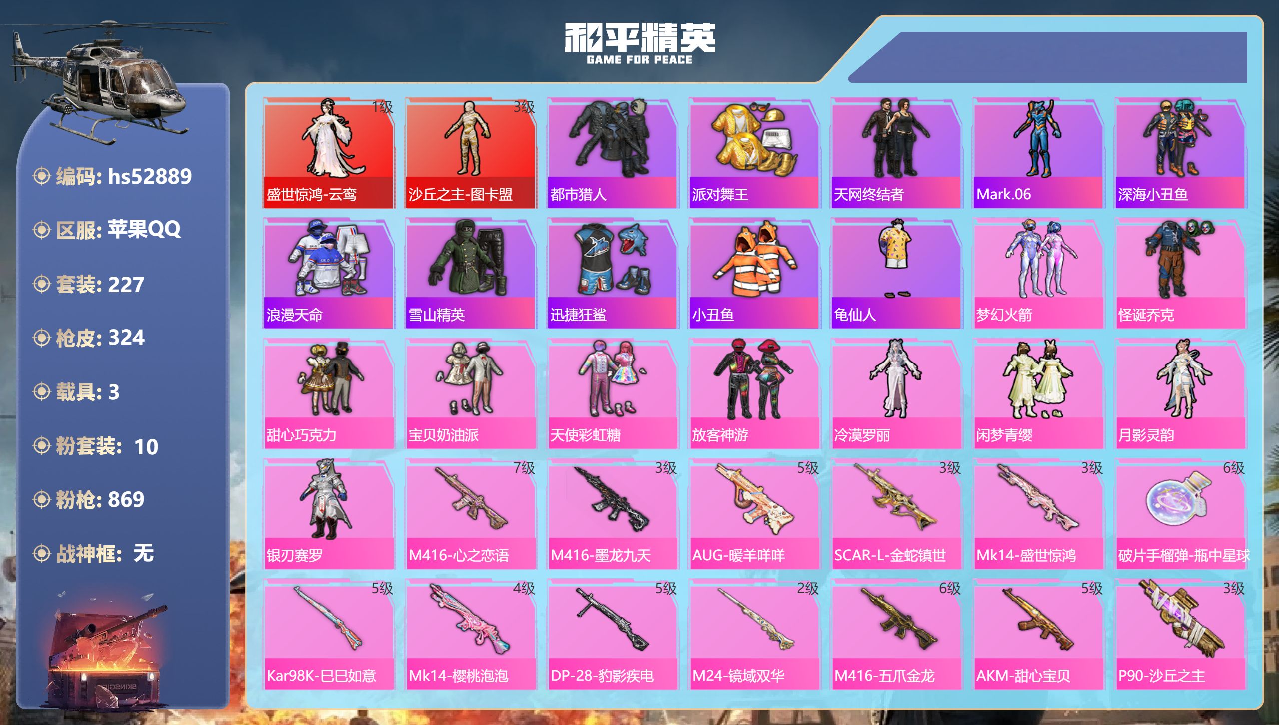 PX_2273120-,苹果手Q-24王牌印记-有战神框-1红装-22粉装-10特效枪-2载具-热力值-263套装-290枪皮-2卓越印记-1传奇印记 【1红装】沙丘之主-图卡盟/2级 【22粉装】套装-金属狂野,套装-放客神游,套装-紫电风暴,套装-雪国幻梦,角色-洛天依,套装-炫光之旅,套装-馨动时刻,套装-赤焰黑爵,套装-智能音符,套装-岚岚物语,套装-绚金战神,女娲后裔-赵灵儿,套装-梦幻火箭,套装-甜心巧克力,角色-茉莉星,套装-宝贝奶油派,套装-霓虹漫游,套装-怪诞乔克,套装-千面幻镜,套装-山涧鹿灵,套装-冷魅冰骑,套装-天使彩虹糖 【10特效枪】破片手榴弹-粉粉猫爪/7级,M416-五爪金龙/7级,SCAR-L-时空协奏/3级,M416-墨龙九天/3级,M416-风花雪月/5级,P90-沙丘之主/3级,M24-镜域双华/3级,Kar98K-巳巳如意/5级,DP-28-豹影疾电/5级,AKM-魔法神域/3级 【1红装】沙丘之主-图卡盟/2级 【22稀有紫装】冥河战士,都市猎人,派对舞王,2P战斗服款,寒蝎幽灵,天网终结者,2B战斗服款,8号机,萌熊伴侣背包(3级),M416-星际漫游,暗影哥特,深海小丑鱼,沙漠守护者,浪漫天命,胖达圆圆,迅捷狂鲨,胖达团团,小丑鱼,龟仙人,许七安,金羽特工,东方飞龙 【2稀有载具】合金龙骨(红),星梦玉骢 【1僚机】僚机-萌兔起飞 【263稀有时装】雪国幻梦,梦幻火箭,怪诞乔克,甜心巧克力,宝贝奶油派,天使彩虹糖,千面幻镜,智能音符,放客神游,女娲后裔-赵灵儿,绚金战神,洛天依,图卡盟/2级,SS35特训,SS31特训,SS33特训,SS32特训,SS34特训,大橘大利,沙漠守护者,都市猎人,胖达团团,浪漫天命,寒蝎幽灵,龟仙人,暗影哥特,深海小丑鱼,小丑鱼,东方飞龙,8号机,金羽特工,迅捷狂鲨,胖达圆圆,紫俏灵猫,许七安,萌鸡速递,元气之梦,冥河战士,派对舞王,2B战斗服款,天网终结者,2P战斗服款,霓虹漫游,茉莉星,炫光之旅,金属狂野,岚岚物语,赤焰黑爵,冷魅冰骑,紫电风暴,馨动时刻,山涧鹿灵,大橘为重,兔兔白日梦,狂战萌兔,狂沙舞者,Alan,Walker,萌神柯基,龙魂突击队,卖崽青蛙,小熊娃娃,异域银装,街头风暴,蜜桃派对,冰河战士,鱼渊荷华,SS30特训,青团波波,燕燕于飞,战术大师,智谋强哥,雏菊兔兔,糖糖葫芦,香桃花海,巳巳如意,曼妙人鱼,棉花软糖,极地流光,元素星魂,SS28特训,冰公主,SS29特训,萝兰蝴蝶,SS16特训,暴风机械师,无暇誓言,时空追击者,贝斯之夜,焰鹰斗篷,暗夜傀儡,红酒骑士,军械专家,冰爽风暴,湖雨初晴,福星高照,豚鼠丹丹,都市漫游者,虎虎生威吉莉,夏日音浪,龙的传人,春野茶蘼,青芒树下,果汁能量,白熊同盟,萌黄之夏,击剑大师,超能拳王,特训学院,猎鹰,青年教官,橘黑制服,红色运动,黄色运动,蓝色运动,黄色伏地魔,飞驰魅影,白色伏地魔,音速流光,热血青春,登山爱好者,冰川格斗者,壁垒格斗者,SS9特训,深海格斗者,帅气教官,湖蓝色名流,黄色名流,酷潮明星,绯格组合,棕色飞行服,SS26特训,迅猛虎鲸,野性山猫,沙漠雄狮,漫步者,空岛之星,热情海星,黑色伏地魔,黎明保卫者,炫蓝之夏,纯真浪花,骑行爱好者,雪鹰学院,竞技名士,蓝色守护者,深蓝色名流,灰色守护者,猛禽,雨林探路者,长空猛禽,沙漠探路者,西部风情,灰色格斗者,六六大吉,街头潮人,冷焰舞者,惊鸿侠骨,魅力单车,灼焰舞者,青羽突袭者,春光漫游,野性战魂,猎梦纪元,甜心亚梦,虚音幻奏,SMG战队服,极地朋克,贵族骑装,幻世战舞者,战地督导,甜蜜菠萝,特殊使命,突袭者,青春校园,战地名士,牛气满满,萌趣咩咩,迎春赐吉,娇憨猪猪,春日漫步,冰川特警,潮流先锋,龙腾端午,燃烧卡路里,滨海假日,极速红龙,鹰眼刺客,沙暴袭击者,冰冻风暴,SS11特训,幻影武者,青春冒险家,破蛋小黄鸡,潮流游乐家,疯狂小兔子,快闪甜心,蓝彩潮人,千禧之恋,绮丽涂鸦,耀眼新星,竞技达人朋克,朋克治安官,野性战心,海岛探路者,破晓战魂,霓虹街区,萌趣颜团子,SS10特训,风行保卫者,特种颜团子,沙漠兵团,耀粉歌者,探宝勇士,SS12特训,牛气冲天,迅捷之星,SS18特训,治愈之星,科技之星,SS13特训,飞行日记,SS17特训,瑞龙福将,团圆交子,绚烂繁星,缤纷焰火,光影梦想家,异彩先驱,霓虹极客,空投萌叽,SS19特训,SS20特训,SS21特训,弄潮海豚,SS22特训,SS23特训,呆萌铁蟹,浪漫樱花,夏日倾情,甜蜜熊情侣,缤纷果语,闪银刀客,青涩年华,SS14特训,神气柴柴,妙红点点,幻彩翩翩,格斗先锋,幻羽潜行,海盐绵绵冰,吉莉礼服,刚毅裁决者,海上生明月,糯粉咩咩,王牌教练,柠萌假日,粉红小猪,SS24特训,鹤鸣,懵萌河马,SS25特训,锦衣飞扬,SS15特训 【290稀有枪械】QBZ-纯真浪花,AWM-纯真浪花,汤姆逊-纯真浪花,DBS-乌木金纹,AA12-G-纯真浪花,平底锅-纯真浪花,M416-墨龙九天/3级,Famas-墨龙九天,AMR-墨龙九天,SLR-墨龙九天,Vector-创世·救赎,破片手榴弹-粉粉猫爪/7级,蜜獾-精灵梦叶罗丽,S1897-精灵梦叶罗丽,SCAR-L-海盐豹豹,Kar98K-巳巳如意/5级,AKM-魔法神域/3级,SCAR-L-时空协奏/3级,DP-28-豹影疾电/5级,SLR-极冰使者,野牛-雏菊兔兔,Mk14-冰河战士,平底锅-雏菊兔兔,M762-雏菊兔兔,Mini14-雏菊兔兔,M200-宇宙意志,Vector-突变脉冲,R1895-雏菊兔兔,AC-VAL-宇宙意志,M416-极冰使者,UZI-冰河战士,M16A4-冰河战士,MK20-H-乌木金纹,M24-镜域双华/3级,M416-五爪金龙/7级,M416-风花雪月/5级,P90-沙丘之主/3级,Win94-乌木金纹,蜜獾-乌木金纹,UMP45-海盐豹豹,AKS-74U-乌木金纹,AKM-涂鸦街区,Famas-乌木金纹,Famas-霓彩脉冲,破片手榴弹-拽到爆炸,SVD-霓彩脉冲,SCAR-L-彩虹符号,M416-星际漫游,S12K-霓彩脉冲,AKM-霓彩脉冲,M416-红色方程式,M416-仓鼠灰灰,M416-夜灯,M416-糯团青竹,M416-绯红前夜,M416-摩