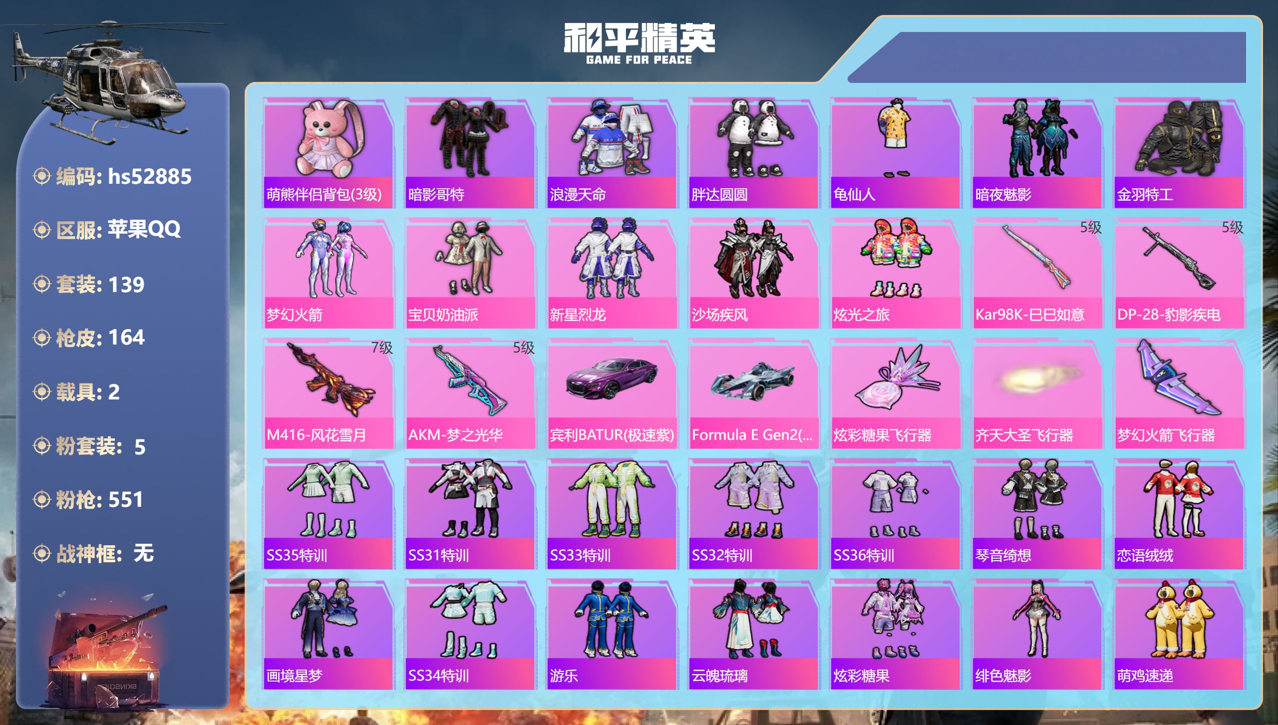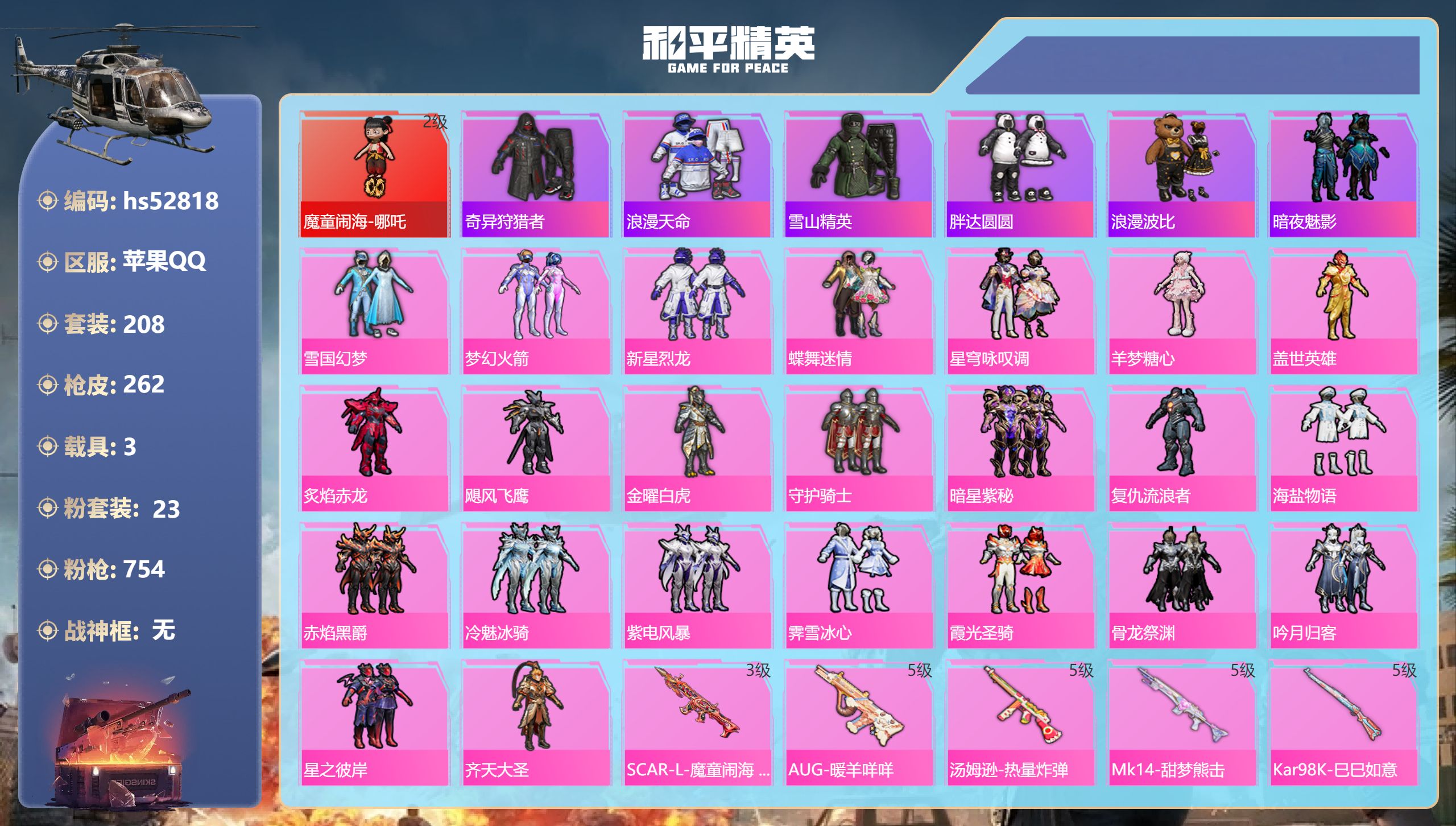 PX_2304530-,苹果手Q-11王牌印记-1红装-23粉装-13特效枪-3载具-热力值-208套装-262枪皮 【1红装】魔童闹海-哪吒/2级 【23粉装】套装-海盐物语,套装-紫电风暴,套装-霁雪冰心,套装-飓风飞鹰,套装-霞光圣骑,套装-蝶舞迷情,套装-金曜白虎,角色-羊梦糖心,套装-炙焰赤龙,套装-新星烈龙,套装-梦幻火箭,角色-复仇流浪者,套装-雪国幻梦,套装-暗星紫秘,套装-冷魅冰骑,套装-盖世英雄,套装-守护骑士,套装-星之彼岸,套装-赤焰黑爵,套装-骨龙祭渊,套装-吟月归客,套装-星穹咏叹调,套装-齐天大圣 【13特效枪】Kar98K-巳巳如意/5级,SCAR-L-机甲封神/5级,UMP45-恐龙拽拽/1级,M762-冷魅冰骑/1级,AUG-暖羊咩咩/5级,汤姆逊-热量炸弹/5级,M762-激战未来/4级,AKM-梦之光华/5级,SCAR-L-魔童闹海,哪吒/3级,M416-暖熊萌萌/6级,UMP45-雪国精灵/6级,DP-28-豹影疾电/5级,Mk14-甜梦熊击/5级 【6稀有紫装】奇异狩猎者,浪漫天命,雪山精英,胖达圆圆,浪漫波比,暗夜魅影 【3稀有载具】玛莎拉蒂Ghibli(金),路特斯ELETRE(冰川蓝),兰博基尼Aventador,SVJ(翡翠绿) 【208稀有时装】雪国幻梦,梦幻火箭,赵灵儿,新星烈龙,蝶舞迷情,哪吒/2级,星穹咏叹调,羊梦糖心,SS35特训,SS31特训,SS33特训,SS32特训,彩虹兔,蓝冰羽,雪绒豹,恋语绒绒,星渊小夜曲,星影赞美诗,SS34特训,朱霞炽焰,紫幽梦,大橘大利,喜羊羊,浪漫天命,暗夜魅影,奇异狩猎者,雪山精英,胖达圆圆,浪漫波比,凌霄紫焰,擎苍青焰,雪夜云雾,薄荷星砂,粉恋花,云朵鹅,顶瓜瓜,新风雅兰,盖世英雄,炙焰赤龙,飓风飞鹰,金曜白虎,守护骑士,暗星紫秘,复仇流浪者,海盐物语,赤焰黑爵,冷魅冰骑,紫电风暴,霁雪冰心,霞光圣骑,骨龙祭渊,吟月归客,星之彼岸,齐天大圣,好奇恐龙,奇趣企鹅,狂战萌兔,狂沙舞者,潮萌小黄鸭,异域银装,街头风暴,鱼渊荷华,SS30特训,燕燕于飞,战术大师,香桃花海,SS28特训,迷域探索者,SS29特训,SS16特训,暴风机械师,时空追击者,软软马卡龙,英勇保护者,智慧隐士,拳皇97八神庵,蔷薇魔法师,威严将相,爆裂葡萄,极乐追光,闪耀星光,福星高照,雪兔飞飞,夏日音浪,龙的传人,军刀雅典娜,SS8特训,黄色格斗者,月蓝流光,摇滚狂鲨,特训学院,猎鹰,橘黑制服,红色运动,黄色运动,蓝色运动,极速竞梦,黄色伏地魔,飞驰魅影,白色伏地魔,音速流光,热血青春,紫翼圣骑,酒红色名流,湖蓝色名流,黄色名流,酷潮明星,顽皮玉兔,绯格组合,幻世尖兵,SS26特训,迅猛虎鲸,野性山猫,空岛之星,炫蓝之夏,竞技名士,雨林探路者,长空猛禽,竞技勇士朋克,特战装甲,粉团憨憨,灰色格斗者,甜蜜告白,街头潮人,怒火燎原,雪山征服者,夜莺强袭者,丛林猎人,甜心亚梦,虚音幻奏,传奇侦探,贵族骑装,特种空勤,牛气满满,萌趣咩咩,和平特警,娇憨猪猪,雷霆特警,极速红龙,红熊茄茄,麻辣教官,完美偶像,SS11特训,梦魇先生,青春冒险家,破蛋小黄鸡,潮流游乐家,疯狂小兔子,圣诞大吉,熔岩使者,凛冬战士,北国孤狼,蓝彩潮人,SS6特训,千禧之恋,神秘领域,炽焰拳师,绮丽涂鸦,格斗专家,星光纪元,坚韧舞者,奇迹天团,淡雅花蕊,玲珑飞花,暗夜武装,跃动心情,SS7特训,核芯基因,精神漫游,森林游猎者,萌趣颜团子,特种颜团子,耀粉歌者,SS12特训,SS27特训,SS18特训,治愈之星,科技之星,飞行日记,SS17特训,瑞龙福将,团圆交子,蓝调潮人,缤纷焰火,异彩先驱,霓虹极客,向日葵先生,空投萌叽,SS19特训,光之冒险,SS21特训,SS22特训,缤纷果语,耀动青春,星河浪客,电音精灵,迪迦奥特曼,赛罗奥特曼,格斗先锋,海盐绵绵冰,游猎者,糯粉咩咩,SS24特训,SS25特训,星梦畅游,黑夜传说,SS15特训,深蓝冒险家 【262稀有枪械】DBS-乌木金纹,SCAR-L-海盐豹豹,SCAR-L-魔童闹海,哪吒/3级,AUG-暖羊咩咩/5级,汤姆逊-热量炸弹/5级,Mk14-甜梦熊击/5级,Kar98K-巳巳如意/5级,DP-28-豹影疾电/5级,M16A4-冰河战士,MK20-H-乌木金纹,M416-暖熊萌萌/6级,AKM-梦之光华/5级,SCAR-L-机甲封神/5级,M762-冷魅冰骑/1级,M762-激战未来/4级,UMP45-雪国精灵/6级,UMP45-恐龙拽拽/1级,Win94-乌木金纹,SVD-冷漠罗丽,G36C-桃粉嫣然,PKM-紫幽梦,汤姆逊-灵猫魔法师,MG3-霓彩脉冲,DBS-幻彩电音,Mk14-紫幽梦,蜜獾-乌木金纹,M762-云朵鹅,S1897-紫幽梦,SVD-云朵鹅,P92-紫幽梦,M417-玩趣呆呆,MK20-H-狂鲨锋刃,铝热弹-炫彩糖果,G36C-星穹咏叹调,短管霰弹-星穹咏叹调,JS9-凌霄紫焰,MG-36-凌霄紫焰,平底锅-紫幽梦,破片手榴弹-海盐豹豹,ARX-凌霄紫焰,AKS-74U-乌木金纹,电击枪-喜羊羊与灰太狼,P92-凌霄紫焰,AMR-喜羊羊与灰太狼,Famas-乌木金纹,SPAS-12-云朵鹅,破片手榴弹-拽到爆炸,S1897-糯团青竹,平底锅-凌霄紫焰,沙漠之鹰-云朵鹅,烟雾弹-冰氧夏日,大砍刀-云朵鹅,PKM-啾咪啾咪,GROZA-荧海星豚,平底锅-属我最6,燃点复合弓-火尖莲影,撬棍-火尖枪,破片手榴弹-火尖莲影,M416-红色方程式,M416-仓鼠灰灰,M416-神秘黑猫,M416-乌木金纹,M416-蓝色火焰,M416-紫翼圣骑,M416-糯团青竹,M416-葫芦兄弟,AKM-环太平洋,AKM-乌木金纹,AKM-彩虹符号,AKM-春暖花开,AKM-龙的传人,AKM-灼热熔岩,AKM-恐龙拽拽,AKM-萌趣颜团子,SCAR-L-雷霆特警,SCAR-L-玉兔迎春,SCAR-L-暗夜玫瑰,SCAR-L-青丘仙客,SCAR-L-银河战甲,M16A4-红色方程式,M16A4-蓝色火焰,M16A4-凝视深渊,M16A4-甜心亚梦,GROZA-乌木金纹,GROZA-春暖花开,GROZA-黑色刀锋,GROZA-异彩先驱,GROZA-蓝莓炮弹,GROZA-恐龙拽拽,GROZA-紫翼圣骑,GROZA-彩虹符号,GROZA-暗夜武装,GROZA-治愈之星,AUG-乌木金纹,AUG-耀粉歌者,AUG-凝视深渊,AUG-青春冒险家,AUG-魔法学院,QBZ-飞驰魅影,QBZ-诡娃娃,QBZ-妙趣可丽,QBZ-赛罗,QBZ-乌木金纹,M762-瑞龙福