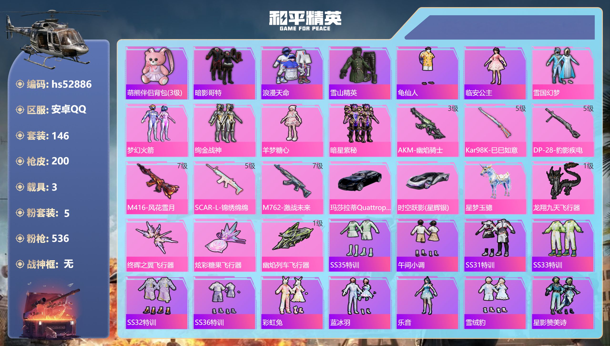 PX_2304535-,安卓手Q-18王牌印记-2粉装-4特效枪-50107热力值-153套装-179枪皮 【2粉装】套装-星之彼岸,套装-蜜桃特工 【4特效枪】Kar98K-巳巳如意/5级,平底锅-仲夏莫吉托/7级,AKM-百合蜜语/7级,DP-28-豹影疾电/5级 【1稀有紫装】龟仙人 【153稀有时装】SS35特训,午间小调,SS31特训,SS33特训,SS32特训,SS36特训,蓝冰羽,霓虹热舞,雪绒豹,恋语绒绒,SS34特训,朱霞炽焰,紫幽梦,大橘大利,龟仙人,游乐,懒羊羊,紫俏灵猫,凌霄紫焰,粉黛兰香,云魄琉璃,擎苍青焰,炫彩糖果,萌鸡速递,风迹短诗,秘语星愿,云朵鹅,顶瓜瓜,蜜桃特工,星之彼岸,龙魂突击队,都市丽猫,白糯汤圆,星途旅人,鱼渊荷华,SS30特训,青团波波,燕燕于飞,战术大师,雏菊兔兔,糖糖葫芦,香桃花海,蝶变,巳巳如意,元素星魂,SS28特训,SS29特训,萝兰蝴蝶,SS16特训,明鸳圣池,焰鹰斗篷,福星高照,都市漫游者,虎虎生威吉莉,夏日音浪,龙的传人,智慧之神,白熊同盟,萌黄之夏,特训学院,猎鹰,青年教官,橘黑制服,红色运动,黄色运动,蓝色运动,黄色伏地魔,白色伏地魔,活力之心,酒红色名流,湖蓝色名流,黄色名流,顽皮玉兔,绯格组合,SS26特训,空岛之星,热情海星,黑色伏地魔,炫蓝之夏,纯真浪花,竞技名士,深蓝色名流,猛禽,长空猛禽,特战装甲,旭日情侣,六六大吉,街头潮人,冷焰舞者,惊鸿侠骨,魅力单车,灼焰舞者,春光漫游,幻世战舞者,战地督导,特殊使命,青涩时光,牛气满满,萌趣咩咩,娇憨猪猪,春日漫步,冰川特警,龙腾端午,滨海假日,极速红龙,麻辣教官,鹰眼刺客,冰冻风暴,完美偶像,人气偶像,幻影武者,梦魇先生,破蛋小黄鸡,快闪甜心,暗金炫舞,蓝彩潮人,绮丽涂鸦,竞技达人朋克,野性战心,海岛探路者,精神漫游,破晓战魂,霓虹街区,都市魅力,耀粉歌者,探宝勇士,SS27特训,牛气冲天,SS18特训,飞行日记,SS17特训,空投萌叽,SS19特训,光之冒险,SS20特训,SS21特训,玉兔迎春,SS22特训,SS23特训,甜蜜熊情侣,缤纷果语,滨海厨神,格斗先锋,幻羽潜行,海盐绵绵冰,老实芭蕉,王牌教练,荣耀,柠萌假日,SS24特训,鹤鸣,SS25特训,锦衣飞扬 【179稀有枪械】QBZ-纯真浪花,AWM-纯真浪花,汤姆逊-纯真浪花,DBS-乌木金纹,AA12-G-纯真浪花,平底锅-纯真浪花,SCAR-L-海盐豹豹,平底锅-精灵梦叶罗丽,GROZA-海盐豹豹,Kar98K-巳巳如意/5级,DP-28-豹影疾电/5级,野牛-雏菊兔兔,Mk14-冰河战士,平底锅-雏菊兔兔,M762-雏菊兔兔,Mini14-雏菊兔兔,R1895-雏菊兔兔,UZI-冰河战士,M16A4-冰河战士,MK20-H-乌木金纹,AKM-百合蜜语/7级,平底锅-仲夏莫吉托/7级,DBS-风迹短诗,莫辛纳甘-风迹短诗,Win94-乌木金纹,MK12-风迹短诗,F57-魔童闹海,敖闰,PKM-紫幽梦,Mk14-紫幽梦,蜜獾-乌木金纹,M762-云朵鹅,S1897-紫幽梦,SVD-云朵鹅,P92-紫幽梦,MK20-H-狂鲨锋刃,铝热弹-炫彩糖果,UZI-炫彩糖果,Mk47-风迹短诗,JS9-凌霄紫焰,MG-36-凌霄紫焰,平底锅-紫幽梦,破片手榴弹-海盐豹豹,ARX-凌霄紫焰,AKS-74U-乌木金纹,电击枪-喜羊羊与灰太狼,蜜獾-风迹短诗,P92-凌霄紫焰,Famas-乌木金纹,Famas-霓彩脉冲,SPAS-12-云朵鹅,破片手榴弹-拽到爆炸,十字弩-异瞳寒姬,S1897-糯团青竹,平底锅-凌霄紫焰,AKS-74U-鸡智如我,沙漠之鹰-云朵鹅,烟雾弹-冰氧夏日,大砍刀-云朵鹅,PKM-啾咪啾咪,DBS-荧海星豚,SVD-霓彩脉冲,SLR-霓彩脉冲,SCAR-L-彩虹符号,S12K-霓彩脉冲,AKM-霓彩脉冲,M416-红色方程式,M416-蓝色火焰,M416-糯团青竹,AKM-彩虹符号,AKM-缤纷海域,AKM-破晓战魂,AKM-龙的传人,AKM-虎虎生威,SCAR-L-红色方程式,SCAR-L-玉兔迎春,SCAR-L-黄金龙骨,SCAR-L-炫彩节奏,M16A4-红色方程式,M16A4-蓝色火焰,M16A4-幻世战舞者,GROZA-彩虹符号,AUG-耀粉歌者,M762-镭射皇者,M762-天降萌叽,Mk47-乌木金纹,G36C-乌木金纹,AC-VAL-天降萌叽,AC-VAL-快闪甜心,AC-VAL-乌木金纹,蜜獾-天降萌叽,蜜獾-娇憨猪猪,Kar98K-乌木金纹,Kar98K-红色方程式,Kar98K-彩虹符号,Kar98K-炫彩节奏,M24-乌木金纹,M24-炫彩节奏,AWM-圣堂之誓,AWM-焰鹰斗篷,莫辛纳甘-乌木金纹,AMR-乌木金纹,M200-惊鸿侠骨,SKS-糯团青竹,Mini14-耀粉歌者,Mini14-涂山之恋,Mk14-乌木金纹,SLR-娇憨猪猪,M417-惊鸿侠骨,MK20-H-快闪甜心,UZI-炫彩节奏,UZI-红色方程式,UZI-娇憨猪猪,UZI-天降萌叽,UZI-啾咪啾咪,UMP45-蓝色火焰,UMP45-生命誓言,UMP45-快乐主宰,Vector-生命誓言,Vector-夜灯,Vector-焰鹰斗篷,汤姆逊-耀粉歌者,汤姆逊-天降萌叽,汤姆逊-炫彩节奏,野牛-乌木金纹,MP5K-乌木金纹,P90-乌木金纹,P90-快闪甜心,P90-玩趣呆呆,S686-彩虹符号,S686-红色方程式,S1897-炫彩节奏,S12K-破晓战魂,S12K-玩趣呆呆,S12K-幻世战舞者,S12K-娇憨猪猪,DBS-焰鹰斗篷,DBS-甜心亚梦,M249-破晓战魂,M249-彩虹符号,DP-28-焰鹰斗篷,DP-28-彩虹符号,MG3-惊鸿侠骨,MG3-幻世战舞者,MG3-乌木金纹,沙漠之鹰-旋转彩虹,沙漠之鹰-快闪甜心,平底锅-惊鸿侠骨,平底锅-空岛之星,平底锅-光之冒险,平底锅-空投萌叽,平底锅-娇憨猪猪,平底锅-快闪甜心,平底锅-焰鹰斗篷,撬棍-幻世战舞者,爆炸猎弓-惊鸿侠骨,破片手榴弹-呆爆全场,Kar98K-顶峰精英,M16A4-千金淑猫,MK20-H-糖糖葫芦,MK20-H-星途旅人,野牛-燕燕于飞,M200-乌木金纹,SPAS-12-燕燕于飞,蝎式手枪-燕燕于飞,十字弩-异域银装,SCAR-L-星途旅人,S686-巳巳如意,蜜獾-糖糖葫芦,UMP45-糖糖葫芦,SPAS-12-乌木金纹,平底锅-糖糖葫芦,Vector-燕燕于飞,十字弩-燕燕于飞,破片手榴弹-星途旅人,P18C-糖糖葫芦,VSS-香桃花海,Mini14-香桃花海,P90-巳巳如意,破片手榴弹-巳巳如意 【6稀有飞行器】鸡智如我飞行器,炫彩糖果飞行器,破刃行动尾迹,光之冒险尾迹,空岛之星尾迹,顶峰精英尾迹 【27稀有背包
