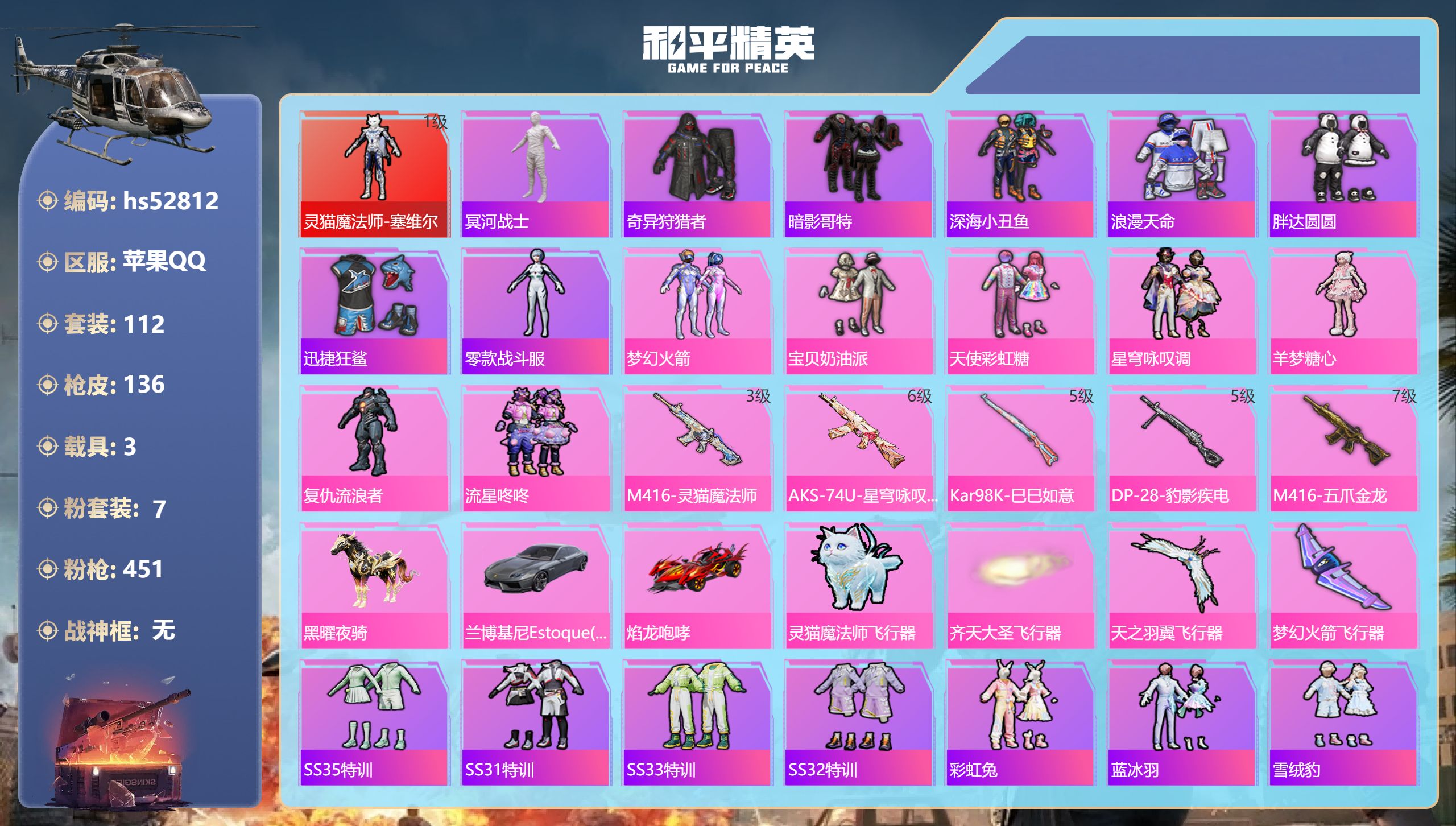 PX_2304529-,苹果手Q-8王牌印记-1红装-7粉装-5特效枪-3载具-49081热力值-112套装-136枪皮-3卓越印记-1传奇印记 【1红装】灵猫魔法师-塞维尔/1级 【7粉装】套装-梦幻火箭,套装-宝贝奶油派,角色-复仇流浪者,套装-天使彩虹糖,角色-羊梦糖心,套装-流星咚咚,套装-星穹咏叹调 【5特效枪】M416-灵猫魔法师/3级,Kar98K-巳巳如意/5级,AKS-74U-星穹咏叹调/6级,DP-28-豹影疾电/5级,M416-五爪金龙/7级 【8稀有紫装】冥河战士,奇异狩猎者,暗影哥特,深海小丑鱼,浪漫天命,胖达圆圆,迅捷狂鲨,零款战斗服 【3稀有载具】黑曜夜骑,兰博基尼Estoque(银翼灰),焰龙咆哮 【112稀有时装】梦幻火箭,宝贝奶油派,天使彩虹糖,塞维尔/1级,星穹咏叹调,羊梦糖心,SS35特训,SS31特训,SS33特训,SS32特训,彩虹兔,蓝冰羽,雪绒豹,SS34特训,紫幽梦,绛羽幽主,浪漫天命,奇异狩猎者,游乐,暗影哥特,深海小丑鱼,迅捷狂鲨,零款战斗服,胖达圆圆,无面战甲,萌鸡速递,元气之梦,粉恋花,云朵鹅,冥河战士,顶瓜瓜,复仇流浪者,流星咚咚,激萌罗小黑,狂沙舞者,异域银装,SS30特训,战术大师,智谋强哥,巳巳如意,SS29特训,焰山流火,龙的传人,特训学院,猎鹰,青年教官,橘黑制服,红色运动,黄色运动,蓝色运动,黄色伏地魔,白色伏地魔,酒红色名流,湖蓝色名流,黄色名流,绯格组合,野性山猫,黑色伏地魔,竞技名士,深蓝色名流,猛禽,长空猛禽,怒火燎原,冷焰舞者,魅力单车,猎梦纪元,甜心亚梦,虚音幻奏,极地朋克,幻世战舞者,萌趣咩咩,娇憨猪猪,春日漫步,冰川特警,夏雨游龙,麻辣教官,沙暴袭击者,完美偶像,人气偶像,暖心橘喵,破蛋小黄鸡,蓝彩潮人,神秘领域,绮丽涂鸦,竞技达人朋克,淡雅花蕊,玲珑飞花,都市魅力,探宝勇士,牛气冲天,SS18特训,飞行日记,瑞龙福将,团圆交子,金耀舞者,异彩先驱,霓虹极客,空投萌叽,SS19特训,光之冒险,SS20特训,SS21特训,玉兔迎春,弄潮海豚,SS22特训,SS23特训,呆萌铁蟹,缤纷果语,王牌教练,柠萌假日,粉红小猪,SS25特训 【136稀有枪械】GROZA-海盐豹豹,M416-灵猫魔法师/3级,AKS-74U-星穹咏叹调/6级,Kar98K-巳巳如意/5级,DP-28-豹影疾电/5级,UZI-冰河战士,M16A4-冰河战士,MK20-H-乌木金纹,M416-五爪金龙/7级,GROZA-无面战甲,Win94-乌木金纹,SVD-冷漠罗丽,AKM-灵猫魔法师,PKM-紫幽梦,汤姆逊-灵猫魔法师,撬棍-灵猫魔法师,DBS-幻彩电音,SCAR-L-冷漠罗丽,Mk14-紫幽梦,蜜獾-乌木金纹,M762-云朵鹅,S1897-紫幽梦,SVD-云朵鹅,P92-紫幽梦,SPAS-12-狂鲨锋刃,M417-玩趣呆呆,MK20-H-狂鲨锋刃,平底锅-紫幽梦,AKS-74U-乌木金纹,AKM-涂鸦街区,Famas-乌木金纹,Famas-霓彩脉冲,SPAS-12-云朵鹅,M249-无面战甲,破片手榴弹-拽到爆炸,信号枪-异瞳寒姬,AKS-74U-鸡智如我,沙漠之鹰-云朵鹅,烟雾弹-冰氧夏日,大砍刀-云朵鹅,P1911-无面战甲,S12K-霓彩脉冲,AMR-鸡智如我,AKM-霓彩脉冲,M416-红色方程式,M416-蓝色火焰,M416-糯团青竹,AKM-影袭,AKM-彩虹符号,AKM-春暖花开,AKM-破晓战魂,AKM-龙的传人,SCAR-L-红色方程式,SCAR-L-玉兔迎春,SCAR-L-黄金龙骨,SCAR-L-炫彩节奏,M16A4-冥河战士,M16A4-幻世战舞者,M16A4-甜心亚梦,GROZA-春暖花开,GROZA-异彩先驱,AUG-耀粉歌者,M762-瑞龙福将,M762-彩虹符号,M762-甜心宝贝,M762-天降萌叽,Mk47-乌木金纹,Mk47-粉色回忆,Mk47-天之羽翼,G36C-乌木金纹,AC-VAL-天降萌叽,AC-VAL-甜心亚梦,AC-VAL-乌木金纹,蜜獾-天降萌叽,蜜獾-垂柳戏鸭,蜜獾-娇憨猪猪,Kar98K-梦幻火箭,M24-乌木金纹,Win94-瑞龙福将,莫辛纳甘-乌木金纹,Mini14-梦幻火箭,Mini14-涂山之恋,Mini14-异彩先驱,Mini14-穿刺龙虾,Mini14-春暖花开,Mk14-暗星紫秘,Mk14-乌木金纹,SLR-彩虹符号,SLR-娇憨猪猪,UZI-娇憨猪猪,UZI-天降萌叽,UZI-啾咪啾咪,UMP45-蓝色火焰,UMP45-春暖花开,Vector-生命誓言,汤姆逊-耀粉歌者,汤姆逊-异彩先驱,野牛-乌木金纹,MP5K-异彩先驱,MP5K-蓝莓炮弹,P90-乌木金纹,S686-彩虹符号,S686-生命誓言,S1897-春暖花开,S12K-幻世战舞者,S12K-瑞龙福将,S12K-娇憨猪猪,S12K-垂柳戏鸭,DBS-第五大道,DBS-甜心亚梦,M249-破晓战魂,M249-彩虹符号,M249-糯团青竹,DP-28-彩虹符号,DP-28-甜心亚梦,MG3-幻世战舞者,MG3-乌木金纹,MG3-瑞龙福将,P92-流星咚咚,平底锅-光之冒险,平底锅-空投萌叽,平底锅-娇憨猪猪,平底锅-甜心亚梦,平底锅-异彩先驱,平底锅-瑞龙福将,撬棍-甜心宝贝,撬棍-环太平洋,撬棍-幻世战舞者,撬棍-冥河战士,AUG-异域银装,M200-乌木金纹,十字弩-异域银装,SPAS-12-乌木金纹,Mini14-香桃花海,P90-巳巳如意,破片手榴弹-巳巳如意 【6稀有飞行器】灵猫魔法师飞行器,鸡智如我飞行器,齐天大圣飞行器,天之羽翼飞行器,梦幻火箭飞行器,异域银装飞行器 【20稀有背包】垂柳戏鸭背包(3级),灵猫魔法师背包(3级),冷漠罗丽背包(3级),绯穹魔姬背包(3级),无面战甲背包(3级),紫幽梦背包(3级),萌鸡速递背包(3级),薄荷星砂背包(3级),云朵鹅背包(3级),蝶变背包(3级),娇憨猪猪背包(3级),异域银装背包(3级),甜心亚梦背包(3级),环太平洋背包(3级),深海小丑鱼背包(3级),冰河战士背包(3级),蓝莓炮弹背包(3级),春暖花开背包(3级),暗星紫秘背包(3级),异彩先驱背包(3级)