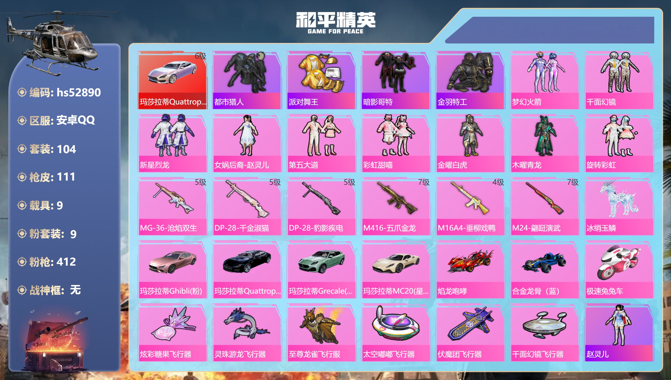 PX_2304537-,安卓手Q-6王牌印记-9粉装-6特效枪-9载具-55545热力值-104套装-111枪皮 【9粉装】套装-新星烈龙,套装-木曜青龙,套装-第五大道,女娲后裔-赵灵儿,套装-彩虹甜喵,套装-金曜白虎,套装-旋转彩虹,套装-千面幻镜,套装-梦幻火箭 【6特效枪】M16A4-垂柳戏鸭/4级,M24-翩跹演武/7级,DP-28-豹影疾电/5级,M416-五爪金龙/7级,MG-36-沧焰双生/5级,DP-28-千金淑猫/5级 【4稀有紫装】都市猎人,派对舞王,暗影哥特,金羽特工 【9稀有载具】冰绡玉鳞,玛莎拉蒂Quattroporte(幻星粉)/6级,玛莎拉蒂Ghibli(粉),玛莎拉蒂Quattroporte(夜幕蓝),玛莎拉蒂Grecale(薄荷绿),玛莎拉蒂MC20(星石白),焰龙咆哮,合金龙骨(蓝),极速兔兔车 【104稀有时装】梦幻火箭,赵灵儿,千面幻镜,新星烈龙,女娲后裔-赵灵儿,第五大道,SS35特训,SS36特训,SS34特训,朱霞炽焰,都市猎人,暗影哥特,金羽特工,凌霄紫焰,云魄琉璃,擎苍青焰,炫彩糖果,元气之梦,薄荷星砂,派对舞王,彩虹甜喵,金曜白虎,木曜青龙,旋转彩虹,暗夜行者,都市丽猫,摩登魅猫,冰焰天使,星辰守护者,军械专家,红色运动,飞驰魅影,白色伏地魔,漫步者,竞技名士,猛禽,长空猛禽,甜蜜告白,魅力单车,雪山征服者,缤纷假日,浪漫假日,极地朋克,幻世战舞者,甜蜜菠萝,特殊使命,青涩时光,牛气满满,萌趣咩咩,娇憨猪猪,冰川特警,龙腾端午,夏雨游龙,荷畔雨呱,沙漠毒蛇,红熊茄茄,麻辣教官,鹰眼刺客,冰冻风暴,幻影武者,俏皮奶喵,热血骑手,暖心橘喵,破蛋小黄鸡,潮流游乐家,特战英豪,梦幻奶油,酸甜橘柚,奶油香芋,绮丽涂鸦,樱桃黑巧,竞技达人朋克,野性战心,李逍遥,精神漫游,阿奴,破晓战魂,酒剑仙,和煦暖阳,森林游猎者,田园牧歌,轻风白浪,沙漠兵团,耀粉歌者,探宝勇士,牛气冲天,清新柠檬,飞行日记,光之冒险,SS20特训,SS21特训,玉兔迎春,SS22特训,SS23特训,缤纷果语,龙舌兰冰茶,灵蜜圈圈,妙红点点,幻彩翩翩,王牌教练,柠萌假日,粉红小猪,SS24特训,鹤鸣 【111稀有枪械】MG-36-沧焰双生/5级,DP-28-千金淑猫/5级,DP-28-豹影疾电/5级,M416-五爪金龙/7级,M16A4-垂柳戏鸭/4级,M24-翩跹演武/7级,Win94-乌木金纹,烟雾弹-冰澜龙吟,SPAS-12-狂鲨锋刃,AUG-冰晶雪宝,铝热弹-炫彩糖果,UZI-炫彩糖果,JS9-凌霄紫焰,MG-36-凌霄紫焰,ARX-凌霄紫焰,AKS-74U-乌木金纹,AKM-涂鸦街区,P92-凌霄紫焰,信号枪-异瞳寒姬,平底锅-凌霄紫焰,Mk14-薄荷星砂,蜜獾-冰澜龙吟,大砍刀-冰澜龙吟,M416-红色方程式,M416-糯团青竹,M416-黄金龙骨,AKM-影袭,AKM-墨染幽兰,AKM-彩虹符号,AKM-冰凉西瓜,AKM-破晓战魂,AKM-星之信仰,SCAR-L-红色方程式,SCAR-L-玉兔迎春,SCAR-L-黄金龙骨,M16A4-幻世战舞者,GROZA-异彩先驱,GROZA-影袭,GROZA-田园牧歌,GROZA-甜蜜草莓,AUG-耀粉歌者,AUG-甜蜜菠萝,AUG-青春冒险家,AUG-天降萌叽,M762-甜心宝贝,M762-彩虹甜喵,M762-天降萌叽,Mk47-乌木金纹,Mk47-妙红点点,AC-VAL-天降萌叽,AC-VAL-彩虹甜喵,AC-VAL-乌木金纹,蜜獾-天降萌叽,蜜獾-垂柳戏鸭,蜜獾-娇憨猪猪,Kar98K-影袭,M24-影袭,AWM-黄金龙骨,AWM-垂柳戏鸭,莫辛纳甘-乌木金纹,AMR-妙红点点,AMR-翩跹演武,M200-仲夏莫吉托,SKS-炫彩节奏,VSS-田园牧歌,VSS-镭射皇者,Mini14-梦幻火箭,Mini14-千面幻镜,Mini14-旋转彩虹,Mk14-乌木金纹,SLR-彩虹符号,SLR-娇憨猪猪,UZI-红色方程式,UZI-影袭,UZI-娇憨猪猪,UZI-啾咪啾咪,UMP45-蓝色火焰,Vector-田园牧歌,汤姆逊-天降萌叽,P90-飞驰魅影,P90-翩跹演武,S686-不夜海上花,S1897-星之信仰,S1897-百万伏特,S12K-幻世战舞者,S12K-娇憨猪猪,S12K-垂柳戏鸭,DBS-彩虹甜喵,SPAS-12-太空嘟嘟,SPAS-12-田园牧歌,M249-破晓战魂,M249-糯团青竹,M249-冰封烈焰,M249-冷魅冰骑,M249-妙红点点,DP-28-旋转彩虹,DP-28-彩虹符号,MG3-幻世战舞者,MG3-妙红点点,MG3-乌木金纹,MG3-瑞龙福将,P18C-黄金龙骨,沙漠之鹰-旋转彩虹,平底锅-光之冒险,平底锅-翩跹演武,平底锅-田园牧歌,平底锅-娇憨猪猪,平底锅-妙红点点,撬棍-幻世战舞者,蝎式手枪-千金淑猫,S686-千金淑猫 【8稀有飞行器】炫彩糖果飞行器,灵珠游龙飞行器,光之冒险尾迹,粉色滑翔尾迹,至尊龙雀飞行服,太空嘟嘟飞行器,伏魔团飞行器,千面幻镜飞行器 【24稀有背包】垂柳戏鸭背包(3级),彩虹甜喵背包(3级),魔童闹海,敖丙背包(3级),狂鲨锋刃背包(3级),炫彩糖果背包(3级),凌霄紫焰背包(3级),薄荷星砂背包(3级),破晓战魂背包(3级),太空嘟嘟背包(3级),千金淑猫背包(3级),木曜青龙背包(3级),甜蜜菠萝背包(3级),千面幻镜背包(3级),田园牧歌背包(3级),金羽特工背包(3级),梦幻火箭背包(3级),歌者泠鸢背包(3级),冰封烈焰背包(3级),时空追击者背包(3级),金曜白虎背包(3级),墨染幽兰背包(3级),玉兔迎春背包(3级),妙红点点背包(3级),旋转彩虹背包(3级)