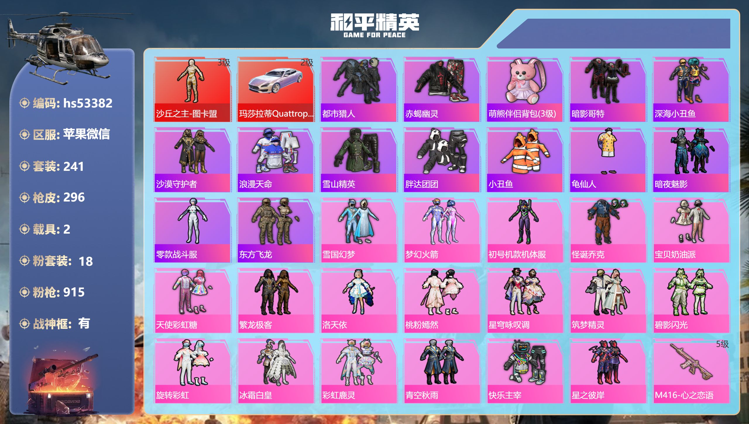 PX_2304845-,苹果微信-19王牌印记-有战神框-1红装-18粉装-13特效枪-2载具-热力值-241套装-296枪皮-7卓越印记-2传奇印记 【1红装】沙丘之主-图卡盟/3级 【18粉装】套装-青空秋雨,套装-星穹咏叹调,套装-繁龙极客,套装-碧影闪光,套装-冰霜白皇,套装-星之彼岸,套装-梦幻火箭,套装-筑梦精灵,角色-洛天依,套装-宝贝奶油派,套装-彩虹鹿灵,套装-旋转彩虹,套装-天使彩虹糖,套装-怪诞乔克,套装-快乐主宰,套装-雪国幻梦,套装-桃粉嫣然,角色-初号机款机体服 【13特效枪】M16A4-垂柳戏鸭/4级,Vector-环太平洋/5级,SCAR-L-童趣迷兔/5级,破片手榴弹-瓶中星球/7级,AKS-74U-星穹咏叹调/6级,DP-28-豹影疾电/5级,M416-心之恋语/5级,UMP45-恐龙拽拽/5级,AKM-甜心宝贝/7级,P90-沙丘之主/3级,MG3-洛神天依/6级,Kar98K-巳巳如意/5级,M416-女娲灵识/3级 【14稀有紫装】都市猎人,赤蝎幽灵,萌熊伴侣背包(3级),暗影哥特,深海小丑鱼,沙漠守护者,浪漫天命,雪山精英,胖达团团,小丑鱼,龟仙人,暗夜魅影,零款战斗服,东方飞龙 【2稀有载具】玛莎拉蒂Quattroporte(幻星粉)/2级,阿斯顿·马丁DBS(绿) 【241稀有时装】雪国幻梦,梦幻火箭,初号机款机体服,怪诞乔克,宝贝奶油派,天使彩虹糖,繁龙极客,洛天依,图卡盟/3级,桃粉嫣然,KONE追光队服,星穹咏叹调,SS35特训,SS31特训,SS33特训,SS32特训,彩虹兔,蓝冰羽,霓虹热舞,雪绒豹,恋语绒绒,星渊小夜曲,星影赞美诗,SS34特训,朱霞炽焰,紫幽梦,大橘大利,六号稻草人,沙漠守护者,都市猎人,胖达团团,浪漫天命,暗夜魅影,龟仙人,雪山精英,游乐,暗影哥特,深海小丑鱼,小丑鱼,东方飞龙,零款战斗服,赤蝎幽灵,凌霄紫焰,元气之梦,薄荷星砂,粉恋花,云朵鹅,顶瓜瓜,筑梦精灵,碧影闪光,旋转彩虹,冰霜白皇,彩虹鹿灵,青空秋雨,快乐主宰,星之彼岸,激萌罗小黑,动感兔斯基人偶服,狂战萌兔,狂沙舞者,Alan,Walker,小熊娃娃,异域银装,街头风暴,星途旅人,光矢逐梦,鱼渊荷华,SS30特训,青团波波,燕燕于飞,战术大师,智谋强哥,雏菊兔兔,糖糖葫芦,巳巳如意,SS28特训,迷域探索者,SS29特训,萝兰蝴蝶,SS5特训,SS16特训,贝斯之夜,焰鹰斗篷,暗夜傀儡,英勇保护者,水晶王族,军械专家,拳皇97八神庵,云丝凤蟒,源星混沌,福星高照,暗夜契约,纯白誓言,豚鼠丹丹,雪兔飞飞,夏日音浪,龙的传人,军刀雅典娜,SS8特训,白熊同盟,青玉碎影,红色运动,黄色运动,蓝色运动,极速竞梦,飞驰魅影,白色伏地魔,音速流光,热血青春,冰川格斗者,SS9特训,紫翼圣骑,酷潮明星,绯格组合,涂山之恋,SS26特训,酷萌兔限定,沙漠雄狮,漫步者,空岛之星,黎明保卫者,炫蓝之夏,骑行爱好者,竞技名士,S3赛事,深蓝色名流,猛禽,雨林探路者,长空猛禽,竞技勇士朋克,特战装甲,旭日情侣,灰色格斗者,六六大吉,甜蜜告白,本愿之火,冷焰舞者,魅力单车,灼焰舞者,春光漫游,猎梦纪元,丛林猎人,甜心亚梦,虚音幻奏,传奇侦探,贵族骑装,幻世战舞者,街舞之王,街舞达人,暖心熊熊,牛气满满,萌趣咩咩,娇憨猪猪,冰川特警,龙腾端午,夏雨游龙,荷畔雨呱,沙漠毒蛇,红熊茄茄,麻辣教官,鹰眼刺客,冰冻风暴,SS11特训,人气偶像,幻影武者,俏皮奶喵,疯狂小兔子,圣诞大吉,玄武圣者,快闪甜心,梦幻奶油,北国孤狼,SS6特训,神秘领域,炽焰拳师,绮丽涂鸦,格斗专家,坚韧舞者,奇迹天团,淡雅花蕊,原初圣火,逆风勇士,跃动心情,SS7特训,核芯基因,精神漫游,破晓战魂,和煦暖阳,霓虹街区,田园牧歌,都市魅力,轻风白浪,探宝勇士,SS12特训,SS27特训,牛气冲天,SS18特训,SS13特训,SS17特训,瑞龙福将,团圆交子,金耀舞者,蓝调潮人,遗落祭司,异彩先驱,霓虹极客,SS19特训,光之冒险,SS20特训,SS21特训,玉兔迎春,SS22特训,SS23特训,呆萌铁蟹,摩登艾咪,飞狐塔尔斯,缤纷果语,滨海厨神,SS14特训,天籁歌者,电音精灵,神气柴柴,妙红点点,幻彩翩翩,幻羽潜行,海盐绵绵冰,老实芭蕉,旷野奇兵,薰款战斗服,王牌教练,荣耀,柠萌假日,SS24特训,鹤鸣,懵萌河马,SS25特训,快乐星愿,星梦畅游,恶魔人蛛,黑夜传说,深蓝冒险家 【296稀有枪械】M416-心之恋语/5级,DBS-乌木金纹,SCAR-L-海盐豹豹,AKS-74U-星穹咏叹调/6级,M416-女娲灵识/3级,破片手榴弹-瓶中星球/7级,Kar98K-巳巳如意/5级,DP-28-豹影疾电/5级,野牛-雏菊兔兔,平底锅-雏菊兔兔,M762-雏菊兔兔,Mini14-雏菊兔兔,R1895-雏菊兔兔,MK20-H-乌木金纹,AKM-甜心宝贝/7级,SCAR-L-童趣迷兔/5级,M16A4-垂柳戏鸭/4级,UMP45-恐龙拽拽/5级,Vector-环太平洋/5级,P90-沙丘之主/3级,MG3-洛神天依/6级,PKM-紫幽梦,撬棍-灵猫魔法师,MG3-霓彩脉冲,Mk14-紫幽梦,蜜獾-乌木金纹,M762-云朵鹅,S1897-紫幽梦,SVD-云朵鹅,P92-紫幽梦,M417-玩趣呆呆,G36C-星穹咏叹调,短管霰弹-星穹咏叹调,Kar98K-星穹咏叹调,JS9-凌霄紫焰,MG-36-凌霄紫焰,平底锅-紫幽梦,破片手榴弹-海盐豹豹,UMP45-海盐豹豹,ARX-凌霄紫焰,AKS-74U-乌木金纹,P92-凌霄紫焰,Famas-乌木金纹,SPAS-12-云朵鹅,破片手榴弹-拽到爆炸,S1897-糯团青竹,平底锅-凌霄紫焰,Mk14-薄荷星砂,AKS-74U-鸡智如我,沙漠之鹰-云朵鹅,烟雾弹-冰氧夏日,AKS-74U-粉粉喵呜,MG3-智耀战神,大砍刀-云朵鹅,平底锅-属我最6,AC-VAL-六号稻草人,M200-六号稻草人,蝎式手枪-六号稻草人,AUG-紫晶流影,AMR-鸡智如我,M416-红色方程式,M416-乌木金纹,M416-紫翼圣骑,M416-糯团青竹,M416-快乐主宰,M416-绯红前夜,AKM-筑梦精灵,AKM-环太平洋,AKM-影袭,AKM-夜灯,AKM-生命誓言,AKM-乌木金纹,AKM-星之彼岸,AKM-彩虹符号,AKM-破晓战魂,AKM-龙的传人,AKM-虎虎生威,AKM-恐龙拽拽,AKM-霓虹街区,AKM-沙漠守护者,SCAR-L-玉兔