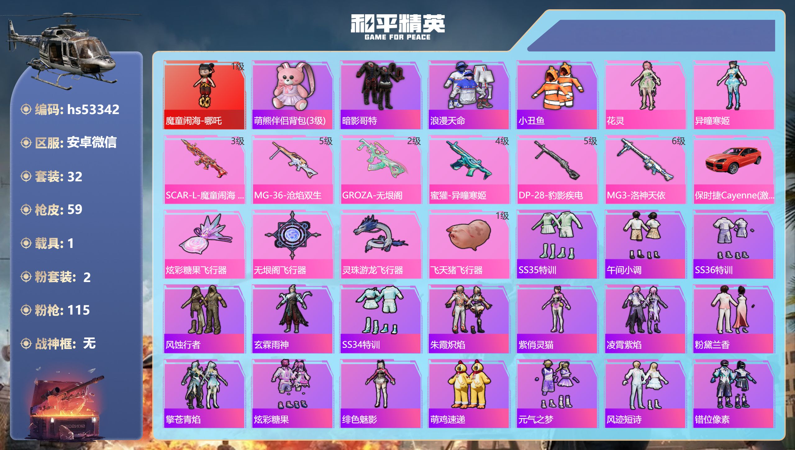 PX_2304821-,安卓微信-2王牌印记-1红装-2粉装-6特效枪-1载具-20857热力值-32套装-59枪皮-1卓越印记-1传奇印记 【1红装】魔童闹海-哪吒/1级 【2粉装】角色-异瞳寒姬,角色-花灵 【6特效枪】蜜獾-异瞳寒姬/4级,DP-28-豹影疾电/5级,MG3-洛神天依/6级,MG-36-沧焰双生/5级,SCAR-L-魔童闹海,哪吒/3级,GROZA-无垠阁/2级 【4稀有紫装】萌熊伴侣背包(3级),暗影哥特,浪漫天命,小丑鱼 【1稀有载具】保时捷Cayenne(激情红) 【32稀有时装】哪吒/1级,花灵,异瞳寒姬,SS35特训,午间小调,SS36特训,风蚀行者,玄霖雨神,SS34特训,朱霞炽焰,浪漫天命,暗影哥特,小丑鱼,紫俏灵猫,凌霄紫焰,粉黛兰香,擎苍青焰,炫彩糖果,绯色魅影,萌鸡速递,元气之梦,风迹短诗,错位像素,秘语星愿,旭日情侣,魅力单车,鹰眼刺客,破蛋小黄鸡,疯狂小兔子,海岛探路者,幻世保卫者,王牌教练 【59稀有枪械】SCAR-L-魔童闹海,哪吒/3级,MG-36-沧焰双生/5级,GROZA-无垠阁/2级,蜜獾-异瞳寒姬/4级,DP-28-豹影疾电/5级,MG3-洛神天依/6级,DBS-风迹短诗,莫辛纳甘-风迹短诗,M416-错位像素,Win94-乌木金纹,MK12-风迹短诗,MK12-乌木金纹,AKS-74U-荧光像素,破片手榴弹-爆破雪人,M762-登顶巅峰,蜜獾-绯穹魔姬,AWM-绿洲时空,汤姆逊-错位像素,SPAS-12-狂鲨锋刃,MK20-H-狂鲨锋刃,AUG-冰晶雪宝,铝热弹-炫彩糖果,UZI-炫彩糖果,Mk47-风迹短诗,JS9-凌霄紫焰,MG-36-凌霄紫焰,ARX-凌霄紫焰,AKS-74U-乌木金纹,AKM-涂鸦街区,蜜獾-风迹短诗,P92-凌霄紫焰,AMR-喜羊羊与灰太狼,Famas-霓彩脉冲,破片手榴弹-拽到爆炸,十字弩-异瞳寒姬,平底锅-无垠阁,信号枪-异瞳寒姬,平底锅-凌霄紫焰,Mk14-紫晶流影,SVD-霓彩脉冲,SLR-霓彩脉冲,燃点复合弓-火尖莲影,S12K-霓彩脉冲,AKM-霓彩脉冲,撬棍-火尖枪,破片手榴弹-火尖莲影,SCAR-L-玉兔迎春,SCAR-L-夜灯,UZI-啾咪啾咪,UMP45-夜灯,Vector-生命誓言,汤姆逊-天降萌叽,S686-生命誓言,S12K-夜灯,M249-彩虹符号,MG3-幻世战舞者,破片手榴弹-呆爆全场,AUG-异域银装,十字弩-异域银装 【6稀有飞行器】鸡智如我飞行器,炫彩糖果飞行器,登顶巅峰飞行器,无垠阁飞行器,灵珠游龙飞行器,飞天猪飞行器/1级 【14稀有背包】魔童闹海,哪吒背包(3级),狂鲨锋刃背包(3级),绝对恒星背包(3级),花灵背包(3级),炫彩糖果背包(3级),萌熊伴侣背包(3级),异瞳寒姬背包(3级),凌霄紫焰背包(3级),粉黛兰香背包(3级),萌鸡速递背包(3级),薄荷星砂背包(3级),风迹短诗背包(3级),异域银装背包(3级),洛神天依背包(3级)