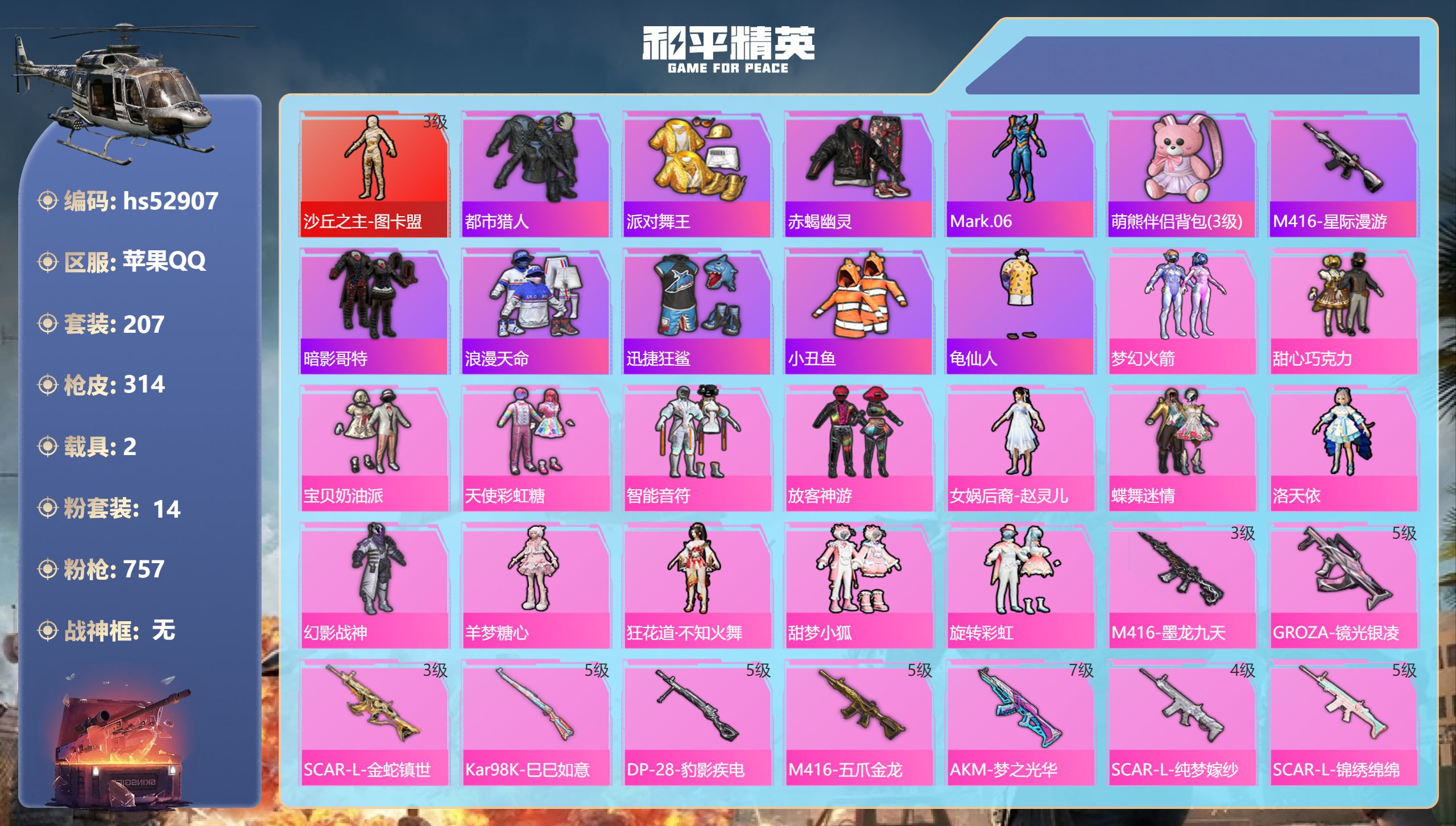 PX_2304825-,苹果手Q-17王牌印记-1红装-14粉装-13特效枪-2载具-热力值-207套装-314枪皮-5卓越印记-2传奇印记 【1红装】沙丘之主-图卡盟/3级 【14粉装】套装-智能音符,套装-蝶舞迷情,套装-宝贝奶油派,套装-旋转彩虹,角色-羊梦糖心,套装-甜梦小狐,套装-幻影战神,角色-狂花道·不知火舞,套装-甜心巧克力,角色-洛天依,女娲后裔-赵灵儿,套装-放客神游,套装-梦幻火箭,套装-天使彩虹糖 【13特效枪】AUG-超新星/7级,AKM-梦之光华/7级,M416-五爪金龙/5级,M416-墨龙九天/3级,Kar98K-巳巳如意/5级,SCAR-L-纯梦嫁纱/4级,GROZA-焦糖拿铁/5级,SCAR-L-金蛇镇世/3级,SCAR-L-锦绣绵绵/5级,GROZA-镜光银凌/5级,MG3-酷泡奶龙/7级,DP-28-豹影疾电/5级,Vector-环太平洋/5级 【11稀有紫装】都市猎人,派对舞王,赤蝎幽灵,Mark.06,萌熊伴侣背包(3级),M416-星际漫游,暗影哥特,浪漫天命,迅捷狂鲨,小丑鱼,龟仙人 【2稀有载具】冰绡玉鳞,幻影随行 【207稀有时装】梦幻火箭,赵灵儿,甜心巧克力,宝贝奶油派,天使彩虹糖,智能音符,放客神游,女娲后裔-赵灵儿,蝶舞迷情,洛天依,幻影战神,图卡盟/3级,羊梦糖心,SS35特训,午间小调,SS31特训,SS33特训,SS32特训,SS36特训,蓝冰羽,雪绒豹,恋语绒绒,星影赞美诗,SS34特训,朱霞炽焰,紫幽梦,大橘大利,都市猎人,浪漫天命,龟仙人,Mark.06,游乐,暗影哥特,小丑鱼,迅捷狂鲨,赤蝎幽灵,凌霄紫焰,粉黛兰香,擎苍青焰,炫彩糖果,绯色魅影,萌鸡速递,元气之梦,风迹短诗,薄荷星砂,秘语星愿,云朵鹅,派对舞王,顶瓜瓜,狂花道·不知火舞,创世·幻影,甜梦小狐,旋转彩虹,激萌罗小黑,暴走罗小黑,兔兔白日梦,动感兔斯基人偶服,狂沙舞者,潮萌小黄鸭,粉雾星云,龙魂突击队,卖崽青蛙,小熊娃娃,异域银装,都市丽猫,摩登魅猫,街头风暴,星途旅人,冰河战士,鱼渊荷华,SS30特训,青团波波,燕燕于飞,达芬奇,战术大师,智谋强哥,雏菊兔兔,糖糖葫芦,香桃花海,蝶变,巳巳如意,曼妙人鱼,棉花软糖,极地流光,SS28特训,SS29特训,萝兰蝴蝶,SS16特训,暴风机械师,无暇誓言,贝斯之夜,焰鹰斗篷,英勇保护者,水晶王族,军械专家,醒狮腾龙,冰爽风暴,福星高照,豚鼠丹丹,雪兔飞飞,虎虎生威吉莉,夏日音浪,龙的传人,军刀雅典娜,甜梦熊熊,青玉碎影,蝶吟花词,极速竞梦,飞驰魅影,白色伏地魔,音速流光,热血青春,酷潮明星,绯格组合,涂山之恋,SS26特训,漫步者,空岛之星,热情海星,黑色伏地魔,炫蓝之夏,纯真浪花,骑行爱好者,竞技名士,浑天鲲鹏,长空猛禽,特战装甲,旭日情侣,街头潮人,惊鸿侠骨,魅力单车,春光漫游,甜心亚梦,虚音幻奏,浪漫假日,极地朋克,贵族骑装,幻世战舞者,青涩时光,牛气满满,萌趣咩咩,娇憨猪猪,春日漫步,冰川特警,滨海假日,WiFi精灵,沙漠毒蛇,红熊茄茄,麻辣教官,鹰眼刺客,冰冻风暴,幽夜迷踪,梦魇先生,破蛋小黄鸡,快闪甜心,暗金炫舞,蓝彩潮人,绮丽涂鸦,耀眼新星,坚韧舞者,野性战心,玲珑飞花,海岛探路者,李逍遥,幻世保卫者,霓虹街区,田园牧歌,轻风白浪,SS27特训,牛气冲天,SS18特训,飞行日记,SS17特训,瑞龙福将,团圆交子,遗落祭司,熠彩粉晶,异彩先驱,霓虹极客,空投萌叽,金戈铁马,SS19特训,光之冒险,SS20特训,SS21特训,玉兔迎春,SS22特训,SS23特训,呆萌铁蟹,甜蜜熊情侣,缤纷果语,滨海厨神,天籁歌者,神气柴柴,妙红点点,幻彩翩翩,格斗先锋,幻羽潜行,海盐绵绵冰,老实芭蕉,吉莉礼服,王牌教练,荣耀,柠萌假日,懵萌河马,SS25特训,锦衣飞扬 【314稀有枪械】QBZ-纯真浪花,AWM-纯真浪花,汤姆逊-纯真浪花,DBS-乌木金纹,AA12-G-纯真浪花,平底锅-纯真浪花,M416-墨龙九天/3级,SLR-墨龙九天,DBS-创世·救赎,汤姆逊-星梦奇缘,蜜獾-精灵梦叶罗丽,S1897-精灵梦叶罗丽,MK20-H-星梦奇缘,SCAR-L-海盐豹豹,GROZA-海盐豹豹,GROZA-镜光银凌/5级,SCAR-L-金蛇镇世/3级,Kar98K-巳巳如意/5级,DP-28-豹影疾电/5级,SLR-金丰海韵,野牛-雏菊兔兔,Mk14-冰河战士,平底锅-雏菊兔兔,M762-雏菊兔兔,Mini14-雏菊兔兔,R1895-雏菊兔兔,M416-极冰使者,UZI-冰河战士,M16A4-冰河战士,MK20-H-乌木金纹,M416-五爪金龙/5级,AKM-梦之光华/7级,SCAR-L-纯梦嫁纱/4级,SCAR-L-锦绣绵绵/5级,GROZA-焦糖拿铁/5级,AUG-超新星/7级,Vector-环太平洋/5级,MG3-酷泡奶龙/7级,DBS-风迹短诗,莫辛纳甘-风迹短诗,Mini14-鸡智如我,AKM-绿洲时空,Win94-乌木金纹,MK12-风迹短诗,MK12-乌木金纹,破片手榴弹-爆破雪人,S12K-极意拳锋,PKM-紫幽梦,MG3-霓彩脉冲,Mk14-紫幽梦,蜜獾-乌木金纹,M762-云朵鹅,S1897-紫幽梦,SVD-云朵鹅,P92-紫幽梦,SPAS-12-狂鲨锋刃,M417-玩趣呆呆,AUG-冰晶雪宝,铝热弹-炫彩糖果,UZI-炫彩糖果,G36C-星穹咏叹调,短管霰弹-星穹咏叹调,Mk47-风迹短诗,JS9-凌霄紫焰,MG-36-凌霄紫焰,平底锅-紫幽梦,破片手榴弹-海盐豹豹,UMP45-海盐豹豹,ARX-凌霄紫焰,AKS-74U-乌木金纹,AKM-涂鸦街区,蜜獾-风迹短诗,P92-凌霄紫焰,Famas-乌木金纹,Famas-霓彩脉冲,SPAS-12-云朵鹅,破片手榴弹-拽到爆炸,十字弩-异瞳寒姬,S1897-糯团青竹,信号枪-异瞳寒姬,平底锅-凌霄紫焰,Mk14-薄荷星砂,AKS-74U-鸡智如我,沙漠之鹰-云朵鹅,烟雾弹-冰氧夏日,Mk14-紫晶流影,大砍刀-云朵鹅,PKM-啾咪啾咪,S1897-荧海星豚,SVD-霓彩脉冲,SLR-霓彩脉冲,平底锅-属我最6,SCAR-L-彩虹符号,M416-星际漫游,蜜獾-冰澜龙吟,大砍刀-冰澜龙吟,AUG-紫晶流影,S12K-霓彩脉冲,AMR-鸡智如我,AKM-霓彩脉冲,M416-仓鼠灰灰,M416-蓝色火焰,M416-夜灯,M416-糯团青竹,AKM-环太平洋,AKM-影袭,AKM-生命誓言,AKM-彩虹符号,AKM-缤纷海域,AKM-春暖花开,AKM-破晓战魂,AKM-龙的传人,AKM-灼热熔岩,AKM-虎虎生威,AK