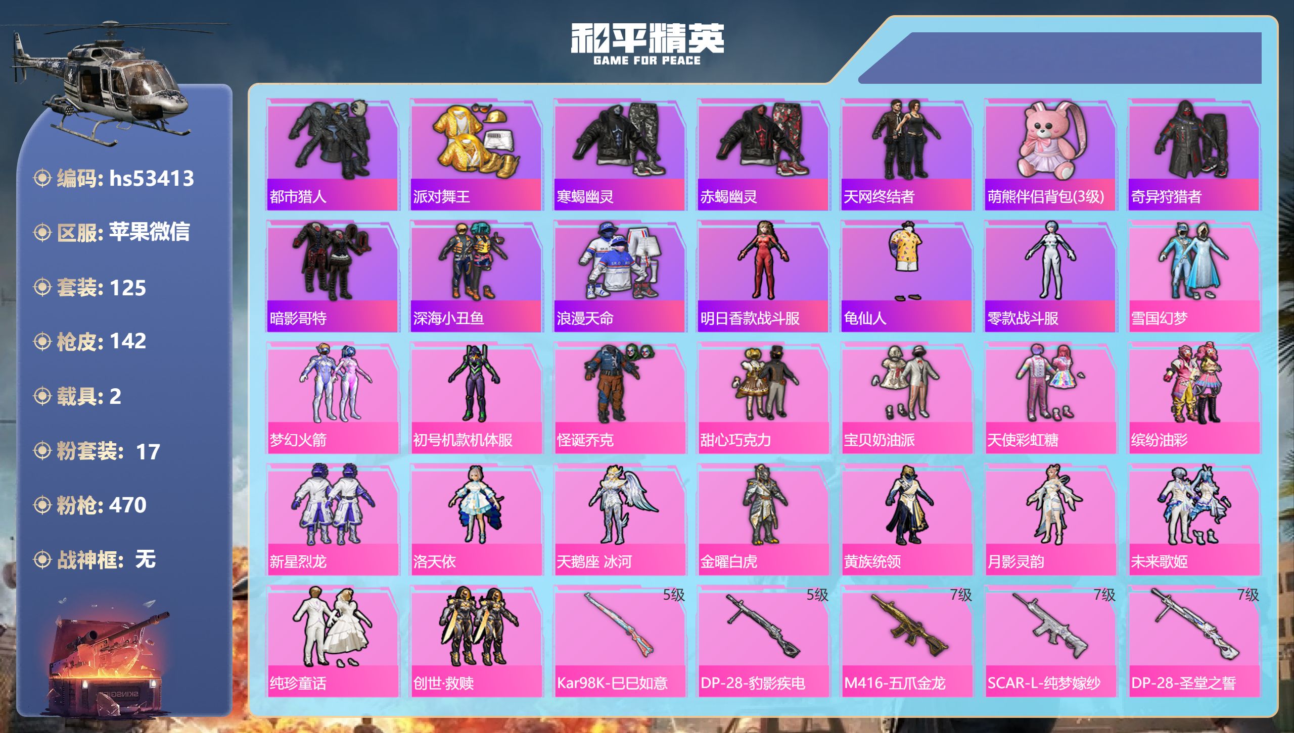 PX_2304828-,苹果微信-7王牌印记-17粉装-6特效枪-2载具-58473热力值-125套装-142枪皮 【17粉装】套装-雪国幻梦,套装-未来歌姬,套装-梦幻火箭,套装-纯珍童话,套装-天使彩虹糖,套装-宝贝奶油派,角色-月影灵韵,套装-创世·救赎,套装-金曜白虎,角色-天鹅座,冰河,套装-缤纷油彩,套装-新星烈龙,角色-初号机款机体服,套装-怪诞乔克,套装-黄族统领,角色-洛天依,套装-甜心巧克力 【6特效枪】Kar98K-巳巳如意/5级,M416-五爪金龙/7级,MG3-洛神天依/7级,DP-28-豹影疾电/5级,DP-28-圣堂之誓/7级,SCAR-L-纯梦嫁纱/7级 【13稀有紫装】都市猎人,派对舞王,寒蝎幽灵,赤蝎幽灵,天网终结者,萌熊伴侣背包(3级),奇异狩猎者,暗影哥特,深海小丑鱼,浪漫天命,明日香款战斗服,龟仙人,零款战斗服 【2稀有载具】仰望U9(赤霞丹朱),合金龙骨(蓝) 【125稀有时装】雪国幻梦,梦幻火箭,初号机款机体服,怪诞乔克,甜心巧克力,宝贝奶油派,天使彩虹糖,缤纷油彩,新星烈龙,洛天依,天鹅座,冰河,SS35特训,SS31特训,SS33特训,SS32特训,恋语绒绒,星影赞美诗,SS34特训,大橘大利,喜羊羊,都市猎人,浪漫天命,寒蝎幽灵,奇异狩猎者,龟仙人,暗影哥特,深海小丑鱼,零款战斗服,明日香款战斗服,赤蝎幽灵,元气之梦,薄荷星砂,派对舞王,顶瓜瓜,天网终结者,金曜白虎,黄族统领,月影灵韵,未来歌姬,纯珍童话,创世·救赎,狂沙舞者,Alan,Walker,龙魂突击队,小熊娃娃,星途旅人,冰河战士,鱼渊荷华,俏兔智灵,SS30特训,燕燕于飞,战术大师,智谋强哥,雏菊兔兔,香桃花海,米开朗基罗,蝶变,巳巳如意,曼妙人鱼,SS28特训,白光莹,SS29特训,萝兰蝴蝶,贝斯之夜,焰鹰斗篷,湖雨初晴,源星混沌,纯白誓言,龙的传人,甜梦熊熊,果汁能量,白熊同盟,青玉碎影,红色运动,白色伏地魔,酷潮明星,绯格组合,涂山之恋,SS26特训,漫步者,空岛之星,热情海星,纯真浪花,竞技名士,长空猛禽,旭日情侣,六六大吉,惊鸿侠骨,魅力单车,春光漫游,贵族骑装,青涩时光,冰川特警,WiFi精灵,鹰眼刺客,冰冻风暴,幽夜迷踪,破蛋小黄鸡,快闪甜心,耀眼新星,坚韧舞者,淡雅花蕊,海岛探路者,霓虹街区,SS27特训,竞技角斗士,金戈铁马,晨曦薄雾,弄潮海豚,呆萌铁蟹,缤纷果语,莱茵河畔,天籁歌者,电音精灵,神气柴柴,幻羽潜行,海盐绵绵冰,老实芭蕉,冷血极客,荣耀,SS24特训,懵萌河马,SS25特训,锦衣飞扬,恶魔人蛛 【142稀有枪械】QBZ-纯真浪花,AWM-纯真浪花,汤姆逊-纯真浪花,DBS-乌木金纹,AA12-G-纯真浪花,平底锅-纯真浪花,SCAR-L-海盐豹豹,GROZA-海盐豹豹,Kar98K-巳巳如意/5级,DP-28-豹影疾电/5级,SLR-金丰海韵,野牛-雏菊兔兔,Mk14-冰河战士,平底锅-雏菊兔兔,M762-雏菊兔兔,Mini14-雏菊兔兔,R1895-雏菊兔兔,M416-极冰使者,M249-金丰海韵,UZI-冰河战士,M16A4-冰河战士,MK20-H-乌木金纹,M416-五爪金龙/7级,SCAR-L-纯梦嫁纱/7级,DP-28-圣堂之誓/7级,MG3-洛神天依/7级,Win94-乌木金纹,蜜獾-乌木金纹,MK20-H-狂鲨锋刃,铝热弹-炫彩糖果,UZI-炫彩糖果,UMP45-海盐豹豹,AKS-74U-乌木金纹,爆炸猎弓-喜羊羊与灰太狼,Famas-乌木金纹,Famas-霓彩脉冲,破片手榴弹-拽到爆炸,DBS-荧海星豚,SLR-霓彩脉冲,SCAR-L-彩虹符号,S12K-霓彩脉冲,AKM-霓彩脉冲,M416-糯团青竹,AKM-影袭,AKM-龙的传人,AKM-2P战斗服款,AKM-霓虹街区,GROZA-春暖花开,GROZA-影袭,GROZA-懵萌河马,AUG-甜蜜菠萝,AUG-2P战斗服款,AUG-终结者,AUG-天降萌叽,QBZ-洛神天依,QBZ-未来歌姬,M762-甜心宝贝,Mk47-百万伏特,Mk47-洛神天依,G36C-懵萌河马,G36C-古战神甲,AC-VAL-快闪甜心,AC-VAL-乌木金纹,蜜獾-天降萌叽,蜜獾-千面幻镜,Famas-璀璨流光,Kar98K-洛神天依,Kar98K-彩虹符号,Kar98K-影袭,M24-影袭,AWM-圣堂之誓,AWM-焰鹰斗篷,莫辛纳甘-乌木金纹,莫辛纳甘-懵萌河马,AMR-乌木金纹,M200-惊鸿侠骨,Mini14-梦幻火箭,Mini14-涂山之恋,Mini14-彩虹嘻嘻猴,Mk14-童趣迷兔,M417-惊鸿侠骨,MK20-H-快闪甜心,UZI-影袭,UZI-啾咪啾咪,UMP45-涂山之恋,UMP45-炫光之旅,Vector-生命誓言,Vector-焰鹰斗篷,汤姆逊-天降萌叽,野牛-天星战神,MP5K-乌木金纹,P90-乌木金纹,P90-快闪甜心,P90-玩趣呆呆,S686-白勺歌姬,S686-生命誓言,S686-终结者,S1897-百万伏特,S12K-玩趣呆呆,DBS-焰鹰斗篷,DBS-第五大道,DBS-彩虹符号,DBS-圣堂之誓,AA12-G-萌物绒绒,M249-彩虹符号,M249-百万伏特,M249-诡夜天鹅,DP-28-甜心宝贝,DP-28-焰鹰斗篷,MG3-惊鸿侠骨,MG3-第五大道,PKM-懵萌河马,P18C-百万伏特,沙漠之鹰-快闪甜心,平底锅-惊鸿侠骨,平底锅-空岛之星,平底锅-懵萌河马,平底锅-甜心宝贝,平底锅-快闪甜心,平底锅-终结者,平底锅-焰鹰斗篷,撬棍-Alan,Walker潮音版,撬棍-甜心宝贝,爆炸猎弓-惊鸿侠骨,破片手榴弹-呆爆全场,沙漠之鹰-未来领航者,M16A4-千金淑猫,AUG-异域银装,野牛-燕燕于飞,M200-乌木金纹,SPAS-12-燕燕于飞,蝎式手枪-燕燕于飞,SCAR-L-星途旅人,SPAS-12-乌木金纹,Vector-燕燕于飞,十字弩-燕燕于飞,SCAR-L-净心行者,平底锅-时空协奏,破片手榴弹-星途旅人,VSS-香桃花海,Mini14-香桃花海,P90-巳巳如意 【2稀有飞行器】空岛之星尾迹,公主华盖飞行器 【40稀有背包】雪国精灵背包(3级),百万伏特背包(3级),海盐豹豹背包(3级),纯真浪花背包(3级),创世・救赎背包(3级),精灵梦叶罗丽背包(3级),懵萌河马背包(3级),林间仙鹿背包(3级),狂鲨锋刃背包(3级),炫彩糖果背包(3级),萌熊伴侣背包(3级),薄荷星砂背包(3级),巳巳如意背包(3级),金丰海韵背包(3级),极冰使者背包(3级),龟仙人龟壳背包(3级),赤蝎幽灵背包(3级),沙丘之主背包(3级),焰鹰斗篷背包(3级),甜心宝贝背包(3级),快闪甜心背包(3级),