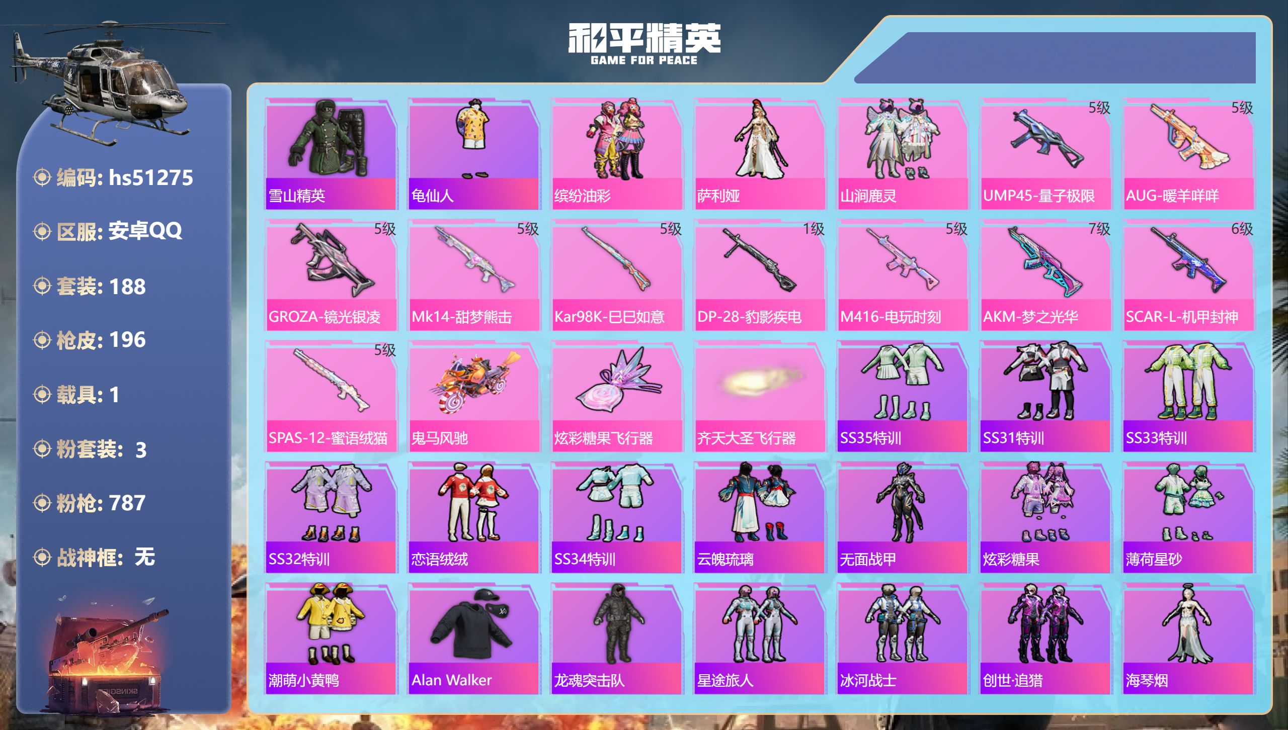 PX_2280946-,安卓手Q-10王牌印记-3粉装-10特效枪-1载具-68643热力值-188套装-196枪皮 【3粉装】角色-萨利娅,套装-山涧鹿灵,套装-缤纷油彩 【10特效枪】GROZA-镜光银凌/5级,DP-28-豹影疾电/1级,Kar98K-巳巳如意/5级,SPAS-12-蜜语绒猫/5级,M416-电玩时刻/5级,Mk14-甜梦熊击/5级,AKM-梦之光华/7级,SCAR-L-机甲封神/6级,AUG-暖羊咩咩/5级,UMP45-量子极限/5级 【2稀有紫装】雪山精英,龟仙人 【1稀有载具】鬼马风驰 【188稀有时装】缤纷油彩,SS35特训,SS31特训,SS33特训,SS32特训,恋语绒绒,SS34特训,龟仙人,雪山精英,云魄琉璃,无面战甲,炫彩糖果,薄荷星砂,萨利娅,山涧鹿灵,潮萌小黄鸭,Alan,Walker,龙魂突击队,星途旅人,冰河战士,创世·追猎,海琴烟,战术大师,蝶变,巳巳如意,甜酷狙击,曼妙人鱼,元素星魂,SS28特训,SS16特训,暴风机械师,时空追击者,星辰守护者,焰鹰斗篷,决胜时刻,闪耀星光,福星高照,暗夜契约,纯白誓言,虎虎生威吉莉,夏日音浪,龙的传人,清香五月粽,青玉碎影,萌黄之夏,特训学院,猎鹰,青年教官,橘黑制服,红色运动,黄色运动,蓝色运动,黄色伏地魔,飞驰魅影,白色伏地魔,音速流光,热血青春,碟中谍A款,SS9特训,酒红色名流,湖蓝色名流,黄色名流,SS26特训,野性山猫,空岛之星,热情海星,黑色伏地魔,炫蓝之夏,纯真浪花,骑行爱好者,竞技名士,深蓝色名流,灰色守护者,猛禽,荷鲁斯之眼,长空猛禽,西部风情,战地菁英,街头潮人,怒火燎原,冷焰舞者,魅力单车,灼焰舞者,夜莺强袭者,丛林猎人,SS2特训,幻世战舞者,战地督导,甜蜜菠萝,青涩时光,暖心熊熊,战地名士,牛气满满,萌趣咩咩,娇憨猪猪,春日漫步,冰川特警,潮流先锋,龙腾端午,燃烧卡路里,滨海假日,极速红龙,麻辣教官,SS3特训,完美偶像,SS11特训,人气偶像,幽夜迷踪,幻影武者,青春冒险家,破蛋小黄鸡,潮流游乐家,疯狂小兔子,圣诞大吉,蓝彩潮人,千禧之恋,绮丽涂鸦,耀眼新星,坚韧舞者,竞技达人朋克,朋克治安官,原初圣火,逆风勇士,海岛探路者,SS7特训,破晓战魂,霓虹街区,都市魅力,萌趣颜团子,SS10特训,特种颜团子,沙漠兵团,闪金天王,镭射皇者,耀粉歌者,风华少年志,探宝勇士,静谧青瓷,SS12特训,SS27特训,牛气冲天,SS18特训,治愈之星,银白舞王,科技之星,SS13特训,萌主吾皇,飞行日记,SS17特训,瑞龙福将,团圆交子,金耀舞者,光影梦想家,异彩先驱,霓虹极客,空投萌叽,SS19特训,光之冒险,SS20特训,SS21特训,玉兔迎春,弄潮海豚,梦起落英,SS22特训,SS23特训,冰爽海盐,甜蜜熊情侣,缤纷果语,滨海厨神,闪银刀客,SS14特训,天籁歌者,电音精灵,时之沙漏,格斗先锋,幻羽潜行,海盐绵绵冰,吉莉礼服,刚毅裁决者,海上生明月,SS1特训,王牌教练,荣耀,柠萌假日,鹤鸣,暖风夏荷,星梦畅游,SS15特训 【196稀有枪械】UMP45-量子极限/5级,QBZ-纯真浪花,AWM-纯真浪花,汤姆逊-纯真浪花,DBS-乌木金纹,AA12-G-纯真浪花,平底锅-纯真浪花,SCAR-L-海盐豹豹,GROZA-海盐豹豹,AUG-暖羊咩咩/5级,GROZA-镜光银凌/5级,Mk14-甜梦熊击/5级,Kar98K-巳巳如意/5级,DP-28-豹影疾电/1级,Mk14-冰河战士,UZI-冰河战士,M16A4-冰河战士,MK20-H-乌木金纹,M416-电玩时刻/5级,AKM-梦之光华/7级,SCAR-L-机甲封神/6级,SPAS-12-蜜语绒猫/5级,GROZA-无面战甲,Win94-乌木金纹,SVD-冷漠罗丽,SCAR-L-冷漠罗丽,M417-玩趣呆呆,铝热弹-炫彩糖果,UZI-炫彩糖果,AKS-74U-乌木金纹,Famas-乌木金纹,M249-无面战甲,Mk14-薄荷星砂,AKS-74U-鸡智如我,P1911-无面战甲,AMR-鸡智如我,M416-乌木金纹,M416-蓝色火焰,M416-糯团青竹,AKM-夜灯,AKM-百万伏特,AKM-奇异狩猎者,AKM-乌木金纹,AKM-彩虹符号,AKM-龙的传人,AKM-虎虎生威,AKM-萌趣颜团子,AKM-霓虹街区,SCAR-L-玉兔迎春,SCAR-L-乌木金纹,SCAR-L-王牌四分卫,SCAR-L-炫彩节奏,SCAR-L-生命誓言,M16A4-幻世战舞者,M16A4-乌木金纹,GROZA-异彩先驱,GROZA-彩虹符号,GROZA-林间仙鹿,GROZA-治愈之星,AUG-青春冒险家,AUG-天降萌叽,QBZ-神秘黑猫,QBZ-飞驰魅影,QBZ-原初圣火,QBZ-相思残雪,QBZ-乌木金纹,QBZ-彩虹符号,M762-瑞龙福将,M762-镭射皇者,M762-乌木金纹,M762-彩虹符号,M762-牛气冲天,M762-烈焰拳霸,M762-天降萌叽,Mk47-乌木金纹,Mk47-天之羽翼,Mk47-林间仙鹿,Mk47-洛神天依,Mk47-青春冒险家,G36C-乌木金纹,G36C-时空追击者,AC-VAL-天降萌叽,蜜獾-天降萌叽,蜜獾-娇憨猪猪,Kar98K-乌木金纹,Kar98K-王子的夏天,Kar98K-红色方程式,Kar98K-红伞翩翩,Kar98K-洛神天依,Kar98K-飞驰魅影,Kar98K-彩虹符号,Kar98K-欢乐麻酱,Kar98K-炫彩节奏,M24-乌木金纹,M24-治愈之星,AWM-天降萌叽,AWM-乌木金纹,AWM-焰鹰斗篷,AWM-恐龙拽拽,Win94-瑞龙福将,莫辛纳甘-乌木金纹,AMR-乌木金纹,SKS-时空追击者,SKS-炫彩节奏,VSS-镭射皇者,Mini14-生命誓言,Mini14-金鼠迎春,Mini14-原初圣火,Mini14-炫彩节奏,Mini14-异彩先驱,Mini14-春暖花开,Mk14-治愈之星,Mk14-乌木金纹,SLR-娇憨猪猪,QBU-青春冒险家,QBU-锦绣火鲤,UZI-生命誓言,UZI-炫彩节奏,UZI-娇憨猪猪,UZI-天降萌叽,UZI-啾咪啾咪,UMP45-生命誓言,UMP45-夜灯,UMP45-时空追击者,Vector-生命誓言,Vector-龙虾霸霸,Vector-夜灯,Vector-彩虹符号,Vector-治愈之星,Vector-焰鹰斗篷,汤姆逊-乌木金纹,汤姆逊-异彩先驱,汤姆逊-奇异狩猎者,野牛-乌木金纹,野牛-青春冒险家,野牛-电玩视界,野牛-夜灯,MP5K-异彩先驱,MP5K-乌木金纹,P90-乌木金纹,P90-飞驰魅影,P90-玩趣呆呆,S686-彩虹符号,S686-深海曼妙,S686-生命誓言,S1897-镭射皇者,S1897-乌木金纹,S1897-炫彩节奏,S1897-绮梦青鸾,S1897-飞驰魅影,S12K-幻世战舞者,S12K-乌木金纹,S12K-瑞龙福将,S12K-华贵君王,S12K-娇憨猪猪,DBS-焰鹰斗篷,DBS-时空追击者,M2