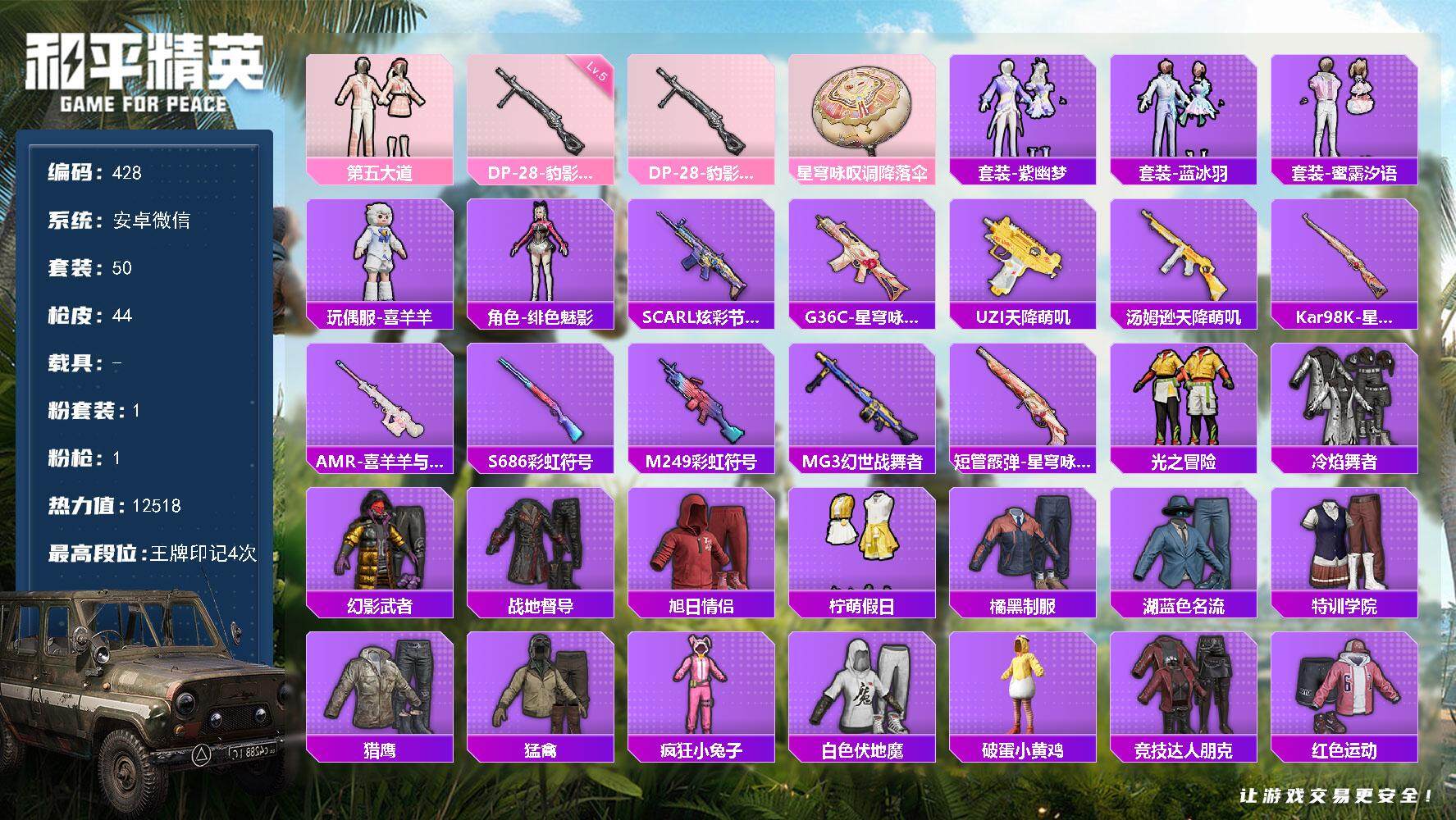PX_2304908-可二次-安卓,微信-1粉装-1特效枪-0载具-1粉色飞行器-12518热力值-4王牌印记-50套装-44枪皮 【粉色套装】:粉装-第五大道 【粉色枪皮等级】:DP-28-豹影疾电(五级) 【粉色枪皮】:DP-28-豹影疾电 【粉色降落伞】:星穹咏叹调降落伞 【稀有套装】:套装-紫幽梦,套装-蓝冰羽,套装-蜜露汐语,玩偶服-喜羊羊,角色-绯色魅影,套装-炫彩糖果 【稀有枪皮】:AUG-冰晶雪宝,SCAR-L-炫彩节奏,G36C-星穹咏叹调,UZI-天降萌叽,汤姆逊-天降萌叽,Kar98K-星穹咏叹调,AMR-喜羊羊与灰太狼,S686-彩虹符号,M249-彩虹符号,MG3-幻世战舞者,短管霰弹-星穹咏叹调 【其他套装】:套装-光之冒险,套装-冷焰舞者,套装-幻影武者,套装-战地督导,套装-旭日情侣,套装-柠萌假日,套装-橘黑制服,套装-湖蓝色名流,套装-特训学院,套装-猎鹰,套装-猛禽,套装-疯狂小兔子,套装-白色伏地魔,套装-破蛋小黄鸡,套装-竞技达人朋克,套装-红色运动,套装-绮丽涂鸦,套装-耀粉歌者,套装-蓝彩潮人,套装-蓝色运动,套装-街头潮人,套装-青年教官,套装-魅力单车,套装-鹤鸣,套装-黄色伏地魔,套装-黄色运动,套装-黑色伏地魔 【营地ID】:1026707867