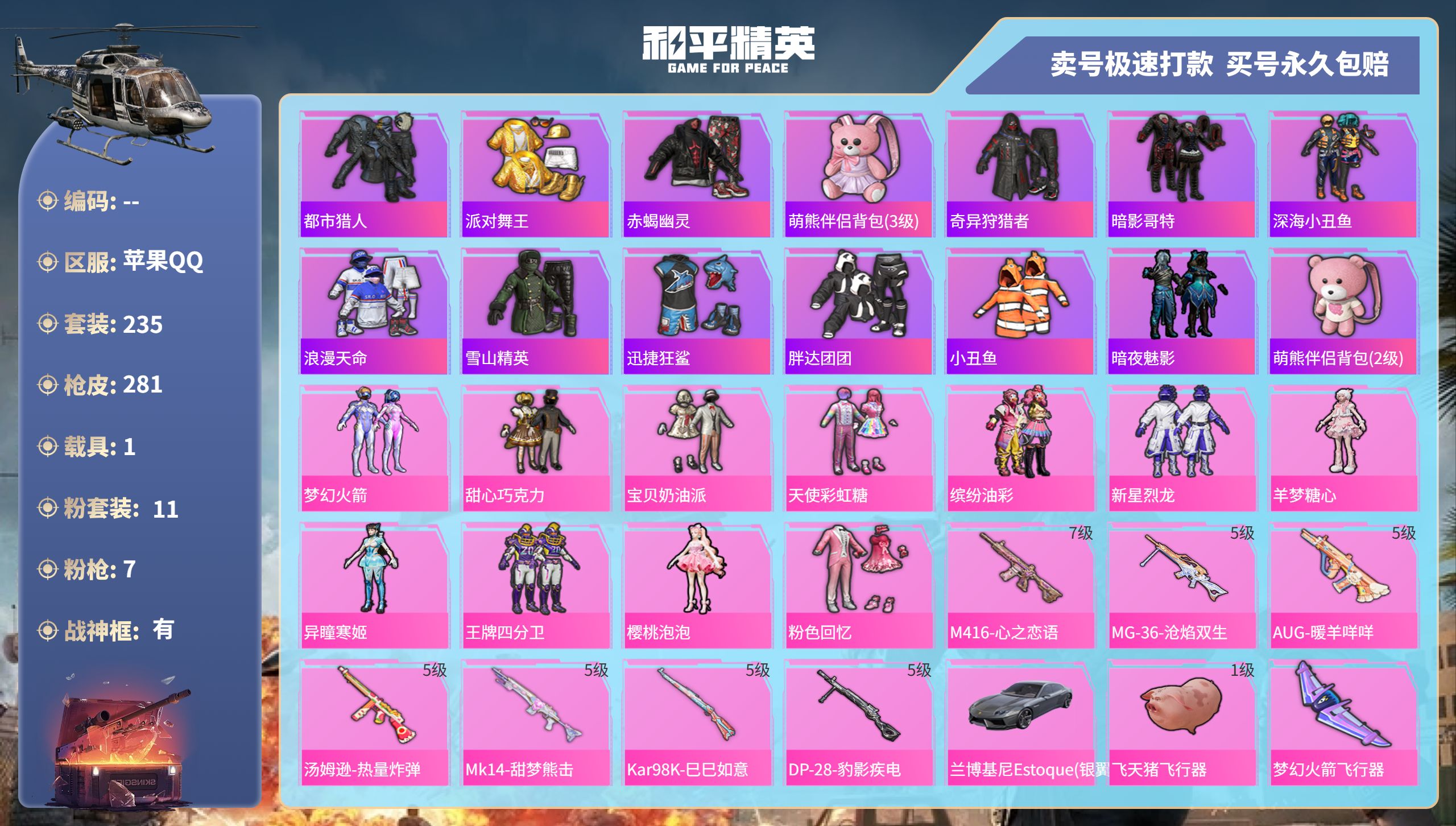 PX_2238191-,苹果手Q-7王牌印记-2红装-4粉装-14特效枪-3载具-54385热力值-70套装-124枪皮 【2红装】沙丘之主-图卡盟/4级,辉羽雀灵-初翊/1级 【4粉装】套装-香水柠檬,角色-千金淑猫,套装-幻彩电音,角色-冷漠罗丽 【14特效枪】SCAR-L-纯梦嫁纱/2级,M416-风花雪月/7级,M416-心之恋语/1级,GROZA-镜光银凌/5级,AKM-幽焰骑士/3级,Kar98K-巳巳如意/5级,Kar98K-圣域龙灵/2级,AMR-智耀战神/4级,M24-镜域双华/1级,P90-冷漠罗丽/4级,UMP45-量子极限/5级,UMP45-宇宙意志/3级,DP-28-豹影疾电/5级,MG3-辉羽雀灵/3级 【2红装】沙丘之主-图卡盟/4级,辉羽雀灵-初翊/1级 【3稀有紫装】Mark.06,许七安,临安公主 【3稀有载具】保时捷Panamera(星辰紫),辉羽雀灵自行车,兰博基尼URUS(明艳黄) 【70稀有时装】初翊/1级,图卡盟/4级,幻彩电音,冷漠罗丽,SS31特训,SS33特训,SS32特训,蓝冰羽,时希公主,乐音,灵公主,雪绒豹,SS34特训,朱霞炽焰,紫幽梦,大橘大利,Mark.06,临安公主,许七安,凌霄紫焰,薄荷星砂,粉恋花,云朵鹅,顶瓜瓜,千金淑猫,香水柠檬,龙魂突击队,小熊娃娃,异域银装,摩登魅猫,星途旅人,冰河战士,鱼渊荷华,SS30特训,青团波波,燕燕于飞,战术大师,智谋强哥,雏菊兔兔,糖糖葫芦,香桃花海,蝶变,巳巳如意,粉日山川,湖畔霞光,曼妙人鱼,棉花软糖,SS28特训,白光莹,银尘,冰公主,SS29特训,萝兰蝴蝶,焰鹰斗篷,青玉碎影,热情海星,纯真浪花,竞技名士,长空猛禽,幽夜迷踪,暗金炫舞,SS27特训,情公主,玉兔迎春,浪漫樱花,缤纷果语,滨海厨神,幻羽潜行,海盐绵绵冰,柠萌假日 【124稀有枪械】M416-心之恋语/1级,UMP45-量子极限/5级,QBZ-纯真浪花,AWM-纯真浪花,汤姆逊-纯真浪花,DBS-乌木金纹,AA12-G-纯真浪花,平底锅-纯真浪花,P1911-创世·救赎,Famas-墨龙九天,AMR-墨龙九天,SLR-墨龙九天,撬棍-朗基努斯之枪,烟雾弹-鸢尾晶梦,蜜獾-精灵梦叶罗丽,S1897-精灵梦叶罗丽,SCAR-L-海盐豹豹,平底锅-精灵梦叶罗丽,GROZA-海盐豹豹,Kar98K-圣域龙灵/2级,P90-冷漠罗丽/4级,GROZA-镜光银凌/5级,AKM-幽焰骑士/3级,Kar98K-巳巳如意/5级,MG3-辉羽雀灵/3级,AMR-智耀战神/4级,DP-28-豹影疾电/5级,UMP45-宇宙意志/3级,SLR-金丰海韵,野牛-雏菊兔兔,蝎式手枪-金丰海韵,Mk14-冰河战士,平底锅-雏菊兔兔,M762-雏菊兔兔,Mini14-雏菊兔兔,M200-宇宙意志,短管霰弹-宇宙意志,R1895-雏菊兔兔,AC-VAL-宇宙意志,M249-金丰海韵,UZI-冰河战士,M16A4-冰河战士,MK20-H-乌木金纹,M24-镜域双华/1级,M416-风花雪月/7级,SCAR-L-纯梦嫁纱/2级,MK20-H-圣域龙灵,SVD-冷漠罗丽,撬棍-冷漠罗丽,PKM-紫幽梦,SCAR-L-冷漠罗丽,Mk14-紫幽梦,蜜獾-乌木金纹,M762-云朵鹅,S1897-紫幽梦,SVD-云朵鹅,P92-紫幽梦,蜜獾-绯穹魔姬,M417-玩趣呆呆,Kar98K-星穹咏叹调,JS9-凌霄紫焰,MG-36-凌霄紫焰,平底锅-紫幽梦,燃烧瓶-甜梦桃焰,UMP45-海盐豹豹,ARX-凌霄紫焰,AKS-74U-乌木金纹,P92-凌霄紫焰,AKS-74U-辉羽雀灵,Famas-乌木金纹,SPAS-12-云朵鹅,平底锅-辉羽雀灵,Mini14-辉羽雀灵,平底锅-凌霄紫焰,沙漠之鹰-云朵鹅,烟雾弹-冰氧夏日,大砍刀-云朵鹅,平底锅-属我最6,AUG-甜蜜菠萝,AUG-天降萌叽,QBZ-彩虹符号,M24-香水柠檬,AWM-焰鹰斗篷,UZI-天降萌叽,UMP45-生命誓言,Vector-焰鹰斗篷,野牛-沙丘之主,MP5K-乌木金纹,S686-生命誓言,DBS-焰鹰斗篷,AA12-G-炫光之旅,DP-28-焰鹰斗篷,TMP-9-江南烟雨,平底锅-焰鹰斗篷,战术弩-江南烟雨,蝎式手枪-千金淑猫,S686-千金淑猫,AUG-异域银装,MK20-H-糖糖葫芦,汤姆逊-幽焰骑士,MK20-H-星途旅人,TMP-9-幽焰骑士,野牛-燕燕于飞,M200-乌木金纹,SPAS-12-燕燕于飞,蝎式手枪-燕燕于飞,十字弩-异域银装,SCAR-L-星途旅人,S686-巳巳如意,AUG-金蛇镇世,蜜獾-糖糖葫芦,UMP45-糖糖葫芦,SPAS-12-乌木金纹,平底锅-糖糖葫芦,Vector-燕燕于飞,十字弩-燕燕于飞,破片手榴弹-星途旅人,短管霰弹-竹节火铳,大砍刀-黑金刀,P18C-糖糖葫芦,VSS-香桃花海,Mini14-香桃花海,P90-巳巳如意,破片手榴弹-巳巳如意 【14稀有飞行器】龙翔九天飞行器/2级,沙丘之主天马/1级,梦幻童话飞行器,鸿潮鸣舰飞行器,雀灵庇佑飞行器,破刃行动尾迹,幽焰列车飞行器/1级,万象金身飞行器,酣梦熊熊飞行器,深渊漩涡飞行器,顶峰精英尾迹,异域银装飞行器,魔法神域飞行器/1级,祥瑞起舞飞行器 【26稀有背包】海盐豹豹背包(3级),纯真浪花背包(3级),墨龙九天背包(3级),精灵梦叶罗丽背包(3级),萌物绒绒背包(3级),冷漠罗丽背包(3级),星穹咏叹调背包(3级),辉羽雀灵背包(3级),紫幽梦背包(3级),巳巳如意背包(3级),金丰海韵背包(3级),糖糖葫芦背包(3级),沙丘之主背包(3级),焰鹰斗篷背包(3级),镜域双华背包(3级),异域银装背包(3级),江南烟雨背包(3级),幽焰骑士背包(3级),甜蜜菠萝背包(3级),香水柠檬背包(3级),宇宙意志背包(3级),临安公主背包(3级),雏菊兔兔背包(3级),智谋强哥背包(3级),香桃花海背包(3级),冰河战士背包(3级)