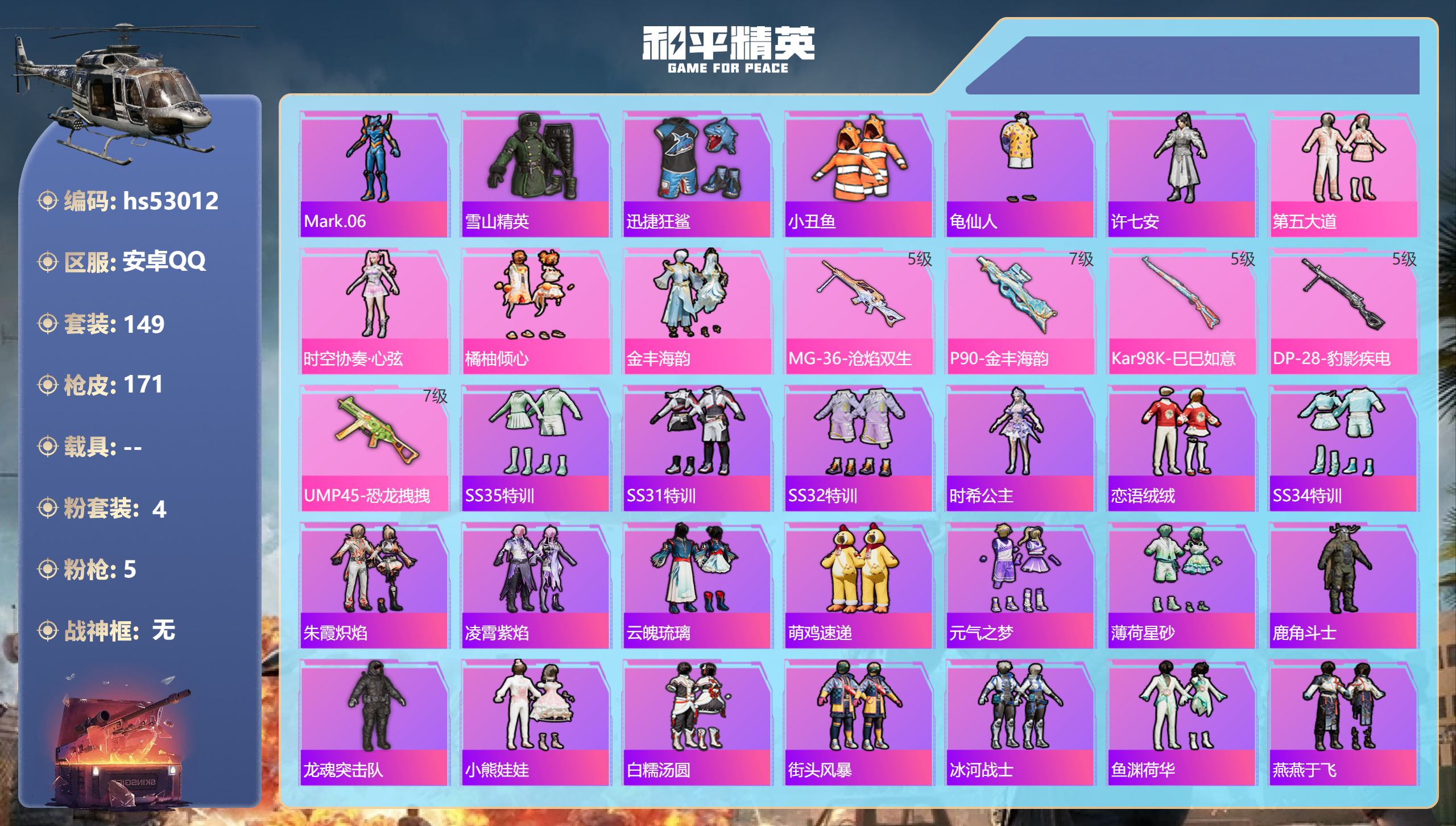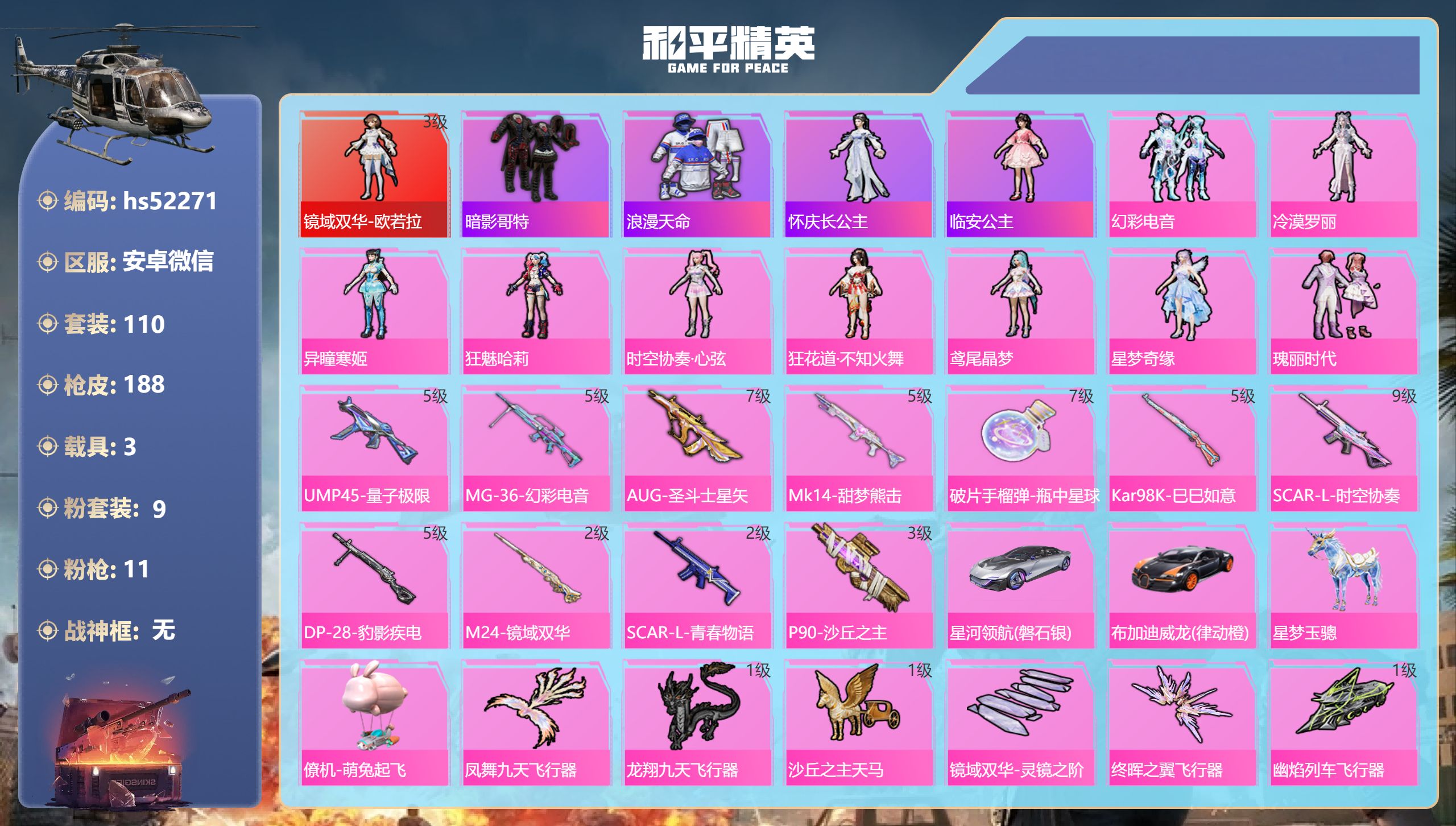 PX_2306871-载具12粉装6特效,7级风花雪月,2螳螂,胖达,红眼罩】安卓Q-1载具12粉装6特效枪11热门146套装179枪皮,65303热力值,9印记,历史超级王牌10星,【1载具】,仰望U9(赤霞丹朱),【12粉装】,茉莉星,暖暖奶龙,烟云彩露,幻影,金曜白虎,室女星神,智能音符,莲影清波,青空秋雨,星之彼岸,馨动时刻,恐龙拽拽,【6特效枪】,M416-心之恋语,(1级),AKM-星际浪客,(6