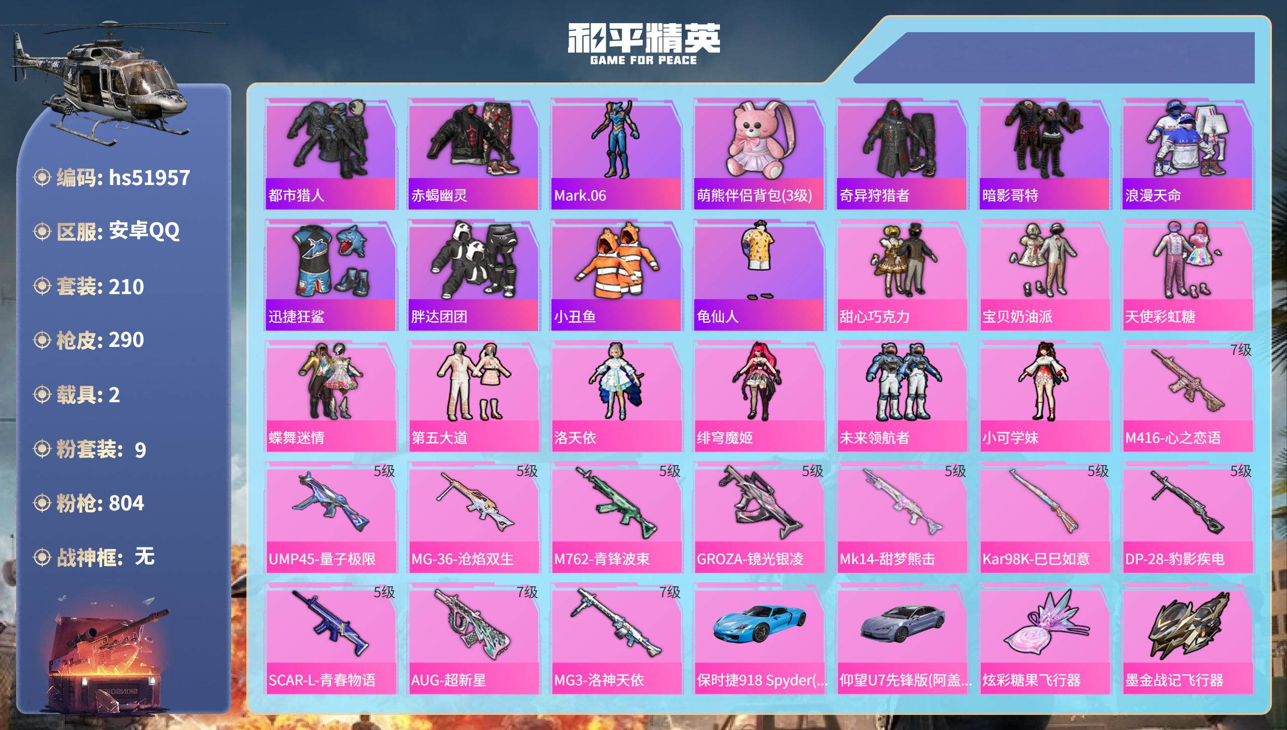 PX_2291322-,,安卓手Q-15王牌印记-9粉装-11特效枪-2载具-93953热力值-210套装-290枪皮-1卓越印记 【9粉装】套装-宝贝奶油派,角色-绯穹魔姬,套装-甜心巧克力,套装-天使彩虹糖,角色-洛天依,套装-第五大道,套装-未来领航者,角色-小可学妹,套装-蝶舞迷情 【11特效枪】MG3-洛神天依/7级,M762-青锋波束/5级,DP-28-豹影疾电/5级,M416-心之恋语/7级,Kar98K-巳巳如意/5级,MG-36-沧焰双生/5级,SCAR-L-青春物语/5级,GROZA-镜光银凌/5级,UMP45-量子极限/5级,Mk14-甜梦熊击/5级,AUG-超新星/7级 【11稀有紫装】都市猎人,赤蝎幽灵,Mark.06,萌熊伴侣背包(3级),奇异狩猎者,暗影哥特,浪漫天命,迅捷狂鲨,胖达团团,小丑鱼,龟仙人 【2稀有载具】保时捷918,Spyder(沉静蓝),仰望U7先锋版(阿盖尔紫) 【210稀有时装】甜心巧克力,宝贝奶油派,天使彩虹糖,蝶舞迷情,第五大道,洛天依,绯穹魔姬,SS35特训,午间小调,SS31特训,SS33特训,SS32特训,SS36特训,蓝冰羽,鲛海歌灵,霓虹热舞,雪绒豹,恋语绒绒,SS34特训,朱霞炽焰,紫幽梦,大橘大利,喜羊羊,都市猎人,胖达团团,浪漫天命,奇异狩猎者,龟仙人,Mark.06,暗影哥特,小丑鱼,迅捷狂鲨,赤蝎幽灵,凌霄紫焰,擎苍青焰,炫彩糖果,绯色魅影,萌鸡速递,元气之梦,风迹短诗,猎影月神,薄荷星砂,秘语星愿,粉恋花,云朵鹅,顶瓜瓜,未来领航者,,暗影刺翼,小可学妹,兔兔白日梦,动感兔斯基人偶服,狂沙舞者,龙魂突击队,异域银装,都市丽猫,街头风暴,冰河战士,鱼渊荷华,SS30特训,青团波波,燕燕于飞,战术大师,智谋强哥,雏菊兔兔,糖糖葫芦,香桃花海,蝶变,巳巳如意,曼妙人鱼,SS28特训,银尘,SS29特训,萝兰蝴蝶,明鸳圣池,贝斯之夜,焰鹰斗篷,童真绒兔,福星高照,都市漫游者,龙的传人,青玉碎影,萌黄之夏,蝶吟花词,特训学院,猎鹰,青年教官,橘黑制服,红色运动,黄色运动,蓝色运动,黄色伏地魔,白色伏地魔,冰川格斗者,湖蓝色名流,黄色名流,顽皮玉兔,绯格组合,涂山之恋,SS26特训,漫步者,空岛之星,JTeam战队服,荧惑魅影,热情海星,黑色伏地魔,元气发射,纯真浪花,竞技名士,深蓝色名流,猛禽,忠真马岱,长空猛禽,特战装甲,旭日情侣,街头潮人,冷焰舞者,惊鸿侠骨,魅力单车,灼焰舞者,雪山征服者,春光漫游,甜心亚梦,虚音幻奏,极地朋克,贵族骑装,幻世战舞者,甜蜜菠萝,牛气满满,萌趣咩咩,娇憨猪猪,风暴特警,春日漫步,冰川特警,龙腾端午,沙漠毒蛇,麻辣教官,鹰眼刺客,冰冻风暴,完美偶像,人气偶像,幽夜迷踪,幻影武者,梦魇先生,暖心橘喵,破蛋小黄鸡,潮流游乐家,快闪甜心,暗金炫舞,蓝彩潮人,绮丽涂鸦,耀眼新星,坚韧舞者,竞技达人朋克,野性战心,海岛探路者,林月如,破晓战魂,和煦暖阳,霓虹街区,森林游猎者,田园牧歌,都市魅力,轻风白浪,SS27特训,牛气冲天,SS18特训,清新柠檬,科技之星,SS17特训,竞技角斗士,瑞龙福将,团圆交子,金耀舞者,蓝调潮人,空投萌叽,金戈铁马,SS19特训,光之冒险,晨曦薄雾,SS20特训,SS21特训,玉兔迎春,深海梦境,SS22特训,SS23特训,摩登艾咪,缤纷果语,滨海厨神,莱茵河畔,天籁歌者,电音精灵,白兰地假日,神气柴柴,艾克斯奥特曼,灵蜜圈圈,妙红点点,幻彩翩翩,幻羽潜行,海盐绵绵冰,老实芭蕉,王牌教练,荣耀,柠萌假日,SS24特训,鹤鸣,懵萌河马,SS25特训,锦衣飞扬,星梦畅游,恶魔人蛛 【289稀有枪械】M416-心之恋语/7级,GROZA-奶油梦幻熊,UMP45-量子极限/5级,QBZ-纯真浪花,AWM-纯真浪花,汤姆逊-纯真浪花,DBS-乌木金纹,AA12-G-纯真浪花,平底锅-纯真浪花,AKM-霓彩节奏,M16A4-电光马卡龙,蝎式手枪-奶油梦幻熊,SCAR-L-海盐豹豹,TMP-9-霓彩节奏,MG-36-沧焰双生/5级,M762-青锋波束/5级,GROZA-镜光银凌/5级,Mk14-甜梦熊击/5级,Kar98K-巳巳如意/5级,DP-28-豹影疾电/5级,SLR-金丰海韵,野牛-雏菊兔兔,Mk14-冰河战士,平底锅-雏菊兔兔,M762-雏菊兔兔,Mini14-雏菊兔兔,R1895-雏菊兔兔,UZI-冰河战士,M16A4-冰河战士,MK20-H-乌木金纹,SCAR-L-青春物语/5级,AUG-超新星/7级,MG3-洛神天依/7级,DBS-风迹短诗,莫辛纳甘-风迹短诗,Win94-乌木金纹,MK12-风迹短诗,野牛-魔童闹海,敖闰,撬棍-冷漠罗丽,PKM-紫幽梦,MG3-霓彩脉冲,Mk14-紫幽梦,QBZ-魔药课室,蜜獾-乌木金纹,M762-云朵鹅,S1897-紫幽梦,SVD-云朵鹅,P92-紫幽梦,M249-绯穹魔姬,SPAS-12-狂鲨锋刃,AUG-冰晶雪宝,铝热弹-炫彩糖果,UZI-炫彩糖果,Mk47-风迹短诗,JS9-凌霄紫焰,汤姆逊-智趣喵喵,MG-36-凌霄紫焰,平底锅-紫幽梦,破片手榴弹-海盐豹豹,AKM-棋盘冕主,UMP45-海盐豹豹,ARX-凌霄紫焰,AKS-74U-乌木金纹,AKM-涂鸦街区,蜜獾-风迹短诗,P92-凌霄紫焰,AMR-喜羊羊与灰太狼,Famas-乌木金纹,Famas-霓彩脉冲,SPAS-12-云朵鹅,破片手榴弹-拽到爆炸,十字弩-异瞳寒姬,S1897-糯团青竹,信号枪-异瞳寒姬,平底锅-凌霄紫焰,Mk14-薄荷星砂,AKS-74U-鸡智如我,蝎式手枪-蛇蝎美人,S12K-智耀战神,沙漠之鹰-云朵鹅,烟雾弹-冰氧夏日,M16A4-荧光绘影,Mk14-紫晶流影,大砍刀-云朵鹅,PKM-啾咪啾咪,SLR-霓彩脉冲,平底锅-属我最6,SCAR-L-彩虹符号,M200-六号稻草人,蝎式手枪-六号稻草人,AUG-紫晶流影,S12K-霓彩脉冲,M416-魔童闹海,敖闰,AMR-鸡智如我,AKM-霓彩脉冲,M416-仓鼠灰灰,M416-蓝色火焰,M416-夜灯,M416-糯团青竹,M416-诡夜天鹅,M416-彩虹嘻嘻猴,AKM-影袭,AKM-小鹦鹉BEBE,AKM-奇异狩猎者,AKM-彩虹符号,AKM-龙的传人,AKM-虎虎生威,SCAR-L-红色方程式,SCAR-L-玉兔迎春,SCAR-L-炫彩节奏,M16A4-甜心亚梦,M16A4-天使羽翼,M16A4-莲影清波,GROZA-守护天翼,GROZA-酷泡奶龙,GROZA-影袭,GROZA-田园牧歌,GROZA-懵萌河马,AUG-耀粉歌者,AUG-青春冒险家,AUG-闲梦青缨,AUG-天降萌叽,QBZ-洛