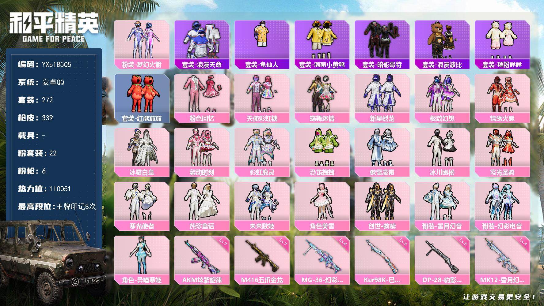 PX_2306823-5-【可二次】【因赛季更新游戏段付以上号为准!】 安卓Q-1稀有22粉装6特效枪34热门272套装339枪皮,8印记,历史传奇王牌18星, 【1稀有】,浪漫天命, 【22粉装】,梦幻火箭,蝶舞迷情,美雪,天使彩虹糖,雪月幻音,异瞳寒姬,未来歌姬,创世救赎,幻彩电音,粉色回忆,纯珍童话,新星烈龙,极致幻想,锦绣火鲤,冰川幽秘,冰霜白皇,傲雪凌霜,霞光圣骑,馨动时刻,恐龙拽拽,彩虹鹿灵,寒光使者, 【6特效枪】,M416-五爪金龙,(7级),AKM-炫紫旋律,(7级),Kar98K-巳巳如意,(5级),MG-36-幻彩电音,(6级),DP-28-豹影疾电,(5级),MK12-雪月幻音,(4级), 【34热门】,龟仙人,红熊茄茄,雪山精英,潮萌小黄鸭,糯粉咩咩,爱崽白熊,软萌银虎,兔兔白日梦,激萌罗小黑,迅捷狂鲨,大橘为重,浪漫波比,KSG战队服,梦起落英,神秘黑猫,暗夜契约,怪笑疯兔,暗影哥特,团圆交子,瑞龙福将,纯白誓言,狂沙舞者,冰爽海盐,抹茶蜜豆,静谧青瓷,机械英豪,破蛋小黄鸡,风华少年志,白月香洋装,新侠客行,黑色刀锋,极速红龙,弄潮海豚,M762-瑞龙福将, 【3飞行器】,梦幻火箭飞行器,春暖花开飞行器,天之羽翼飞行器, 【3头盔】,童趣迷兔头盔,梦幻火箭头盔,夏日绵绵冰头盔, 【5背包】,梦幻火箭背包,金风玉露背包,神秘黑猫背包,甜蜜誓约背包,夏日绵绵冰背包