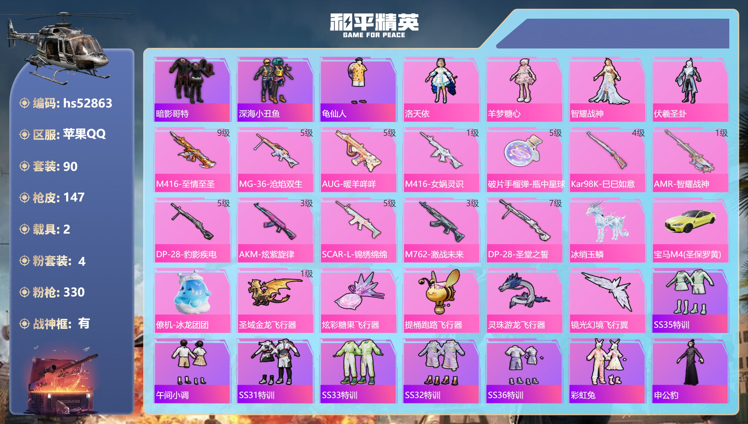 PX_2304507-,苹果手Q-9王牌印记-有战神框-4粉装-12特效枪-2载具-50134热力值-90套装-147枪皮-2卓越印记-2传奇印记 【4粉装】角色-羊梦糖心,角色-洛天依,角色-智耀战神,角色-伏羲圣卦 【12特效枪】M762-激战未来/3级,DP-28-豹影疾电/5级,AKM-炫紫旋律/3级,MG-36-沧焰双生/5级,Kar98K-巳巳如意/4级,M416-女娲灵识/1级,AUG-暖羊咩咩/5级,SCAR-L-锦绣绵绵/5级,M416-至情至圣/9级,DP-28-圣堂之誓/7级,AMR-智耀战神/1级,破片手榴弹-瓶中星球/5级 【3稀有紫装】暗影哥特,深海小丑鱼,龟仙人 【2稀有载具】冰绡玉鳞,宝马M4(圣保罗黄) 【1僚机】僚机-冰龙团团 【90稀有时装】洛天依,羊梦糖心,智耀战神,SS35特训,午间小调,SS31特训,SS33特训,SS32特训,SS36特训,彩虹兔,申公豹,蓝冰羽,鲛海歌灵,霓虹热舞,雪绒豹,星渊小夜曲,SS34特训,朱霞炽焰,紫幽梦,大橘大利,绛羽幽主,龟仙人,暗影哥特,深海小丑鱼,凌霄紫焰,粉黛兰香,无面战甲,擎苍青焰,炫彩糖果,萌鸡速递,元气之梦,风迹短诗,墨青刃影,薄荷星砂,秘语星愿,粉恋花,樱梦幻音,云朵鹅,顶瓜瓜,伏羲圣卦,龙魂突击队,异域银装,绒宝小鹅,冰河战士,鱼渊荷华,燕燕于飞,SS28特训,白光莹,无暇誓言,明鸳圣池,星际旅行,贝斯之夜,焰鹰斗篷,龙的传人,萌趣绒叽,猎鹰,红色运动,黄色运动,顽皮玉兔,SS26特训,漫步者,空岛之星,竞技名士,长空猛禽,旭日情侣,魅力单车,春光漫游,青涩时光,青春校园,冰川特警,鹰眼刺客,冰冻风暴,幽夜迷踪,快闪甜心,千禧之恋,海岛探路者,霓虹街区,耀粉歌者,SS27特训,竞技角斗士,弄潮海豚,缤纷果语,滨海厨神,幻羽潜行,海盐绵绵冰,老实芭蕉,吉莉礼服,柠萌假日,鹤鸣,SS25特训 【147稀有枪械】M416-至情至圣/9级,DBS-乌木金纹,Vector-创世·救赎,SCAR-L-海盐豹豹,GROZA-海盐豹豹,MG-36-沧焰双生/5级,AUG-暖羊咩咩/5级,M416-女娲灵识/1级,破片手榴弹-瓶中星球/5级,Kar98K-巳巳如意/4级,AMR-智耀战神/1级,DP-28-豹影疾电/5级,SLR-金丰海韵,蝎式手枪-金丰海韵,Mk14-冰河战士,UZI-冰河战士,AKM-炫紫旋律/3级,SCAR-L-锦绣绵绵/5级,M762-激战未来/3级,DP-28-圣堂之誓/7级,MK20-H-圣域龙灵,DBS-风迹短诗,莫辛纳甘-风迹短诗,AKM-绿洲时空,GROZA-无面战甲,Win94-乌木金纹,MK12-风迹短诗,MK12-乌木金纹,烟雾弹-冰澜龙吟,破片手榴弹-爆破雪人,PKM-紫幽梦,MG3-霓彩脉冲,DBS-幻彩电音,Mk14-紫幽梦,蜜獾-乌木金纹,M762-云朵鹅,S1897-紫幽梦,SVD-云朵鹅,P92-紫幽梦,蜜獾-绯穹魔姬,AWM-绿洲时空,M417-玩趣呆呆,AUG-冰晶雪宝,铝热弹-炫彩糖果,UZI-炫彩糖果,撬棍-咒蚀之裁,UMP45-绿洲时空,Mini14-绯穹魔姬,G36C-星穹咏叹调,短管霰弹-星穹咏叹调,Kar98K-星穹咏叹调,Mk47-风迹短诗,JS9-凌霄紫焰,MG-36-凌霄紫焰,平底锅-紫幽梦,燃烧瓶-甜梦桃焰,破片手榴弹-海盐豹豹,UMP45-海盐豹豹,ARX-凌霄紫焰,AKS-74U-乌木金纹,AKM-涂鸦街区,蜜獾-风迹短诗,P92-凌霄紫焰,Famas-乌木金纹,Famas-霓彩脉冲,SPAS-12-云朵鹅,M249-无面战甲,破片手榴弹-拽到爆炸,S1897-糯团青竹,信号枪-异瞳寒姬,平底锅-凌霄紫焰,沙漠之鹰-云朵鹅,烟雾弹-冰氧夏日,AKS-74U-粉粉喵呜,大砍刀-云朵鹅,爆炸猎弓-雪月幻音,SVD-霓彩脉冲,SLR-霓彩脉冲,平底锅-属我最6,SCAR-L-彩虹符号,P1911-无面战甲,蜜獾-冰澜龙吟,大砍刀-冰澜龙吟,S12K-霓彩脉冲,AKM-霓彩脉冲,SKS-圣域龙灵,M416-糯团青竹,AKM-影袭,AKM-破晓战魂,AKM-霓虹街区,SCAR-L-红色方程式,SCAR-L-夜灯,GROZA-影袭,AUG-耀粉歌者,QBZ-洛神天依,QBZ-彩虹符号,M762-彩虹符号,AC-VAL-天降萌叽,AC-VAL-快闪甜心,蜜獾-天降萌叽,M24-影袭,AWM-圣堂之誓,AWM-焰鹰斗篷,莫辛纳甘-蜜语绒猫,AMR-乌木金纹,SKS-迅猛狂鲨,Mini14-炫彩节奏,Mini14-穿刺龙虾,MK20-H-快闪甜心,UZI-影袭,UZI-啾咪啾咪,UMP45-蓝色火焰,UMP45-夜灯,Vector-生命誓言,Vector-焰鹰斗篷,MP5K-乌木金纹,P90-乌木金纹,P90-快闪甜心,P90-玩趣呆呆,S686-蜜语绒猫,S686-生命誓言,S12K-破晓战魂,S12K-玩趣呆呆,S12K-夜灯,DBS-焰鹰斗篷,DBS-圣堂之誓,AA12-G-萌物绒绒,M249-彩虹符号,DP-28-焰鹰斗篷,MG3-第五大道,沙漠之鹰-快闪甜心,平底锅-空岛之星,平底锅-快闪甜心,平底锅-焰鹰斗篷,破片手榴弹-呆爆全场,AUG-异域银装,UMP45-绒宝小鹅,汤姆逊-樱桃泡泡,M24-樱桃泡泡,野牛-燕燕于飞,M200-乌木金纹,SPAS-12-燕燕于飞,蝎式手枪-燕燕于飞,十字弩-异域银装,Vector-燕燕于飞,十字弩-燕燕于飞,AKM-玄冥寒域 【10稀有飞行器】圣域金龙飞行器/1级,狂鲨锋刃飞行器,鸡智如我飞行器,炫彩糖果飞行器,破刃行动尾迹,提桶跑路飞行器,灵珠游龙飞行器,空岛之星尾迹,异域银装飞行器,镜光幻境飞行翼 【25稀有背包】海盐豹豹背包(3级),萌物绒绒背包(3级),魔童闹海,敖丙背包(3级),狂鲨锋刃背包(3级),绯穹魔姬背包(3级),绝对恒星背包(3级),炫彩糖果背包(3级),喜羊羊与灰太狼背包(3级),凌霄紫焰背包(3级),粉黛兰香背包(3级),无面战甲背包(3级),紫幽梦背包(3级),萌鸡速递背包(3级),薄荷星砂背包(3级),风迹短诗背包(3级),云朵鹅背包(3级),龟仙人龟壳背包(3级),焰鹰斗篷背包(3级),快闪甜心背包(3级),圣堂之誓背包(3级),蜜语绒猫背包(3级),异域银装背包(3级),樱桃泡泡背包(3级),深海小丑鱼背包(3级),冰河战士背包(3级)