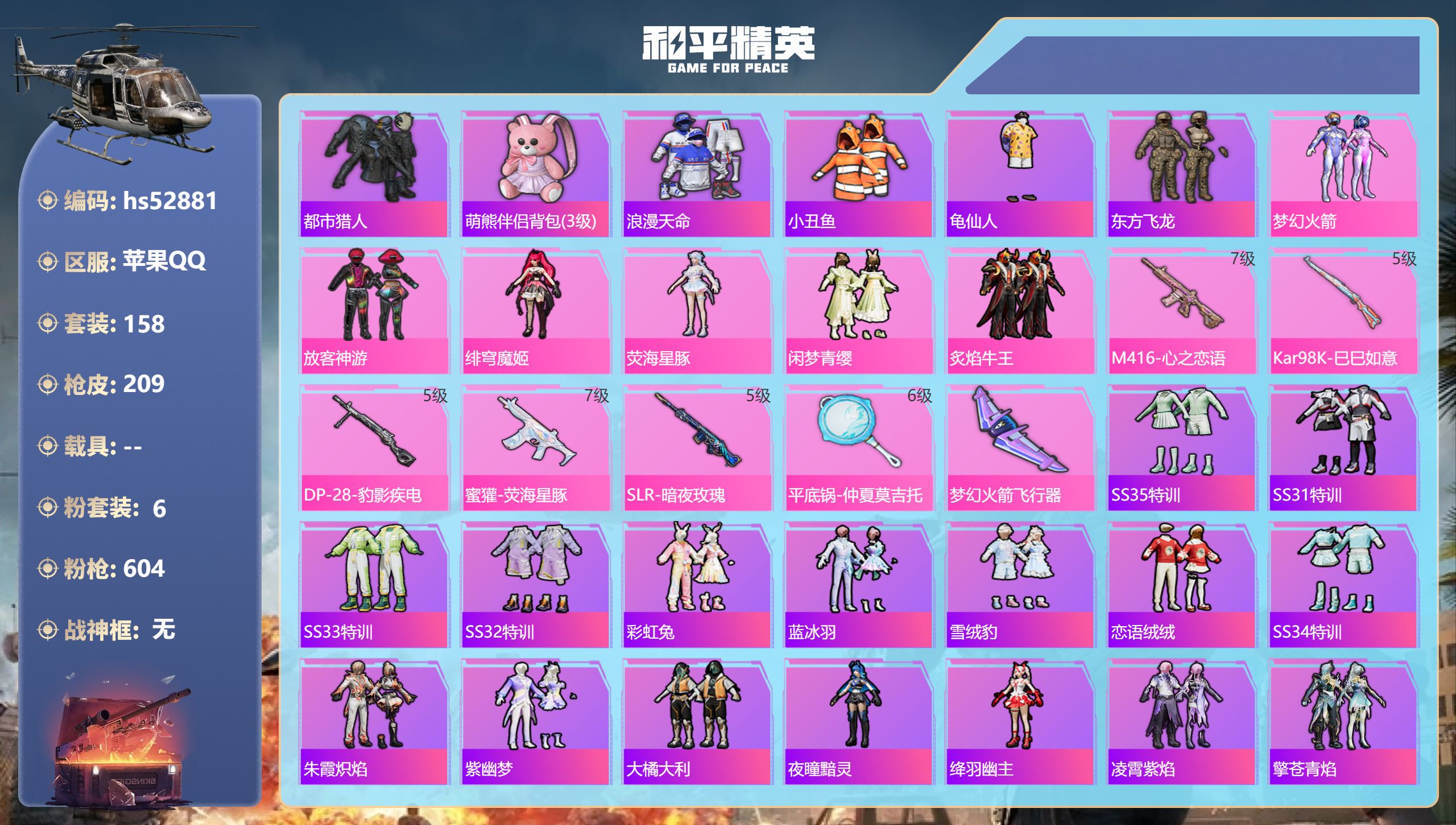 PX_2304514-,苹果手Q-9王牌印记-6粉装-6特效枪-64322热力值-158套装-209枪皮-1卓越印记 【6粉装】套装-闲梦青缨,套装-梦幻火箭,套装-炙焰牛王,角色-荧海星豚,角色-绯穹魔姬,套装-放客神游 【6特效枪】SLR-暗夜玫瑰/5级,平底锅-仲夏莫吉托/6级,Kar98K-巳巳如意/5级,M416-心之恋语/7级,DP-28-豹影疾电/5级,蜜獾-荧海星豚/7级 【6稀有紫装】都市猎人,萌熊伴侣背包(3级),浪漫天命,小丑鱼,龟仙人,东方飞龙 【158稀有时装】梦幻火箭,放客神游,绯穹魔姬,荧海星豚,SS35特训,SS31特训,SS33特训,SS32特训,彩虹兔,蓝冰羽,雪绒豹,恋语绒绒,SS34特训,朱霞炽焰,紫幽梦,大橘大利,夜瞳黯灵,绛羽幽主,都市猎人,浪漫天命,龟仙人,小丑鱼,东方飞龙,凌霄紫焰,擎苍青焰,萌鸡速递,元气之梦,蜜露汐语,薄荷星砂,粉恋花,蓝海鲸歌,云朵鹅,引力深渊,顶瓜瓜,闲梦青缨,炙焰牛王,狂沙舞者,Alan,Walker,异域银装,鱼渊荷华,燕燕于飞,SS16特训,华灯初上,智慧隐士,焰山流火,爆裂葡萄,福星高照,暗夜契约,虎虎生威吉莉,夏日音浪,龙的传人,萌黄之夏,隐空刺,特训学院,红色运动,蓝色运动,极速竞梦,飞驰魅影,白色伏地魔,音速流光,活力之心,湖蓝色名流,黄色名流,酷潮明星,绯格组合,涂山之恋,SS26特训,TT战队服,漫步者,荧惑魅影,黎明保卫者,炫蓝之夏,竞技名士,蓝色守护者,猛禽,长空猛禽,特战装甲,旭日情侣,六六大吉,冥星暗影,怒火燎原,惊鸿侠骨,魅力单车,春光漫游,水银刺客,猎梦纪元,甜心亚梦,虚音幻奏,幻世战舞者,战地督导,街舞达人,突袭者,青涩时光,青春校园,牛气满满,萌趣咩咩,娇憨猪猪,冰川特警,潮流先锋,龙腾端午,燃烧卡路里,滨海假日,鹰眼刺客,冰冻风暴,冷酷挑战者,青春冒险家,破蛋小黄鸡,潮流游乐家,耀眼新星,朋克治安官,野性战心,幻世保卫者,和煦暖阳,田园牧歌,萌趣颜团子,轻风白浪,风行保卫者,探宝勇士,牛气冲天,SS18特训,清新柠檬,飞行日记,SS17特训,瑞龙福将,团圆交子,金耀舞者,遗落祭司,异彩先驱,霓虹极客,空投萌叽,SS19特训,光之冒险,SS20特训,SS21特训,玉兔迎春,SS22特训,SS23特训,夏日倾情,缤纷果语,滨海厨神,SS14特训,神气柴柴,灵蜜圈圈,妙红点点,幻彩翩翩,格斗先锋,吉莉礼服,海上生明月,王牌教练,荣耀,暗夜之虎,柠萌假日,SS24特训,鹤鸣,懵萌河马,SS25特训,锦衣飞扬,SS15特训 【209稀有枪械】M416-心之恋语/7级,蜜獾-精灵梦叶罗丽,Kar98K-巳巳如意/5级,DP-28-豹影疾电/5级,蜜獾-荧海星豚/7级,SLR-暗夜玫瑰/5级,平底锅-仲夏莫吉托/6级,Mini14-鸡智如我,AKM-绿洲时空,Win94-乌木金纹,AKM-极光猎影,UZI-魔药课室,PKM-紫幽梦,Mk14-紫幽梦,蜜獾-乌木金纹,M762-云朵鹅,S1897-紫幽梦,SVD-云朵鹅,P92-紫幽梦,蜜獾-绯穹魔姬,M249-绯穹魔姬,M417-玩趣呆呆,铝热弹-炫彩糖果,UZI-炫彩糖果,Mini14-绯穹魔姬,JS9-凌霄紫焰,MG-36-凌霄紫焰,平底锅-紫幽梦,UMP45-海盐豹豹,ARX-凌霄紫焰,AKS-74U-乌木金纹,P92-凌霄紫焰,Famas-乌木金纹,Famas-霓彩脉冲,SPAS-12-云朵鹅,破片手榴弹-拽到爆炸,S1897-糯团青竹,信号枪-异瞳寒姬,平底锅-凌霄紫焰,Mk14-薄荷星砂,AKS-74U-鸡智如我,沙漠之鹰-云朵鹅,烟雾弹-冰氧夏日,大砍刀-云朵鹅,PKM-啾咪啾咪,GROZA-荧海星豚,S1897-荧海星豚,DBS-荧海星豚,SVD-霓彩脉冲,SLR-霓彩脉冲,SCAR-L-彩虹符号,M200-六号稻草人,AUG-紫晶流影,S12K-霓彩脉冲,AKM-霓彩脉冲,M416-红色方程式,M416-蓝色火焰,M416-夜灯,M416-糯团青竹,M416-绯红前夜,AKM-影袭,AKM-星兔领航员,AKM-夜灯,AKM-彩虹符号,AKM-龙的传人,AKM-灼热熔岩,AKM-虎虎生威,AKM-萌趣颜团子,AKM-霓虹街区,SCAR-L-红色方程式,SCAR-L-玉兔迎春,SCAR-L-银碳小老虎,SCAR-L-黄金龙骨,SCAR-L-炫彩节奏,M16A4-幻世战舞者,M16A4-凝视深渊,M16A4-甜心亚梦,GROZA-异彩先驱,GROZA-影袭,GROZA-田园牧歌,GROZA-懵萌河马,GROZA-2B战斗服款,AUG-幻影战神,AUG-青春冒险家,AUG-天降萌叽,QBZ-飞驰魅影,M762-瑞龙福将,M762-诡娃娃,M762-绯红前夜,M762-天降萌叽,Mk47-百万伏特,Mk47-乌木金纹,Mk47-妙红点点,Mk47-青春冒险家,G36C-乌木金纹,G36C-暗夜玫瑰,G36C-懵萌河马,AC-VAL-天降萌叽,AC-VAL-甜心亚梦,AC-VAL-乌木金纹,蜜獾-天降萌叽,蜜獾-娇憨猪猪,Kar98K-梦幻火箭,Kar98K-飞驰魅影,Kar98K-彩虹符号,Kar98K-影袭,Kar98K-炫彩节奏,M24-乌木金纹,M24-影袭,M24-奇异狩猎者,M24-未来战士,M24-炫彩节奏,AWM-雷霆特警,Win94-瑞龙福将,莫辛纳甘-乌木金纹,莫辛纳甘-炙焰牛王,莫辛纳甘-懵萌河马,AMR-乌木金纹,AMR-妙红点点,M200-惊鸿侠骨,SKS-夜灯,SKS-未来歌姬,VSS-田园牧歌,Mini14-异彩先驱,Mk14-童趣迷兔,Mk14-乌木金纹,SLR-彩虹符号,SLR-娇憨猪猪,QBU-青春冒险家,M417-惊鸿侠骨,UZI-炫彩节奏,UZI-影袭,UZI-娇憨猪猪,UMP45-涂山之恋,UMP45-生命誓言,UMP45-粉色回忆,Vector-生命誓言,Vector-夜灯,Vector-彩虹符号,Vector-黑色刀锋,Vector-田园牧歌,汤姆逊-耀粉歌者,汤姆逊-天降萌叽,汤姆逊-异彩先驱,汤姆逊-奇异狩猎者,野牛-乌木金纹,野牛-青春冒险家,MP5K-异彩先驱,P90-乌木金纹,P90-快闪甜心,P90-飞驰魅影,P90-筑梦精灵,S686-红色方程式,S686-生命誓言,S1897-星夜魔法师,S1897-碧影闪光,S1897-乌木金纹,S1897-炫彩节奏,S1897-飞驰魅影,S12K-玩趣呆呆,S12K-幻世战舞者,S12K-瑞龙福将,S12K-夏日绵绵冰,S12K-娇憨猪猪,DBS-第五大道,DBS-甜心亚梦,DBS-彩虹符号,SPAS-12-田园牧歌,M249-彩虹符号,M249-乌木金纹,M249-星之彼岸,M249-妙红点点,DP-28-甜心宝贝,DP-28-彩虹符号,DP-28-甜心亚梦,MG3-惊鸿侠骨,MG3-第五大道,MG3-幻世战舞者,MG3-妙红点点,MG3-乌木金纹,MG3-瑞龙福将,PKM-懵萌河马,沙漠之鹰-
