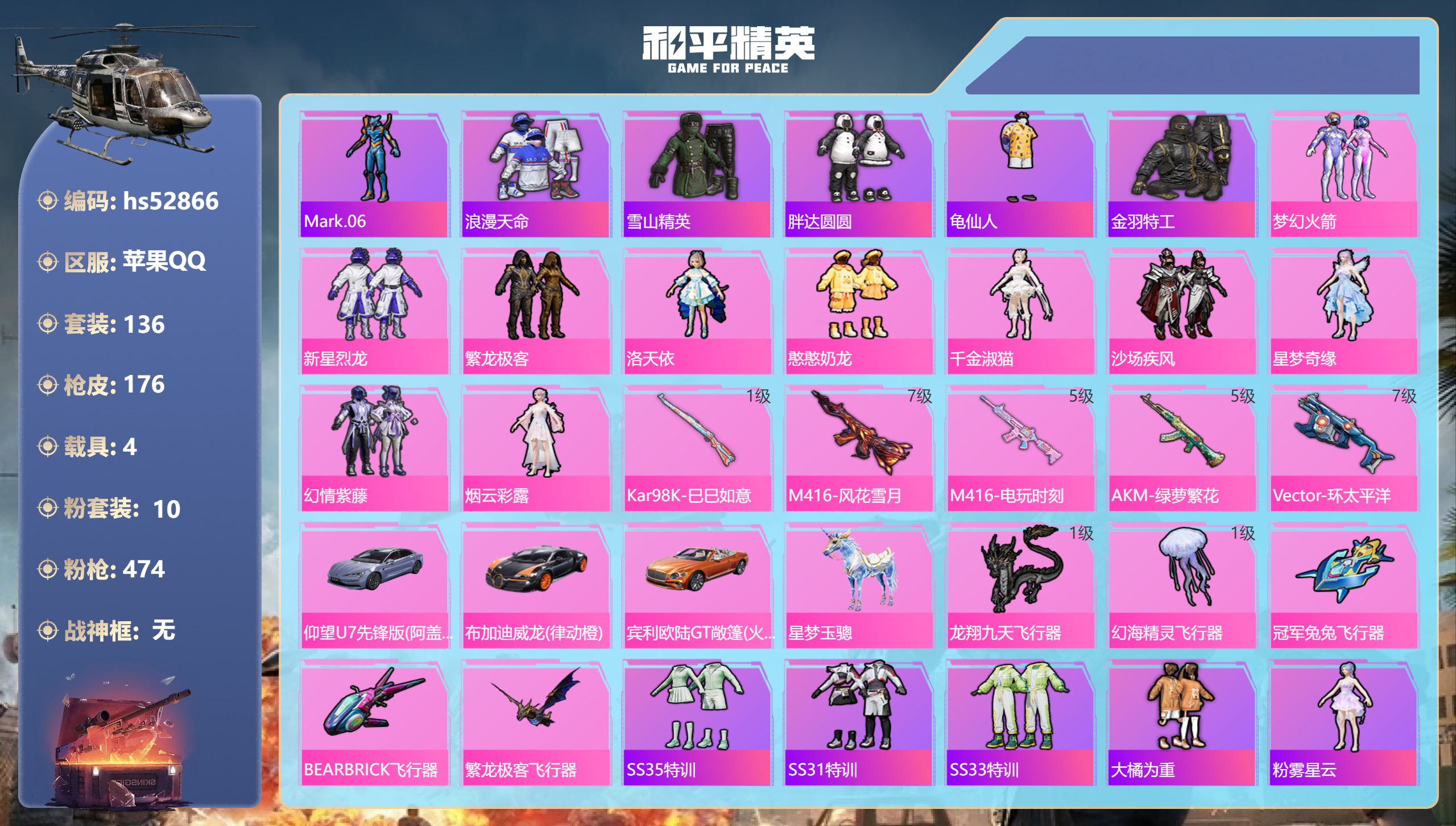 PX_2304517-,苹果手Q-10王牌印记-10粉装-5特效枪-4载具-63049热力值-136套装-176枪皮-3卓越印记-1传奇印记 【10粉装】套装-梦幻火箭,角色-烟云彩露,角色-星梦奇缘,角色-洛天依,套装-憨憨奶龙,套装-新星烈龙,套装-沙场疾风,角色-千金淑猫,套装-幻情紫藤,套装-繁龙极客 【5特效枪】Kar98K-巳巳如意/1级,M416-电玩时刻/5级,AKM-绿萝繁花/5级,M416-风花雪月/7级,Vector-环太平洋/7级 【6稀有紫装】Mark.06,浪漫天命,雪山精英,胖达圆圆,龟仙人,金羽特工 【4稀有载具】仰望U7先锋版(阿盖尔紫),布加迪威龙(律动橙),宾利欧陆GT敞篷(火焰橘),星梦玉骢 【136稀有时装】梦幻火箭,新星烈龙,繁龙极客,洛天依,SS35特训,SS31特训,SS33特训,浪漫天命,龟仙人,Mark.06,雪山精英,金羽特工,胖达圆圆,憨憨奶龙,千金淑猫,沙场疾风,星梦奇缘,幻情紫藤,烟云彩露,大橘为重,粉雾星云,龙魂突击队,铁血战翼,卖崽青蛙,小熊娃娃,摩登魅猫,星途旅人,冰河战士,SS30特训,青团波波,拉斐尔,战术大师,雏菊兔兔,糖糖葫芦,香桃花海,蝶变,曼妙人鱼,棉花软糖,极地流光,SS28特训,银尘,SS29特训,萝兰蝴蝶,SS16特训,焰鹰斗篷,英勇保护者,醒狮腾龙,爆裂葡萄,湖雨初晴,福星高照,虎虎生威吉莉,夏日音浪,龙的传人,军刀雅典娜,青玉碎影,萌黄之夏,特训学院,白色伏地魔,酒红色名流,黄色名流,绯格组合,涂山之恋,SS26特训,漫步者,热情海星,炫蓝之夏,元气发射,纯真浪花,竞技名士,蓝色守护者,深蓝色名流,长空猛禽,旭日情侣,怒火燎原,惊鸿侠骨,魅力单车,春光漫游,幻世战舞者,青涩时光,牛气满满,冰川特警,滨海假日,极速红龙,麻辣教官,鹰眼刺客,冰冻风暴,人气偶像,幽夜迷踪,幻影武者,破蛋小黄鸡,快闪甜心,千禧之恋,绮丽涂鸦,竞技达人朋克,超能勇士,破晓战魂,田园牧歌,轻风白浪,耀粉歌者,SS12特训,SS27特训,SS18特训,飞行日记,SS17特训,瑞龙福将,团圆交子,缤纷焰火,异彩先驱,霓虹极客,空投萌叽,SS19特训,SS20特训,SS21特训,玉兔迎春,SS22特训,SS23特训,飞狐塔尔斯,甜蜜熊情侣,香榭午后,SS14特训,天籁歌者,神气柴柴,艾克斯奥特曼,妙红点点,幻彩翩翩,格斗先锋,幻羽潜行,海盐绵绵冰,老实芭蕉,王牌教练,荣耀,柠萌假日,SS24特训,懵萌河马,SS25特训,锦衣飞扬 【176稀有枪械】QBZ-纯真浪花,AWM-纯真浪花,汤姆逊-纯真浪花,DBS-乌木金纹,AA12-G-纯真浪花,平底锅-纯真浪花,AMR-墨龙九天,SLR-墨龙九天,汤姆逊-星梦奇缘,MK20-H-星梦奇缘,SCAR-L-海盐豹豹,平底锅-精灵梦叶罗丽,Kar98K-巳巳如意/1级,野牛-雏菊兔兔,Mk14-冰河战士,平底锅-雏菊兔兔,M762-雏菊兔兔,Mini14-雏菊兔兔,Famas-突变脉冲,R1895-雏菊兔兔,Mk47-极冰使者,撬棍-突变脉冲,UZI-冰河战士,M16A4-冰河战士,MK20-H-乌木金纹,M416-风花雪月/7级,M416-电玩时刻/5级,AKM-绿萝繁花/5级,Vector-环太平洋/7级,Win94-乌木金纹,铝热弹-炫彩糖果,UZI-炫彩糖果,M416-蓝色火焰,M416-夜灯,M416-糯团青竹,AKM-环太平洋,AKM-影袭,AKM-夜灯,AKM-彩虹符号,AKM-龙的传人,AKM-2P战斗服款,AKM-灼热熔岩,AKM-虎虎生威,AKM-霓虹街区,SCAR-L-玉兔迎春,SCAR-L-炫彩节奏,M16A4-幻世战舞者,GROZA-异彩先驱,GROZA-蓝莓炮弹,GROZA-影袭,GROZA-田园牧歌,GROZA-懵萌河马,AUG-耀粉歌者,QBZ-神秘黑猫,QBZ-洛神天依,M762-瑞龙福将,M762-牛气冲天,M762-第五大道,M762-天降萌叽,Mk47-乌木金纹,Mk47-妙红点点,Mk47-洛神天依,G36C-乌木金纹,G36C-懵萌河马,AC-VAL-天降萌叽,AC-VAL-快闪甜心,AC-VAL-乌木金纹,蜜獾-垂柳戏鸭,Kar98K-乌木金纹,Kar98K-梦幻火箭,Kar98K-红色方程式,Kar98K-彩虹符号,Kar98K-炫彩节奏,M24-乌木金纹,M24-影袭,M24-奇异狩猎者,M24-炫彩节奏,AWM-乌木金纹,AWM-音爆索尼克,AWM-焰鹰斗篷,Win94-瑞龙福将,莫辛纳甘-乌木金纹,莫辛纳甘-懵萌河马,AMR-乌木金纹,AMR-妙红点点,AMR-妙趣可丽,M200-惊鸿侠骨,SKS-心之恋语,VSS-田园牧歌,VSS-彩虹符号,Mini14-梦幻火箭,Mini14-耀粉歌者,Mini14-炫彩节奏,Mini14-涂山之恋,Mini14-异彩先驱,Mk14-乌木金纹,M417-惊鸿侠骨,MK20-H-快闪甜心,UZI-炫彩节奏,UZI-影袭,UZI-天降萌叽,UZI-啾咪啾咪,UMP45-繁龙极客,UMP45-涂山之恋,UMP45-蓝色火焰,UMP45-生命誓言,UMP45-夜灯,Vector-彩虹符号,Vector-田园牧歌,Vector-焰鹰斗篷,汤姆逊-耀粉歌者,汤姆逊-天降萌叽,汤姆逊-乌木金纹,汤姆逊-异彩先驱,汤姆逊-炫彩节奏,汤姆逊-环太平洋,野牛-乌木金纹,MP5K-异彩先驱,MP5K-蓝莓炮弹,MP5K-乌木金纹,P90-乌木金纹,P90-快闪甜心,P90-玩趣呆呆,S686-繁龙极客,S1897-神秘黑猫,S1897-炫彩节奏,S12K-玩趣呆呆,S12K-幻世战舞者,S12K-瑞龙福将,DBS-焰鹰斗篷,DBS-第五大道,DBS-彩虹符号,SPAS-12-田园牧歌,M249-彩虹符号,M249-沙丘之主,M249-乌木金纹,M249-妙红点点,DP-28-甜心宝贝,DP-28-焰鹰斗篷,MG3-惊鸿侠骨,MG3-第五大道,MG3-幻世战舞者,MG3-妙红点点,MG3-乌木金纹,MG3-瑞龙福将,PKM-懵萌河马,蝎式手枪-闲梦青缨,沙漠之鹰-快闪甜心,TMP-9-江南烟雨,平底锅-惊鸿侠骨,平底锅-光之冒险,平底锅-空投萌叽,平底锅-懵萌河马,平底锅-田园牧歌,平底锅-妙红点点,平底锅-快闪甜心,平底锅-异彩先驱,平底锅-瑞龙福将,平底锅-焰鹰斗篷,撬棍-沙丘之主权杖,撬棍-环太平洋,战术弩-江南烟雨,爆炸猎弓-惊鸿侠骨,Kar98K-顶峰精英,SKS-BEARBRICK,蝎式手枪-千金淑猫,M16A4-千金淑猫,MK20-H-糖糖葫芦,MK20-H-星途旅人,蜜獾-糖糖葫芦,UMP45-糖糖葫芦,SPAS-12-乌木金纹,平底锅-糖糖葫芦,P18C-糖糖葫芦,VSS-香桃花海,Mini14-香桃花海 【7稀有飞行器】龙翔九天飞行器/1级,幻海精灵飞行器/1级,冠军兔兔飞行器,光之冒险尾迹,空岛之