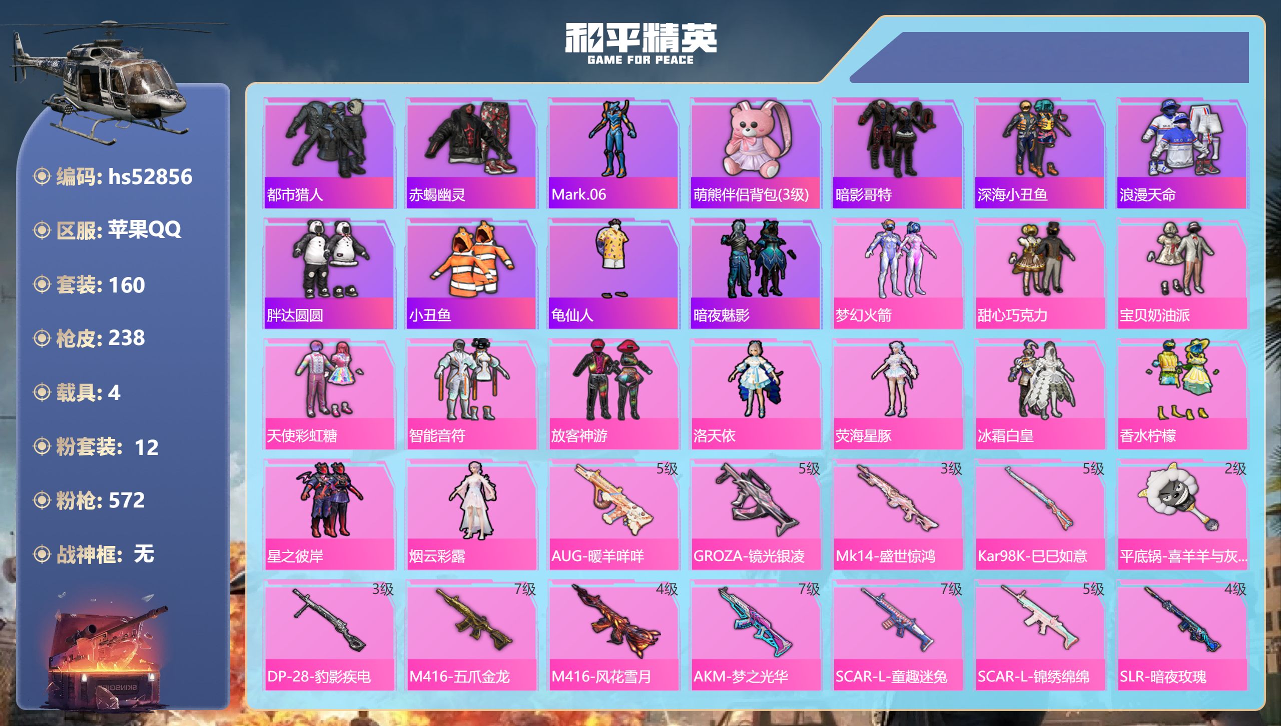 PX_2304503-,苹果手Q-16王牌印记-12粉装-12特效枪-4载具-86565热力值-160套装-238枪皮-1卓越印记-1传奇印记 【12粉装】套装-智能音符,套装-星之彼岸,套装-甜心巧克力,套装-宝贝奶油派,套装-香水柠檬,套装-天使彩虹糖,套装-梦幻火箭,角色-洛天依,角色-烟云彩露,套装-冰霜白皇,角色-荧海星豚,套装-放客神游 【12特效枪】AUG-暖羊咩咩/5级,GROZA-镜光银凌/5级,平底锅-喜羊羊与灰太狼/2级,M416-五爪金龙/7级,Kar98K-巳巳如意/5级,SCAR-L-锦绣绵绵/5级,M416-风花雪月/4级,SCAR-L-童趣迷兔/7级,AKM-梦之光华/7级,DP-28-豹影疾电/3级,SLR-暗夜玫瑰/4级,Mk14-盛世惊鸿/3级 【11稀有紫装】都市猎人,赤蝎幽灵,Mark.06,萌熊伴侣背包(3级),暗影哥特,深海小丑鱼,浪漫天命,胖达圆圆,小丑鱼,龟仙人,暗夜魅影 【4稀有载具】宾利飞驰(布罗德盖棕双色),宾利BATUR(极速紫),合金龙骨(蓝),星梦玉骢 【160稀有时装】梦幻火箭,甜心巧克力,宝贝奶油派,天使彩虹糖,智能音符,放客神游,洛天依,荧海星豚,SS35特训,SS31特训,SS33特训,SS32特训,雪绒豹,恋语绒绒,星渊小夜曲,折梦之诗,SS34特训,朱霞炽焰,都市猎人,浪漫天命,暗夜魅影,龟仙人,Mark.06,暗影哥特,深海小丑鱼,小丑鱼,胖达圆圆,赤蝎幽灵,凌霄紫焰,元气之梦,薄荷星砂,冰霜白皇,香水柠檬,星之彼岸,烟云彩露,动感兔斯基人偶服,狂战萌兔,狂沙舞者,Alan,Walker,萌神柯基,粉雾星云,石蕴玉辉,龙魂突击队,狂花道·雅典娜,都市丽猫,街头风暴,星途旅人,冰河战士,鱼渊荷华,SS30特训,青团波波,燕燕于飞,风玲,战术大师,智谋强哥,糖糖葫芦,香桃花海,蝶变,巳巳如意,棉花软糖,极地流光,SS28特训,银尘,SS29特训,SS16特训,暴风机械师,时空追击者,舰行太空,焰鹰斗篷,暗夜傀儡,水晶王族,菲菲,冰爽风暴,福星高照,虎虎生威吉莉,夏日音浪,龙的传人,白熊同盟,青玉碎影,萌黄之夏,黄色运动,飞驰魅影,音速流光,热血青春,湖蓝色名流,酷潮明星,绯格组合,SS26特训,空岛之星,热情海星,炫蓝之夏,元气发射,纯真浪花,竞技名士,覆海蛟龙,长空猛禽,战地菁英,冷焰舞者,惊鸿侠骨,魅力单车,春光漫游,野性战魂,甜心亚梦,虚音幻奏,幻世战舞者,牛气满满,萌趣咩咩,娇憨猪猪,冰川特警,潮流先锋,滨海假日,麻辣教官,鹰眼刺客,冰冻风暴,快闪甜心,神秘领域,绮丽涂鸦,田园牧歌,轻风白浪,探宝勇士,SS27特训,牛气冲天,SS18特训,SS17特训,瑞龙福将,团圆交子,异彩先驱,霓虹极客,空投萌叽,SS19特训,SS20特训,SS21特训,玉兔迎春,孙悟空,SS22特训,SS23特训,呆萌铁蟹,冰爽海盐,浪漫樱花,夏日倾情,甜蜜熊情侣,缤纷果语,天籁歌者,电音精灵,白兰地假日,神气柴柴,灵蜜圈圈,欧布奥特曼,妙红点点,幻彩翩翩,格斗先锋,幻羽潜行,冷血极客,柠萌假日,粉红小猪,SS24特训,鹤鸣,懵萌河马,SS25特训,锦衣飞扬 【238稀有枪械】QBZ-纯真浪花,AWM-纯真浪花,汤姆逊-纯真浪花,DBS-乌木金纹,AA12-G-纯真浪花,平底锅-纯真浪花,撬棍-朗基努斯之枪,烟雾弹-鸢尾晶梦,MK20-H-星梦奇缘,SCAR-L-海盐豹豹,AUG-暖羊咩咩/5级,GROZA-镜光银凌/5级,Mk14-盛世惊鸿/3级,Kar98K-巳巳如意/5级,平底锅-喜羊羊与灰太狼/2级,DP-28-豹影疾电/3级,Mk14-冰河战士,AKS-74U-尼罗河传说,DP-28-尼罗河传说,P92-尼罗河传说,UZI-冰河战士,M16A4-冰河战士,MK20-H-乌木金纹,M416-五爪金龙/7级,M416-风花雪月/4级,AKM-梦之光华/7级,SCAR-L-童趣迷兔/7级,SCAR-L-锦绣绵绵/5级,SLR-暗夜玫瑰/4级,汤姆逊-灵猫魔法师,蜜獾-乌木金纹,M762-云朵鹅,SVD-云朵鹅,蜜獾-绯穹魔姬,破片手榴弹-咒蚀之裁,蜜獾-折梦之诗,SKS-折梦之诗,G36C-星穹咏叹调,JS9-凌霄紫焰,MG-36-凌霄紫焰,MG3-折梦之诗,ARX-凌霄紫焰,AKS-74U-乌木金纹,P92-凌霄紫焰,Famas-乌木金纹,SPAS-12-云朵鹅,M249-无面战甲,平底锅-凌霄紫焰,沙漠之鹰-云朵鹅,PKM-啾咪啾咪,P1911-无面战甲,M416-蓝色火焰,M416-糯团青竹,AKM-影袭,AKM-生命誓言,AKM-彩虹符号,AKM-缤纷海域,AKM-冰凉西瓜,AKM-灼热熔岩,AKM-虎虎生威,SCAR-L-红色方程式,SCAR-L-玉兔迎春,SCAR-L-暗夜玫瑰,SCAR-L-青丘仙客,SCAR-L-炫彩节奏,M16A4-幻世战舞者,M16A4-甜心亚梦,M16A4-天使羽翼,GROZA-春暖花开,GROZA-异彩先驱,GROZA-蓝莓炮弹,GROZA-影袭,GROZA-田园牧歌,GROZA-懵萌河马,AUG-灵符少年,AUG-海螺星光,AUG-天降萌叽,QBZ-电玩视界,QBZ-飞驰魅影,QBZ-洛神天依,QBZ-未来歌姬,QBZ-彩虹符号,M762-瑞龙福将,M762-风花雪月,M762-甜心宝贝,M762-天降萌叽,Mk47-乌木金纹,Mk47-妙红点点,Mk47-洛神天依,G36C-乌木金纹,G36C-暗夜玫瑰,G36C-懵萌河马,G36C-炙焰牛王,G36C-时空追击者,AC-VAL-天降萌叽,AC-VAL-快闪甜心,AC-VAL-甜心亚梦,AC-VAL-乌木金纹,蜜獾-天降萌叽,蜜獾-娇憨猪猪,Kar98K-乌木金纹,Kar98K-梦幻火箭,Kar98K-六号树人,Kar98K-洛神天依,Kar98K-魅影蝠王,Kar98K-飞驰魅影,Kar98K-影袭,Kar98K-黑白懵懵牛,Kar98K-炫彩节奏,M24-乌木金纹,M24-影袭,M24-炫彩节奏,AWM-圣堂之誓,AWM-焰鹰斗篷,AWM-垂柳戏鸭,AWM-恐龙拽拽,Win94-瑞龙福将,莫辛纳甘-乌木金纹,莫辛纳甘-懵萌河马,AMR-乌木金纹,AMR-妙红点点,M200-惊鸿侠骨,SKS-时空追击者,SKS-炫彩节奏,VSS-田园牧歌,Mini14-梦幻火箭,Mini14-龙宫之主,Mini14-涂山之恋,Mini14-异彩先驱,Mini14-穿刺龙虾,Mini14-春暖花开,Mk14-童趣迷兔,Mk14-乌木金纹,SLR-娇憨猪猪,M417-惊鸿侠骨,MK20-H-快闪甜心,UZI-炫彩节奏,UZI-影袭,UZI-烈焰拳霸,UZI-娇憨猪猪,UZI-天降萌叽,UZI-啾咪啾咪,UMP45-生命誓言,UMP45-仲夏莫吉托,UMP45-时空追击者,UMP45-诡娃娃,Vector-暗夜玫瑰,Vector-田园牧歌,Vector-焰鹰斗篷,汤姆逊-天降萌叽,汤姆逊-异彩先驱,汤