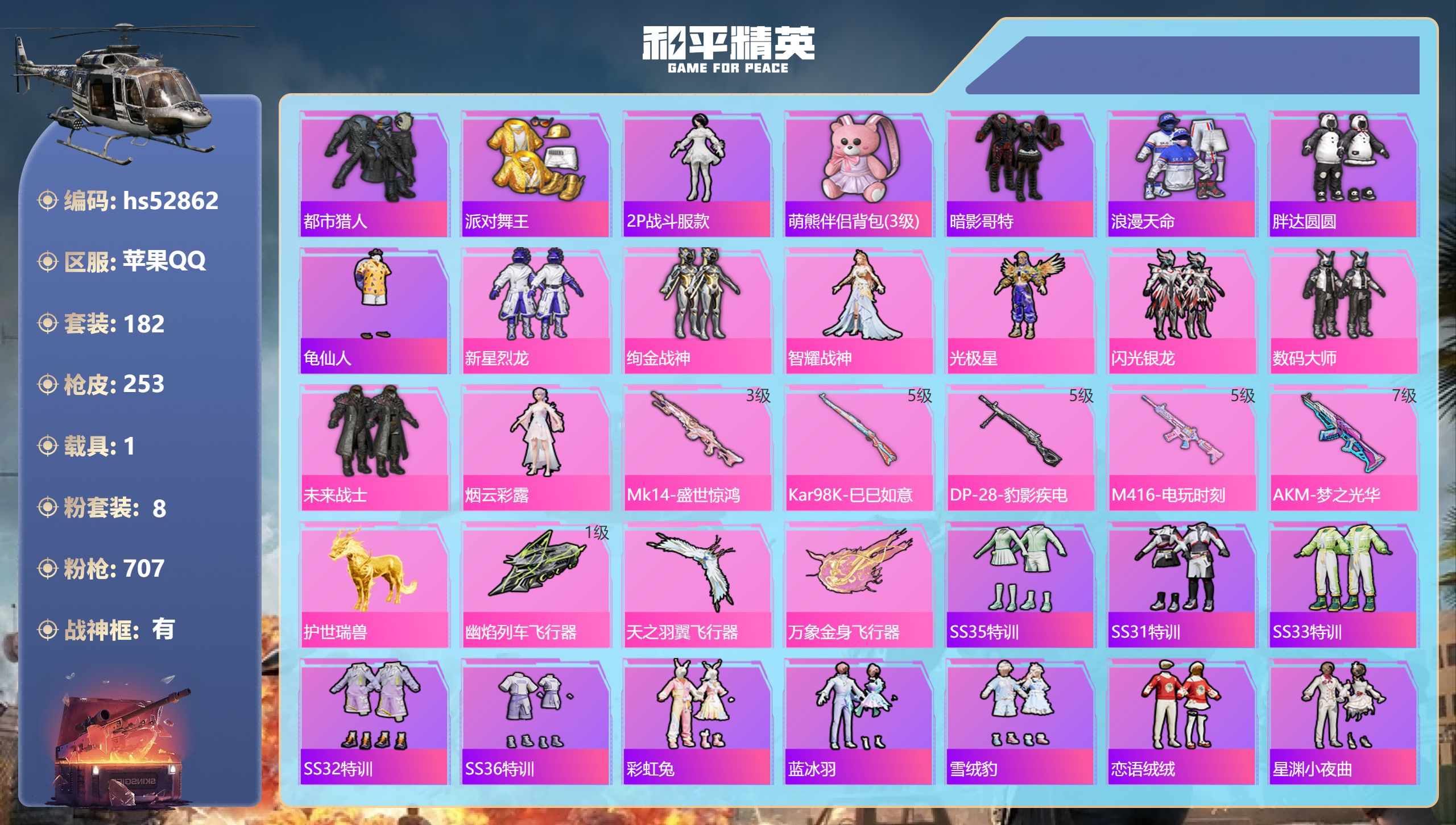 PX_2304516-,苹果手Q-20王牌印记-有战神框-8粉装-5特效枪-1载具-75252热力值-182套装-253枪皮-7卓越印记-5传奇印记 【8粉装】套装-新星烈龙,套装-闪光银龙,角色-光极星,套装-绚金战神,套装-未来战士,套装-数码大师,角色-烟云彩露,角色-智耀战神 【5特效枪】AKM-梦之光华/7级,M416-电玩时刻/5级,Mk14-盛世惊鸿/3级,Kar98K-巳巳如意/5级,DP-28-豹影疾电/5级 【8稀有紫装】都市猎人,派对舞王,2P战斗服款,萌熊伴侣背包(3级),暗影哥特,浪漫天命,胖达圆圆,龟仙人 【1稀有载具】护世瑞兽 【182稀有时装】新星烈龙,绚金战神,智耀战神,SS35特训,SS31特训,SS33特训,SS32特训,SS36特训,彩虹兔,蓝冰羽,雪绒豹,恋语绒绒,星渊小夜曲,SS34特训,朱霞炽焰,紫幽梦,大橘大利,都市猎人,浪漫天命,龟仙人,游乐,暗影哥特,胖达圆圆,紫俏灵猫,凌霄紫焰,云魄琉璃,擎苍青焰,萌鸡速递,元气之梦,瑰梦爱神,薄荷星砂,粉恋花,蓝海鲸歌,云朵鹅,风舞幻音,派对舞王,2P战斗服款,光极星,闪光银龙,数码大师,未来战士,烟云彩露,激萌罗小黑,狂沙舞者,Alan,Walker,龙魂突击队,卖崽青蛙,异域银装,摩登魅猫,白糯汤圆,街头风暴,冰河战士,鱼渊荷华,SS30特训,青团波波,燕燕于飞,海琴烟,达芬奇,风玲,战术大师,雏菊兔兔,糖糖葫芦,巳巳如意,曼妙人鱼,元素星魂,SS28特训,SS29特训,萝兰蝴蝶,Alan,Walker电音教主,SS16特训,暴风机械师,时空追击者,明鸳圣池,贝斯之夜,焰鹰斗篷,醒狮腾龙,福星高照,龙的传人,智慧之神,特训学院,猎鹰,青年教官,橘黑制服,红色运动,黄色运动,蓝色运动,黄色伏地魔,白色伏地魔,冰川格斗者,酒红色名流,湖蓝色名流,黄色名流,SS26特训,漫步者,空岛之星,热情海星,黑色伏地魔,炫蓝之夏,纯真浪花,竞技名士,深蓝色名流,猛禽,长空猛禽,特战装甲,旭日情侣,街头潮人,冷焰舞者,惊鸿侠骨,魅力单车,灼焰舞者,春光漫游,甜心亚梦,虚音幻奏,幻世战舞者,战地督导,甜蜜菠萝,青涩时光,青春校园,牛气满满,萌趣咩咩,娇憨猪猪,极速红龙,鹰眼刺客,冰冻风暴,冷酷挑战者,完美偶像,人气偶像,幽夜迷踪,幻影武者,青春冒险家,破蛋小黄鸡,潮流游乐家,摇滚舞王,快闪甜心,蓝彩潮人,绮丽涂鸦,竞技达人朋克,超能勇士,海岛探路者,破晓战魂,和煦暖阳,霓虹街区,田园牧歌,都市魅力,萌趣颜团子,轻风白浪,耀粉歌者,SS27特训,情公主,治愈之星,清新柠檬,科技之星,SS17特训,瑞龙福将,团圆交子,蓝调潮人,异彩先驱,霓虹极客,空投萌叽,SS19特训,光之冒险,血色贵族,SS21特训,弄潮海豚,SS22特训,SS23特训,呆萌铁蟹,缤纷果语,滨海厨神,香榭午后,SS14特训,艾克斯奥特曼,幻羽潜行,海盐绵绵冰,旷野奇兵,海上生明月,王牌教练,柠萌假日,SS24特训,SS25特训,锦衣飞扬,SS15特训 【253稀有枪械】QBZ-纯真浪花,AWM-纯真浪花,汤姆逊-纯真浪花,DBS-乌木金纹,AA12-G-纯真浪花,平底锅-纯真浪花,P1911-创世·救赎,蝎式手枪-奶油梦幻熊,蜜獾-精灵梦叶罗丽,S1897-精灵梦叶罗丽,SCAR-L-海盐豹豹,平底锅-精灵梦叶罗丽,GROZA-海盐豹豹,Mk14-盛世惊鸿/3级,Kar98K-巳巳如意/5级,DP-28-豹影疾电/5级,野牛-雏菊兔兔,蝎式手枪-金丰海韵,Mk14-冰河战士,平底锅-雏菊兔兔,M762-雏菊兔兔,Mini14-雏菊兔兔,R1895-雏菊兔兔,UZI-冰河战士,M16A4-冰河战士,MK20-H-乌木金纹,M416-电玩时刻/5级,AKM-梦之光华/7级,Win94-乌木金纹,MK12-乌木金纹,SVD-冷漠罗丽,破片手榴弹-爆破雪人,S12K-极意拳锋,PKM-紫幽梦,MG3-霓彩脉冲,Mk14-紫幽梦,蜜獾-乌木金纹,M762-云朵鹅,S1897-紫幽梦,SVD-云朵鹅,P92-紫幽梦,SPAS-12-狂鲨锋刃,M417-玩趣呆呆,MK20-H-狂鲨锋刃,UMP45-绿洲时空,M416-萌萌史莱姆,G36C-星穹咏叹调,JS9-凌霄紫焰,MG-36-凌霄紫焰,平底锅-紫幽梦,破片手榴弹-海盐豹豹,UMP45-海盐豹豹,ARX-凌霄紫焰,AKS-74U-乌木金纹,AKM-涂鸦街区,P92-凌霄紫焰,AMR-喜羊羊与灰太狼,Famas-乌木金纹,Famas-霓彩脉冲,SPAS-12-云朵鹅,破片手榴弹-拽到爆炸,十字弩-异瞳寒姬,S1897-糯团青竹,信号枪-异瞳寒姬,平底锅-凌霄紫焰,Mk14-薄荷星砂,AKS-74U-鸡智如我,汤姆逊-智耀战神,S12K-智耀战神,沙漠之鹰-云朵鹅,烟雾弹-冰氧夏日,AKS-74U-粉粉喵呜,大砍刀-云朵鹅,PKM-啾咪啾咪,SLR-霓彩脉冲,SCAR-L-彩虹符号,S12K-霓彩脉冲,AKM-霓彩脉冲,M416-蓝色火焰,M416-糯团青竹,M416-月影鸳鸯,M416-黄金狮王,M416-罗小黑,M416-绯红前夜,AKM-影袭,AKM-彩虹符号,AKM-缤纷海域,AKM-龙的传人,AKM-2P战斗服款,AKM-萌趣颜团子,AKM-霓虹街区,SCAR-L-玉兔迎春,SCAR-L-甜蜜誓约,SCAR-L-黄金龙骨,SCAR-L-夜灯,M16A4-甜心亚梦,GROZA-异彩先驱,GROZA-影袭,GROZA-田园牧歌,GROZA-彩虹符号,GROZA-治愈之星,AUG-甜蜜菠萝,AUG-青春冒险家,AUG-2P战斗服款,AUG-天降萌叽,QBZ-彩虹符号,M762-瑞龙福将,M762-诡娃娃,M762-绯红前夜,M762-快乐主宰,M762-天降萌叽,Mk47-乌木金纹,Mk47-青春冒险家,G36C-乌木金纹,G36C-金风玉露,G36C-时空追击者,AC-VAL-天降萌叽,AC-VAL-快闪甜心,AC-VAL-甜心亚梦,AC-VAL-乌木金纹,蜜獾-天降萌叽,蜜獾-娇憨猪猪,Kar98K-乌木金纹,Kar98K-电玩视界,Kar98K-影袭,Kar98K-炫彩节奏,M24-乌木金纹,M24-影袭,M24-奇异狩猎者,M24-治愈之星,M24-未来战士,AWM-天降萌叽,AWM-不夜海上花,AWM-焰鹰斗篷,Win94-瑞龙福将,莫辛纳甘-乌木金纹,AMR-乌木金纹,AMR-镜光幻境,M200-惊鸿侠骨,SKS-时空追击者,SKS-糯团青竹,VSS-未来战士,VSS-田园牧歌,Mini14-金玉无双,Mini14-异彩先驱,Mk14-治愈之星,Mk14-乌木金纹,SLR-娇憨猪猪,QBU-青春冒险家,M417-惊鸿侠骨,M417-猪猪侠,MK20-H-快闪甜心,UZI-炫彩节奏,UZI-影袭,UZI-娇憨猪猪,UZI-啾咪啾咪,UMP45-生命