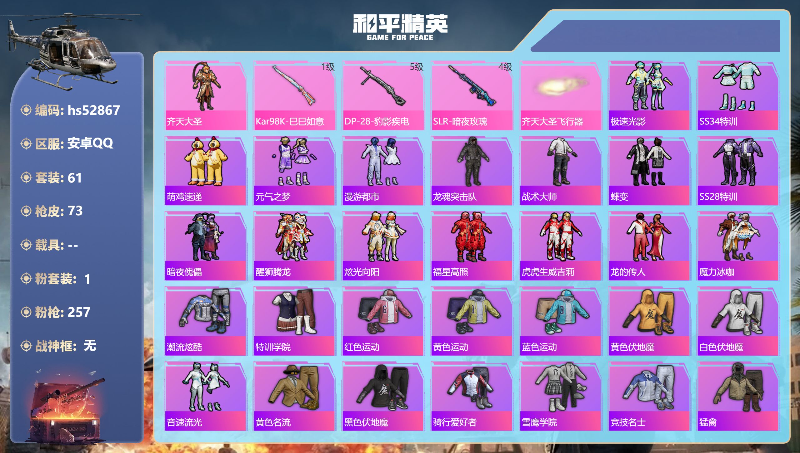 PX_2304499-,安卓手Q-0王牌印记-1粉装-3特效枪-22809热力值-61套装-73枪皮 【1粉装】套装-齐天大圣 【3特效枪】Kar98K-巳巳如意/1级,DP-28-豹影疾电/5级,SLR-暗夜玫瑰/4级 【61稀有时装】极速光影,SS34特训,萌鸡速递,元气之梦,漫游都市,齐天大圣,龙魂突击队,战术大师,蝶变,SS28特训,暗夜傀儡,醒狮腾龙,炫光向阳,福星高照,虎虎生威吉莉,龙的传人,魔力冰咖,潮流炫酷,特训学院,红色运动,黄色运动,蓝色运动,黄色伏地魔,白色伏地魔,音速流光,黄色名流,黑色伏地魔,骑行爱好者,雪鹰学院,竞技名士,猛禽,长空猛禽,旭日情侣,冷焰舞者,魅力单车,冰川特警,疯狂小兔子,神秘领域,破晓战魂,幻世保卫者,霓虹街区,都市魅力,耀粉歌者,SS18特训,SS17特训,瑞龙福将,团圆交子,异彩先驱,霓虹极客,空投萌叽,滨海厨神,天籁歌者,迪迦奥特曼,赛罗奥特曼,艾克斯奥特曼,欧布奥特曼,捷德奥特曼,格斗先锋,海盐绵绵冰,粉红小猪,SS25特训 【73稀有枪械】DBS-乌木金纹,SCAR-L-海盐豹豹,GROZA-海盐豹豹,Kar98K-巳巳如意/1级,DP-28-豹影疾电/5级,Mk14-冰河战士,UZI-冰河战士,M16A4-冰河战士,MK20-H-乌木金纹,SLR-暗夜玫瑰/4级,AKS-74U-乌木金纹,Famas-霓彩脉冲,破片手榴弹-拽到爆炸,信号枪-异瞳寒姬,Mk14-薄荷星砂,SLR-霓彩脉冲,S12K-霓彩脉冲,AKM-霓彩脉冲,M416-蓝色火焰,M416-夜灯,AKM-彩虹符号,AKM-龙的传人,AKM-虎虎生威,SCAR-L-红色方程式,SCAR-L-暗夜玫瑰,SCAR-L-炫彩节奏,M16A4-幻世战舞者,GROZA-异彩先驱,AUG-灵符少年,AUG-焰龙焚天,QBZ-神秘黑猫,QBZ-彩虹符号,M762-瑞龙福将,M762-天降萌叽,G36C-乌木金纹,G36C-暗夜玫瑰,Kar98K-梦幻火箭,Kar98K-红色方程式,Kar98K-飞驰魅影,M24-乌木金纹,Win94-瑞龙福将,SKS-焦糖拿铁,VSS-碧影闪光,Mini14-耀粉歌者,Mini14-异彩先驱,UZI-炫彩节奏,UZI-天降萌叽,Vector-暗夜玫瑰,Vector-生命誓言,Vector-彩虹符号,汤姆逊-耀粉歌者,汤姆逊-天降萌叽,汤姆逊-异彩先驱,野牛-乌木金纹,MP5K-异彩先驱,P90-乌木金纹,P90-飞驰魅影,S686-红色方程式,S1897-乌木金纹,S1897-百万伏特,S12K-瑞龙福将,DP-28-齐天大圣,DP-28-彩虹符号,MG3-幻世战舞者,MG3-瑞龙福将,平底锅-飞驰魅影,平底锅-异彩先驱,平底锅-瑞龙福将,撬棍-齐天大圣,破片手榴弹-星途旅人,VSS-香桃花海,Mini14-香桃花海,P90-巳巳如意 【3稀有飞行器】狂鲨锋刃飞行器,粉色滑翔尾迹,齐天大圣飞行器 【12稀有背包】海盐豹豹背包(3级),暗夜玫瑰背包(3级),萌鸡速递背包(3级),碧影闪光背包(3级),虎虎生威背包(3级),齐天大圣背包(3级),焦糖拿铁背包(3级),香桃花海背包(3级),冰河战士背包(3级),春暖花开背包(3级),瑞龙福将背包(3级),异彩先驱背包(3级)