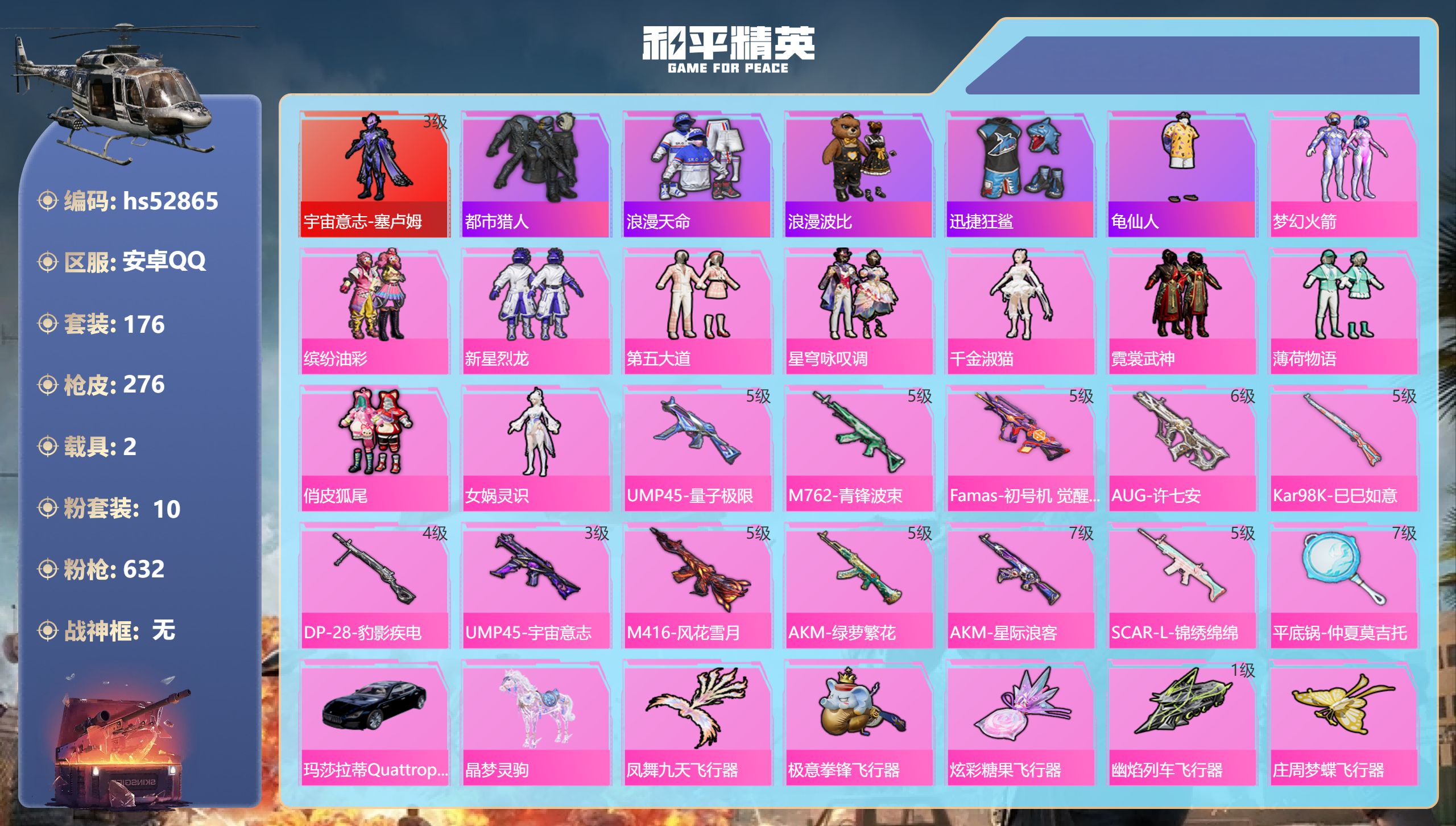PX_2304500-,安卓手Q-17王牌印记-1红装-10粉装-12特效枪-2载具-90256热力值-176套装-276枪皮-1卓越印记 【1红装】宇宙意志-塞卢姆/3级 【10粉装】套装-新星烈龙,套装-俏皮狐尾,套装-霓裳武神,角色-女娲灵识,角色-千金淑猫,套装-缤纷油彩,套装-梦幻火箭,套装-星穹咏叹调,套装-第五大道,套装-薄荷物语 【12特效枪】Famas-初号机,觉醒Ver./5级,SCAR-L-锦绣绵绵/5级,M762-青锋波束/5级,平底锅-仲夏莫吉托/7级,Kar98K-巳巳如意/5级,AKM-绿萝繁花/5级,AUG-许七安/6级,AKM-星际浪客/7级,DP-28-豹影疾电/4级,UMP45-量子极限/5级,UMP45-宇宙意志/3级,M416-风花雪月/5级 【5稀有紫装】都市猎人,浪漫天命,浪漫波比,迅捷狂鲨,龟仙人 【2稀有载具】玛莎拉蒂Quattroporte(夜幕蓝),晶梦灵驹 【176稀有时装】梦幻火箭,缤纷油彩,新星烈龙,第五大道,塞卢姆/3级,星穹咏叹调,SS35特训,SS31特训,SS33特训,SS32特训,SS36特训,恋语绒绒,SS34特训,朱霞炽焰,都市猎人,浪漫天命,龟仙人,迅捷狂鲨,浪漫波比,凌霄紫焰,炫彩糖果,萌鸡速递,元气之梦,薄荷星砂,千金淑猫,霓裳武神,薄荷物语,俏皮狐尾,女娲灵识,罗小黑,龙魂突击队,小熊娃娃,绿洲幻境,绒宝小鹅,星途旅人,冰河战士,鱼渊荷华,SS30特训,青团波波,燕燕于飞,风玲,战术大师,智谋强哥,雏菊兔兔,多纳泰罗,糖糖葫芦,香桃花海,蝶变,巳巳如意,曼妙人鱼,棉花软糖,SS28特训,SS29特训,萝兰蝴蝶,皇家花园,SS16特训,暴风机械师,时空追击者,贝斯之夜,焰鹰斗篷,军械专家,冰爽风暴,福星高照,雪兔飞飞,都市漫游者,虎虎生威吉莉,夏日音浪,龙的传人,果汁能量,白熊同盟,萌黄之夏,黄色伏地魔,飞驰魅影,白色伏地魔,音速流光,热血青春,酒红色名流,湖蓝色名流,绯格组合,涂山之恋,SS26特训,薄荷蓝莓,空岛之星,热情海星,炫蓝之夏,纯真浪花,竞技名士,猛禽,长空猛禽,特战装甲,街头潮人,冷焰舞者,惊鸿侠骨,灼焰舞者,春光漫游,猎梦纪元,甜心亚梦,虚音幻奏,极地朋克,贵族骑装,幻世战舞者,甜蜜菠萝,特殊使命,青涩时光,牛气满满,萌趣咩咩,娇憨猪猪,冰川特警,滨海假日,沙漠毒蛇,麻辣教官,冰冻风暴,完美偶像,幻影武者,诡面顽熊,俏皮奶喵,破蛋小黄鸡,疯狂小兔子,快闪甜心,千禧之恋,绮丽涂鸦,竞技达人朋克,野性战心,海岛探路者,和煦暖阳,霓虹街区,森林游猎者,田园牧歌,轻风白浪,特种颜团子,沙漠兵团,耀粉歌者,探宝勇士,SS27特训,牛气冲天,情公主,SS18特训,飞行日记,SS17特训,竞技角斗士,瑞龙福将,团圆交子,金耀舞者,缤纷焰火,异彩先驱,霓虹极客,空投萌叽,SS19特训,光之冒险,晨曦薄雾,SS20特训,SS21特训,玉兔迎春,孙悟空,深海梦境,SS22特训,SS23特训,天籁歌者,赛罗奥特曼,神气柴柴,妙红点点,幻彩翩翩,格斗先锋,幻羽潜行,海盐绵绵冰,老实芭蕉,王牌教练,柠萌假日,粉红小猪,SS24特训,鹤鸣,懵萌河马,SS25特训,初雨海棠,锦衣飞扬,星梦畅游 【276稀有枪械】M249-萌萌彩虹球,UMP45-量子极限/5级,QBZ-纯真浪花,AWM-纯真浪花,汤姆逊-纯真浪花,DBS-乌木金纹,AA12-G-纯真浪花,平底锅-纯真浪花,Vector-创世·救赎,蜜獾-精灵梦叶罗丽,SCAR-L-海盐豹豹,平底锅-精灵梦叶罗丽,GROZA-海盐豹豹,M762-青锋波束/5级,Famas-初号机,觉醒Ver./5级,AUG-许七安/6级,Kar98K-巳巳如意/5级,DP-28-豹影疾电/4级,UMP45-宇宙意志/3级,SLR-极冰使者,野牛-雏菊兔兔,Mk14-冰河战士,平底锅-雏菊兔兔,M762-雏菊兔兔,Mini14-雏菊兔兔,M200-宇宙意志,短管霰弹-宇宙意志,R1895-雏菊兔兔,AC-VAL-宇宙意志,UZI-冰河战士,M16A4-冰河战士,MK20-H-乌木金纹,M416-风花雪月/5级,AKM-绿萝繁花/5级,AKM-星际浪客/7级,SCAR-L-锦绣绵绵/5级,平底锅-仲夏莫吉托/7级,Mini14-鸡智如我,AKM-绿洲时空,Win94-乌木金纹,MK12-乌木金纹,破片手榴弹-爆破雪人,蜜獾-乌木金纹,SPAS-12-狂鲨锋刃,AUG-冰晶雪宝,铝热弹-炫彩糖果,UZI-炫彩糖果,Mini14-绯穹魔姬,G36C-星穹咏叹调,JS9-凌霄紫焰,MG-36-凌霄紫焰,ARX-凌霄紫焰,AKS-74U-乌木金纹,AKM-涂鸦街区,P92-凌霄紫焰,Famas-霓彩脉冲,破片手榴弹-拽到爆炸,S1897-糯团青竹,平底锅-凌霄紫焰,Mk14-薄荷星砂,汤姆逊-智耀战神,MG3-智耀战神,PKM-啾咪啾咪,SLR-霓彩脉冲,AUG-紫晶流影,M416-红色方程式,M416-糯团青竹,M416-绿野极光,AKM-影袭,AKM-百万伏特,AKM-彩虹符号,AKM-龙的传人,AKM-灼热熔岩,AKM-虎虎生威,AKM-霓虹街区,SCAR-L-红色方程式,SCAR-L-玉兔迎春,SCAR-L-黄金龙骨,SCAR-L-夜灯,SCAR-L-炫彩节奏,M16A4-幻世战舞者,M16A4-凝视深渊,M16A4-甜心亚梦,GROZA-黑色刀锋,GROZA-异彩先驱,GROZA-影袭,GROZA-田园牧歌,GROZA-懵萌河马,AUG-幻影战神,AUG-耀粉歌者,AUG-甜蜜菠萝,AUG-幻梦音符,AUG-天降萌叽,QBZ-飞驰魅影,M762-瑞龙福将,M762-绯红前夜,M762-奇异狩猎者,M762-橘柚倾心,M762-天降萌叽,Mk47-乌木金纹,Mk47-妙红点点,Mk47-洛神天依,G36C-乌木金纹,G36C-暗夜玫瑰,G36C-懵萌河马,G36C-时空追击者,AC-VAL-天降萌叽,AC-VAL-快闪甜心,AC-VAL-甜心亚梦,AC-VAL-乌木金纹,蜜獾-天降萌叽,蜜獾-垂柳戏鸭,蜜獾-娇憨猪猪,Kar98K-乌木金纹,Kar98K-梦幻火箭,Kar98K-飞驰魅影,Kar98K-彩虹符号,Kar98K-影袭,M24-乌木金纹,M24-奇异狩猎者,M24-仲夏莫吉托,M24-香水柠檬,M24-炫彩节奏,AWM-焰鹰斗篷,AWM-垂柳戏鸭,AWM-恐龙拽拽,Win94-瑞龙福将,莫辛纳甘-乌木金纹,莫辛纳甘-懵萌河马,AMR-乌木金纹,AMR-妙红点点,M200-仲夏莫吉托,M200-惊鸿侠骨,SKS-时空追击者,SKS-青丘仙客,SKS-糯团青竹,SKS-未来歌姬,SKS-炫彩节奏,VSS-田园牧歌,VSS-彩虹符号,Mini14-梦幻火箭,Mini14-炫彩节奏,Mini14-异彩先驱,Mk14-乌木金纹,SLR-璀璨流光,SLR-娇