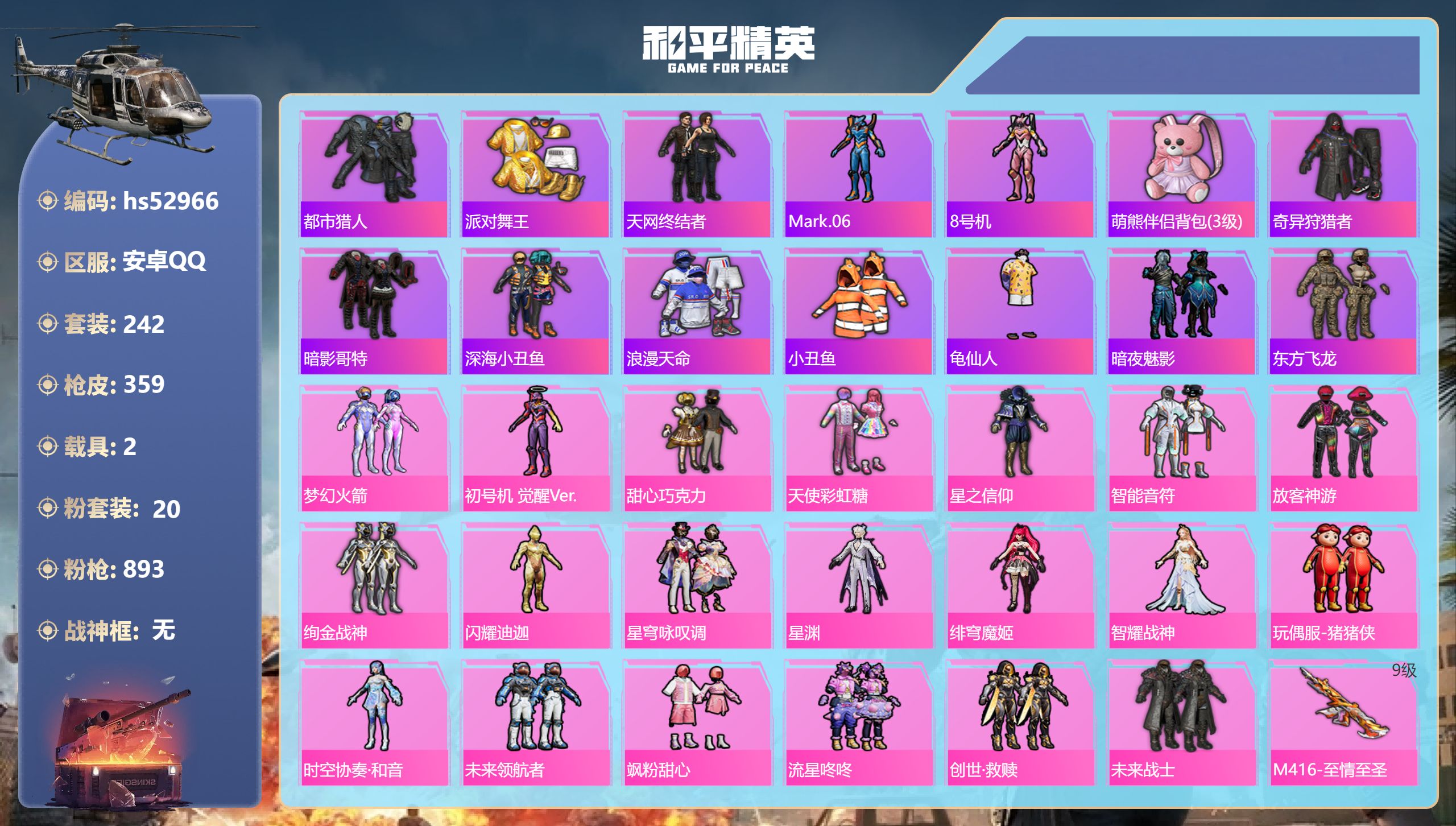 PX_2306355-,安卓手Q-19王牌印记-20粉装-16特效枪-2载具-热力值-242套装-359枪皮-6卓越印记-4传奇印记 【20粉装】套装-梦幻火箭,套装-流星咚咚,玩偶服-猪猪侠,套装-星穹咏叹调,套装-未来领航者,角色-绯穹魔姬,套装-智能音符,角色-智耀战神,套装-未来战士,套装-天使彩虹糖,角色-星渊,角色-初号机,觉醒Ver.,套装-创世·救赎,角色-闪耀迪迦,套装-放客神游,套装-绚金战神,套装-甜心巧克力,时空协奏·和音,套装-星之信仰,套装-飒粉甜心 【16特效枪】AUG-圣斗士星矢/6级,M416-电玩时刻/5级,Kar98K-巳巳如意/5级,MG-36-幻彩电音/5级,MG3-辉羽雀灵/3级,DP-28-豹影疾电/5级,AKS-74U-星穹咏叹调/5级,DBS-幻影飞狐/5级,UMP45-宇宙意志/3级,蜜獾-异瞳寒姬/3级,P90-金丰海韵/7级,AKM-梦之光华/7级,M416-至情至圣/9级,SCAR-L-魔童闹海,哪吒/3级,M416-灵猫魔法师/3级,Vector-最终圣卫者/3级 【14稀有紫装】都市猎人,派对舞王,天网终结者,Mark.06,8号机,萌熊伴侣背包(3级),奇异狩猎者,暗影哥特,深海小丑鱼,浪漫天命,小丑鱼,龟仙人,暗夜魅影,东方飞龙 【2稀有载具】合金龙骨(蓝),护世瑞兽 【1僚机】僚机-圣域龙宝 【242稀有时装】梦幻火箭,初号机,觉醒Ver.,甜心巧克力,天使彩虹糖,星之信仰,智能音符,放客神游,绚金战神,闪耀迪迦,星穹咏叹调,星渊,绯穹魔姬,智耀战神,TianBa追光队服,SS35特训,午间小调,SS31特训,SS33特训,SS32特训,SS36特训,彩虹兔,蓝冰羽,琴音绮想,灵公主,极速光影,霓虹热舞,雪绒豹,恋语绒绒,幽澜祭司,星渊小夜曲,星影赞美诗,SS34特训,朱霞炽焰,紫幽梦,大橘大利,夜瞳黯灵,都市猎人,浪漫天命,暗夜魅影,奇异狩猎者,龟仙人,Mark.06,暗影哥特,深海小丑鱼,小丑鱼,东方飞龙,8号机,紫俏灵猫,凌霄紫焰,擎苍青焰,炫彩糖果,萌鸡速递,风迹短诗,诡诞巡游,混沌火种,秘语星愿,粉恋花,云朵鹅,派对舞王,虚空漩涡,引力深渊,顶瓜瓜,天网终结者,玩偶服-猪猪侠,时空协奏·和音,未来领航者,飒粉甜心,流星咚咚,创世·幻影,创世·救赎,未来战士,动感兔斯基人偶服,粉雾星云,龙魂突击队,小熊娃娃,狂花道·雅典娜,异域银装,纯白跃动,摩登魅猫,街头风暴,星途旅人,冰河战士,鱼渊荷华,俏兔智灵,SS30特训,青团波波,拉斐尔,燕燕于飞,战术大师,智谋强哥,雏菊兔兔,糖糖葫芦,晶辉守护,香桃花海,蝶变,巳巳如意,镭金极速,曼妙人鱼,棉花软糖,极地流光,SS28特训,SS29特训,萝兰蝴蝶,Alan,Walker电音教主,SS16特训,华灯初上,贝斯之夜,焰鹰斗篷,英勇保护者,童真绒兔,冰爽风暴,湖雨初晴,银河圣歌,福星高照,虎虎生威吉莉,夏日音浪,龙的传人,果汁能量,萌黄之夏,特训学院,暗黑骑手,红色运动,黄色运动,极速竞梦,飞驰魅影,白色伏地魔,音速流光,热血青春,活力之心,湖蓝色名流,黄色名流,酷潮明星,绯格组合,SS26特训,TT战队服,漫步者,空岛之星,热情海星,黑色伏地魔,黎明保卫者,炫蓝之夏,纯真浪花,竞技名士,猛禽,长空猛禽,特战装甲,旭日情侣,惊鸿侠骨,魅力单车,灼焰舞者,云霞荷露,雪山征服者,春光漫游,甜心亚梦,虚音幻奏,极地朋克,TianBa战队服,幻世战舞者,甜蜜菠萝,街舞达人,青涩时光,牛气满满,萌趣咩咩,迎春赐吉,娇憨猪猪,风暴特警,冰川特警,燃烧卡路里,幻影公爵,沙漠毒蛇,麻辣教官,鹰眼刺客,冰冻风暴,冷酷挑战者,人气偶像,幽夜迷踪,俏皮奶喵,特战英豪,快闪甜心,红潮炫舞,野性战心,玲珑飞花,超能勇士,海岛探路者,幻世保卫者,和煦暖阳,霓虹街区,田园牧歌,萌趣颜团子,轻风白浪,特种颜团子,沙漠兵团,探宝勇士,SS27特训,牛气冲天,SS18特训,飞行日记,SS17特训,瑞龙福将,团圆交子,金耀舞者,熠彩粉晶,异彩先驱,霓虹极客,空投萌叽,SS19特训,光之冒险,SS20特训,SS21特训,玉兔迎春,弄潮海豚,SS22特训,SS23特训,夏日倾情,甜蜜熊情侣,缤纷果语,SS14特训,白兰地假日,迪迦奥特曼,神气柴柴,灵蜜圈圈,忍者信条,妙红点点,捷德奥特曼,幻彩翩翩,格斗先锋,幻羽潜行,海盐绵绵冰,老实芭蕉,吉莉礼服,旷野奇兵,霓虹闪烁,王牌教练,荣耀,柠萌假日,SS24特训,鹤鸣,懵萌河马,短笛,SS25特训,锦衣飞扬,SS15特训 【359稀有枪械】M416-至情至圣/9级,QBZ-纯真浪花,AWM-纯真浪花,汤姆逊-纯真浪花,DBS-乌木金纹,AA12-G-纯真浪花,平底锅-纯真浪花,Vector-创世·救赎,撬棍-朗基努斯之枪,汤姆逊-星梦奇缘,蜜獾-精灵梦叶罗丽,MK20-H-星梦奇缘,SCAR-L-海盐豹豹,GROZA-海盐豹豹,SCAR-L-魔童闹海,哪吒/3级,MG-36-幻彩电音/5级,DBS-幻影飞狐/5级,M416-灵猫魔法师/3级,P90-金丰海韵/7级,AKS-74U-星穹咏叹调/5级,AUG-圣斗士星矢/6级,Kar98K-巳巳如意/5级,MG3-辉羽雀灵/3级,蜜獾-异瞳寒姬/3级,DP-28-豹影疾电/5级,Vector-最终圣卫者/3级,UMP45-宇宙意志/3级,野牛-雏菊兔兔,Mk14-冰河战士,平底锅-雏菊兔兔,M762-雏菊兔兔,Mini14-雏菊兔兔,Famas-突变脉冲,R1895-雏菊兔兔,Mk47-极冰使者,M249-金丰海韵,UZI-冰河战士,M16A4-冰河战士,MK20-H-乌木金纹,M416-电玩时刻/5级,AKM-梦之光华/7级,MK20-H-圣域龙灵,短管霰弹-圣域龙灵,DBS-风迹短诗,莫辛纳甘-风迹短诗,汤姆逊-幻星舰长,MG-36-绯果甜心,Win94-乌木金纹,MK12-风迹短诗,MK12-乌木金纹,SVD-冷漠罗丽,撬棍-冷漠罗丽,破片手榴弹-爆破雪人,AKM-灵猫魔法师,PKM-紫幽梦,汤姆逊-灵猫魔法师,撬棍-灵猫魔法师,MG3-霓彩脉冲,DBS-幻彩电音,R45-幻彩电音,ACE32-画境星梦,M1加兰德-画境星梦,MP5K-画境星梦,Mk14-紫幽梦,蜜獾-乌木金纹,M762-云朵鹅,S1897-紫幽梦,SVD-云朵鹅,P92-紫幽梦,M249-绯穹魔姬,SPAS-12-狂鲨锋刃,M417-玩趣呆呆,MK20-H-狂鲨锋刃,铝热