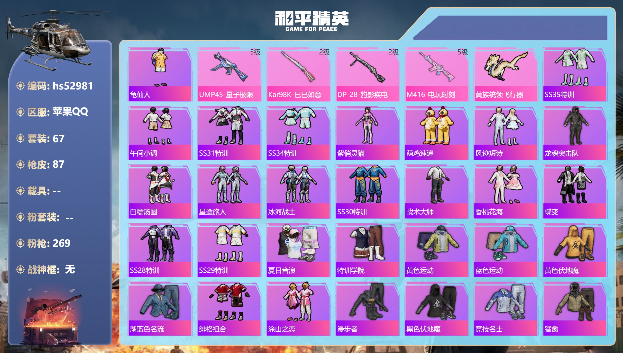 PX_2306353-,苹果手Q-4王牌印记-4特效枪-22219热力值-67套装-87枪皮 【4特效枪】Kar98K-巳巳如意/2级,M416-电玩时刻/5级,UMP45-量子极限/5级,DP-28-豹影疾电/2级 【1稀有紫装】龟仙人 【67稀有时装】SS35特训,午间小调,SS31特训,SS34特训,龟仙人,紫俏灵猫,萌鸡速递,风迹短诗,龙魂突击队,白糯汤圆,星途旅人,冰河战士,SS30特训,战术大师,香桃花海,蝶变,SS28特训,SS29特训,夏日音浪,特训学院,黄色运动,蓝色运动,黄色伏地魔,湖蓝色名流,绯格组合,涂山之恋,漫步者,黑色伏地魔,竞技名士,猛禽,长空猛禽,冷焰舞者,魅力单车,战地督导,青涩时光,牛气满满,龙腾端午,燃烧卡路里,极速红龙,完美偶像,破蛋小黄鸡,绮丽涂鸦,竞技达人朋克,野性战心,海岛探路者,破晓战魂,田园牧歌,轻风白浪,耀粉歌者,SS27特训,情公主,光之冒险,SS21特训,玉兔迎春,SS22特训,SS23特训,缤纷果语,妙红点点,幻彩翩翩,海盐绵绵冰,王牌教练,柠萌假日,粉红小猪,SS24特训,鹤鸣,绚紫流光,SS25特训 【87稀有枪械】UMP45-量子极限/5级,DBS-乌木金纹,蝎式手枪-奶油梦幻熊,蜜獾-精灵梦叶罗丽,SCAR-L-海盐豹豹,GROZA-海盐豹豹,Kar98K-巳巳如意/2级,DP-28-豹影疾电/2级,蝎式手枪-金丰海韵,Mk14-冰河战士,UZI-冰河战士,M16A4-冰河战士,MK20-H-乌木金纹,M416-电玩时刻/5级,DBS-风迹短诗,莫辛纳甘-风迹短诗,Win94-乌木金纹,MK12-风迹短诗,UZI-炫彩糖果,Mk47-风迹短诗,AKS-74U-乌木金纹,蜜獾-风迹短诗,破片手榴弹-拽到爆炸,S12K-霓彩脉冲,AKM-霓彩脉冲,M416-红色方程式,M416-糯团青竹,M416-诡夜天鹅,AKM-小鹦鹉BEBE,AKM-灼热熔岩,SCAR-L-红色方程式,SCAR-L-玉兔迎春,SCAR-L-炫彩节奏,M16A4-蓝色火焰,GROZA-田园牧歌,AUG-耀粉歌者,AUG-天降萌叽,QBZ-未来歌姬,M762-暗夜鎏金,M762-天降萌叽,Mk47-乌木金纹,Mk47-妙红点点,AC-VAL-天降萌叽,AC-VAL-乌木金纹,蜜獾-天降萌叽,Kar98K-红色方程式,M24-乌木金纹,M24-奇异狩猎者,莫辛纳甘-乌木金纹,AMR-妙红点点,SKS-炫彩节奏,VSS-田园牧歌,Mini14-耀粉歌者,Mini14-炫彩节奏,SLR-彩虹符号,UZI-红色方程式,UZI-天降萌叽,UZI-啾咪啾咪,UMP45-涂山之恋,UMP45-蓝色火焰,UMP45-生命誓言,Vector-田园牧歌,汤姆逊-耀粉歌者,汤姆逊-天降萌叽,MP5K-乌木金纹,P90-乌木金纹,S686-彩虹符号,S1897-小鹦鹉BEBE,S12K-破晓战魂,S12K-玩趣呆呆,DBS-彩虹符号,SPAS-12-田园牧歌,M249-破晓战魂,M249-妙红点点,MG3-第五大道,MG3-妙红点点,MG3-乌木金纹,平底锅-光之冒险,平底锅-田园牧歌,平底锅-妙红点点,战术弩-江南烟雨,沙漠之鹰-未来领航者,M200-乌木金纹,SCAR-L-星途旅人,破片手榴弹-星途旅人,VSS-香桃花海,Mini14-香桃花海 【2稀有飞行器】鸡智如我飞行器,黄族统领飞行器 【11稀有背包】海盐豹豹背包(3级),狂鲨锋刃背包(3级),天降萌叽背包(3级),龟仙人龟壳背包(3级),蝶变背包(3级),田园牧歌背包(3级),香桃花海背包(3级),炫蓝之夏背包(3级),未来歌姬背包(3级),冰河战士背包(3级),妙红点点背包(3级)