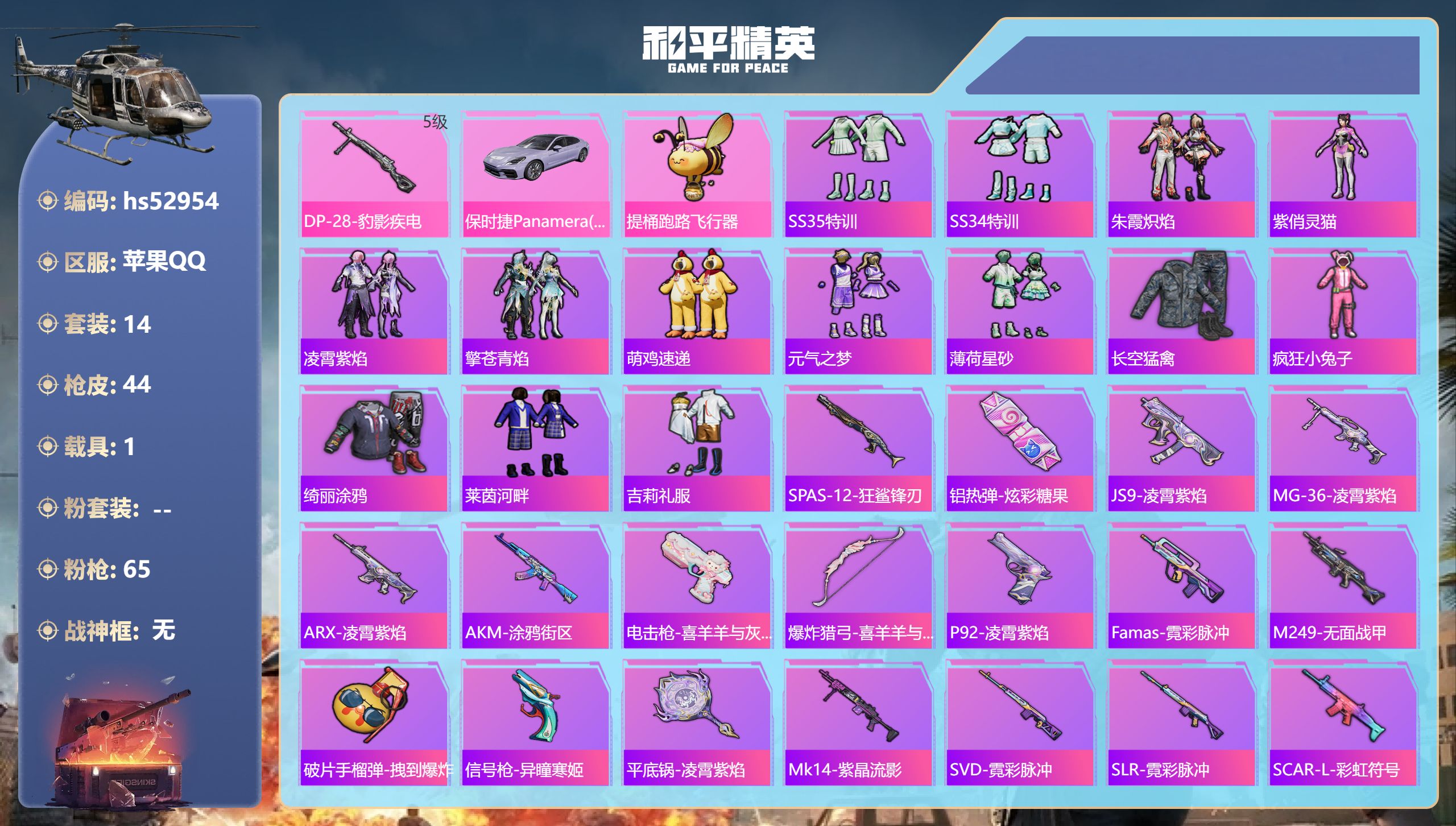 PX_2306356-,苹果手Q-0王牌印记-1特效枪-1载具-11308热力值-14套装-44枪皮 【1特效枪】DP-28-豹影疾电/5级 【1稀有载具】保时捷Panamera(星辰紫) 【14稀有时装】SS35特训,SS34特训,朱霞炽焰,紫俏灵猫,凌霄紫焰,擎苍青焰,萌鸡速递,元气之梦,薄荷星砂,长空猛禽,疯狂小兔子,绮丽涂鸦,莱茵河畔,吉莉礼服 【44稀有枪械】DP-28-豹影疾电/5级,Win94-乌木金纹,SPAS-12-狂鲨锋刃,铝热弹-炫彩糖果,JS9-凌霄紫焰,MG-36-凌霄紫焰,ARX-凌霄紫焰,AKS-74U-乌木金纹,AKM-涂鸦街区,电击枪-喜羊羊与灰太狼,爆炸猎弓-喜羊羊与灰太狼,P92-凌霄紫焰,Famas-霓彩脉冲,M249-无面战甲,破片手榴弹-拽到爆炸,信号枪-异瞳寒姬,平底锅-凌霄紫焰,Mk14-紫晶流影,SVD-霓彩脉冲,SLR-霓彩脉冲,SCAR-L-彩虹符号,AUG-紫晶流影,S12K-霓彩脉冲,AKM-霓彩脉冲,M416-糯团青竹,AKM-龙的传人,SCAR-L-玉兔迎春,SCAR-L-暗夜玫瑰,AUG-耀粉歌者,QBZ-彩虹符号,M762-天降萌叽,Kar98K-彩虹符号,AMR-乌木金纹,UZI-天降萌叽,Vector-夜灯,汤姆逊-天降萌叽,P90-乌木金纹,S686-红色方程式,DBS-第五大道,DBS-圣堂之誓,M249-彩虹符号,MG3-幻世战舞者,平底锅-空岛之星,破片手榴弹-呆爆全场 【3稀有飞行器】鸡智如我飞行器,提桶跑路飞行器,异域银装飞行器 【9稀有背包】星渊背包(3级),炫彩糖果背包(3级),凌霄紫焰背包(3级),萌鸡速递背包(3级),薄荷星砂背包(3级),第五大道背包(3级),霓虹街区背包(3级),龙的传人背包(3级),环太平洋背包(3级)