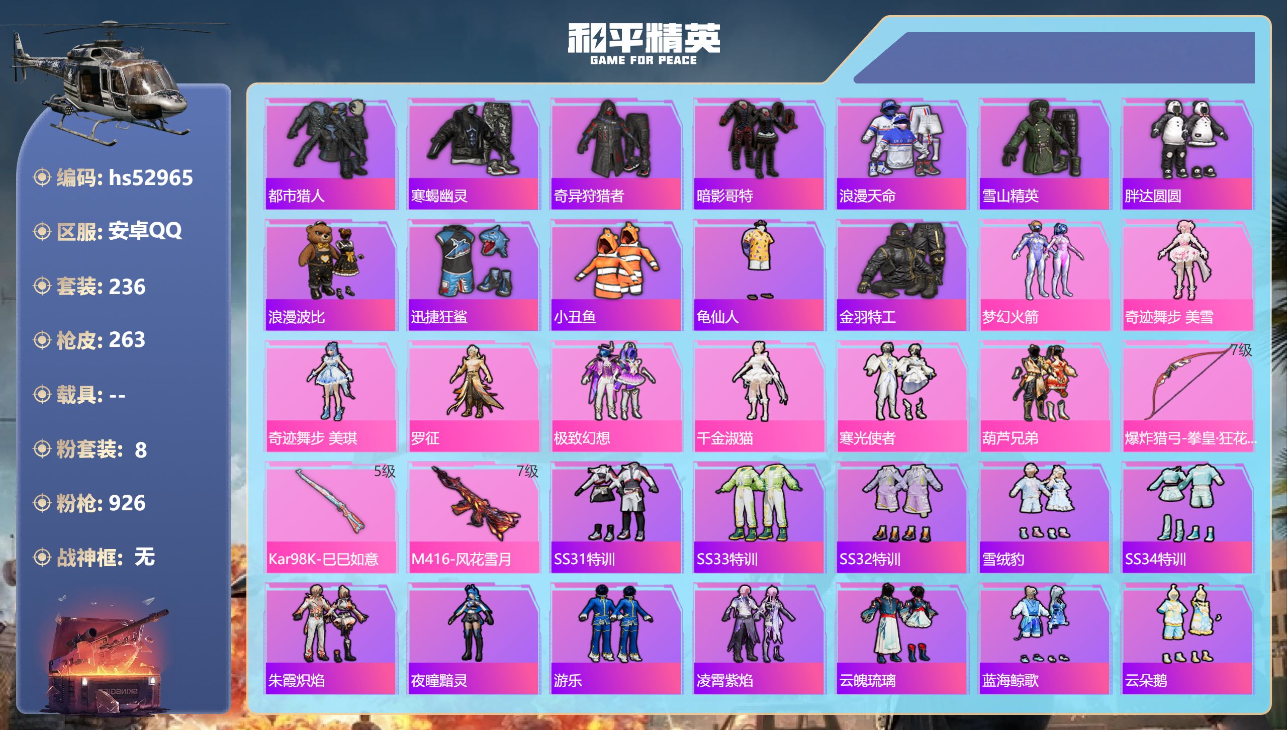 PX_2306349-,安卓手Q-10王牌印记-8粉装-3特效枪-81393热力值-236套装-263枪皮-2卓越印记-2传奇印记 【8粉装】套装-梦幻火箭,套装-葫芦兄弟,角色-奇迹舞步,美琪,套装-寒光使者,角色-罗征,角色-奇迹舞步,美雪,角色-千金淑猫,套装-极致幻想 【3特效枪】爆炸猎弓-拳皇·狂花道/7级,Kar98K-巳巳如意/5级,M416-风花雪月/7级 【12稀有紫装】都市猎人,寒蝎幽灵,奇异狩猎者,暗影哥特,浪漫天命,雪山精英,胖达圆圆,浪漫波比,迅捷狂鲨,小丑鱼,龟仙人,金羽特工 【236稀有时装】梦幻火箭,奇迹舞步,美雪,奇迹舞步,美琪,罗征,SS31特训,SS33特训,SS32特训,雪绒豹,SS34特训,朱霞炽焰,夜瞳黯灵,都市猎人,浪漫天命,寒蝎幽灵,奇异狩猎者,龟仙人,雪山精英,游乐,暗影哥特,小丑鱼,金羽特工,迅捷狂鲨,胖达圆圆,浪漫波比,凌霄紫焰,云魄琉璃,蓝海鲸歌,云朵鹅,极致幻想,千金淑猫,寒光使者,葫芦兄弟,西部牛仔,爱崽白熊,奇趣企鹅,激萌罗小黑,狂战萌兔,仓鼠灰灰,狂沙舞者,酷熊伴侣,小熊娃娃,摩登魅猫,白糯汤圆,街头风暴,星途旅人,SS30特训,青团波波,战术大师,雏菊兔兔,糖糖葫芦,香桃花海,巳巳如意,极地流光,元素星魂,迷域探索者,SS29特训,萝兰蝴蝶,SS5特训,SS16特训,云虎纪,红酒骑士,军械专家,金鼠迎春,黑色刀锋,福星高照,都市漫游者,虎虎生威吉莉,夏日音浪,龙的传人,SS8特训,众神之王,智慧之神,白熊同盟,青玉碎影,萌黄之夏,特训学院,猎鹰,青年教官,橘黑制服,红色运动,黄色运动,蓝色运动,黄色伏地魔,飞驰魅影,白色伏地魔,音速流光,热血青春,SS9特训,酒红色名流,湖蓝色名流,黄色名流,边境牛仔,绯格组合,涂山之恋,漫步者,霸义无双,黑色伏地魔,黎明保卫者,炫蓝之夏,骑行爱好者,竞技名士,深蓝色名流,猛禽,长空猛禽,竞技勇士朋克,特战装甲,战地菁英,旭日情侣,灰色格斗者,六六大吉,甜蜜告白,街头潮人,怒火燎原,冷焰舞者,惊鸿侠骨,魅力单车,灼焰舞者,青羽突袭者,夜莺强袭者,野性战魂,丛林猎人,缤纷假日,传奇侦探,极地朋克,贵族骑装,幻世战舞者,战地督导,特殊使命,特种空勤,牛气满满,萌趣咩咩,和平特警,娇憨猪猪,风暴特警,春日漫步,冰川特警,滨海假日,极速红龙,沙漠毒蛇,麻辣教官,鹰眼刺客,冰冻风暴,完美偶像,SS11特训,人气偶像,幻影武者,破蛋小黄鸡,日照花林,疯狂小兔子,圣诞大吉,暗金炫舞,北国孤狼,蓝彩潮人,SS6特训,千禧之恋,绮丽涂鸦,耀眼新星,坚韧舞者,竞技达人朋克,野性战心,原初圣火,超能勇士,逆风勇士,跃动心情,SS7特训,核芯基因,精神漫游,破晓战魂,和煦暖阳,霓虹街区,田园牧歌,都市魅力,萌趣颜团子,轻风白浪,SS10特训,特种颜团子,沙漠兵团,软萌银虎,耀粉歌者,风华少年志,探宝勇士,SS12特训,SS27特训,牛气冲天,迅捷之星,SS18特训,治愈之星,科技之星,SS13特训,飞行日记,SS17特训,瑞龙福将,团圆交子,金耀舞者,蓝调潮人,自由不朽乐队,空投萌叽,SS19特训,光之冒险,SS20特训,SS21特训,玉兔迎春,SS22特训,SS23特训,夏日倾情,甜蜜熊情侣,缤纷果语,双棍侠客,耀动青春,莱茵河畔,SS14特训,迪迦奥特曼,赛罗奥特曼,神气柴柴,灵蜜圈圈,欧布奥特曼,妙红点点,捷德奥特曼,幻彩翩翩,格斗先锋,老实芭蕉,冷血极客,吉莉礼服,海上生明月,王牌教练,荣耀,粉红小猪,SS24特训,鹤鸣,懵萌河马,SS25特训,快乐星愿,锦衣飞扬,万圣娃娃,SS15特训,深蓝冒险家 【263稀有枪械】爆炸猎弓-拳皇·狂花道/7级,Kar98K-巳巳如意/5级,野牛-雏菊兔兔,平底锅-雏菊兔兔,M762-雏菊兔兔,Mini14-雏菊兔兔,R1895-雏菊兔兔,AC-VAL-宇宙意志,MK20-H-乌木金纹,M416-风花雪月/7级,MK12-乌木金纹,M762-云朵鹅,SVD-云朵鹅,蜜獾-绯穹魔姬,M249-绯穹魔姬,SPAS-12-狂鲨锋刃,AKS-74U-黄油吐司,Mini14-绯穹魔姬,信号枪-奇迹舞步,短管霰弹-星穹咏叹调,JS9-凌霄紫焰,MG-36-凌霄紫焰,UMP45-海盐豹豹,MG3-折梦之诗,ARX-凌霄紫焰,AKS-74U-乌木金纹,P92-凌霄紫焰,Famas-乌木金纹,SPAS-12-云朵鹅,平底锅-凌霄紫焰,AKS-74U-鸡智如我,沙漠之鹰-云朵鹅,烟雾弹-冰氧夏日,大砍刀-云朵鹅,M416-红色方程式,M416-仓鼠灰灰,M416-神秘黑猫,M416-蓝色火焰,M416-夜灯,M416-糯团青竹,M416-绯红前夜,AKM-影袭,AKM-夜灯,AKM-四圣焕新,AKM-奇异狩猎者,AKM-生命誓言,AKM-乌木金纹,AKM-星之彼岸,AKM-彩虹符号,AKM-破晓战魂,AKM-龙的传人,AKM-玉龙,AKM-灼热熔岩,AKM-虎虎生威,AKM-萌趣颜团子,AKM-霓虹街区,SCAR-L-雷霆特警,SCAR-L-红色方程式,SCAR-L-玉兔迎春,SCAR-L-金风玉露,SCAR-L-炫彩节奏,SCAR-L-生命誓言,M16A4-红色方程式,M16A4-蓝色火焰,M16A4-幻世战舞者,M16A4-夜灯,GROZA-乌木金纹,GROZA-春暖花开,GROZA-黑色刀锋,GROZA-雷霆特警,GROZA-影袭,GROZA-田园牧歌,GROZA-懵萌河马,GROZA-彩虹符号,GROZA-治愈之星,AUG-乌木金纹,AUG-耀粉歌者,AUG-青春冒险家,AUG-天降萌叽,QBZ-神秘黑猫,QBZ-飞驰魅影,QBZ-赛罗,QBZ-原初圣火,QBZ-乌木金纹,QBZ-彩虹符号,M762-瑞龙福将,M762-乌木金纹,M762-绯红前夜,M762-牛气冲天,M762-奇异狩猎者,M762-第五大道,M762-天降萌叽,Mk47-乌木金纹,Mk47-妙红点点,G36C-乌木金纹,G36C-金风玉露,G36C-暗夜玫瑰,G36C-懵萌河马,AC-VAL-天降萌叽,AC-VAL-乌木金纹,蜜獾-天降萌叽,蜜獾-垂柳戏鸭,蜜獾-娇憨猪猪,Kar98K-乌木金纹,Kar98K-梦幻火箭,Kar98K-红色方程式,Kar98K-飞驰魅影,Kar98K-彩虹符号,Kar98K-影袭,Kar98K-勇闯险境,Kar98K-欢乐麻酱,Kar98K-炫彩节奏,M24-乌木金纹,M24-影袭,M24-众神之王,M24-奇异狩猎者,M24-治愈之星,AWM-天降萌叽,AWM-乌木金纹,AWM-不夜海上花,Win94-瑞龙福将,莫辛纳甘-乌木金纹,莫辛纳甘-懵萌