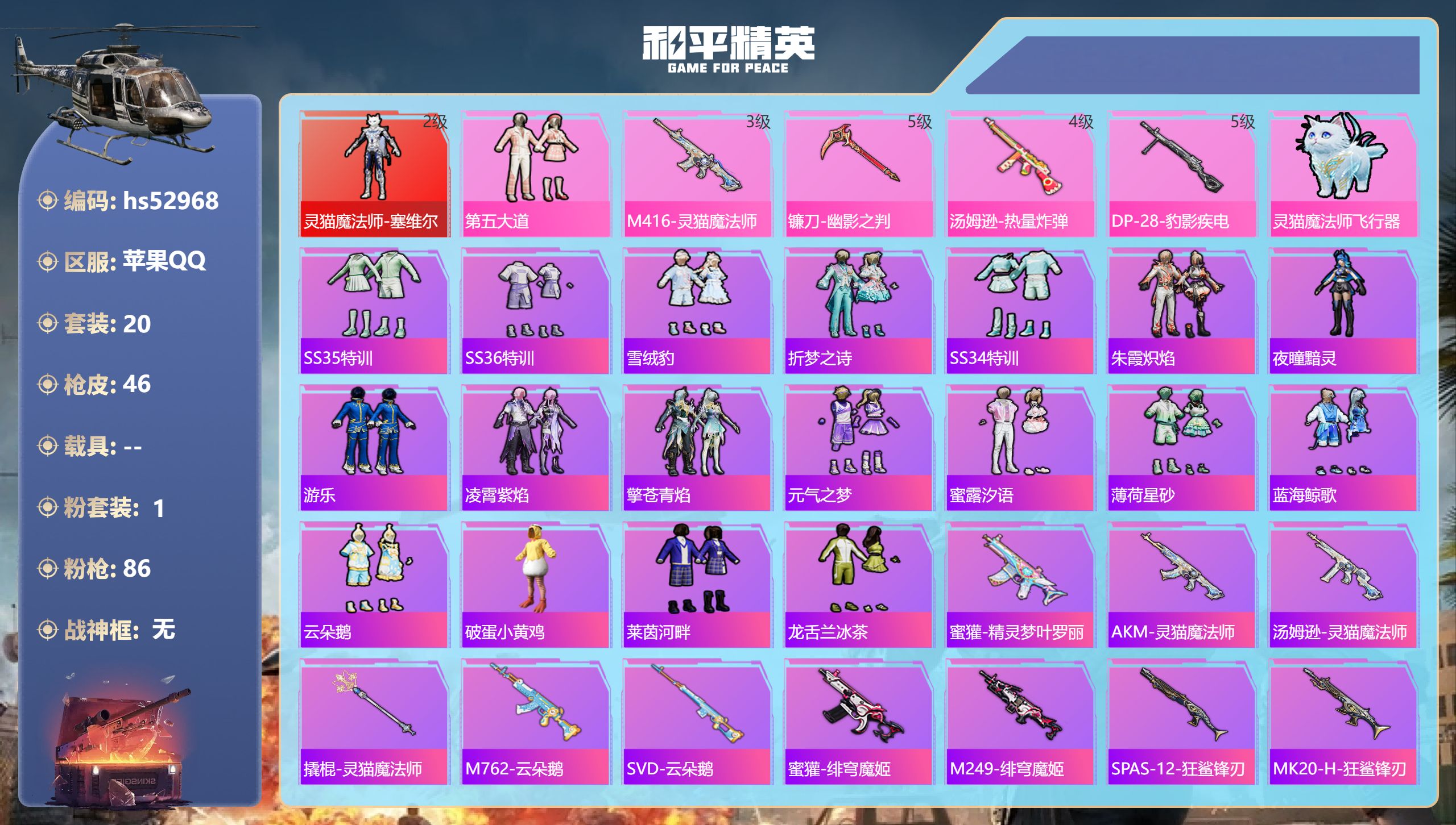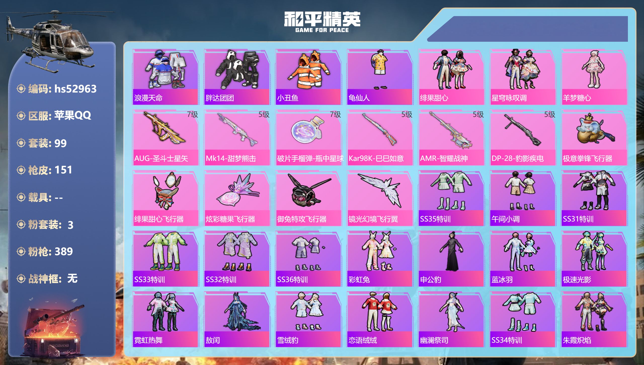 PX_2306348-,苹果手Q-5王牌印记-3粉装-6特效枪-42885热力值-99套装-151枪皮-3卓越印记-2传奇印记 【3粉装】套装-绯果甜心,角色-羊梦糖心,套装-星穹咏叹调 【6特效枪】破片手榴弹-瓶中星球/7级,DP-28-豹影疾电/5级,AUG-圣斗士星矢/7级,Mk14-甜梦熊击/5级,AMR-智耀战神/5级,Kar98K-巳巳如意/5级 【4稀有紫装】浪漫天命,胖达团团,小丑鱼,龟仙人 【99稀有时装】绯果甜心,星穹咏叹调,羊梦糖心,SS35特训,午间小调,SS31特训,SS33特训,SS32特训,SS36特训,彩虹兔,申公豹,蓝冰羽,极速光影,霓虹热舞,敖闰,雪绒豹,恋语绒绒,幽澜祭司,SS34特训,朱霞炽焰,紫幽梦,大橘大利,夜瞳黯灵,胖达团团,浪漫天命,龟仙人,游乐,小丑鱼,凌霄紫焰,粉黛兰香,无面战甲,擎苍青焰,炫彩糖果,萌鸡速递,元气之梦,风迹短诗,圣穹绘梦,薄荷星砂,粉恋花,云朵鹅,顶瓜瓜,异域银装,暗夜风云,炽纹蛇影,鱼渊荷华,燕燕于飞,战术大师,智谋强哥,巳巳如意,SS28特训,夏日音浪,蝶吟花词,猎鹰,蓝色运动,湖蓝色名流,绯格组合,SS26特训,黑色伏地魔,骑行爱好者,竞技名士,猛禽,长空猛禽,特战装甲,旭日情侣,六六大吉,魅力单车,幻世战舞者,青涩时光,冰冻风暴,幻影武者,破蛋小黄鸡,绮丽涂鸦,耀眼新星,竞技达人朋克,海岛探路者,破晓战魂,霓虹街区,SS27特训,SS18特训,飞行日记,SS17特训,缤纷焰火,异彩先驱,霓虹极客,空投萌叽,SS19特训,SS20特训,SS21特训,玉兔迎春,SS22特训,SS23特训,夏日倾情,缤纷果语,香榭午后,海盐绵绵冰,王牌教练,荣耀,SS24特训,SS25特训 【151稀有枪械】DBS-乌木金纹,SCAR-L-海盐豹豹,AUG-圣斗士星矢/7级,Mk14-甜梦熊击/5级,破片手榴弹-瓶中星球/7级,Kar98K-巳巳如意/5级,AMR-智耀战神/5级,DP-28-豹影疾电/5级,DBS-风迹短诗,莫辛纳甘-风迹短诗,Mini14-鸡智如我,AKM-绿洲时空,GROZA-无面战甲,Win94-乌木金纹,MK12-风迹短诗,野牛-魔童闹海,敖闰,SVD-冷漠罗丽,破片手榴弹-绯果甜心,PKM-紫幽梦,MG3-霓彩脉冲,DBS-幻彩电音,R45-幻彩电音,Mk14-紫幽梦,M24-幻彩电音,蜜獾-乌木金纹,M762-云朵鹅,S1897-紫幽梦,SVD-云朵鹅,P92-紫幽梦,SPAS-12-狂鲨锋刃,M417-玩趣呆呆,MK20-H-狂鲨锋刃,燃点复合弓-幻海仙踪,AUG-冰晶雪宝,铝热弹-炫彩糖果,UZI-炫彩糖果,M416-萌萌史莱姆,M249-萌萌史莱姆,Kar98K-星穹咏叹调,Mk47-风迹短诗,JS9-凌霄紫焰,MG-36-凌霄紫焰,平底锅-紫幽梦,燃烧瓶-甜梦桃焰,破片手榴弹-海盐豹豹,UMP45-海盐豹豹,ARX-凌霄紫焰,AKS-74U-乌木金纹,AKM-涂鸦街区,蜜獾-风迹短诗,P92-凌霄紫焰,Famas-乌木金纹,Famas-霓彩脉冲,SPAS-12-云朵鹅,M249-无面战甲,破片手榴弹-拽到爆炸,Mini14-辉羽雀灵,S1897-糯团青竹,平底锅-凌霄紫焰,Mk14-薄荷星砂,AKS-74U-鸡智如我,汤姆逊-智耀战神,S12K-智耀战神,沙漠之鹰-云朵鹅,烟雾弹-冰氧夏日,MG3-智耀战神,Mk14-紫晶流影,大砍刀-云朵鹅,PKM-啾咪啾咪,SLR-圣穹绘梦,UMP45-圣穹绘梦,沙漠之鹰-圣穹绘梦,SVD-霓彩脉冲,SLR-霓彩脉冲,平底锅-属我最6,SCAR-L-彩虹符号,蜜獾-绿洲时空,P1911-无面战甲,蜜獾-鸡智如我,AUG-紫晶流影,S12K-霓彩脉冲,M416-魔童闹海,敖闰,AMR-鸡智如我,AKM-霓彩脉冲,M416-夜灯,AKM-彩虹符号,AKM-虎虎生威,AKM-霓虹街区,SCAR-L-红色方程式,SCAR-L-玉兔迎春,M16A4-幻世战舞者,GROZA-异彩先驱,AUG-耀粉歌者,AUG-天降萌叽,QBZ-彩虹符号,M762-风花雪月,M762-甜心宝贝,Mk47-乌木金纹,G36C-乌木金纹,AC-VAL-天降萌叽,AC-VAL-乌木金纹,蜜獾-天降萌叽,M24-乌木金纹,莫辛纳甘-乌木金纹,AMR-乌木金纹,SKS-迅猛狂鲨,Mini14-涂山之恋,Mini14-异彩先驱,Mk14-乌木金纹,UZI-红色方程式,UZI-天降萌叽,UMP45-蓝色火焰,UMP45-春暖花开,Vector-彩虹符号,汤姆逊-异彩先驱,汤姆逊-炫彩节奏,野牛-乌木金纹,MP5K-异彩先驱,MP5K-乌木金纹,P90-乌木金纹,P90-玩趣呆呆,S686-红色方程式,S686-生命誓言,S12K-破晓战魂,S12K-玩趣呆呆,DBS-彩虹符号,M249-破晓战魂,M249-彩虹符号,M249-糯团青竹,MG3-幻世战舞者,平底锅-空岛之星,平底锅-空投萌叽,平底锅-异彩先驱,蝎式手枪-千金淑猫,烟雾弹-炽纹蛇影,M16A4-千金淑猫,S686-千金淑猫,AUG-异域银装,撬棍-炽纹蛇影,野牛-燕燕于飞,M200-乌木金纹,SPAS-12-燕燕于飞,蝎式手枪-燕燕于飞,十字弩-异域银装,S686-巳巳如意,SPAS-12-乌木金纹,Vector-燕燕于飞,十字弩-燕燕于飞,P90-巳巳如意,破片手榴弹-炽纹蛇影,破片手榴弹-巳巳如意 【9稀有飞行器】极意拳锋飞行器,绯果甜心飞行器,狂鲨锋刃飞行器,鸡智如我飞行器,炫彩糖果飞行器,御兔特攻飞行器,破刃行动尾迹,异域银装飞行器,镜光幻境飞行翼 【23稀有背包】幻彩电音背包(3级),绯果甜心背包(3级),狂鲨锋刃背包(3级),星穹咏叹调背包(3级),炫彩糖果背包(3级),凌霄紫焰背包(3级),粉黛兰香背包(3级),智耀战神背包(3级),无面战甲背包(3级),紫幽梦背包(3级),萌鸡速递背包(3级),薄荷星砂背包(3级),风迹短诗背包(3级),巳巳如意背包(3级),云朵鹅背包(3级),繁龙极客背包(3级),龟仙人龟壳背包(3级),异域银装背包(3级),星之彼岸背包(3级),齐天大圣背包(3级),智谋强哥背包(3级),玉兔迎春背包(3级),异彩先驱背包(3级)