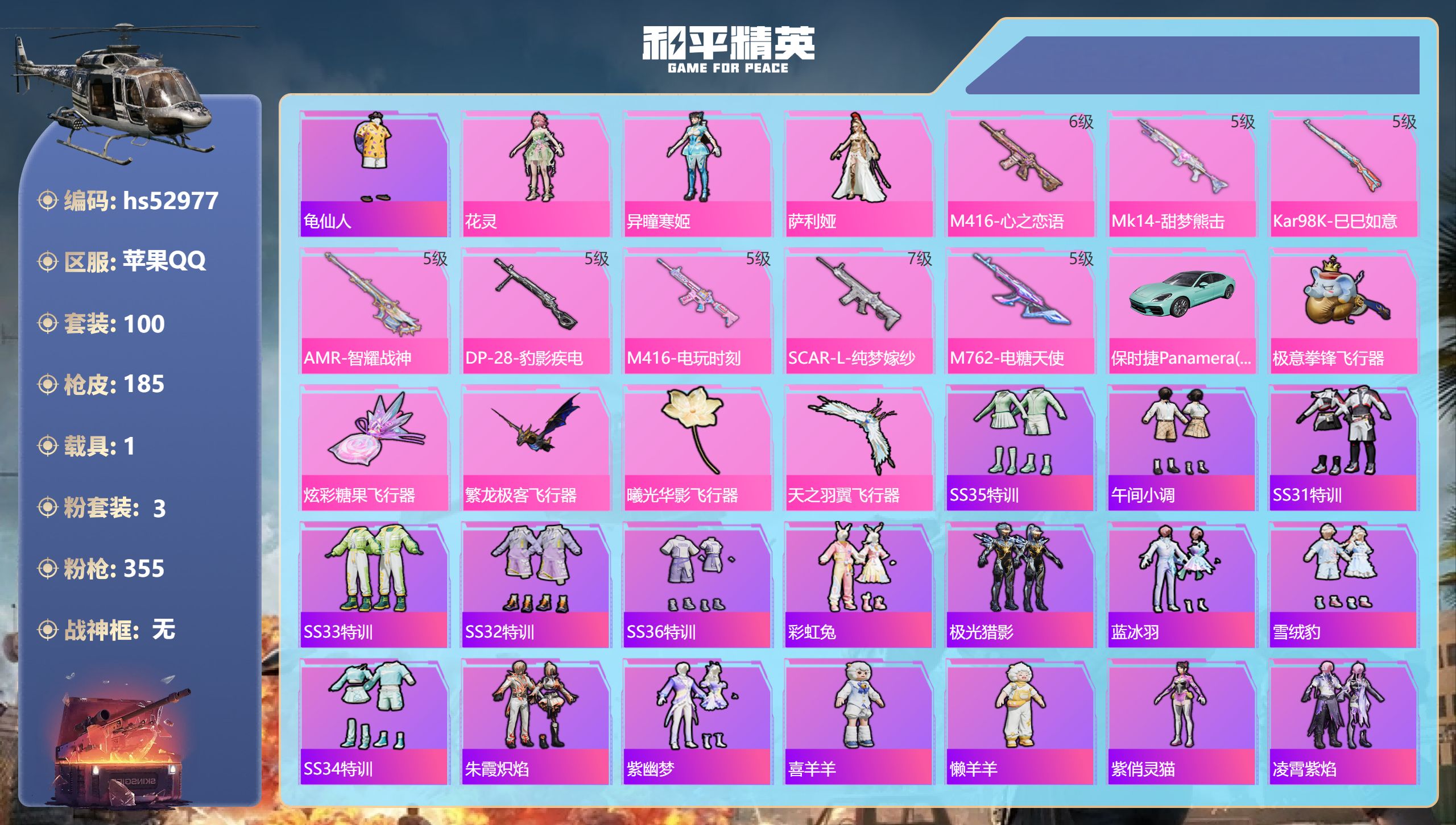 PX_2306347-,苹果手Q-15王牌印记-3粉装-8特效枪-1载具-57702热力值-100套装-185枪皮-2卓越印记-1传奇印记 【3粉装】角色-异瞳寒姬,角色-萨利娅,角色-花灵 【8特效枪】M762-电糖天使/5级,Kar98K-巳巳如意/5级,DP-28-豹影疾电/5级,M416-心之恋语/6级,SCAR-L-纯梦嫁纱/7级,M416-电玩时刻/5级,Mk14-甜梦熊击/5级,AMR-智耀战神/5级 【1稀有紫装】龟仙人 【1稀有载具】保时捷Panamera(梦幻青) 【100稀有时装】花灵,异瞳寒姬,SS35特训,午间小调,SS31特训,SS33特训,SS32特训,SS36特训,彩虹兔,极光猎影,蓝冰羽,雪绒豹,SS34特训,朱霞炽焰,紫幽梦,喜羊羊,龟仙人,懒羊羊,紫俏灵猫,凌霄紫焰,擎苍青焰,炫彩糖果,绯色魅影,萌鸡速递,元气之梦,风迹短诗,圣穹绘梦,秘语星愿,蓝海鲸歌,云朵鹅,顶瓜瓜,萨利娅,龙魂突击队,卖崽青蛙,小熊娃娃,异域银装,火种守卫者,星途旅人,冰河战士,SS30特训,青团波波,战术大师,雏菊兔兔,糖糖葫芦,蝶变,湖畔霞光,曼妙人鱼,棉花软糖,元素星魂,SS28特训,SS29特训,萝兰蝴蝶,贝斯之夜,焰鹰斗篷,豚鼠丹丹,都市漫游者,龙的传人,白色伏地魔,冰川格斗者,绯格组合,涂山之恋,SS26特训,空岛之星,热情海星,纯真浪花,竞技名士,长空猛禽,旭日情侣,街头潮人,魅力单车,春光漫游,幻世战舞者,青涩时光,幽夜迷踪,疯狂小兔子,快闪甜心,海岛探路者,破晓战魂,探宝勇士,SS27特训,牛气冲天,情公主,竞技角斗士,SS19特训,光之冒险,SS20特训,SS21特训,玉兔迎春,SS22特训,夏日倾情,缤纷果语,滨海厨神,神气柴柴,幻羽潜行,海盐绵绵冰,老实芭蕉,吉莉礼服,SS24特训,懵萌河马,SS25特训 【184稀有枪械】M416-心之恋语/6级,QBZ-纯真浪花,AWM-纯真浪花,汤姆逊-纯真浪花,DBS-乌木金纹,AA12-G-纯真浪花,平底锅-纯真浪花,Famas-墨龙九天,SLR-墨龙九天,汤姆逊-星梦奇缘,蜜獾-精灵梦叶罗丽,S1897-精灵梦叶罗丽,SCAR-L-海盐豹豹,平底锅-精灵梦叶罗丽,GROZA-海盐豹豹,TMP-9-霓彩节奏,Mk14-甜梦熊击/5级,Kar98K-巳巳如意/5级,AMR-智耀战神/5级,DP-28-豹影疾电/5级,野牛-雏菊兔兔,Mk14-冰河战士,平底锅-雏菊兔兔,M762-雏菊兔兔,Mini14-雏菊兔兔,R1895-雏菊兔兔,莫辛纳甘-兔兔小魔女,UZI-冰河战士,M16A4-冰河战士,MK20-H-乌木金纹,M416-电玩时刻/5级,SCAR-L-纯梦嫁纱/7级,M762-电糖天使/5级,DBS-风迹短诗,莫辛纳甘-风迹短诗,Win94-乌木金纹,MK12-风迹短诗,MK12-乌木金纹,破片手榴弹-爆破雪人,PKM-紫幽梦,MG3-霓彩脉冲,DBS-幻彩电音,Mk14-紫幽梦,蜜獾-乌木金纹,M762-云朵鹅,S1897-紫幽梦,SVD-云朵鹅,P92-紫幽梦,SPAS-12-狂鲨锋刃,M417-玩趣呆呆,MK20-H-狂鲨锋刃,突击盾牌-绝对恒星,铝热弹-炫彩糖果,UZI-炫彩糖果,Mk47-风迹短诗,JS9-凌霄紫焰,MG-36-凌霄紫焰,平底锅-紫幽梦,UMP45-海盐豹豹,ARX-凌霄紫焰,AKS-74U-乌木金纹,电击枪-喜羊羊与灰太狼,蜜獾-风迹短诗,爆炸猎弓-喜羊羊与灰太狼,P92-凌霄紫焰,Famas-乌木金纹,Famas-霓彩脉冲,SPAS-12-云朵鹅,M249-无面战甲,破片手榴弹-拽到爆炸,十字弩-异瞳寒姬,S1897-糯团青竹,信号枪-异瞳寒姬,平底锅-凌霄紫焰,AKS-74U-鸡智如我,汤姆逊-智耀战神,沙漠之鹰-云朵鹅,烟雾弹-冰氧夏日,Mk14-紫晶流影,大砍刀-云朵鹅,PKM-啾咪啾咪,沙漠之鹰-圣穹绘梦,SVD-霓彩脉冲,SLR-霓彩脉冲,SCAR-L-彩虹符号,S12K-霓彩脉冲,AKM-霓彩脉冲,M416-红色方程式,M416-蓝色火焰,M416-糯团青竹,AKM-破晓战魂,AKM-龙的传人,AKM-霓虹街区,SCAR-L-红色方程式,SCAR-L-玉兔迎春,SCAR-L-夜灯,SCAR-L-炫彩节奏,M16A4-蓝色火焰,M16A4-幻世战舞者,GROZA-懵萌河马,AUG-耀粉歌者,M762-甜心宝贝,Mk47-乌木金纹,G36C-懵萌河马,AC-VAL-天降萌叽,AC-VAL-快闪甜心,AC-VAL-乌木金纹,蜜獾-白蛇盈舞,蜜獾-天降萌叽,M24-乌木金纹,M24-炫彩节奏,AWM-焰鹰斗篷,莫辛纳甘-懵萌河马,AMR-乌木金纹,AMR-镜光幻境,SKS-霓虹漫游,SKS-炫彩节奏,VSS-彩虹符号,Mini14-炫彩节奏,Mk14-乌木金纹,MK20-H-快闪甜心,UZI-红色方程式,UZI-天降萌叽,UZI-啾咪啾咪,UMP45-蓝色火焰,UMP45-生命誓言,UMP45-夜灯,Vector-生命誓言,Vector-银河战甲,Vector-焰鹰斗篷,汤姆逊-天降萌叽,MP5K-乌木金纹,P90-乌木金纹,P90-快闪甜心,P90-玩趣呆呆,S686-红色方程式,S686-生命誓言,S1897-炫彩节奏,S12K-破晓战魂,S12K-玩趣呆呆,S12K-幻世战舞者,S12K-夜灯,DBS-焰鹰斗篷,DBS-彩虹符号,DBS-圣堂之誓,M249-破晓战魂,M249-彩虹符号,M249-糯团青竹,DP-28-焰鹰斗篷,MG3-第五大道,MG3-幻世战舞者,MG3-乌木金纹,PKM-懵萌河马,沙漠之鹰-快闪甜心,平底锅-空岛之星,平底锅-懵萌河马,平底锅-快闪甜心,平底锅-焰鹰斗篷,撬棍-Alan,Walker潮音版,撬棍-甜心宝贝,撬棍-幻世战舞者,破片手榴弹-呆爆全场,AC-VAL-冠军兔兔,Kar98K-顶峰精英,沙漠之鹰-未来领航者,Win94-拳皇·狂花道,R45-拳皇·狂花道,AA12-G-精灵之光,AUG-异域银装,MK20-H-糖糖葫芦,MK20-H-星途旅人,M200-乌木金纹,十字弩-异域银装,SCAR-L-星途旅人,蜜獾-糖糖葫芦,UMP45-糖糖葫芦,SPAS-12-乌木金纹,平底锅-糖糖葫芦,破片手榴弹-星途旅人,P18C-糖糖葫芦,VSS-香桃花海,Mini14-香桃花海,P90-巳巳如意,破片手榴弹-巳巳如意 【10稀有飞行器】极意拳锋飞行器,狂鲨锋刃飞行器,鸡智如我飞行器,炫彩糖果飞行器,登顶巅峰飞行器,空岛之星尾迹,繁龙极客飞行器,曦光华影飞行器,天之羽翼飞行器,异域银装飞行器 【36稀有背包】海盐豹豹背包(3级),纯真浪花背包(3级),墨龙九天背包(3级),精灵梦叶罗丽背包(3级),懵萌河马背包(3级),暗夜玫瑰背包(3级),狂鲨锋刃背包(3级),绝对恒星背包(3级),炫彩糖果背包(3级),异瞳寒姬背包(3级),凌霄紫焰背包(3级),紫幽梦