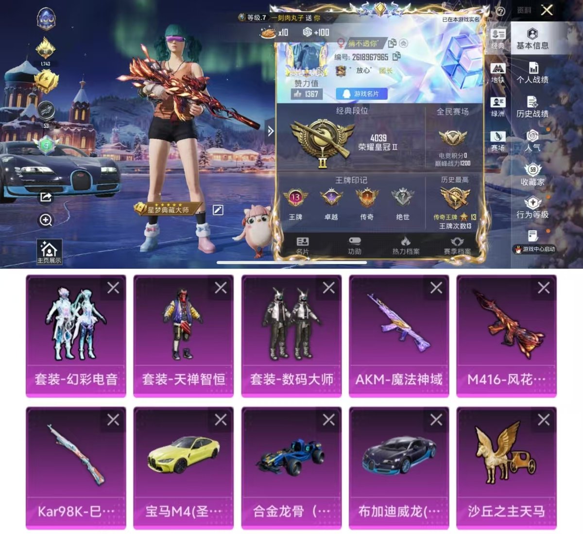 PX_2295951-实名:,可修改,时装数:,487,载具数:,3,枪械数:,170,战备数:,134,热门装扮:,数码大师,深海小丑鱼,天禅智恒,幻彩电音,载具:,合金龙骨(蓝),布加迪威龙(海洋蓝),宝马M4(圣保罗黄),稀有枪皮:,M416风花雪月,AKM魔法神域,Kar98K-巳巳如意