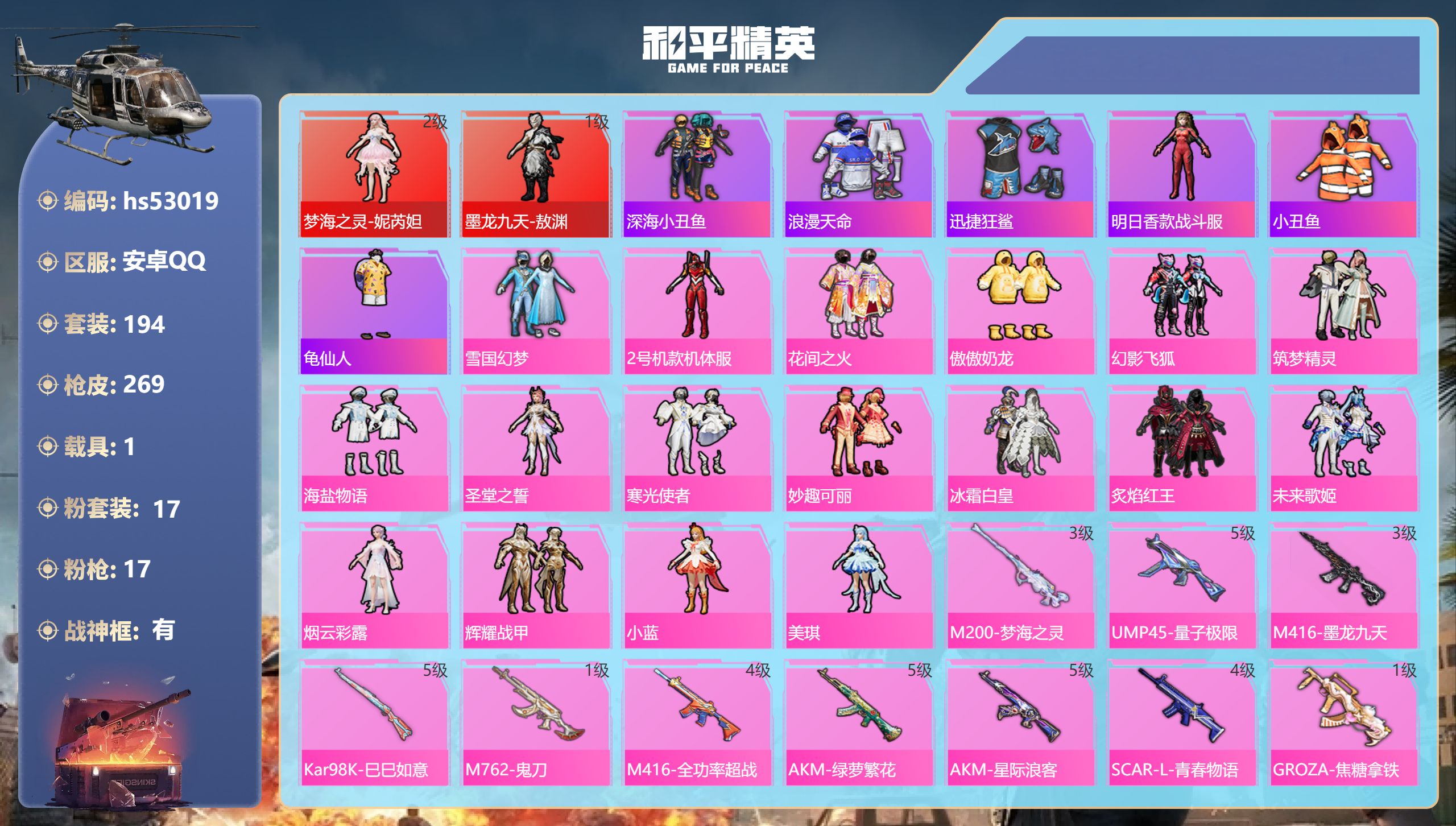 PX_2306778-,安卓手Q-14王牌印记-有战神框-2红装-17粉装-17特效枪-1载具-95511热力值-194套装-269枪皮-1卓越印记 【2红装】梦海之灵-妮芮妲/2级,墨龙九天-敖渊/1级 【17粉装】套装-妙趣可丽,套装-幻影飞狐,角色-圣堂之誓,角色-2号机款机体服,角色-小蓝,套装-雪国幻梦,套装-炙焰红王,套装-寒光使者,套装-花间之火,套装-冰霜白皇,角色-烟云彩露,套装-未来歌姬,套装-傲傲奶龙,套装-辉耀战甲,角色-美琪,套装-海盐物语,套装-筑梦精灵 【17特效枪】M416-全功率超战/4级,AMR-鸢尾晶梦/5级,蜜獾-辉耀战甲/4级,GROZA-巴啦啦小魔仙/5级,M200-梦海之灵/3级,SCAR-L-青春物语/4级,M762-电糖天使/4级,UMP45-量子极限/5级,P90-能量风暴/5级,GROZA-焦糖拿铁/1级,AKM-绿萝繁花/5级,M762-鬼刀/1级,M416-墨龙九天/3级,AKM-星际浪客/5级,AUG-妙趣可丽/5级,PKM-江南烟雨/3级,Kar98K-巳巳如意/5级 【6稀有紫装】深海小丑鱼,浪漫天命,迅捷狂鲨,明日香款战斗服,小丑鱼,龟仙人 【1稀有载具】路特斯ELETRE(冰川蓝) 【194稀有时装】雪国幻梦,2号机款机体服,花间之火,妮芮妲/2级,敖渊/1级,SS35特训,SS31特训,SS33特训,SS36特训,雪绒豹,SS34特训,浪漫天命,龟仙人,深海小丑鱼,小丑鱼,迅捷狂鲨,明日香款战斗服,炫彩糖果,傲傲奶龙,幻影飞狐,,暗影刺翼,筑梦精灵,海盐物语,圣堂之誓,寒光使者,妙趣可丽,冰霜白皇,炙焰红王,未来歌姬,烟云彩露,辉耀战甲,小蓝,美琪,狂沙舞者,卖崽青蛙,小熊娃娃,都市丽猫,摩登魅猫,白糯汤圆,街头风暴,星途旅人,鱼渊荷华,裁决天象,SS30特训,青团波波,燕燕于飞,战术大师,智谋强哥,雏菊兔兔,糖糖葫芦,晶辉守护,巳巳如意,曼妙人鱼,棉花软糖,SS28特训,白光莹,银尘,SS29特训,萝兰蝴蝶,SS16特训,华灯初上,暴风机械师,时空追击者,牛仔情诗,焰鹰斗篷,暗夜傀儡,忠义严颜,水晶王族,迎夏光舞,湖雨初晴,福星高照,虎虎生威吉莉,夏日音浪,龙的传人,萌黄之夏,蝶吟花词,萌趣绒叽,猎鹰,橘黑制服,红色运动,黄色运动,浓情蜜辣,蓝色运动,极速竞梦,雪晶战甲,飞驰魅影,白色伏地魔,音速流光,湖蓝色名流,黄色名流,绯格组合,SS26特训,沙漠雄狮,漫步者,热情海星,炫蓝之夏,纯真浪花,竞技名士,蓝色守护者,猛禽,长空猛禽,特战装甲,灰色格斗者,惊鸿侠骨,魅力单车,云霞荷露,春光漫游,AG战队服,野性战魂,甜心亚梦,虚音幻奏,极地朋克,贵族骑装,幻世战舞者,特殊使命,醇脆可可,香草威化,牛气满满,风暴特警,冰川特警,月华战甲,龙腾端午,燃烧卡路里,麻辣教官,鹰眼刺客,冰冻风暴,完美偶像,人气偶像,怪笑疯兔,幽夜迷踪,青春冒险家,破蛋小黄鸡,潮流游乐家,疯狂小兔子,玄武圣者,快闪甜心,白虎圣者,野性战心,原初圣火,逆风勇士,海岛探路者,精神漫游,和煦暖阳,霓虹街区,田园牧歌,萌趣颜团子,轻风白浪,特种颜团子,耀粉歌者,水手小飞鸭,探宝勇士,SS12特训,SS27特训,情公主,SS18特训,治愈之星,科技之星,SS13特训,飞行日记,SS17特训,瑞龙福将,团圆交子,金耀舞者,蓝调潮人,绚烂繁星,光影梦想家,金戈铁马,SS19特训,光之冒险,晨曦薄雾,SS20特训,玉兔迎春,弄潮海豚,深海梦境,SS22特训,SS23特训,呆萌铁蟹,冰爽海盐,滨海厨神,香榭午后,SS14特训,妙红点点,幻彩翩翩,格斗先锋,幻羽潜行,海盐绵绵冰,吉莉礼服,王牌教练,柠萌假日,粉红小猪,SS25特训,锦衣飞扬,SS15特训,幽幻花璃 【269稀有枪械】M200-梦海之灵/3级,MG3-梦海之灵,AC-VAL-梦海之灵,UZI-梦海之灵,M249-萌萌彩虹球,平底锅-萌萌彩虹球,UMP45-量子极限/5级,QBZ-纯真浪花,AWM-纯真浪花,汤姆逊-纯真浪花,DBS-乌木金纹,AA12-G-纯真浪花,平底锅-纯真浪花,P1911-创世·救赎,M416-墨龙九天/3级,Famas-墨龙九天,AMR-墨龙九天,SLR-墨龙九天,烟雾弹-鸢尾晶梦,QBZ-萌萌彩虹球,蜜獾-精灵梦叶罗丽,S1897-精灵梦叶罗丽,SCAR-L-海盐豹豹,平底锅-精灵梦叶罗丽,GROZA-海盐豹豹,Kar98K-巳巳如意/5级,M762-鬼刀/1级,野牛-雏菊兔兔,平底锅-雏菊兔兔,M762-雏菊兔兔,Mini14-雏菊兔兔,R1895-雏菊兔兔,MK20-H-乌木金纹,M416-全功率超战/4级,AKM-绿萝繁花/5级,AKM-星际浪客/5级,SCAR-L-青春物语/4级,GROZA-焦糖拿铁/1级,GROZA-巴啦啦小魔仙/5级,AUG-妙趣可丽/5级,M762-电糖天使/4级,蜜獾-辉耀战甲/4级,AMR-鸢尾晶梦/5级,P90-能量风暴/5级,PKM-江南烟雨/3级,Win94-乌木金纹,MK12-乌木金纹,破片手榴弹-爆破雪人,M762-云朵鹅,SVD-云朵鹅,AWM-绿洲时空,SPAS-12-狂鲨锋刃,AUG-冰晶雪宝,铝热弹-炫彩糖果,UZI-炫彩糖果,Famas-乌木金纹,SPAS-12-云朵鹅,PKM-啾咪啾咪,M416-蓝色火焰,M416-糯团青竹,M416-绯红前夜,AKM-筑梦精灵,AKM-影袭,AKM-夜灯,AKM-四圣焕新,AKM-奇异狩猎者,AKM-彩虹符号,AKM-缤纷海域,AKM-破晓战魂,AKM-江南烟雨,AKM-龙的传人,AKM-灼热熔岩,AKM-虎虎生威,AKM-萌趣颜团子,SCAR-L-红色方程式,SCAR-L-炫彩节奏,M16A4-幻世战舞者,M16A4-甜心亚梦,GROZA-影袭,GROZA-田园牧歌,GROZA-彩虹符号,GROZA-治愈之星,GROZA-2B战斗服款,AUG-耀粉歌者,AUG-辉耀战甲,AUG-怪笑疯兔,AUG-圣光天使,AUG-青春冒险家,QBZ-飞驰魅影,QBZ-妙趣可丽,QBZ-洛神天依,QBZ-原初圣火,QBZ-彩虹符号,M762-瑞龙福将,M762-牛气冲天,M762-奇异狩猎者,M762-潮萌小黄鸭,M762-天降萌叽,Mk47-百万伏特,Mk47-妙红点点,Mk47-青春冒险家,G36C-镜域双华,G36C-乌木金纹,G36C-时空追击者,G36C-六号树人,AC-VAL-闲梦青缨,AC-VAL-快闪甜心,AC-VAL-甜心亚梦,蜜獾-天降萌叽,Famas-镜域双华,Kar98K-乌木金纹,Kar98K-飞驰魅影,Kar98K-彩虹符号,Kar98K-欢乐麻酱,Kar98K-炫彩节奏,M24-乌木金纹,M24-妙趣可丽,M24-影袭,M24-奇异狩猎者,M24-治