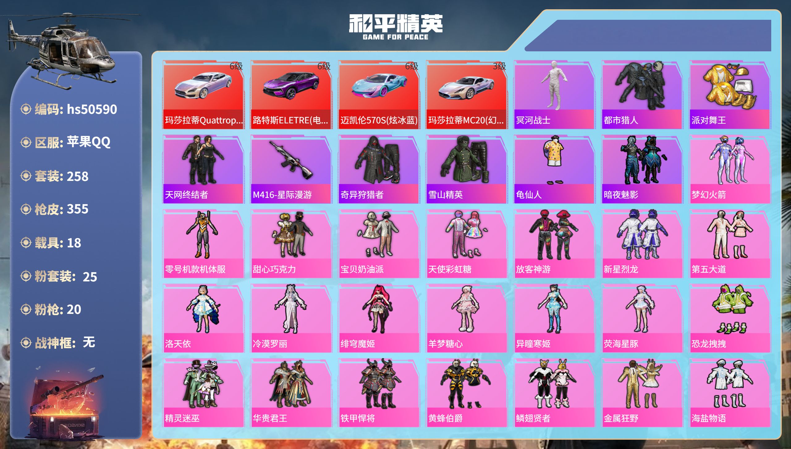 PX_2306760-,苹果手Q-8王牌印记-25粉装-20特效枪-18载具-热力值-258套装-355枪皮-3卓越印记-2传奇印记 【25粉装】角色-零号机款机体服,套装-金属狂野,套装-鳞翅贤者,套装-星点战士,角色-羊梦糖心,套装-黄蜂伯爵,套装-甜心巧克力,角色-冷漠罗丽,套装-放客神游,角色-绯穹魔姬,角色-荧海星豚,套装-梦幻火箭,角色-异瞳寒姬,角色-洛天依,套装-迷蝶贵族,套装-恐龙拽拽,套装-海盐物语,套装-第五大道,套装-天使彩虹糖,套装-俏皮狐尾,套装-精灵迷巫,套装-华贵君王,套装-新星烈龙,套装-铁甲悍将,套装-宝贝奶油派 【20特效枪】平底锅-喜羊羊与灰太狼/1级,M762-甜蜜誓约/4级,蜜獾-荧海星豚/3级,JS9-奇迹舞步/2级,SCAR-L-梦幻火箭/7级,Vector-绯穹魔姬/4级,破片手榴弹-热量炸弹/7级,AMR-鸢尾晶梦/4级,M416-心之恋语/5级,P90-甜蜜草莓/1级,UMP45-恐龙拽拽/1级,Mini14-荧光虫舞/4级,GROZA-无垠阁/3级,AUG-星梦奇缘/3级,SKS-诡面斩/5级,MG3-洛神天依/1级,DP-28-豹影疾电/5级,Kar98K-巳巳如意/5级,AKM-炫紫旋律/1级,AKM-甜心宝贝/5级 【9稀有紫装】冥河战士,都市猎人,派对舞王,天网终结者,M416-星际漫游,奇异狩猎者,雪山精英,龟仙人,暗夜魅影 【18稀有载具】保时捷911,敞篷版(星珀红),保时捷Taycan,旅行版(冰莓粉),玛莎拉蒂Quattroporte(幻星粉)/6级,路特斯ELETRE(电光紫)/6级,迈凯伦570S(炫冰蓝)/6级,玛莎拉蒂MC20(幻星粉)/3级,阿斯顿·马丁DBS(金),特斯拉Model,3(珍珠白),阿斯顿·马丁DBS(红),宝马M4(圣保罗黄),阿斯顿·马丁DBX(金),阿斯顿·马丁DBX(橙),阿斯顿·马丁DBX(蓝),兰博基尼Aventador,SVJ(翡翠绿),护世瑞兽,星梦玉骢,双人摩托-双刃魅影(金),双人摩托-梦幻火箭 【1僚机】空客H135-蔚蓝之翼 【258稀有时装】梦幻火箭,零号机款机体服,甜心巧克力,宝贝奶油派,天使彩虹糖,放客神游,新星烈龙,第五大道,洛天依,冷漠罗丽,绯穹魔姬,羊梦糖心,异瞳寒姬,荧海星豚,SS35特训,午间小调,SS31特训,SS33特训,SS32特训,银色战姬,蓝冰羽,雪绒豹,恋语绒绒,SS34特训,朱霞炽焰,紫幽梦,大橘大利,夜瞳黯灵,六号稻草人,绛羽幽主,喜羊羊,都市猎人,暗夜魅影,奇异狩猎者,龟仙人,雪山精英,懒羊羊,美羊羊,凌霄紫焰,云魄琉璃,擎苍青焰,炫彩糖果,绯色魅影,萌鸡速递,风迹短诗,蜜露汐语,薄荷星砂,秘语星愿,蓝海鲸歌,云朵鹅,冥河战士,派对舞王,天网终结者,恐龙拽拽,精灵迷巫,华贵君王,铁甲悍将,黄蜂伯爵,鳞翅贤者,金属狂野,海盐物语,迷蝶贵族,星点战士,俏皮狐尾,潮萌小黄鸭,粉雾星云,异域银装,蓝调潮影,暗夜风云,纯白跃动,白糯汤圆,鱼渊荷华,SS30特训,燕燕于飞,战术大师,智谋强哥,小狗蛇点点,巳巳如意,镭金极速,极地流光,元素星魂,迷域探索者,机械英豪,机械征服者,SS16特训,暴风机械师,时空追击者,蔷薇魔法师,黑色刀锋,银河圣歌,闪耀星光,福星高照,暗夜契约,纯白誓言,豚鼠丹丹,雪兔飞飞,夏日音浪,龙的传人,军刀雅典娜,SS8特训,众神之王,智慧之神,果汁能量,白熊同盟,青玉碎影,萌黄之夏,影双刃,摇滚狂鲨,特训学院,蓝色运动,黄色伏地魔,白色伏地魔,SS9特训,白月香洋装,湖蓝色名流,酷潮明星,绯格组合,涂山之恋,SS26特训,空岛之星,黑色伏地魔,黎明保卫者,炫蓝之夏,元气发射,竞技名士,深蓝色名流,猛禽,长空猛禽,竞技勇士朋克,时尚圣诞,特战装甲,灰色格斗者,六六大吉,甜蜜告白,街头潮人,怒火燎原,冷焰舞者,惊鸿侠骨,魅力单车,野性战魂,猎梦纪元,丛林猎人,甜心亚梦,虚音幻奏,传奇侦探,浪漫假日,贵族骑装,幻世战舞者,战地督导,醇脆可可,蓝甜马卡龙,青涩时光,暖心熊熊,牛气满满,萌趣咩咩,娇憨猪猪,冰川特警,潮流先锋,龙腾端午,燃烧卡路里,极速红龙,麻辣教官,鹰眼刺客,沙暴袭击者,冰冻风暴,完美偶像,SS11特训,人气偶像,怪笑疯兔,幻影武者,青春冒险家,破蛋小黄鸡,潮流游乐家,疯狂小兔子,北国孤狼,蓝彩潮人,SS6特训,千禧之恋,拳皇97草薙京,神秘领域,炽焰拳师,格斗专家,星光纪元,奇迹天团,淡雅花蕊,野性战心,玲珑飞花,原初圣火,逆风勇士,跃动心情,初火先锋,SS7特训,核芯基因,精神漫游,破晓战魂,和煦暖阳,霓虹街区,田园牧歌,都市魅力,萌趣颜团子,轻风白浪,SS10特训,特种颜团子,沙漠兵团,神秘黑猫,镭射皇者,耀粉歌者,风华少年志,探宝勇士,静谧青瓷,SS12特训,SS27特训,牛气冲天,迅捷之星,SS18特训,治愈之星,银白舞王,清新柠檬,科技之星,SS13特训,飞行日记,SS17特训,瑞龙福将,团圆交子,金耀舞者,蓝调潮人,异彩先驱,霓虹极客,空投萌叽,金戈铁马,SS19特训,光之冒险,SS20特训,SS21特训,玉兔迎春,弄潮海豚,SS22特训,SS23特训,呆萌铁蟹,浪漫樱花,甜蜜熊情侣,缤纷果语,SS14特训,天籁歌者,电音精灵,灵蜜圈圈,妙红点点,幻彩翩翩,格斗先锋,冷血极客,王牌教练,柠萌假日,SS24特训,鹤鸣,SS25特训,锦衣飞扬,SS15特训,深蓝冒险家 【355稀有枪械】M416-心之恋语/5级,Famas-墨龙九天,AMR-墨龙九天,Vector-创世·救赎,DBS-创世·救赎,汤姆逊-星梦奇缘,MK20-H-星梦奇缘,破片手榴弹-热量炸弹/7级,Vector-绯穹魔姬/4级,JS9-奇迹舞步/2级,GROZA-无垠阁/3级,Kar98K-巳巳如意/5级,平底锅-喜羊羊与灰太狼/1级,DP-28-豹影疾电/5级,蜜獾-荧海星豚/3级,AKM-炫紫旋律/1级,AKM-甜心宝贝/5级,SCAR-L-梦幻火箭/7级,AUG-星梦奇缘/3级,M762-甜蜜誓约/4级,AMR-鸢尾晶梦/4级,SKS-诡面斩/5级,Mini14-荧光虫舞/4级,UMP45-恐龙拽拽/1级,P90-甜蜜草莓/1级,MG3-洛神天依/1级,DBS-风迹短诗,莫辛纳甘-风迹短诗,Win94-乌木金纹,MK12-风迹短诗,SCAR-L-镜光械姬,MK12-镜光
