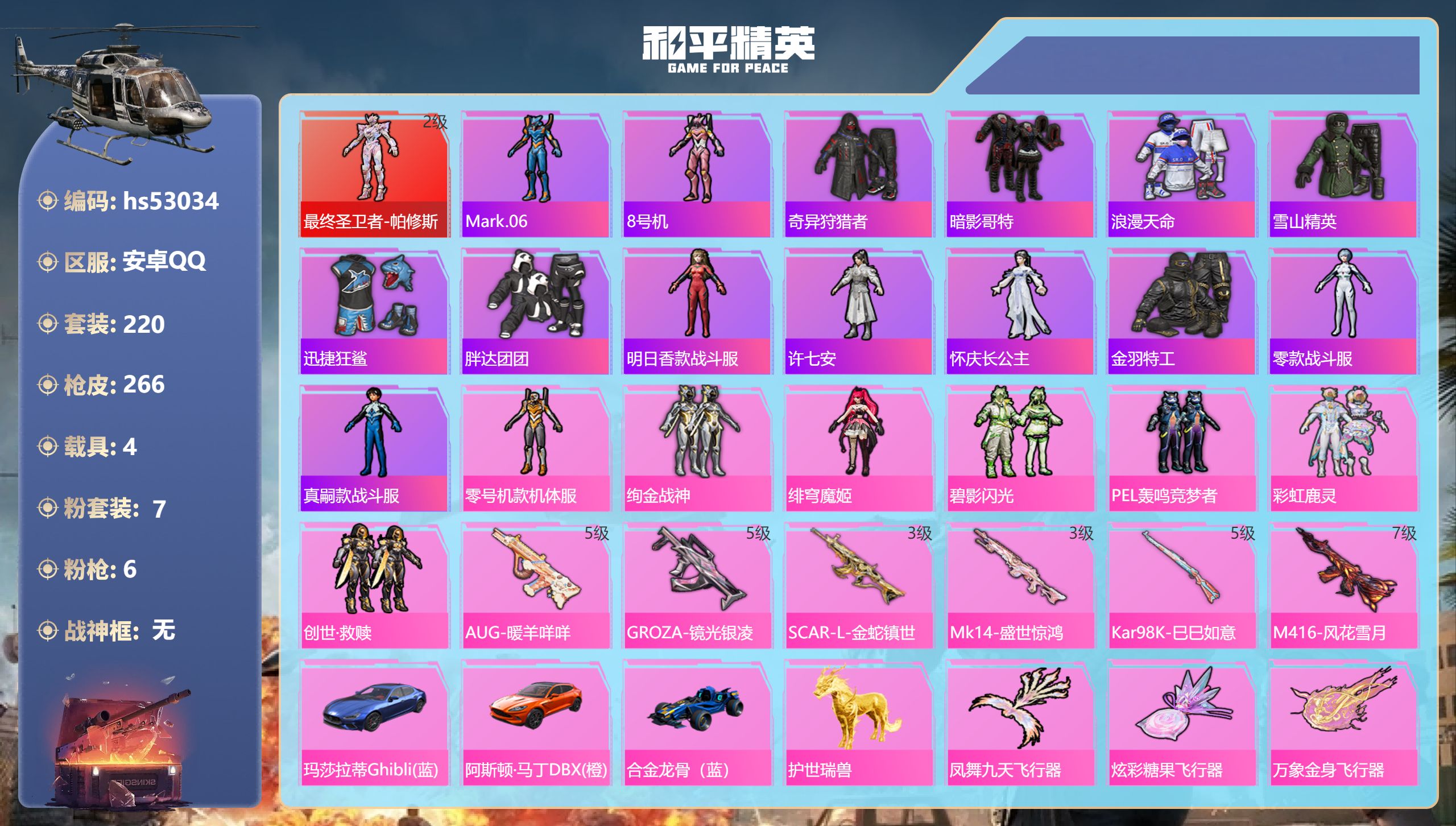 PX_2306782-,安卓手Q-23王牌印记-1红装-7粉装-6特效枪-4载具-88415热力值-220套装-266枪皮-2卓越印记-1传奇印记 【1红装】最终圣卫者-帕修斯/2级 【7粉装】套装-创世·救赎,角色-零号机款机体服,角色-绯穹魔姬,套装-PEL轰鸣竞梦者,套装-彩虹鹿灵,套装-绚金战神,套装-碧影闪光 【6特效枪】Mk14-盛世惊鸿/3级,AUG-暖羊咩咩/5级,Kar98K-巳巳如意/5级,GROZA-镜光银凌/5级,SCAR-L-金蛇镇世/3级,M416-风花雪月/7级 【14稀有紫装】Mark.06,8号机,奇异狩猎者,暗影哥特,浪漫天命,雪山精英,迅捷狂鲨,胖达团团,明日香款战斗服,许七安,怀庆长公主,金羽特工,零款战斗服,真嗣款战斗服 【4稀有载具】玛莎拉蒂Ghibli(蓝),阿斯顿·马丁DBX(橙),合金龙骨(蓝),护世瑞兽 【220稀有时装】零号机款机体服,绚金战神,帕修斯/2级,绯穹魔姬,SS35特训,SS31特训,SS33特训,SS32特训,SS36特训,蓝冰羽,霓虹热舞,恋语绒绒,SS34特训,紫幽梦,大橘大利,夜瞳黯灵,绛羽幽主,胖达团团,浪漫天命,奇异狩猎者,Mark.06,雪山精英,暗影哥特,8号机,金羽特工,迅捷狂鲨,零款战斗服,明日香款战斗服,怀庆长公主,紫俏灵猫,真嗣款战斗服,许七安,元气之梦,粉恋花,顶瓜瓜,碧影闪光,PEL轰鸣竞梦者,创世·幻影,彩虹鹿灵,创世·救赎,激萌罗小黑,狂沙舞者,Alan,Walker,龙魂突击队,小熊娃娃,异域银装,街头风暴,星途旅人,冰河战士,鱼渊荷华,SS30特训,青团波波,燕燕于飞,战术大师,智谋强哥,雏菊兔兔,糖糖葫芦,香桃花海,蝶变,巳巳如意,棉花软糖,SS28特训,迷域探索者,SS29特训,萝兰蝴蝶,SS5特训,冰原使者,SS16特训,暗夜傀儡,拳皇97八神庵,决胜时刻,金鼠迎春,黑色刀锋,炫光向阳,福星高照,虎虎生威吉莉,夏日音浪,龙的传人,软嫩糖心蛋,SS8特训,众神之王,智慧之神,白熊同盟,萌黄之夏,破晓情侣,海滨突袭者,蓝色运动,5.56爱好者,飞驰魅影,白色伏地魔,音速流光,热血青春,SS9特训,酒红色名流,湖蓝色名流,黄色名流,酷潮明星,绯格组合,热情海星,黎明保卫者,炫蓝之夏,纯真浪花,竞技名士,覆海蛟龙,长空猛禽,竞技勇士朋克,特战装甲,战地菁英,旭日情侣,灰色格斗者,甜蜜告白,街头潮人,怒火燎原,冷焰舞者,魅力单车,雪山征服者,青羽突袭者,夜莺强袭者,丛林猎人,甜心亚梦,SS2特训,虚音幻奏,传奇侦探,浪漫假日,极地朋克,幻世战舞者,战地督导,特殊使命,半糖蓝莓,青涩时光,特种空勤,牛气满满,和平特警,迎春赐吉,风暴特警,春日漫步,童话森林,冰川特警,雷霆特警,燃烧卡路里,幻影公爵,滨海假日,麻辣教官,SS3特训,SS4特训,幻影武者,破蛋小黄鸡,疯狂小兔子,圣诞大吉,玄武圣者,凛冬战士,北国孤狼,SS6特训,千禧之恋,神秘领域,炽焰拳师,绮丽涂鸦,格斗专家,耀眼新星,坚韧舞者,竞技达人朋克,淡雅花蕊,玲珑飞花,原初圣火,超能勇士,逆风勇士,海岛探路者,跃动心情,SS7特训,核芯基因,精神漫游,破晓战魂,霓虹街区,森林游猎者,都市魅力,萌趣颜团子,沙漠兵团,耀粉歌者,探宝勇士,SS12特训,SS27特训,牛气冲天,迅捷之星,SS18特训,治愈之星,科技之星,SS13特训,飞行日记,SS17特训,瑞龙福将,团圆交子,金耀舞者,蓝调潮人,异彩先驱,霓虹极客,空投萌叽,SS19特训,SS20特训,SS21特训,玉兔迎春,弄潮海豚,SS22特训,SS23特训,冰爽海盐,甜蜜熊情侣,缤纷果语,滨海厨神,SS14特训,星河浪客,吉莉礼服,游猎者,刚毅裁决者,SS1特训,荣耀,SS24特训,鹤鸣,SS25特训,恶魔人蛛,SS15特训,深蓝冒险家 【266稀有枪械】QBZ-纯真浪花,AWM-纯真浪花,汤姆逊-纯真浪花,DBS-乌木金纹,AA12-G-纯真浪花,平底锅-纯真浪花,P1911-创世·救赎,Vector-创世·救赎,DBS-创世·救赎,AUG-暖羊咩咩/5级,GROZA-镜光银凌/5级,SCAR-L-金蛇镇世/3级,Mk14-盛世惊鸿/3级,Kar98K-巳巳如意/5级,SLR-金丰海韵,野牛-雏菊兔兔,Mk14-冰河战士,平底锅-雏菊兔兔,M762-雏菊兔兔,Mini14-雏菊兔兔,R1895-雏菊兔兔,UZI-冰河战士,M16A4-冰河战士,MK20-H-乌木金纹,M416-风花雪月/7级,Win94-乌木金纹,MK12-乌木金纹,破片手榴弹-爆破雪人,PKM-紫幽梦,MG3-霓彩脉冲,Mk14-紫幽梦,蜜獾-乌木金纹,S1897-紫幽梦,P92-紫幽梦,蜜獾-绯穹魔姬,M249-绯穹魔姬,SPAS-12-狂鲨锋刃,M417-玩趣呆呆,UZI-炫彩糖果,Mini14-绯穹魔姬,平底锅-紫幽梦,破片手榴弹-海盐豹豹,UMP45-海盐豹豹,AKS-74U-乌木金纹,Famas-乌木金纹,S1897-糯团青竹,烟雾弹-冰氧夏日,PKM-啾咪啾咪,M24-天降萌叽,平底锅-属我最6,M416-红色方程式,M416-仓鼠灰灰,M416-乌木金纹,M416-蓝色火焰,M416-滑板小狐,M416-绯红前夜,AKM-夜灯,AKM-生命誓言,AKM-乌木金纹,AKM-彩虹符号,AKM-缤纷海域,AKM-破晓战魂,AKM-龙的传人,AKM-天启纪元,AKM-虎虎生威,AKM-萌趣颜团子,AKM-霓虹街区,SCAR-L-雷霆特警,SCAR-L-红色方程式,SCAR-L-玉兔迎春,SCAR-L-乌木金纹,SCAR-L-黄金龙骨,SCAR-L-夜灯,SCAR-L-炫彩节奏,SCAR-L-兔兔白日梦,M16A4-红色方程式,M16A4-蓝色火焰,M16A4-幻世战舞者,M16A4-甜心亚梦,M16A4-魔法学院,M16A4-乌木金纹,GROZA-乌木金纹,GROZA-黑色刀锋,GROZA-雷霆特警,GROZA-异彩先驱,GROZA-彩虹符号,GROZA-林间仙鹿,GROZA-治愈之星,AUG-乌木金纹,AUG-耀粉歌者,AUG-甜蜜菠萝,QBZ-飞驰魅影,QBZ-原初圣火,QBZ-乌木金纹,QBZ-彩虹符号,M762-生命誓言,M762-瑞龙福将,M762-拳皇97,M762-乌木金纹,M762-彩虹符号,M762-绯红前夜,M762-牛气冲天,M762-天降萌叽,Mk47-百万伏特,Mk47-乌木金纹,G36C-乌木金纹,AC-VAL-天降萌叽,AC-VAL-甜心亚梦,AC-VAL-乌木金纹,蜜獾-天降萌叽,Kar98K-王子的夏天,Kar98K-红色方程式,Kar98K-飞驰魅影,Kar98K-彩虹符号,Kar98K-勇闯险境,Kar98K-终极赛罗,Kar98K-炫彩节奏,M24-冰封烈焰,M24-