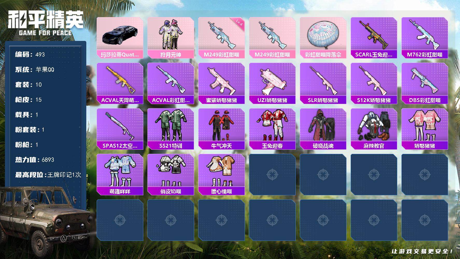 PX_2268456-【1粉1特1载具,玛莎拉蒂,彩虹喵喵】苹果,手Q-1粉装-1特效枪-1载具-0粉色飞行器-6893热力值-1王牌印记-10套装-15枪皮 【粉色载具】:玛莎拉蒂Quattroporte(夜幕蓝) 【粉色套装】:粉装-狩月元帅 【粉色枪皮等级】:M249-彩虹甜喵(四级) 【粉色枪皮】:M249-彩虹甜喵 【粉色降落伞】:彩虹甜喵降落伞 【稀有枪皮】:SCAR-L-玉兔迎春,M762-彩虹甜喵,AC-VAL-天降萌叽,AC-VAL-彩虹甜喵,蜜獾-娇憨猪猪,UZI-娇憨猪猪,SLR-娇憨猪猪,S12K-娇憨猪猪,DBS-彩虹甜喵,SPAS-12-太空嘟嘟 【其他套装】:套装-SS21特训,套装-牛气冲天,套装-玉兔迎春,套装-破晓战魂,套装-麻辣教官,套装-娇憨猪猪,套装-萌趣咩咩,套装-俏皮奶喵,套装-暖心橘喵 【营地ID】:936199329