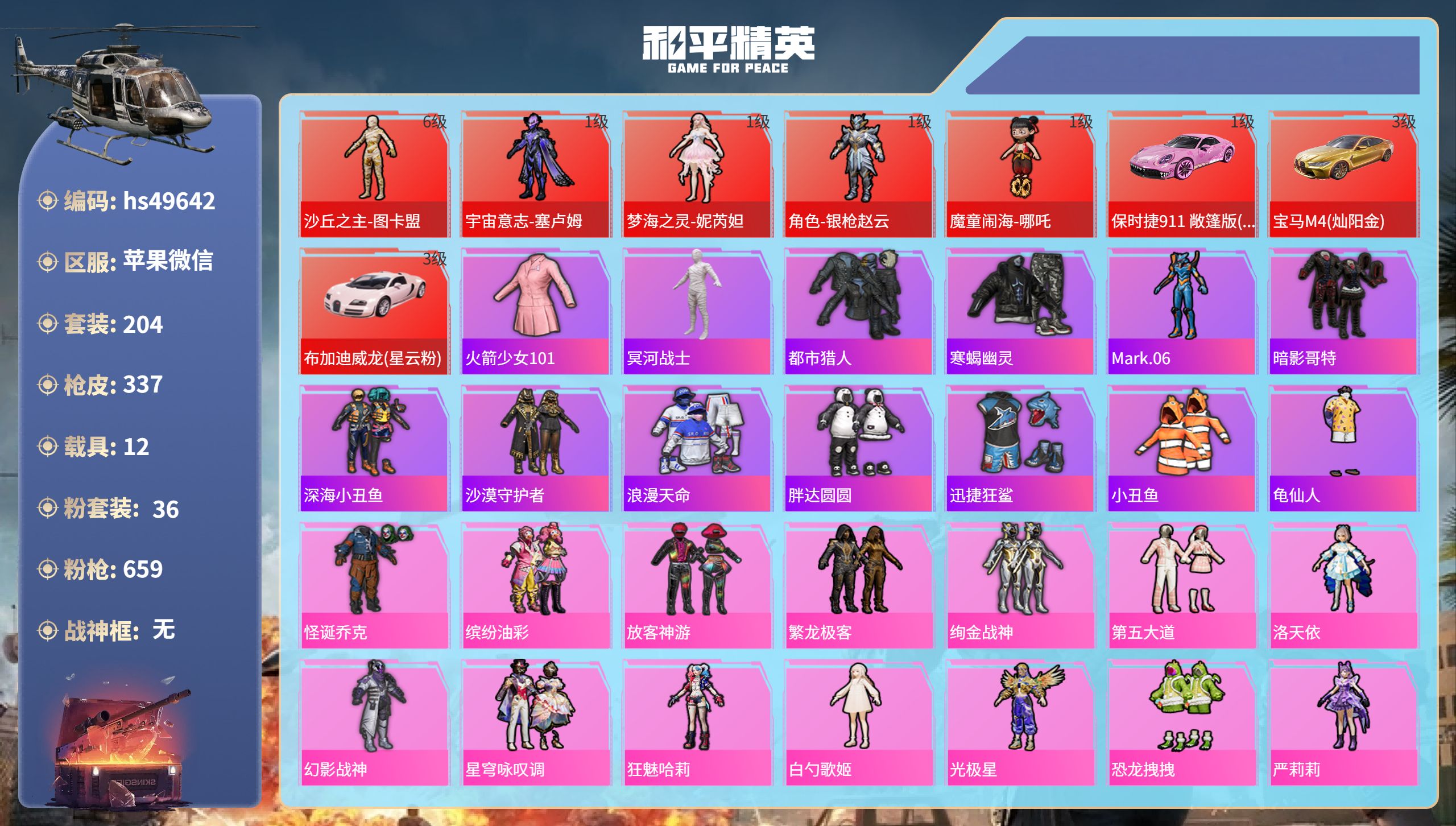 PX_2250776-,苹果微信-10王牌印记-5红装-36粉装-42特效枪-12载具-热力值-204套装-337枪皮-3卓越印记-2传奇印记 【5红装】梦海之灵-妮芮妲/1级,角色-银枪赵云/1级,魔童闹海-哪吒/1级,宇宙意志-塞卢姆/1级,沙丘之主-图卡盟/6级 【36粉装】套装-馨动时刻,套装-繁龙极客,角色-狂魅哈莉,角色-星云暗核,角色-小蓝,套装-蜜语绒猫,套装-缤纷油彩,角色-呆萌星弥,套装-恐龙拽拽,套装-绚金战神,套装-星穹咏叹调,套装-霓虹漫游,套装-冠军兔兔,角色-光极星,角色-小可学妹,角色-紫钛骑兵,套装-仲夏莫吉托,套装-玉鳞金羽,套装-未来歌姬,套装-怪诞乔克,角色-美琪,角色-洛天依,套装-黄族统领,套装-暗夜鎏金,套装-第五大道,角色-万古烈焰,套装-幻影战神,角色-宙之时溯,套装-放客神游,角色-美雪,角色-白勺歌姬,套装-炫光之旅,角色-圣堂之誓,角色-烟云彩露,角色-严莉莉,超级赛亚人-孙悟空 【42特效枪】M416-至情至圣/9级,Vector-最终圣卫者/3级,SCAR-L-锦绣绵绵/5级,ARX-无垠阁/3级,烟雾弹-猫咪绅士/5级,PKM-江南烟雨/1级,破片手榴弹-美味星星糖/1级,SCAR-L-金蛇镇世/1级,M416-心之恋语/1级,AKM-魔法神域/6级,爆炸猎弓-雪梅暗香/7级,AKM-梦之光华/3级,M200-梦海之灵/2级,Mk14-精灵梦叶罗丽/1级,AMR-智耀战神/4级,M762-青锋波束/5级,UMP45-恐龙拽拽/3级,P90-沙丘之主/3级,MG3-洛神天依/1级,破片手榴弹-秋玉花灯/7级,M416-墨龙九天/1级,Kar98K-圣域龙灵/2级,DP-28-暗夜鎏金/1级,M24-镜域双华/2级,DP-28-豹影疾电/5级,AKS-74U-无垠阁/3级,烟雾弹-甜梦果泡/1级,烟雾弹-电雾迷城/1级,MG-36-沧焰双生/5级,破片手榴弹-瓶中星球/1级,UMP45-量子极限/5级,AUG-星梦奇缘/3级,GROZA-精灵之光/3级,平底锅-仲夏莫吉托/7级,DP-28-圣堂之誓/7级,UMP45-宇宙意志/3级,SCAR-L-魔童闹海,哪吒/1级,SPAS-12-蜜语绒猫/1级,Kar98K-巳巳如意/5级,MG3-酷泡奶龙/5级,Kar98K-未来歌姬/4级,SCAR-L-天蓬元帅/9级 【1热门】火箭少女101 【5红装】沙丘之主-图卡盟/6级,宇宙意志-塞卢姆/1级,梦海之灵-妮芮妲/1级,角色-银枪赵云/1级,魔童闹海-哪吒/1级 【12稀有紫装】冥河战士,都市猎人,寒蝎幽灵,Mark.06,暗影哥特,深海小丑鱼,沙漠守护者,浪漫天命,胖达圆圆,迅捷狂鲨,小丑鱼,龟仙人 【12稀有载具】黑曜夜骑,辉羽雀灵自行车,保时捷911,敞篷版(小暴龙)/1级,冰绡玉鳞,宝马M4(灿阳金)/3级,布加迪威龙(星云粉)/3级,合金龙骨(绿),护世瑞兽,星梦玉骢,赤兔,照夜玉狮子,布尔玛摩托车 【1僚机】僚机-圣域龙宝 【204稀有时装】火箭少女101,怪诞乔克,缤纷油彩,放客神游,繁龙极客,绚金战神,第五大道,洛天依,幻影战神,银枪赵云/1级,妮芮妲/1级,哪吒/1级,图卡盟/6级,塞卢姆/1级,4AM追光队服,星穹咏叹调,狂魅哈莉,STE追光队服,SS35特训,午间小调,SS31特训,SS33特训,SS32特训,彩虹兔,蓝冰羽,乐音,雪绒豹,恋语绒绒,幽澜祭司,星渊小夜曲,SS34特训,朱霞炽焰,紫幽梦,大橘大利,夜瞳黯灵,沙漠守护者,都市猎人,浪漫天命,寒蝎幽灵,龟仙人,Mark.06,游乐,暗影哥特,懒羊羊,深海小丑鱼,小丑鱼,美羊羊,迅捷狂鲨,胖达圆圆,凌霄紫焰,擎苍青焰,萌鸡速递,小鸟芋圆,元气之梦,风迹短诗,混沌火种,薄荷星砂,秘语星愿,粉恋花,云朵鹅,冥河战士,顶瓜瓜,白勺歌姬,光极星,恐龙拽拽,严莉莉,霓虹漫游,黄族统领,紫钛骑兵,小可学妹,玉鳞金羽,星云暗核,蜜语绒猫,炫光之旅,美雪,创世·幻影,宙之时溯,圣堂之誓,万古烈焰,馨动时刻,冠军兔兔,暗夜鎏金,孙悟空,未来歌姬,仲夏莫吉托,烟云彩露,呆萌星弥,小蓝,美琪,银碳小老虎,粉雾星云,龙魂突击队,小熊娃娃,异域银装,都市丽猫,摩登魅猫,街头风暴,星途旅人,冰河战士,SS30特训,青团波波,拉斐尔,战术大师,雏菊兔兔,多纳泰罗,糖糖葫芦,香桃花海,蝶变,巳巳如意,曼妙人鱼,棉花软糖,极地流光,SS28特训,银尘,冰公主,SS29特训,萝兰蝴蝶,无暇誓言,星际旅行,舰行太空,焰鹰斗篷,忠义严颜,闪耀新星,迎夏光舞,童真绒兔,湖雨初晴,忠猛周仓,豚鼠丹丹,雪兔飞飞,龙的传人,果汁能量,青玉碎影,竞速先锋,萌黄之夏,月蓝流光,蝶吟花词,萌趣绒叽,人鱼之吻,浓情蜜辣,涂山之恋,SS26特训,漫步者,空岛之星,热情海星,黎明保卫者,元气发射,纯真浪花,竞技名士,赤地牡丹,猛禽,忠真马岱,长空猛禽,旭日情侣,惊鸿侠骨,春光漫游,春日漫步,幻影公爵,红熊茄茄,鹰眼刺客,沙暴袭击者,冰冻风暴,快闪甜心,蓝彩潮人,坚韧舞者,淡雅花蕊,海岛探路者,幻世保卫者,霓虹街区,沙漠兵团,SS27特训,情公主,胡桃卫兵,绚烂繁星,熠彩粉晶,萌酷罗小黑,光之冒险,绝对偶像,玉兔迎春,弄潮海豚,深海梦境,SS23特训,呆萌铁蟹,摩登艾咪,缤纷果语,滨海厨神,莱茵河畔,天籁歌者,电音精灵,白兰地假日,龙舌兰冰茶,神气柴柴,妙红点点,幻彩翩翩,幻羽潜行,海盐绵绵冰,老实芭蕉,银杏天影,竹华凝韵,王牌教练,柠萌假日,SS24特训,懵萌河马,SS25特训,锦衣飞扬 【337稀有枪械】M416-心之恋语/1级,M416-至情至圣/9级,M200-梦海之灵/2级,MG3-梦海之灵,AC-VAL-梦海之灵,UZI-梦海之灵,UMP45-量子极限/5级,QBZ-纯真浪花,AWM-纯真浪花,汤姆逊-纯真浪花,DBS-乌木金纹,AA12-G-纯真浪花,平底锅-纯真浪花,M416-墨龙九天/1级,Famas-墨龙九天,AMR-墨龙九天,SLR-墨龙九天,烟雾弹-猫咪绅士/5级,大砍刀-鸢尾晶梦,烟雾弹-鸢尾晶梦,突击盾牌-初号机,觉醒Ver.,汤姆逊-星梦奇缘,蜜獾-精灵梦叶罗丽,S1897-精灵梦叶罗丽,MK20-H-星梦奇缘,SCAR-L-海盐豹豹,Mk14-精灵梦叶罗丽/1级,平底锅-精灵梦叶罗丽,SKS-冠军兔兔,GROZA-海盐豹豹,破片
