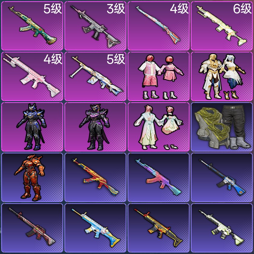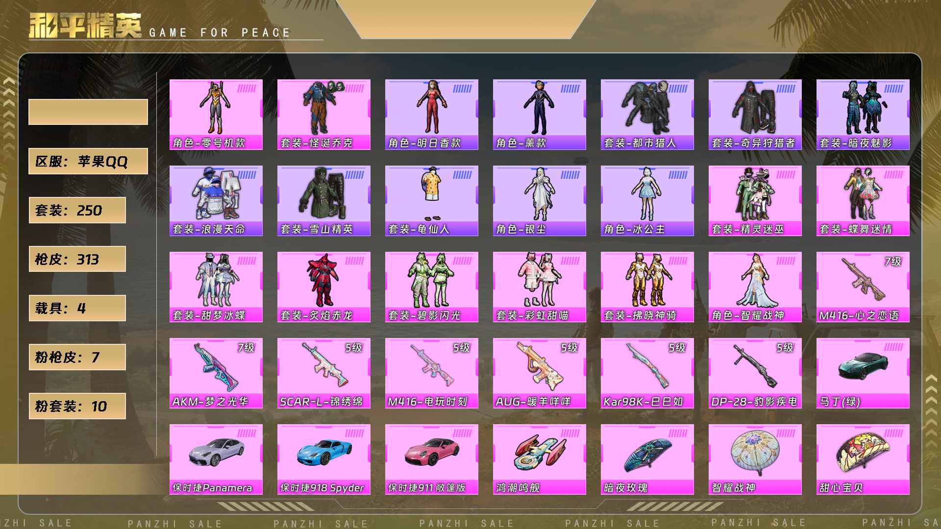 PX_2166845-【10粉装-7粉枪-4载具-1珍稀飞行器-250套装-313枪皮】当前段位:超级王牌10星,,历史最高段位:卓越王牌16星,,热力值:102436,,王牌印记:15,,卓越印记:4,,游戏等级:70【稀有资产】角色-零号机款机体服/套装-怪诞乔克/角色-明日香款战斗服/角色-薰款战斗服/套装-都市猎人/套装-奇异狩猎者/套装-暗夜魅影/套装-浪漫天命/套装-雪山精英/套装-龟仙人/角色-银尘/角色-冰公主 【粉色套装】套装-精灵迷巫/套装-蝶舞迷情/套装-甜梦冰蝶/套装-炙焰赤龙/套装-碧影闪光/套装-彩虹甜喵/套装-拂晓神骑/角色-智耀战神 【粉色枪皮】M416-心之恋语[7级]/AKM-梦之光华[7级]/SCAR-L-锦绣绵绵[5级]/M416-电玩时刻[5级]/AUG-暖羊咩咩[5级]/Kar98K-巳巳如意[5级]/DP-28-豹影疾电[5级] 【载具】阿斯顿·马丁DBS(绿)/保时捷Panamera(星辰紫)/保时捷918,Spyder(沉静蓝)/保时捷911,敞篷版(星珀红) 【飞行器】鸿潮鸣舰飞行器 【珍稀背包】洛神天依背包(3级)/