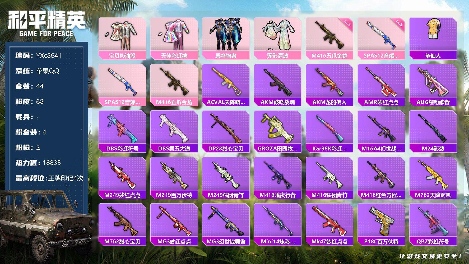 PX_2302105-可二次-苹果Q-1稀有1载具7粉装8特效枪11热门141套装204枪皮,61799热力值,精品女号,双字ID:误猝,6绝世6传奇8卓越,SS34战神框,3级M4超新星,星空马,猪妹,第五大道,星梦奇缘,胖达,红眼罩,激萌罗小黑,懒羊羊,青蛙服,彩虹兔,云朵鹅,雪绒豹,满级手雷纷纷猫爪,满级维克多飒粉甜心,13印记,历史无敌战神,【1稀有】,浪漫天命,【1载具】,星梦玉骢,【7粉装】,星穹咏叹调,星梦奇缘,缤纷油彩,第五大道,冰霜白皇,炙焰红王,暗夜玫瑰,【8特效枪】,SCAR-L-锦绣绵绵,(5级),M416-电玩时刻,(5级),M416-超新星,(3级),AKM-绿萝繁花,(5级),Kar98K-巳巳如意,(5级),Vector-飒粉甜心,(7级),DP-28-豹影疾电,(5级),破片手榴弹-粉粉猫爪,(7级),【11热门】,Mark.06,龟仙人,鹰眼刺客,激萌罗小黑,迅捷狂鲨,胖达圆圆,暗影哥特,粉红小猪,梦之呓语,破蛋小黄鸡,弄潮海豚,【1头盔】,甜蜜誓约头盔,【1背包】,深海小丑鱼背包,营地ID:916176288