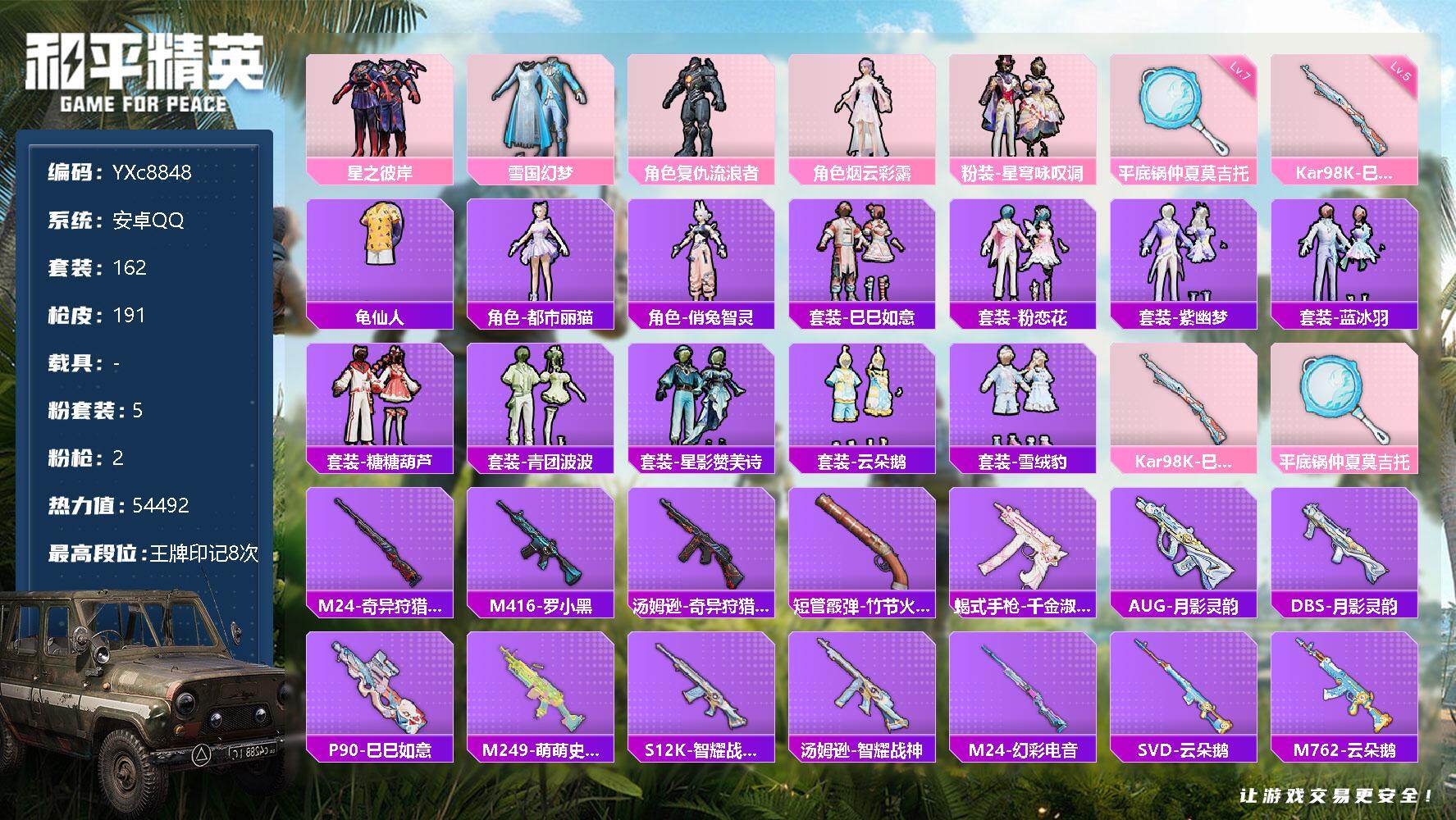 PX_2016059-??,胖达,哥特,粉熊包】YXc8848【有二次】【因赛季更新游戏段付以上号为准!】,安卓Q,,8王牌印记,历史超级王牌11星,162套装,191枪皮,【1稀有】,浪漫天命,【5粉装】,雪国幻梦,烟云彩露,星穹咏叹调,星之彼岸,复仇流浪者,【2特效枪】,Kar98K-巳巳如意,(5级),平底锅-仲夏莫吉托,(7级),【13热门】,龟仙人,萌神柯基,雪山精英,梦魇先生,万圣娃娃,激萌罗小黑,胖达圆圆,暗影哥特,水银刺客,狂沙舞者,破蛋小黄鸡,极速红龙,M24-奇异狩猎者,【2头盔】,梦幻火箭头盔,雪国精灵头盔,【3背包】,梦幻火箭背包,雪国精灵背包,萌熊伴侣背包
