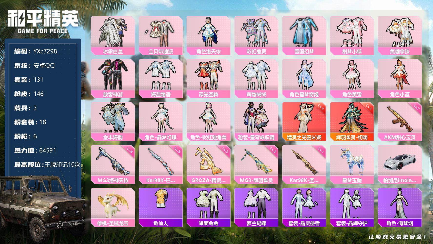PX_2015641--【可二次】【2红装,精灵,雀灵,雪国,放客,软软马卡龙,番茄,胖达,兔兔白日梦,追光服,萌物绒绒,小狐,海盐,晶辉,金鞋,极品公主号】【因赛季更新游戏段付以上号为准!】 安卓,10王牌印记,历史超级王牌11星,131套装,146枪皮,【3载具】,帕加尼imola(艺术银),星梦玉骢,圣域龙宝僚机 【2神装】,辉羽雀灵-初翊,(1级),精灵之光-露米娜,(2级),【2稀有】,派对舞王,派对舞王(金靴子),【18粉装】,小蓝,美雪,雪国幻梦,宝贝奶油派,洛天依,金丰海韵,彩虹独角兽,星穹咏叹调,星梦奇缘,晶梦幻蝶,放客神游,萌物绒绒,冰霜白皇,霞光圣骑,甜梦小狐,海盐物语,焦糖拿铁,彩虹鹿灵,【6特效枪】,AKM-甜心宝贝,(7级),Kar98K-圣域龙灵,(1级),Kar98K-巳巳如意,(5级),MG3-辉羽雀灵,(3级),GROZA-精灵之光,(3级),MG3-洛神天依,(6级),【21热门】,Mark.06,龟仙人,2B战斗服款,红熊茄茄,兔兔白日梦,奶芙汪汪,恶魔喵喵,激萌罗小黑,胖达圆圆,RSG追光队服,KONE追光队服,暗夜契约,醒狮腾龙,团圆交子,瑞龙福将,纯白誓言,破蛋小黄鸡,风华少年志,M762-瑞龙福将,MK47-林间仙鹿,GROZA-林间仙鹿,【2头盔】,雪国精灵头盔,甜蜜誓约头盔,【2背包】,雪国精灵背包,甜心宝贝背包