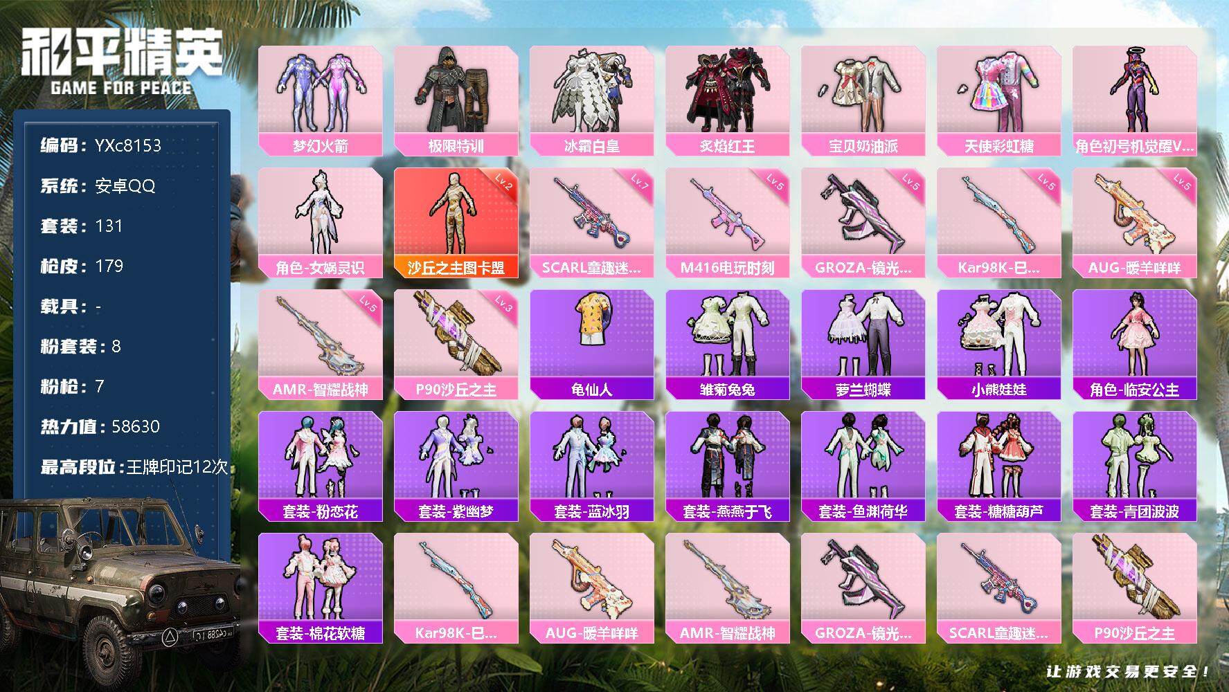 PX_2297049-可二次,安卓Q-2稀有16粉装11特效枪17热门231套装314枪皮,93745热力值,精品女号,300多天精英特权卡,怪诞,梦幻火箭,奶油派,羊梦糖心美雪,贝贝,美琪,权威小番茄,红眼罩,蕾丝眼罩,兔兔白日梦,烟云彩露,白勺歌姬,呆萌星弥,小可学妹,卡林大人伙伴,满级M4电玩,满级M417第五大道,满级SPAS12蜜语绒猫,满级AMR智耀战神,19印记,历史超级王牌17星,【2稀有】,AKM-缤纷海域,浪漫天命,【16粉装】,梦幻火箭,奇迹舞步美雪,奇迹舞步贝贝,奇迹舞步美琪,宝贝奶油派,异瞳寒姬,烟云彩露,炫光之旅,怪诞乔克,羊梦糖心,白勺歌姬,呆萌星弥,小可学妹,智耀战神,幻彩电音,冰川幽秘,【11特效枪】,SCAR-L-锦绣绵绵,(5级),M416-电玩时刻,(5级),Kar98K-巳巳如意,(5级),SPAS-12-蜜语绒猫,(7级),MG-36-沧焰双生,(5级),DP-28-豹影疾电,(5级),UMP45-量子极限,(5级),Mk14-甜梦熊击,(5级),AMR-智耀战神,(7级),M417-第五大道,(7级),平底锅-喜羊羊与灰太狼,(4级),【17热门】,Mark.06,龟仙人,浪漫假日,红熊茄茄,晶辉守护,兔兔白日梦,暗影哥特,团圆交子,瑞龙福将,粉红小猪,水银刺客,狂沙舞者,破蛋小黄鸡,极速红龙,M762-瑞龙福将,M24-奇异狩猎者,S686-奇异狩猎者,【1飞行器】,龙翔九天飞行器,【1头盔】,梦幻火箭头盔,营地ID:781407289