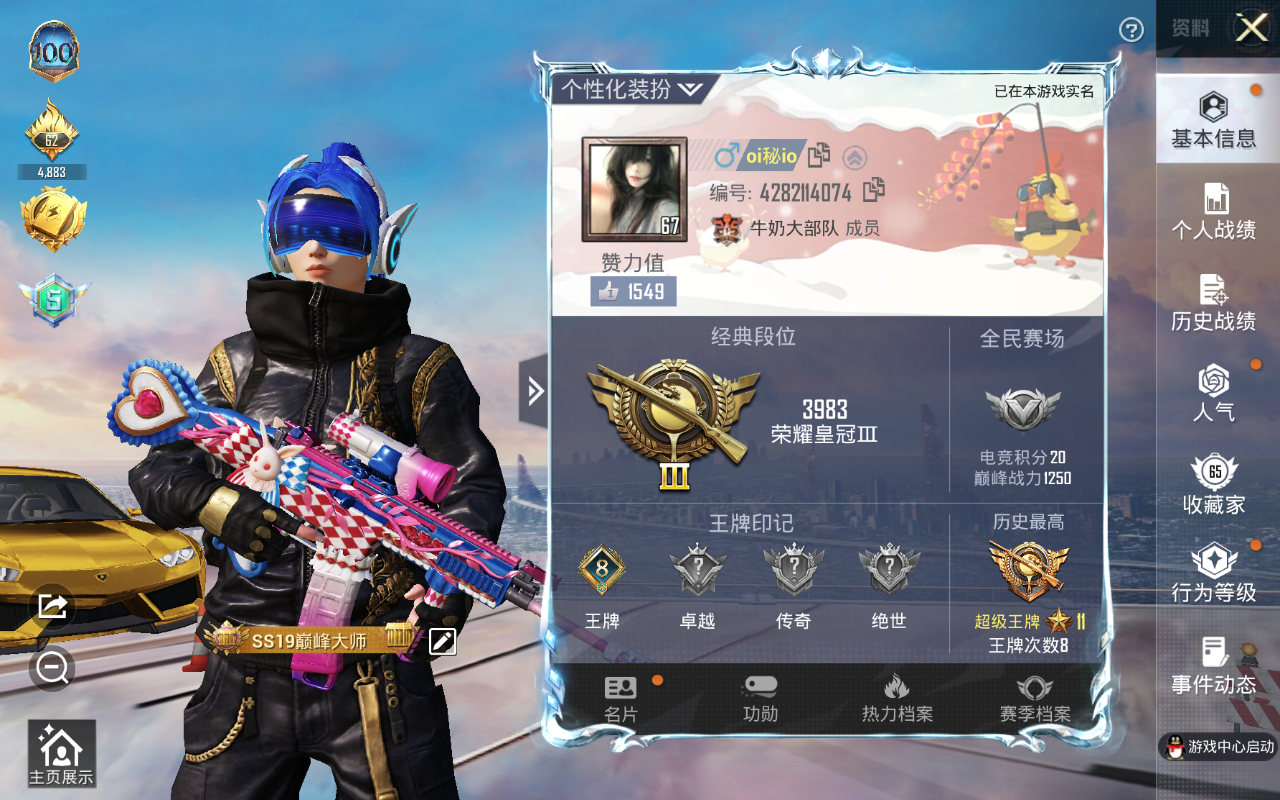 PX_1960372-可二次,等级67,183套装,226枪皮,历史Z高王牌11金星,8王牌印记,热力值73817,1车10粉7特效,梦幻火箭,兰博基尼炫光金,满级满配M416五爪金龙,5级SCARL童趣迷兔,5级SLR暗夜玫瑰,4级98K未来歌姬,2级平底锅仲夏莫吉托,4
