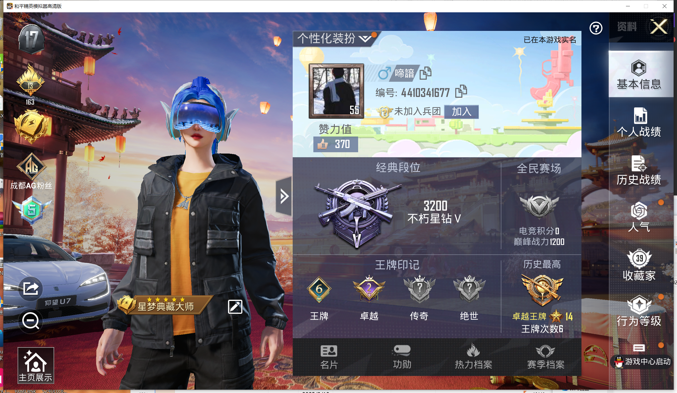 PX_1960292-可二次,等级44,33套装,43枪皮,1王牌印记,热力值14351,1车1特效,玛莎拉蒂夜幕蓝,满级满配98K巳巳如意,湖雨初晴,蓝冰羽,P90筑梦精灵,2粉降落伞,1淘汰盒子